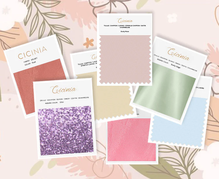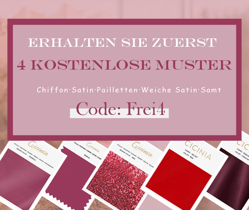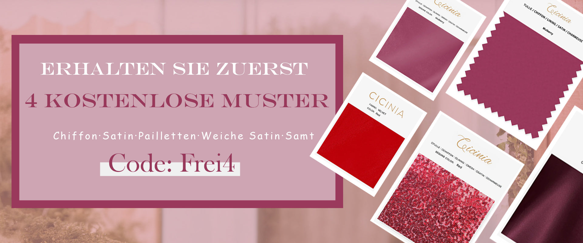 Bestellen Sie zuerst Stoffmuster. Wählen Sie die Farbe, die am besten zu Ihrem Hochzeitsthema passt, und finden Sie Ihren Lieblingsstoff.