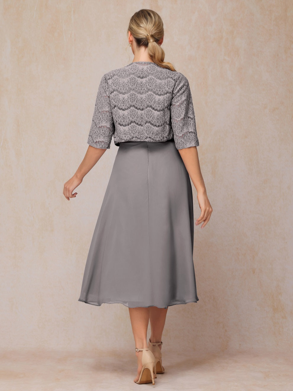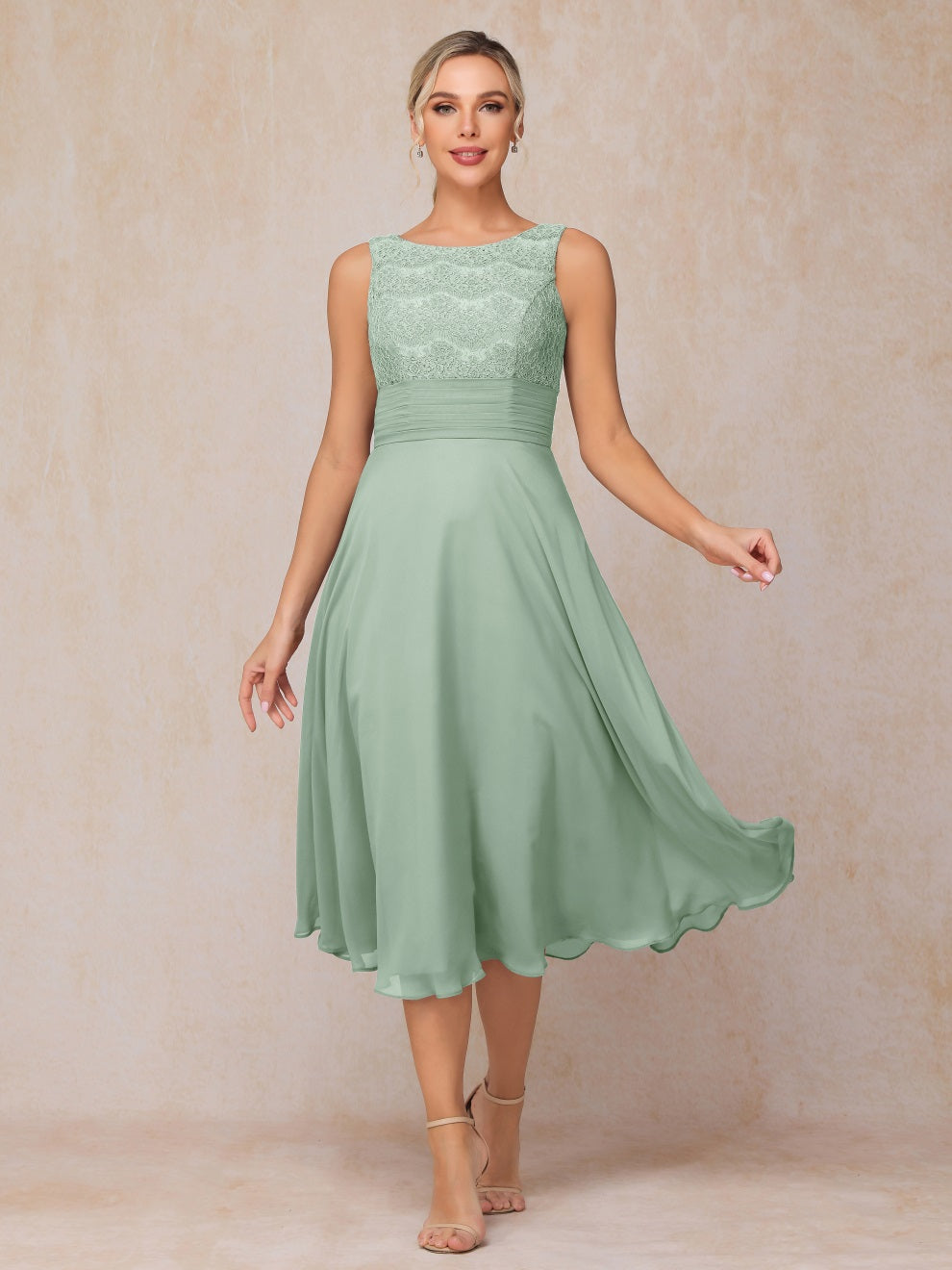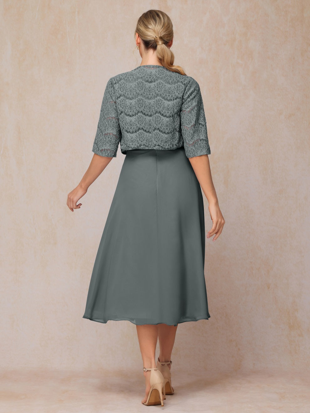 2 Stück Empire Knielang Trapezförmig Bootsausschnitt Chiffon Spitze Brautmutterkleider