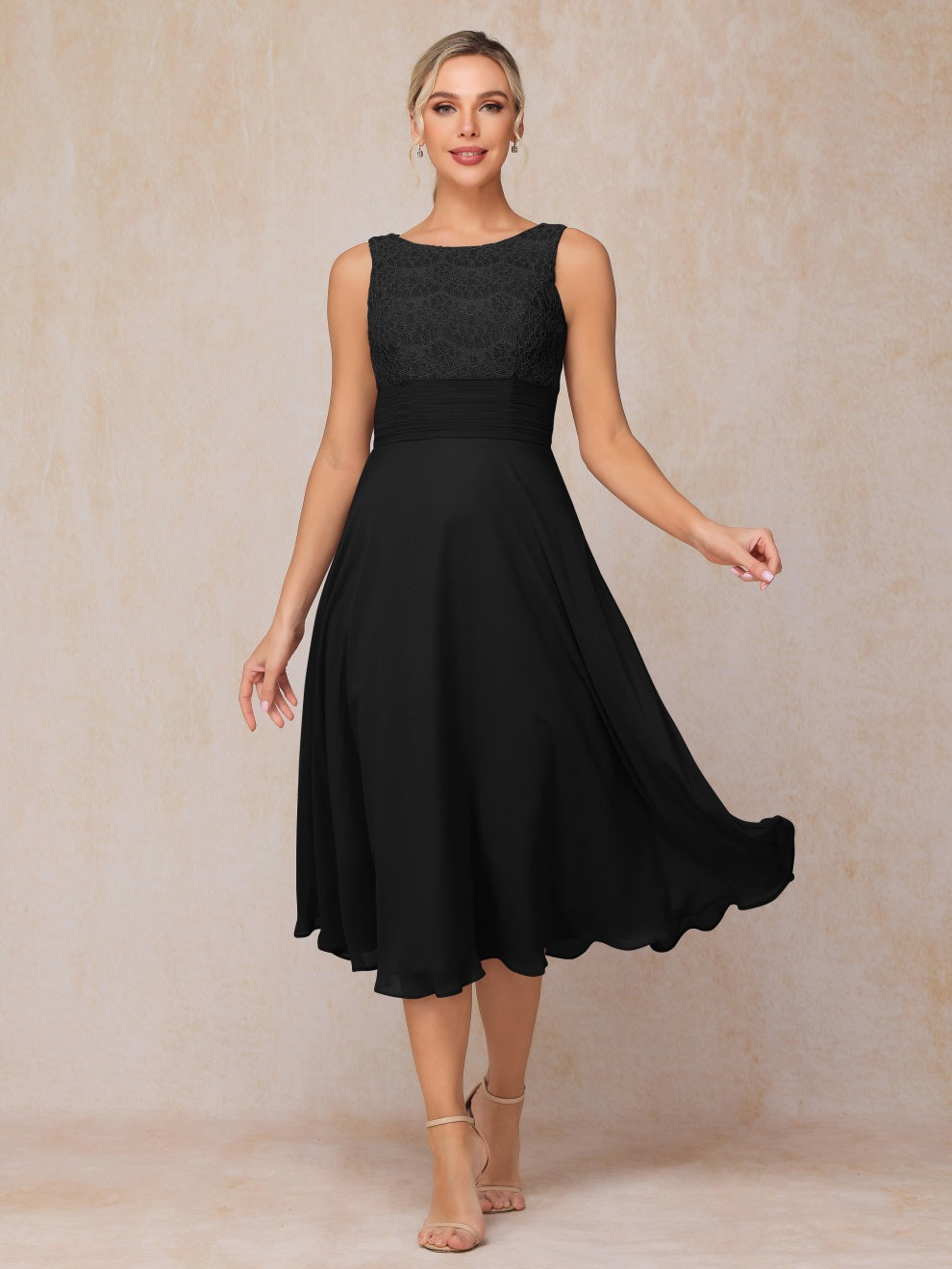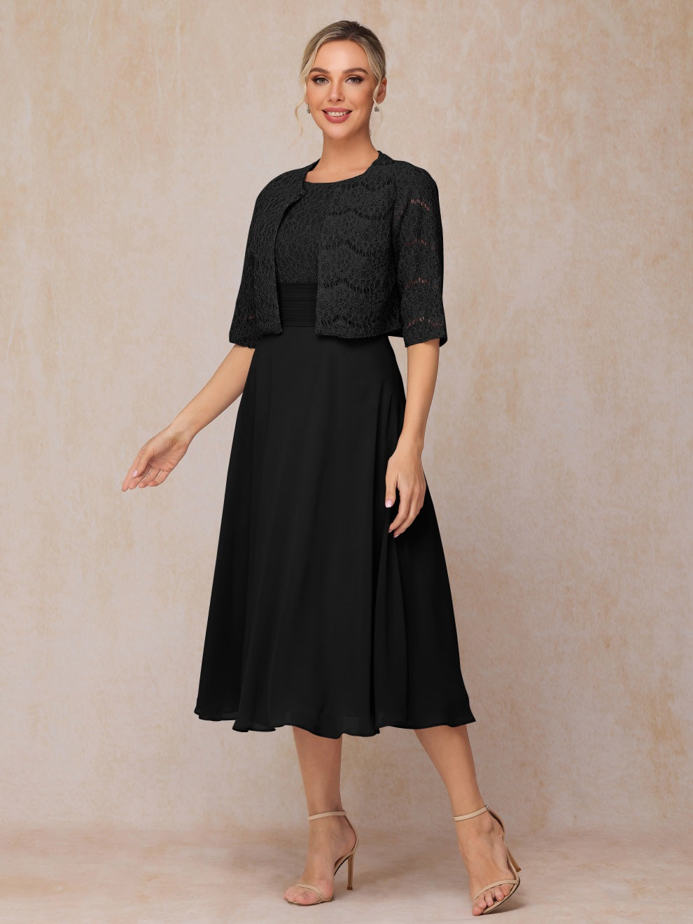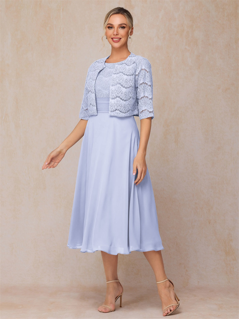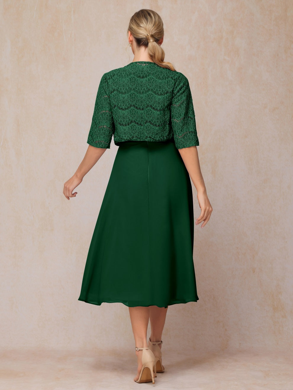 2 Stück Empire Knielang Trapezförmig Bootsausschnitt Chiffon Spitze Brautmutterkleider