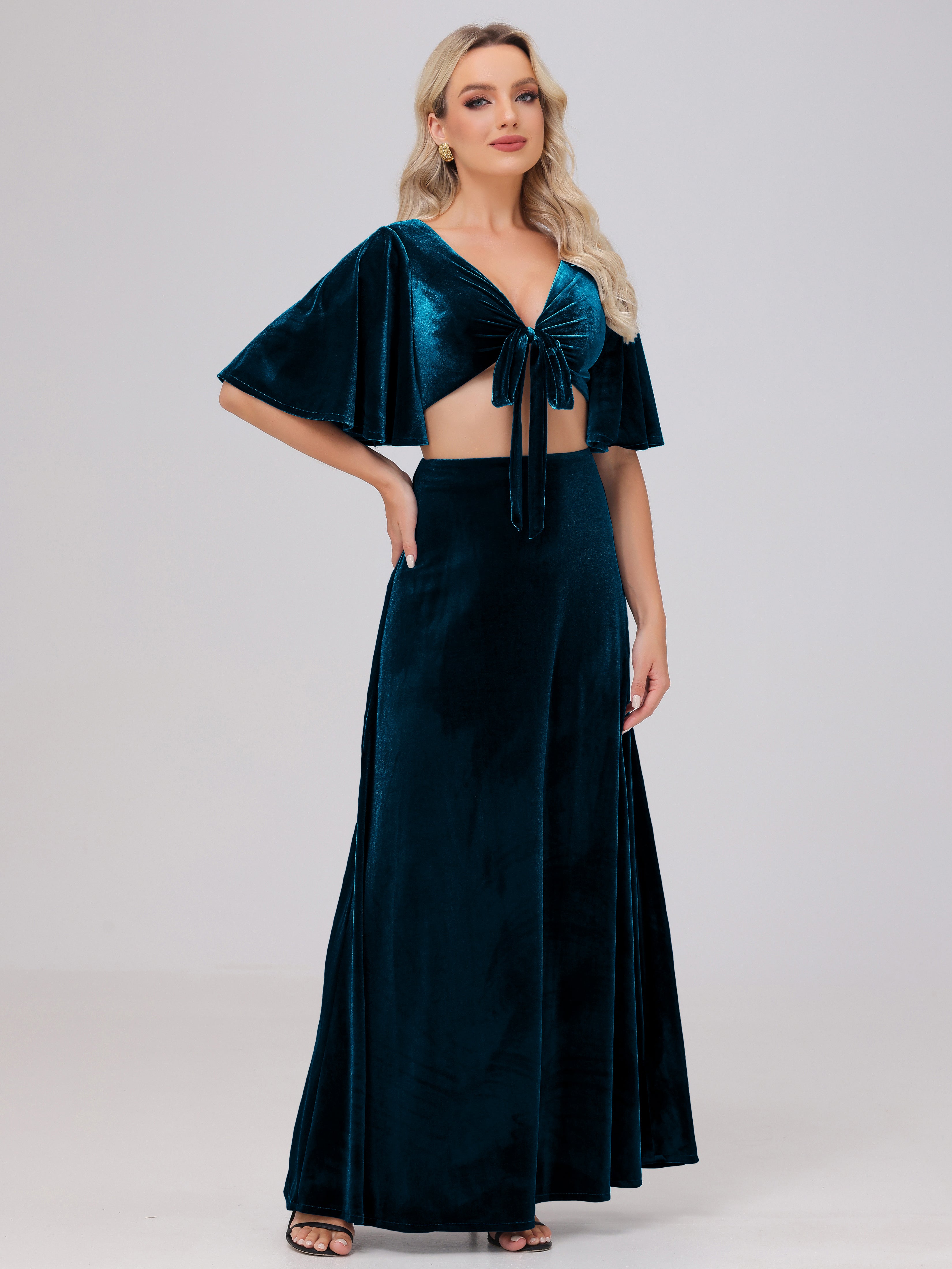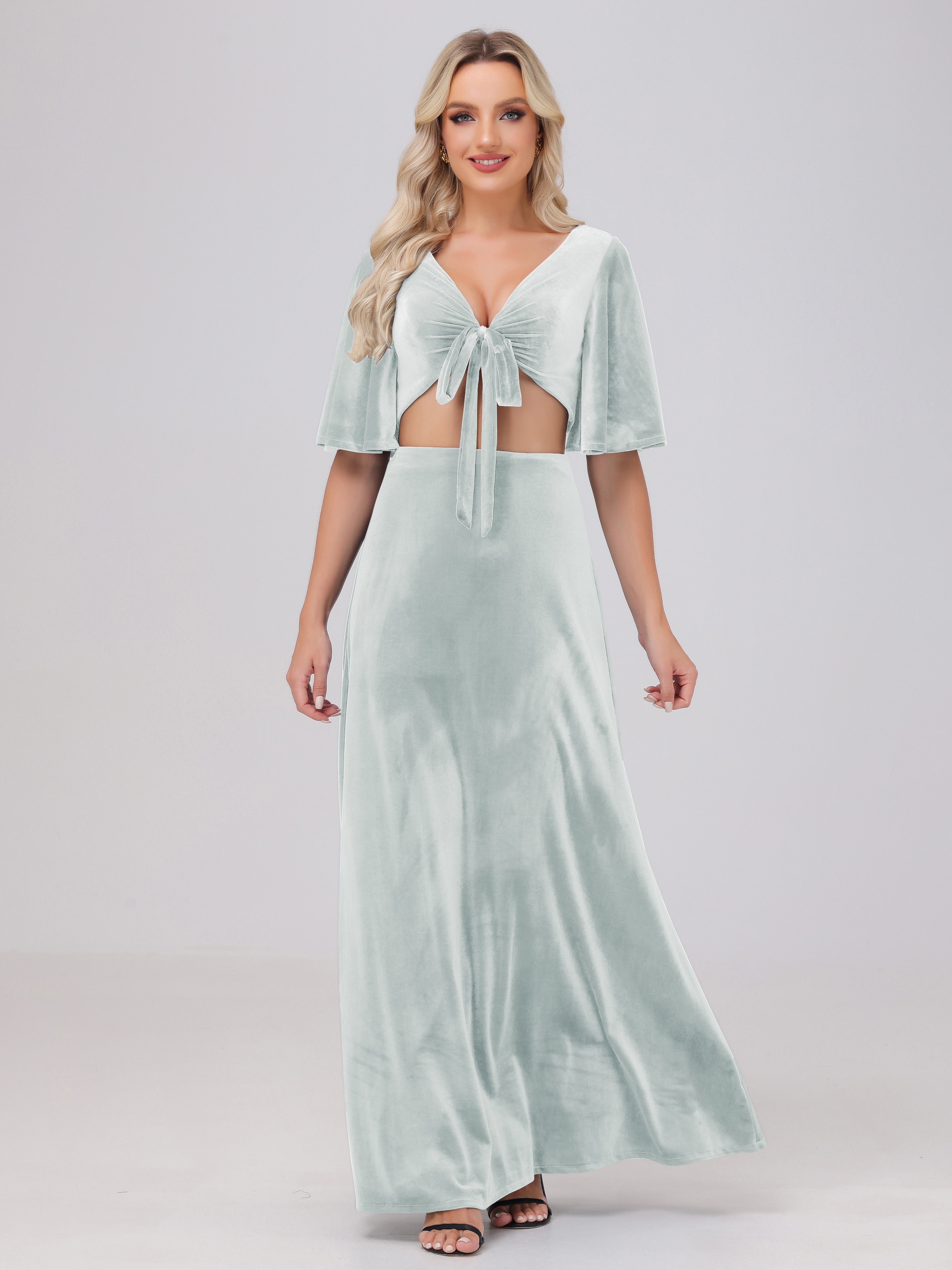 A-Linie Halbe Ärmel V-Ausschnitt Lange Samt Brautjungfernkleider