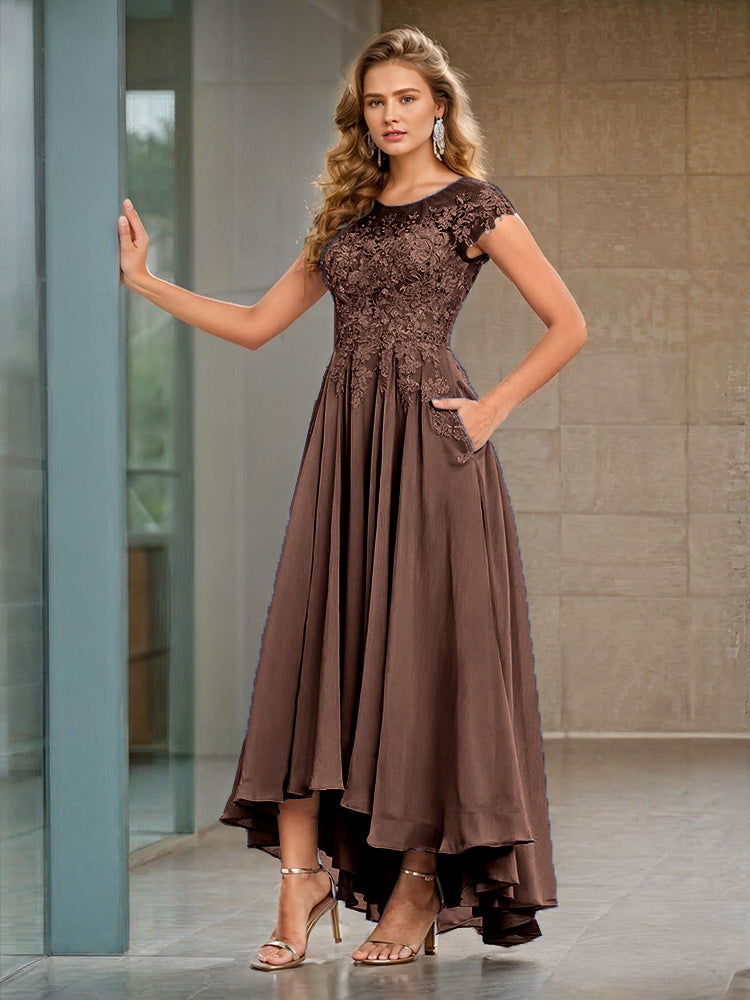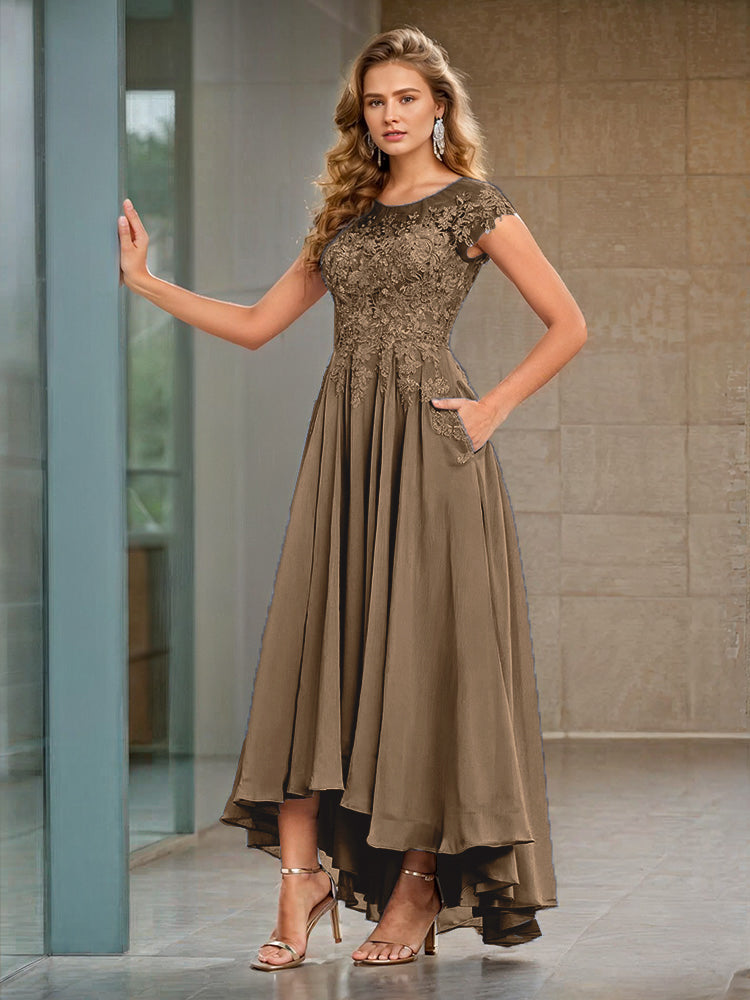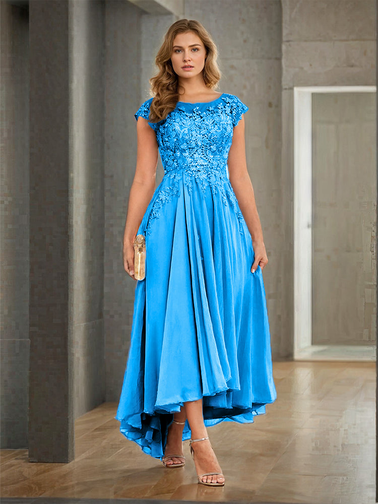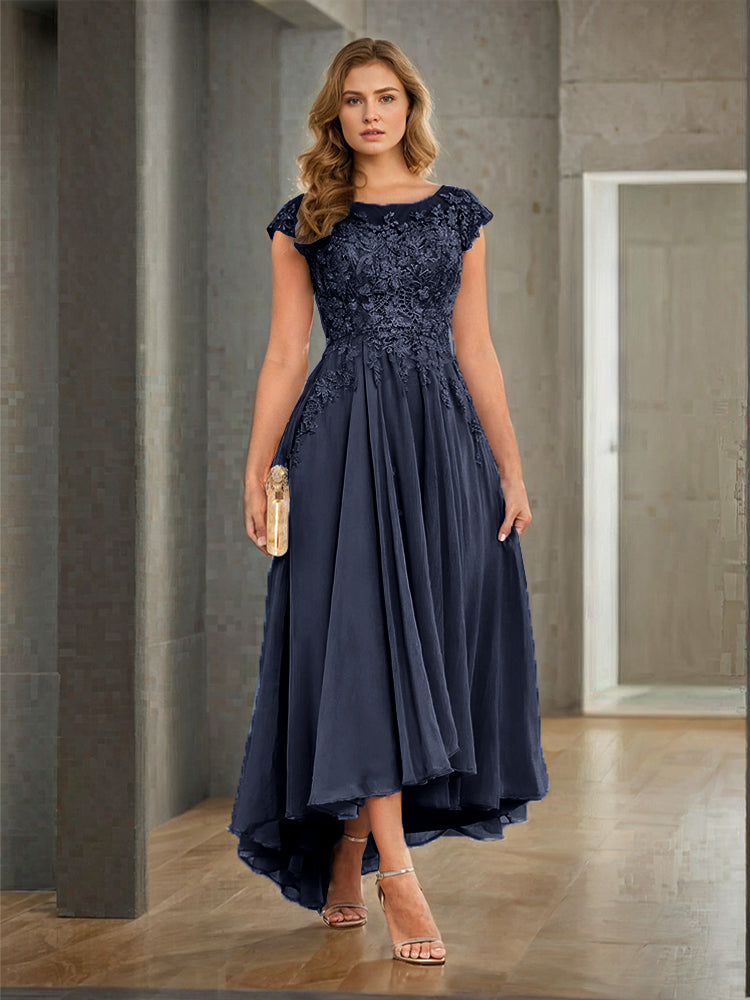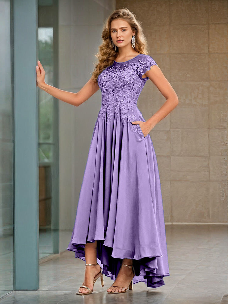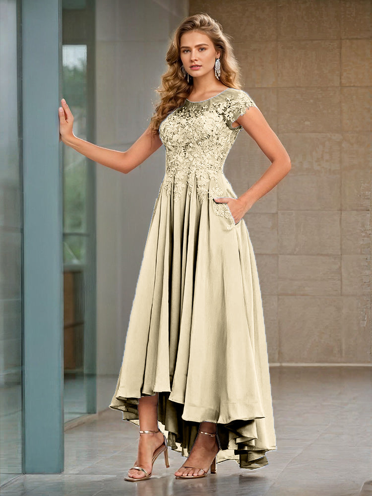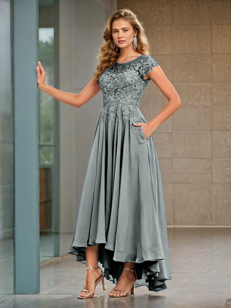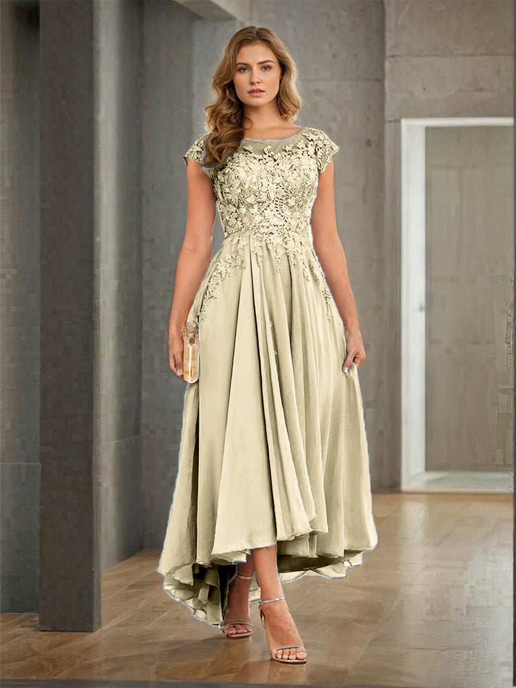A-Linie Kappenärmel hoch niedrig Spitze Applikationen Chiffon Mutter der Braut Kleid