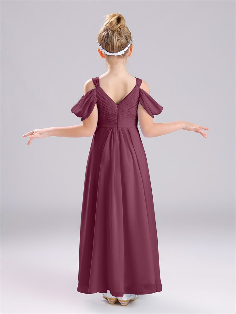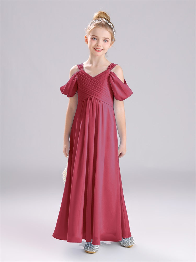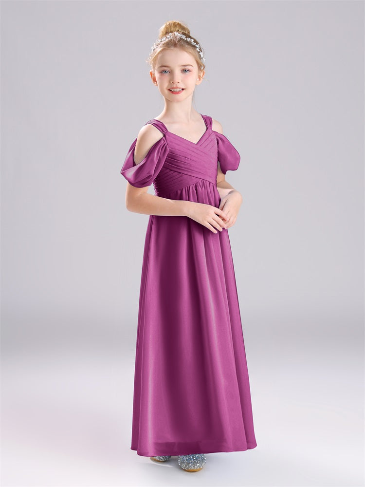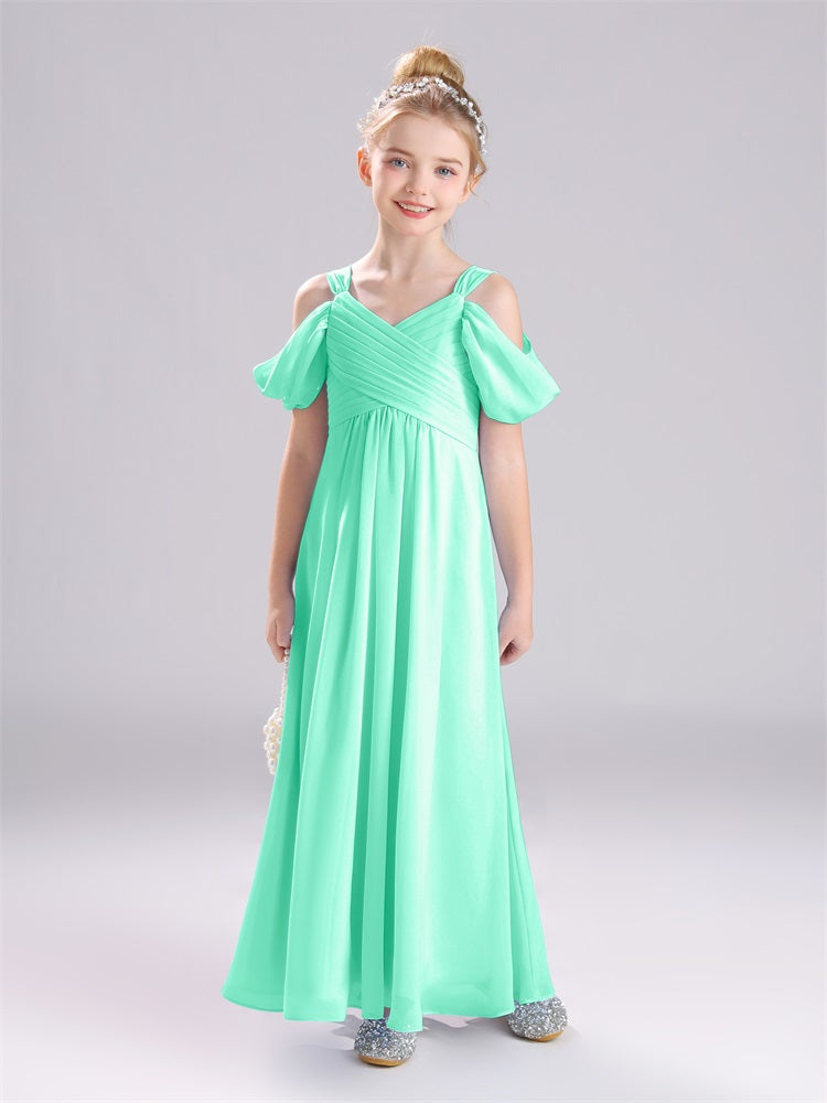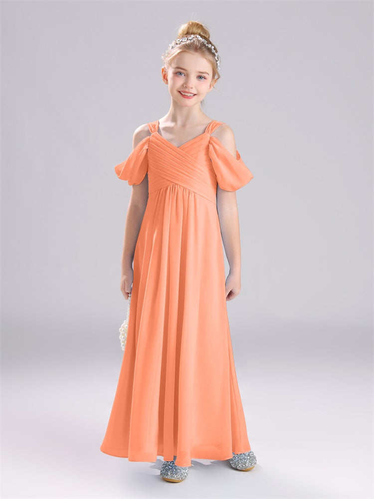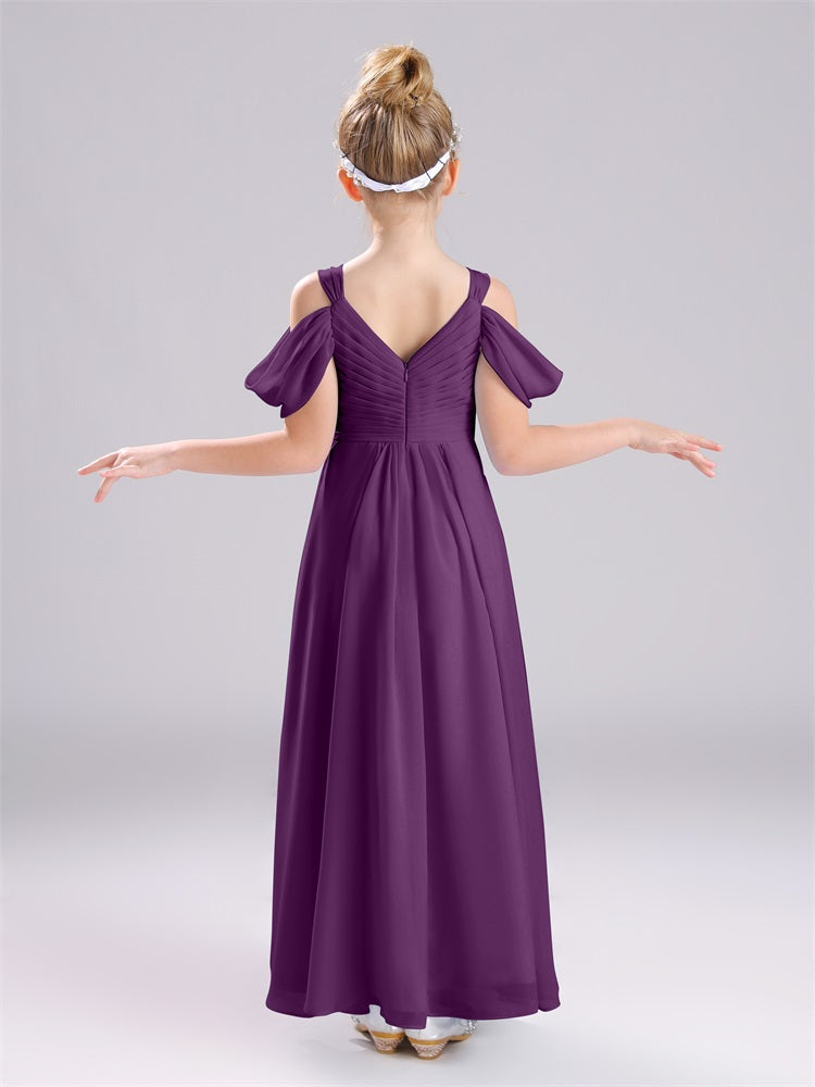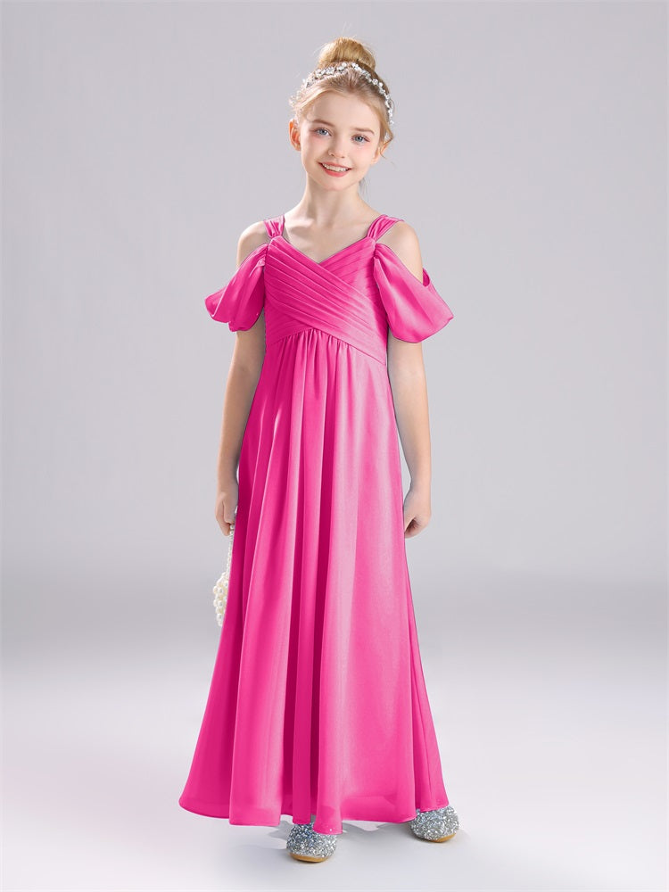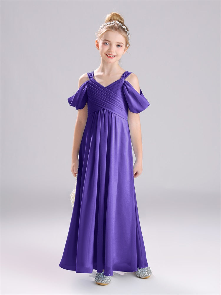 Sie suchen das perfekte Brautjungfernkleid? Suchen Sie nicht weiter als unsere A-Linie Off The Shoulder Straps Pleats Chiffon Kleid. Mit schmeichelhaften Falten und einer bequemen A-Linien-Silhouette wird dieses Kleid Ihre Junior-Brautjungfer wie eine Prinzessin fühlen lassen. Aus hochwertigem Chiffon gefertigt, ist dieses Kleid sowohl elegant als auch langlebig.
