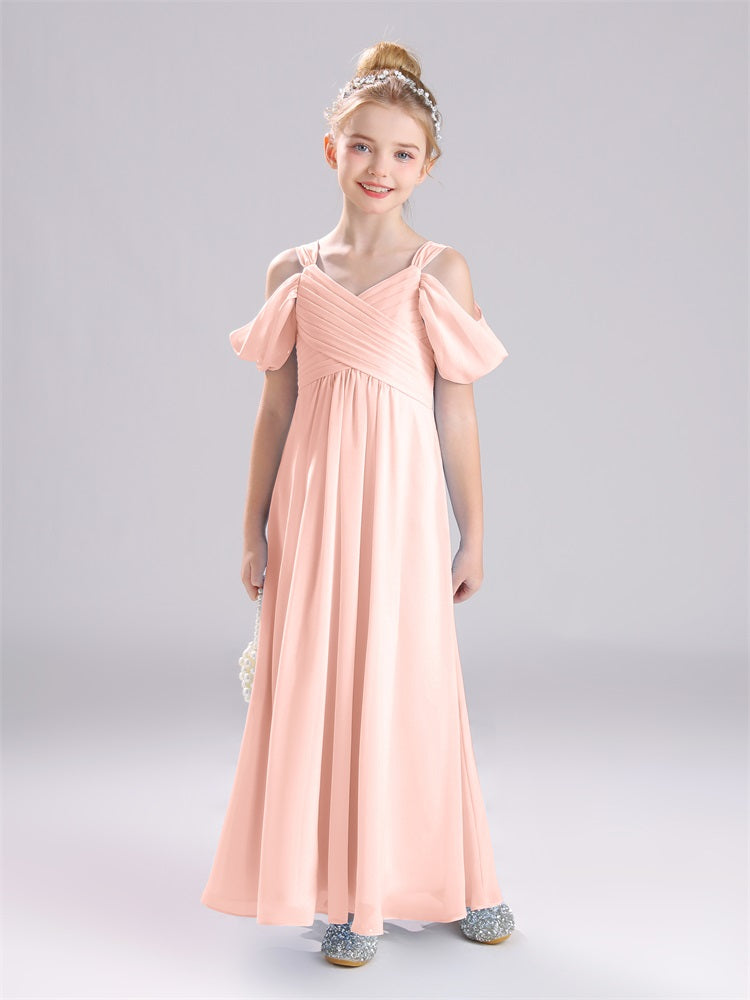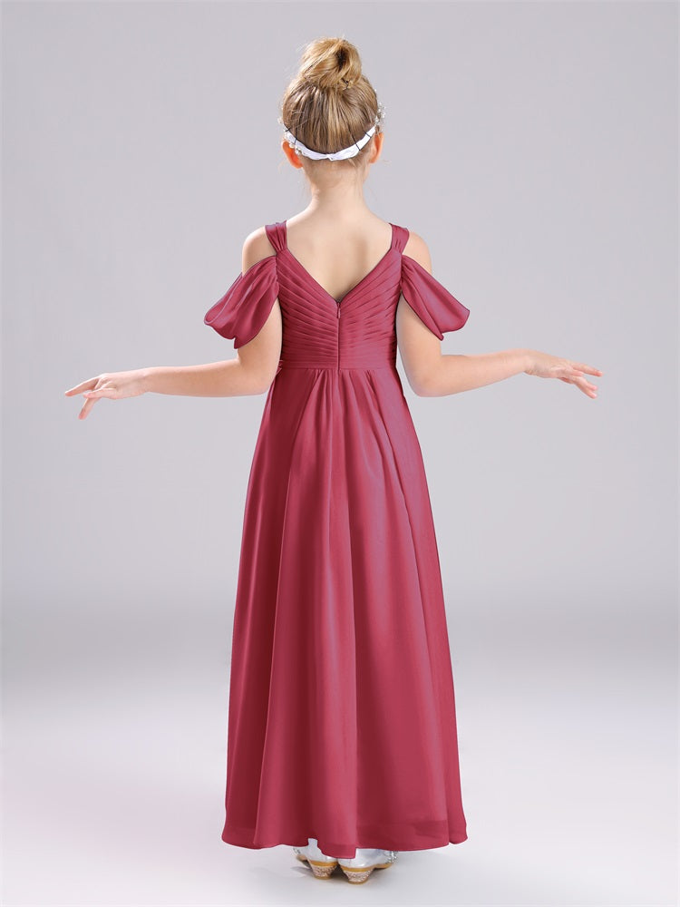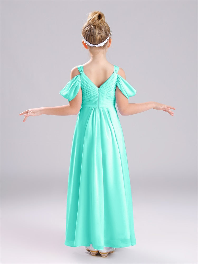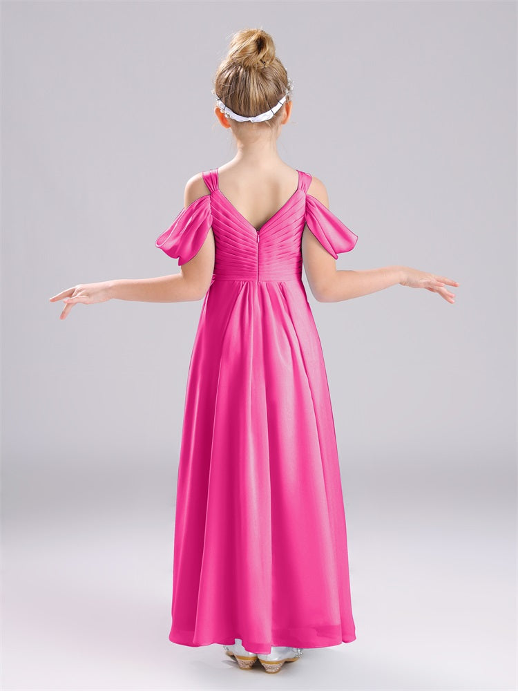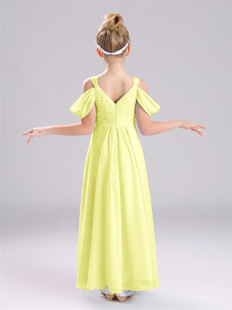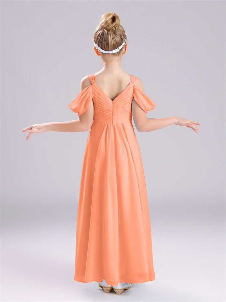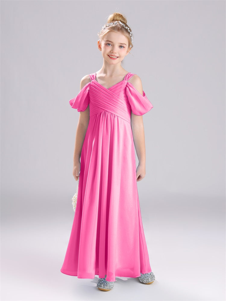 Sie suchen das perfekte Brautjungfernkleid? Suchen Sie nicht weiter als unsere A-Linie Off The Shoulder Straps Pleats Chiffon Kleid. Mit schmeichelhaften Falten und einer bequemen A-Linien-Silhouette wird dieses Kleid Ihre Junior-Brautjungfer wie eine Prinzessin fühlen lassen. Aus hochwertigem Chiffon gefertigt, ist dieses Kleid sowohl elegant als auch langlebig.