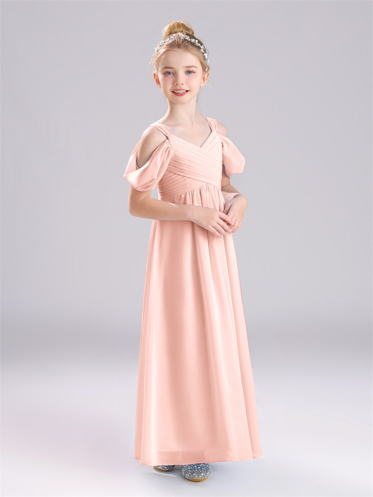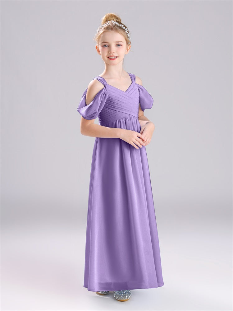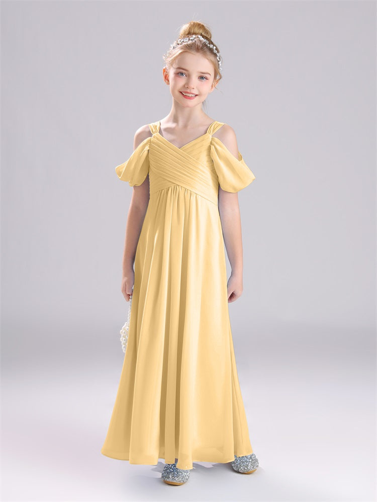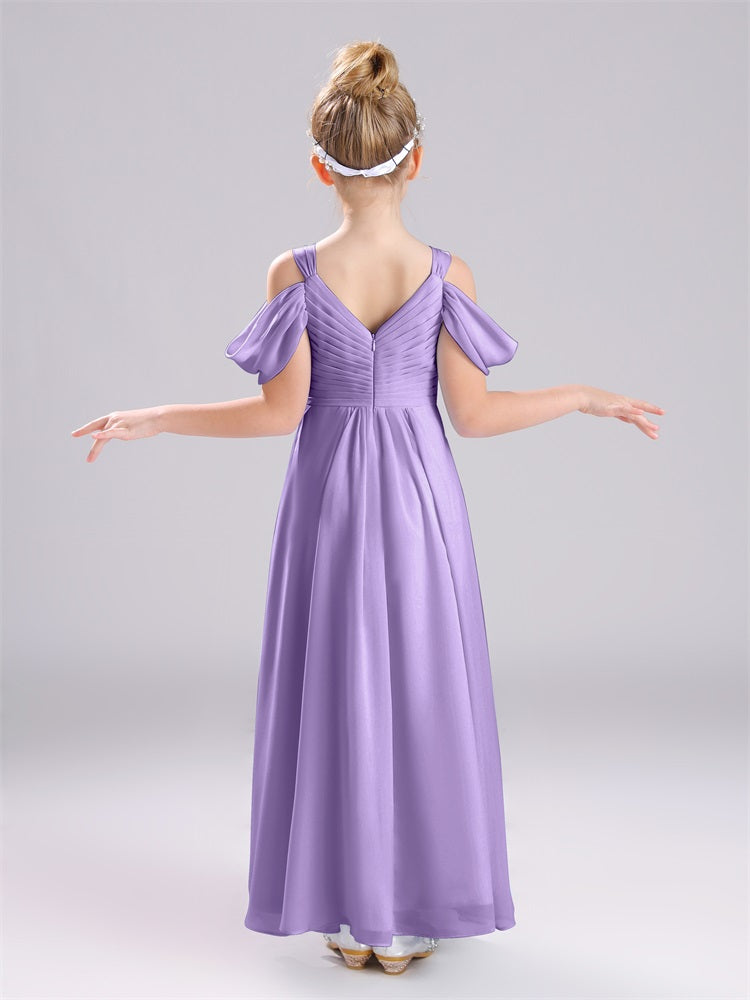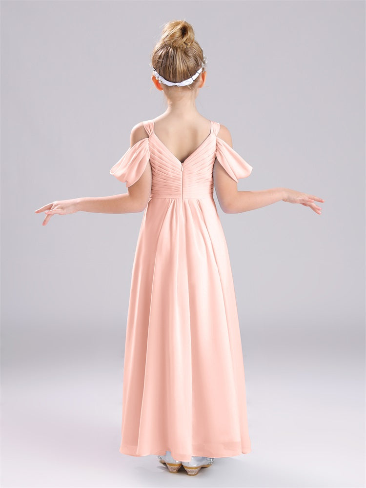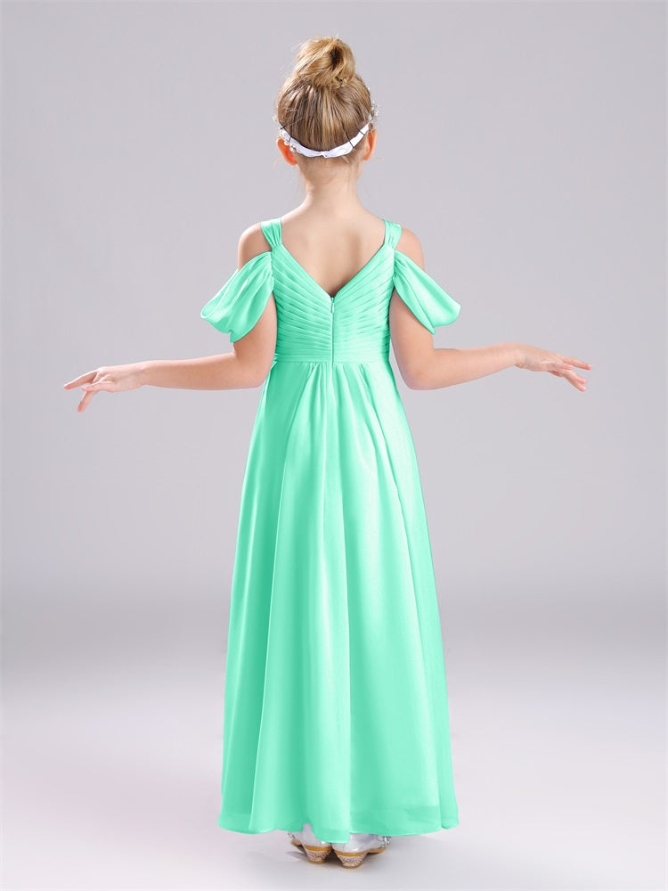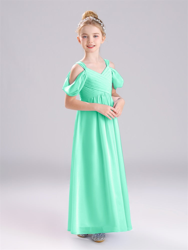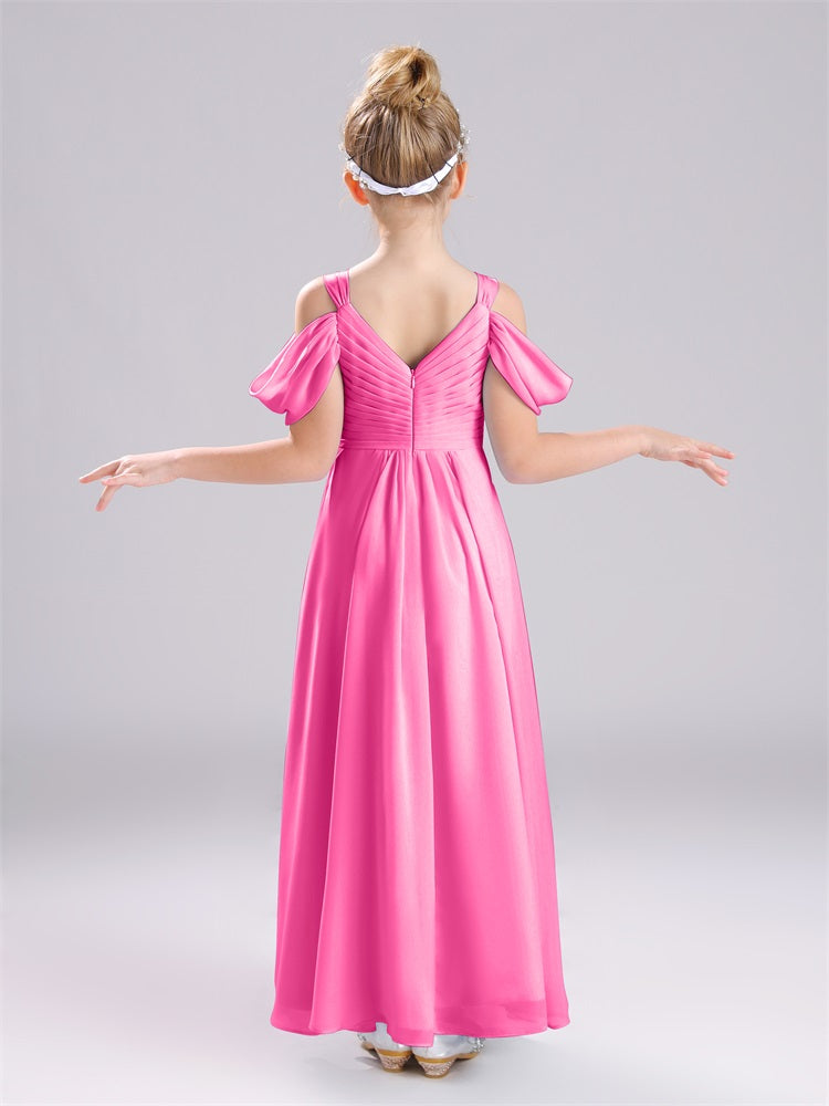 Sie suchen das perfekte Brautjungfernkleid? Suchen Sie nicht weiter als unsere A-Linie Off The Shoulder Straps Pleats Chiffon Kleid. Mit schmeichelhaften Falten und einer bequemen A-Linien-Silhouette wird dieses Kleid Ihre Junior-Brautjungfer wie eine Prinzessin fühlen lassen. Aus hochwertigem Chiffon gefertigt, ist dieses Kleid sowohl elegant als auch langlebig.