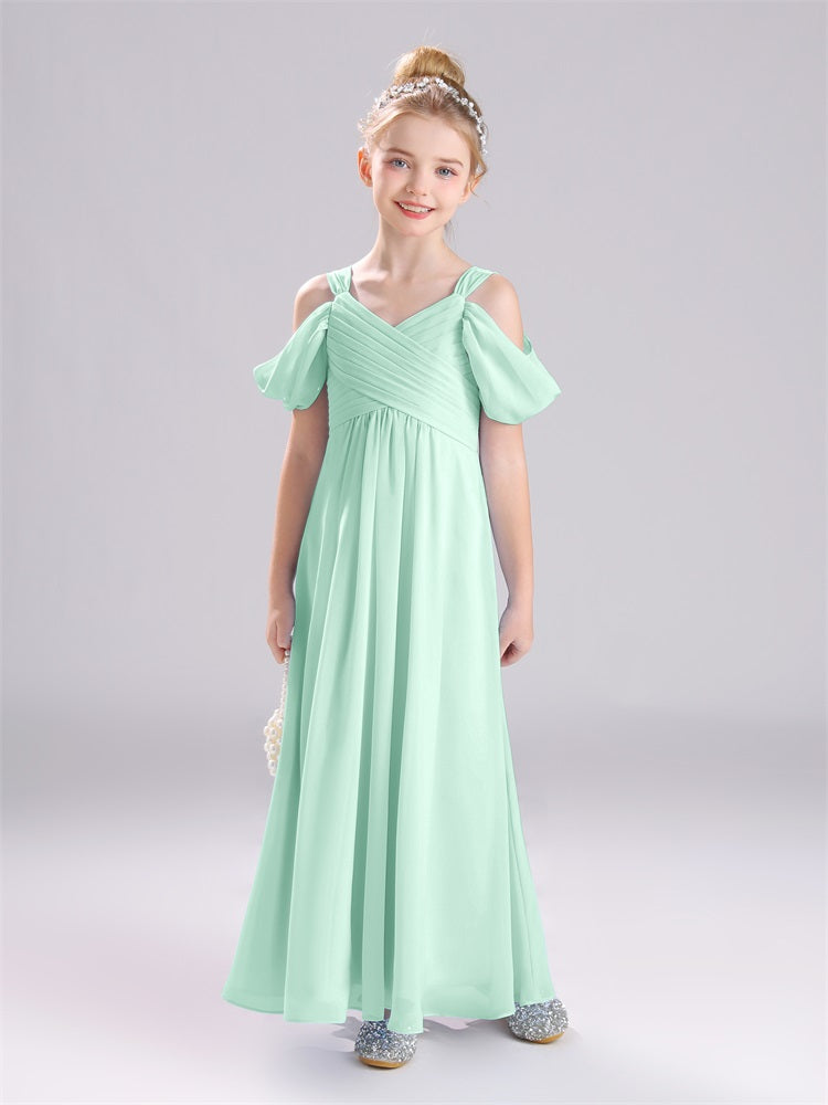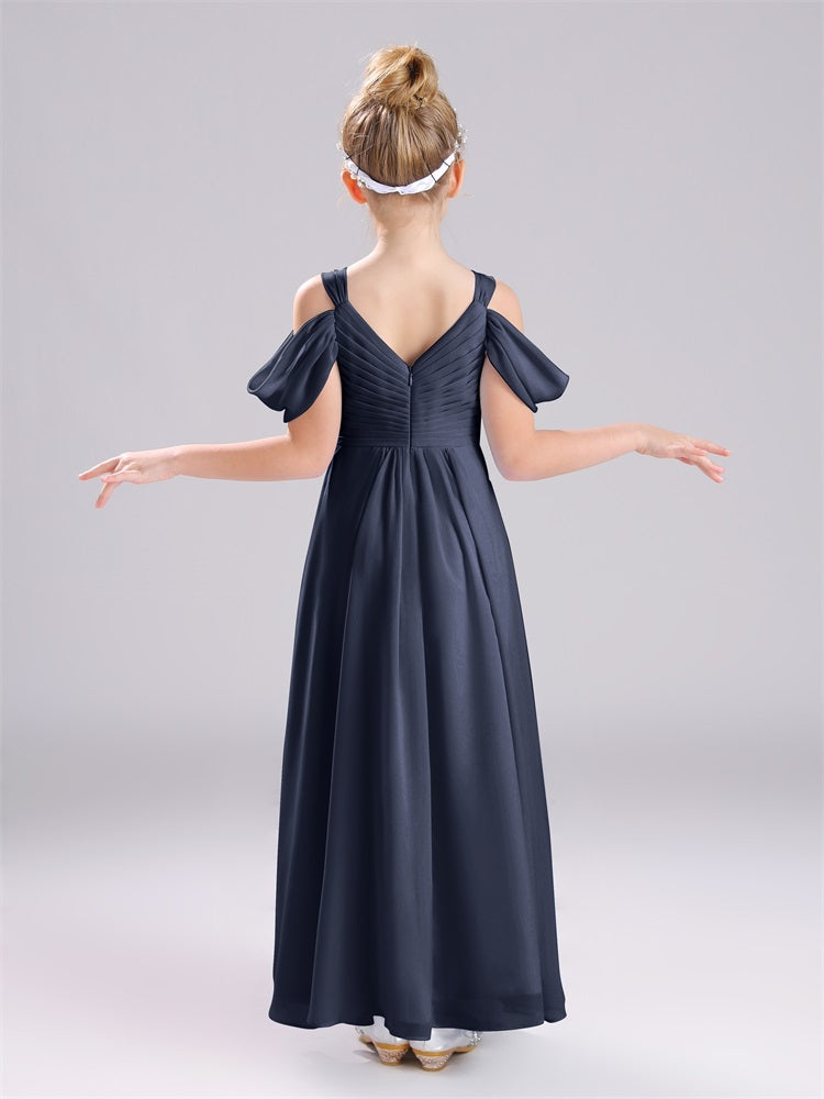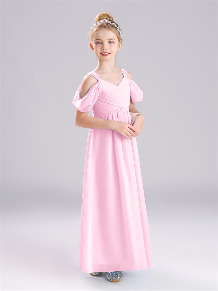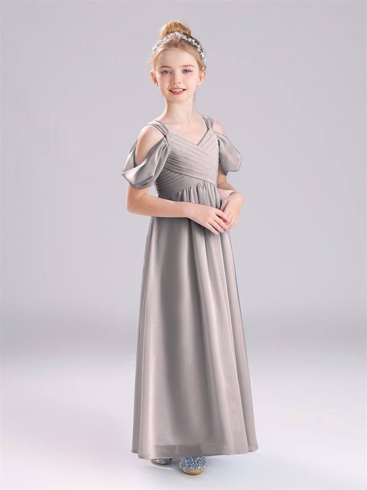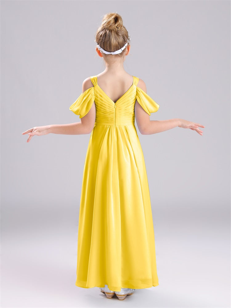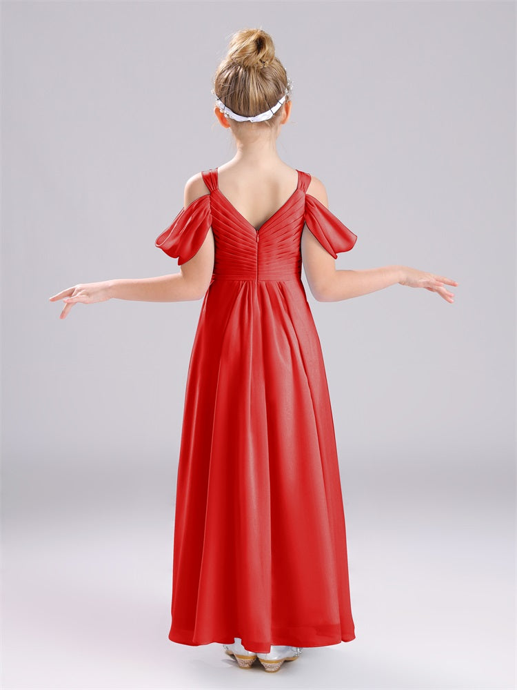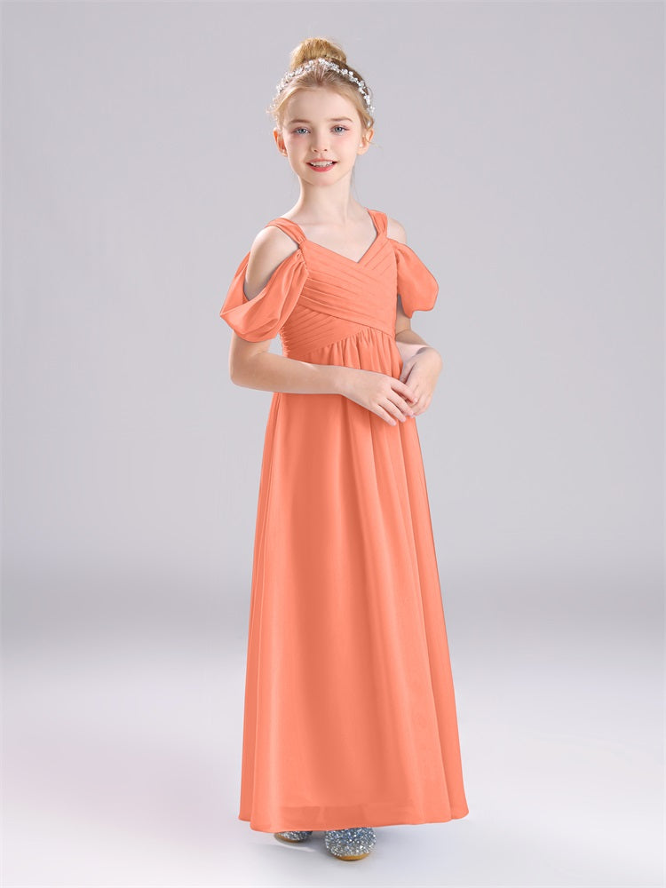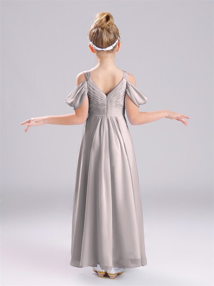 Sie suchen das perfekte Brautjungfernkleid? Suchen Sie nicht weiter als unsere A-Linie Off The Shoulder Straps Pleats Chiffon Kleid. Mit schmeichelhaften Falten und einer bequemen A-Linien-Silhouette wird dieses Kleid Ihre Junior-Brautjungfer wie eine Prinzessin fühlen lassen. Aus hochwertigem Chiffon gefertigt, ist dieses Kleid sowohl elegant als auch langlebig.