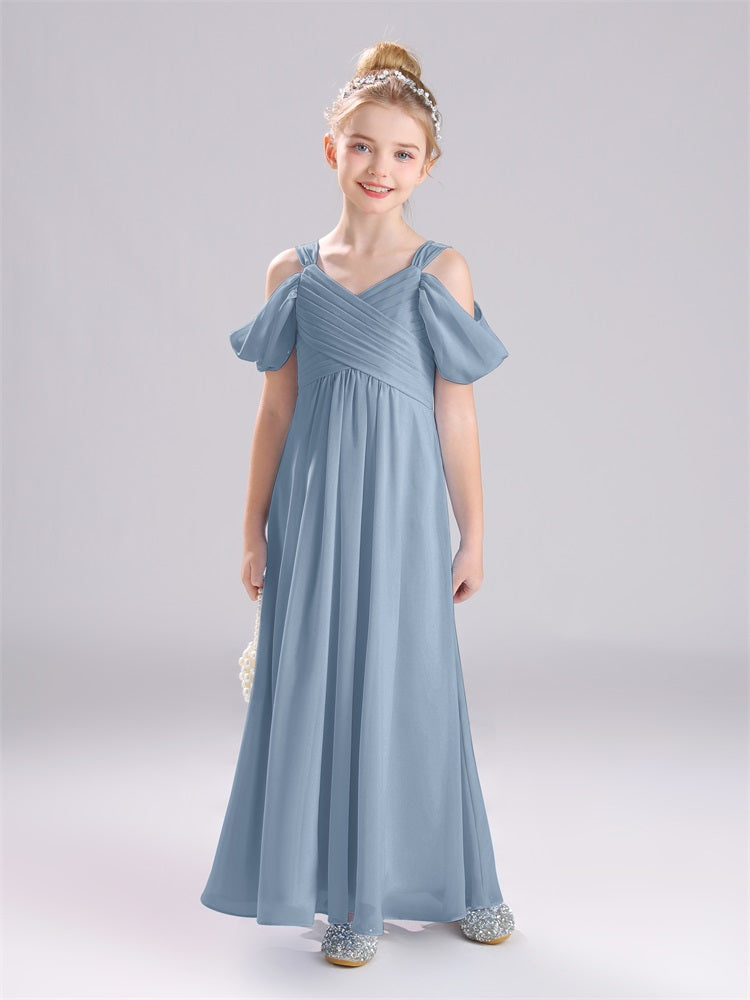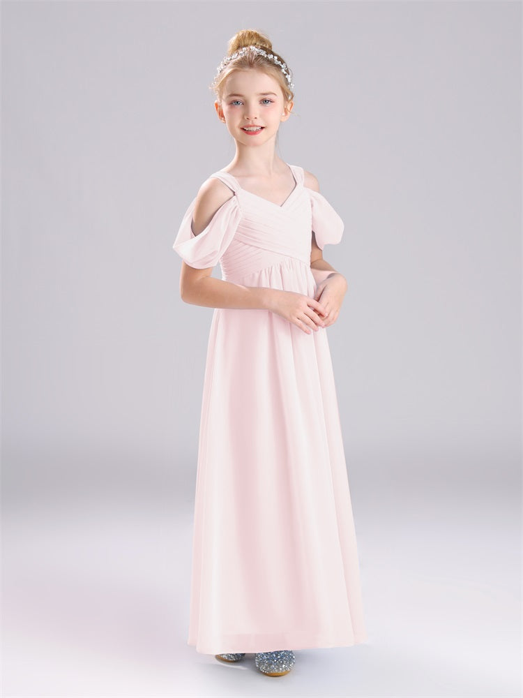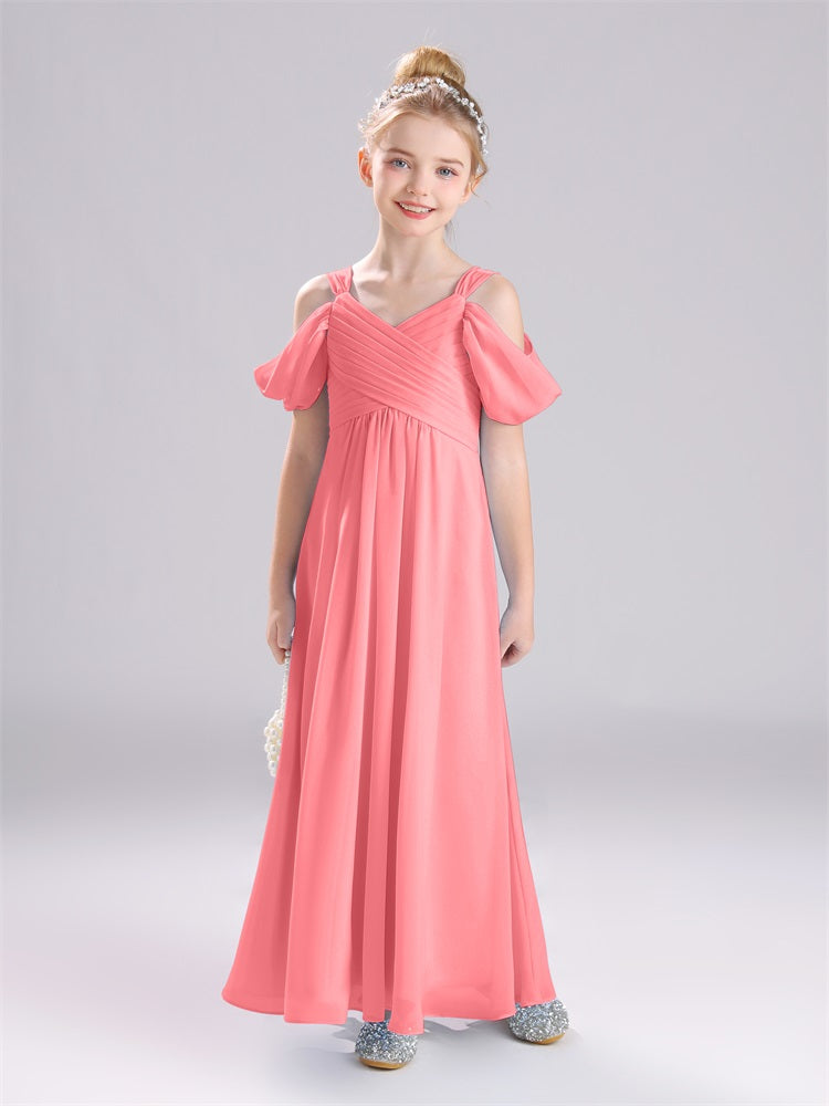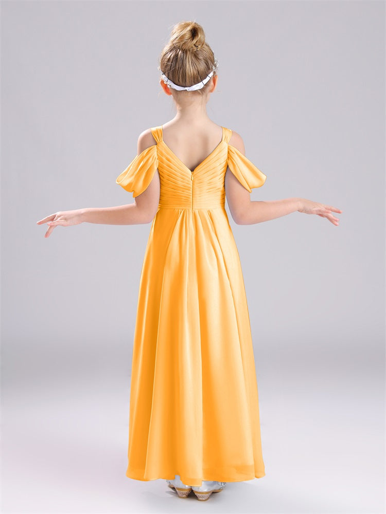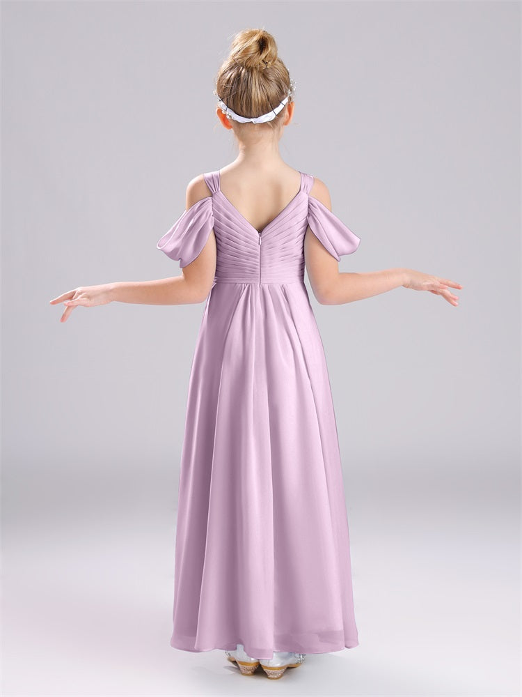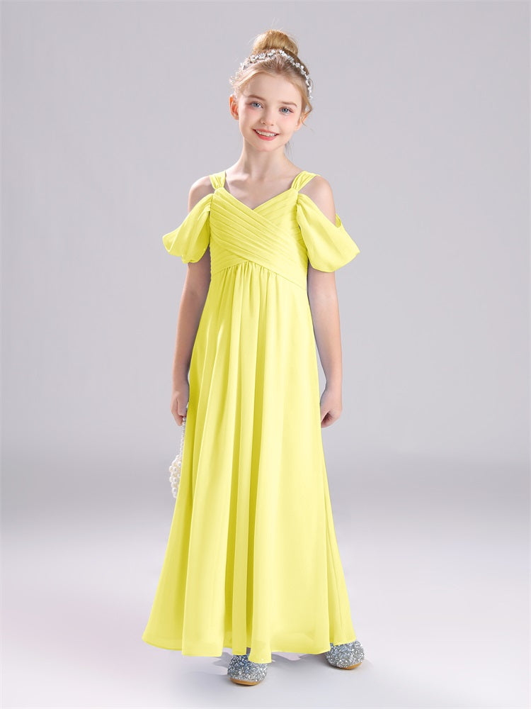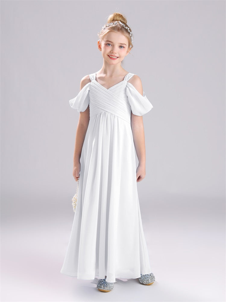 Sie suchen das perfekte Brautjungfernkleid? Suchen Sie nicht weiter als unsere A-Linie Off The Shoulder Straps Pleats Chiffon Kleid. Mit schmeichelhaften Falten und einer bequemen A-Linien-Silhouette wird dieses Kleid Ihre Junior-Brautjungfer wie eine Prinzessin fühlen lassen. Aus hochwertigem Chiffon gefertigt, ist dieses Kleid sowohl elegant als auch langlebig.