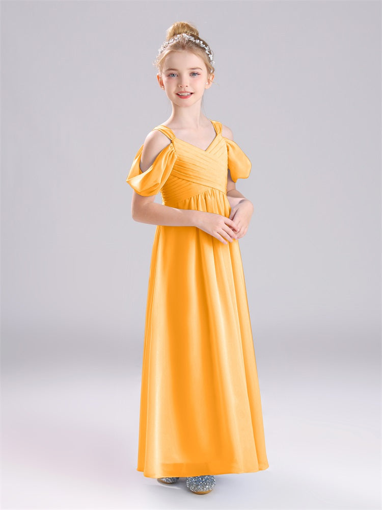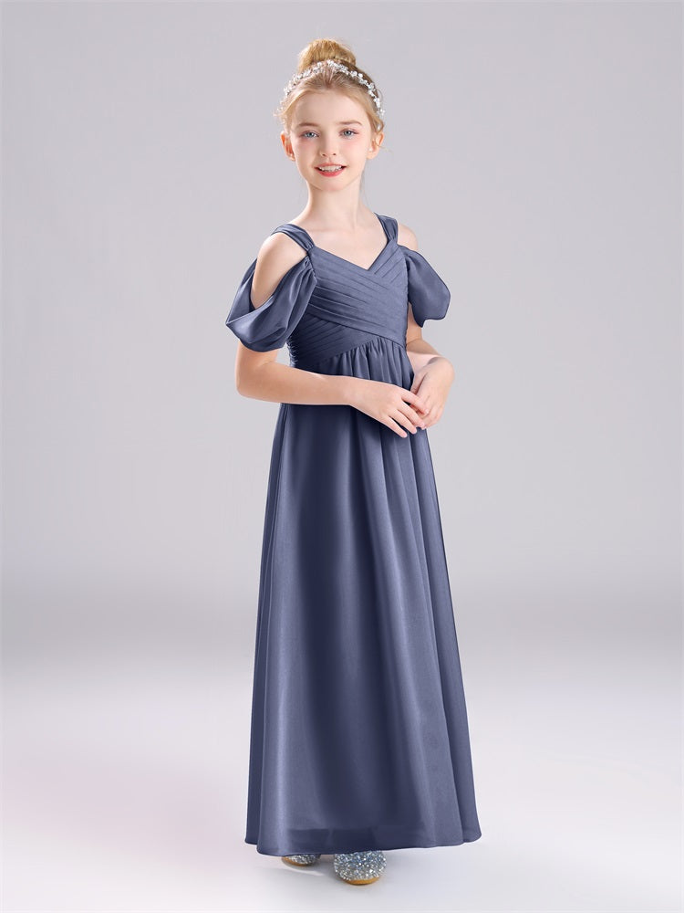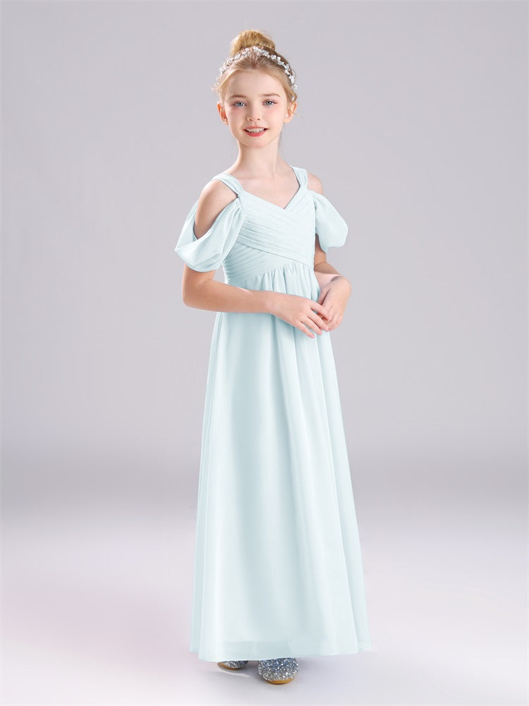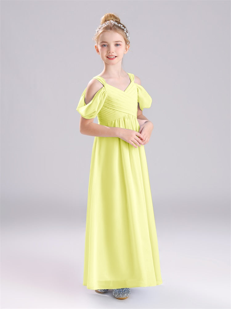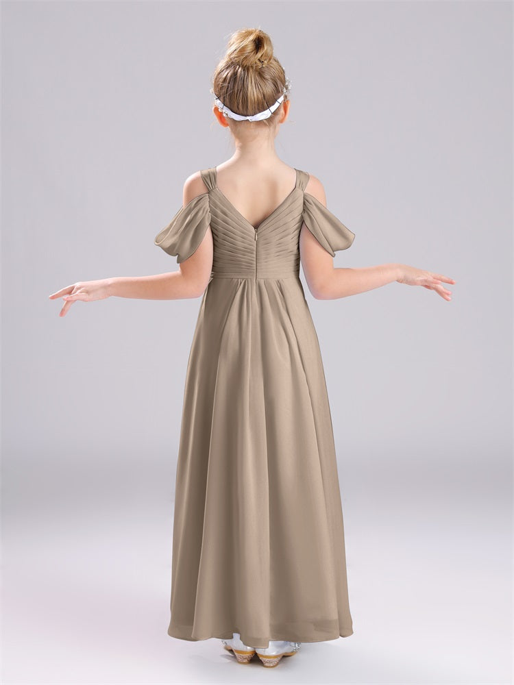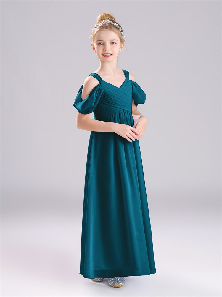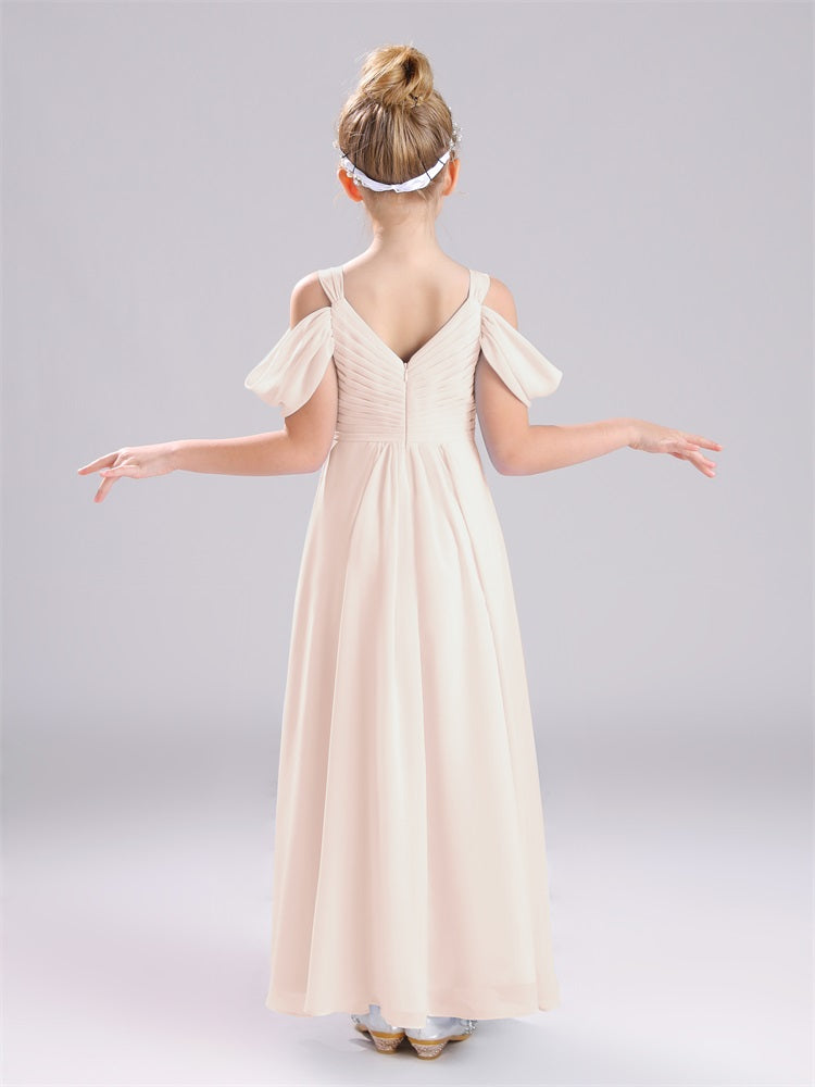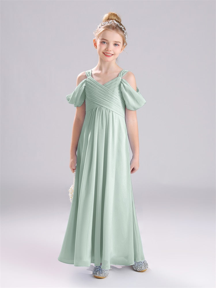 Sie suchen das perfekte Brautjungfernkleid? Suchen Sie nicht weiter als unsere A-Linie Off The Shoulder Straps Pleats Chiffon Kleid. Mit schmeichelhaften Falten und einer bequemen A-Linien-Silhouette wird dieses Kleid Ihre Junior-Brautjungfer wie eine Prinzessin fühlen lassen. Aus hochwertigem Chiffon gefertigt, ist dieses Kleid sowohl elegant als auch langlebig.