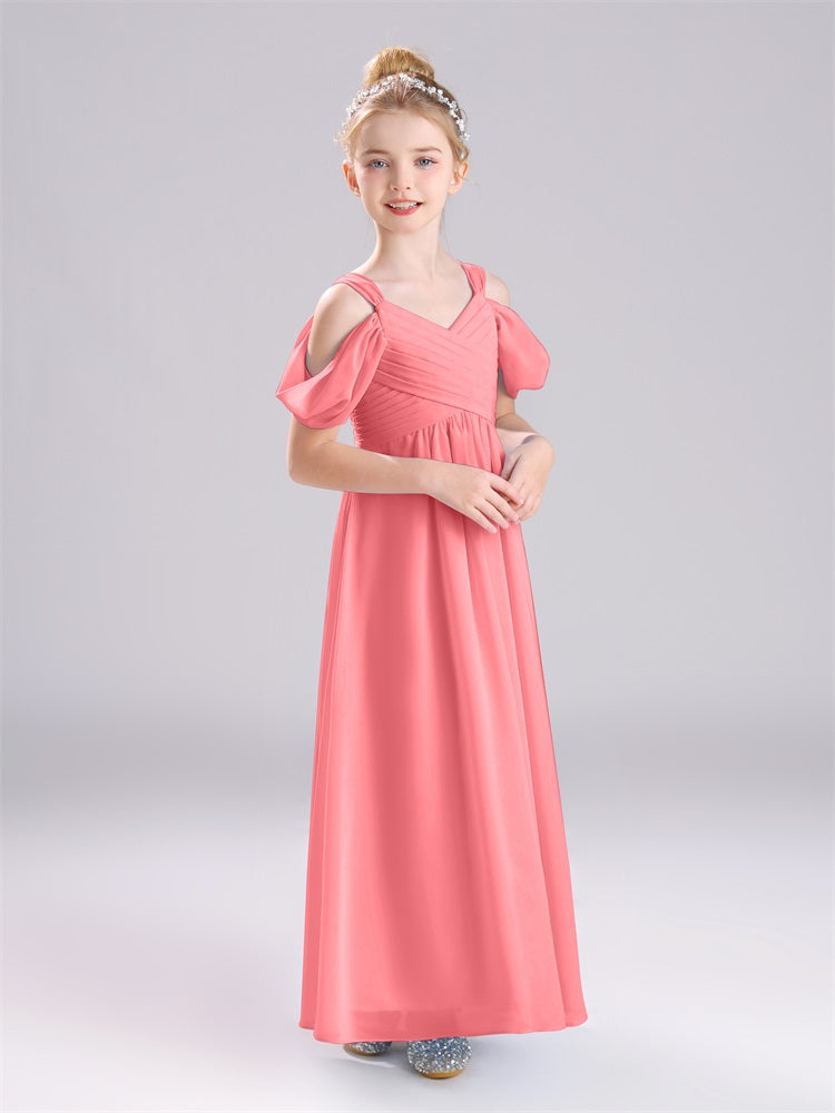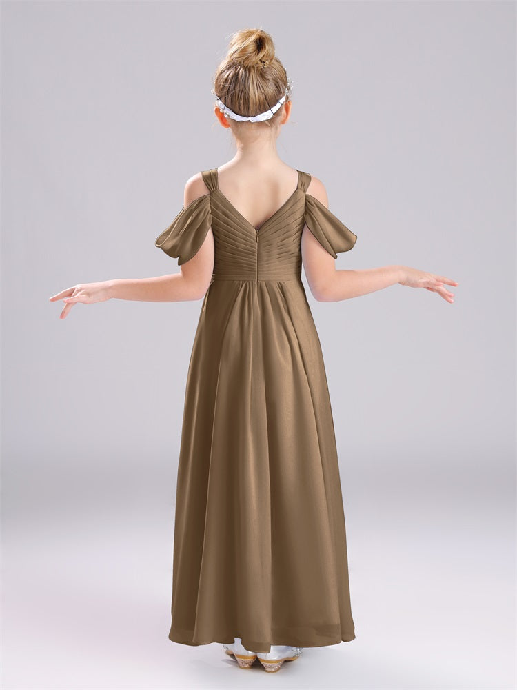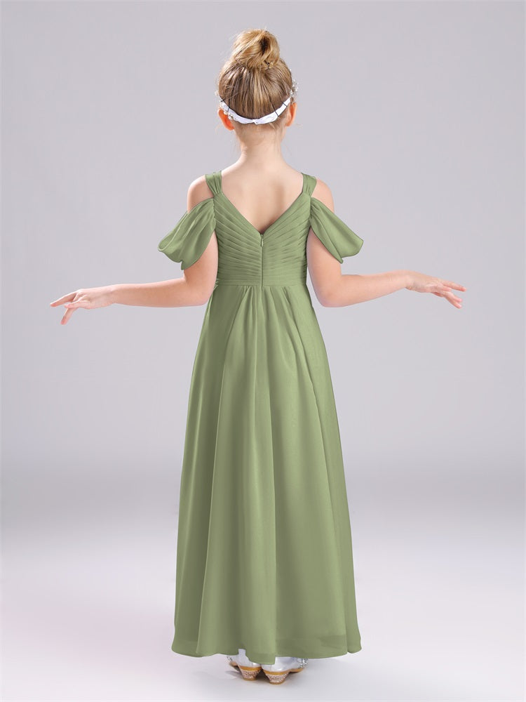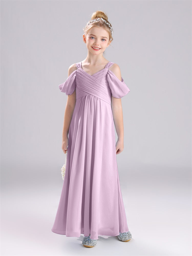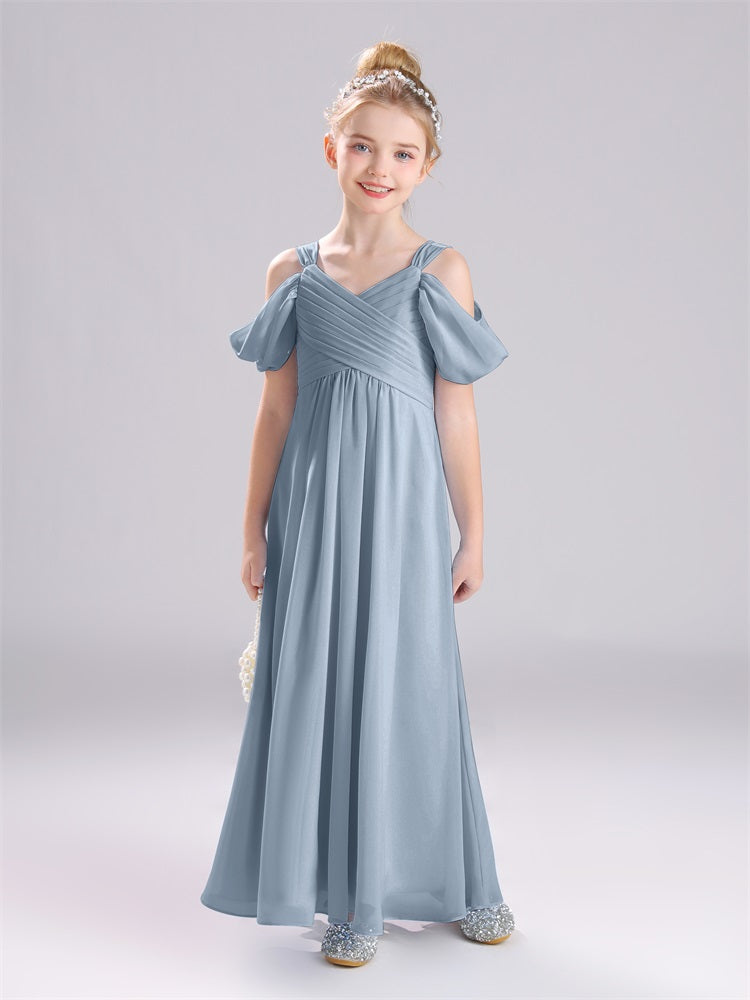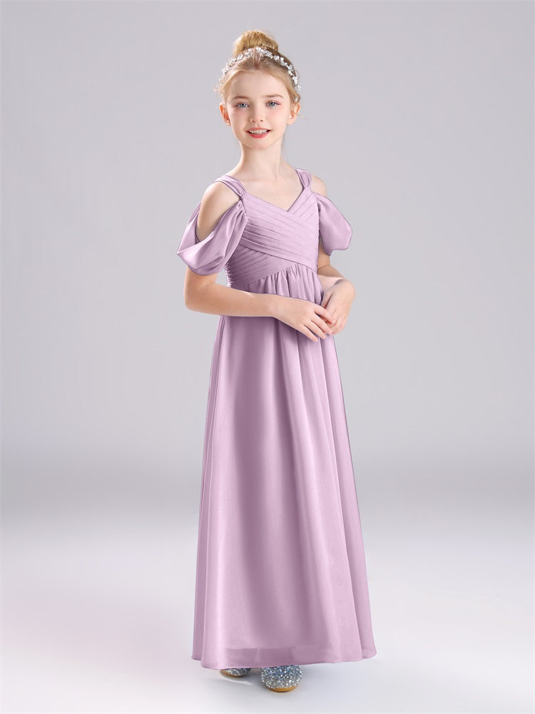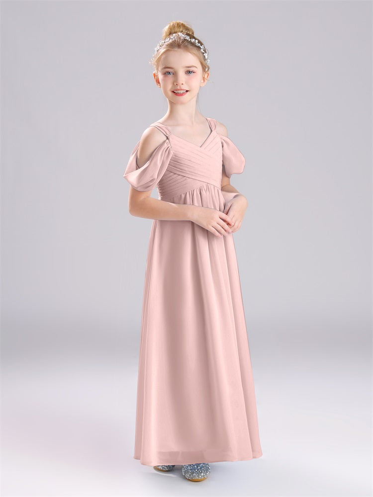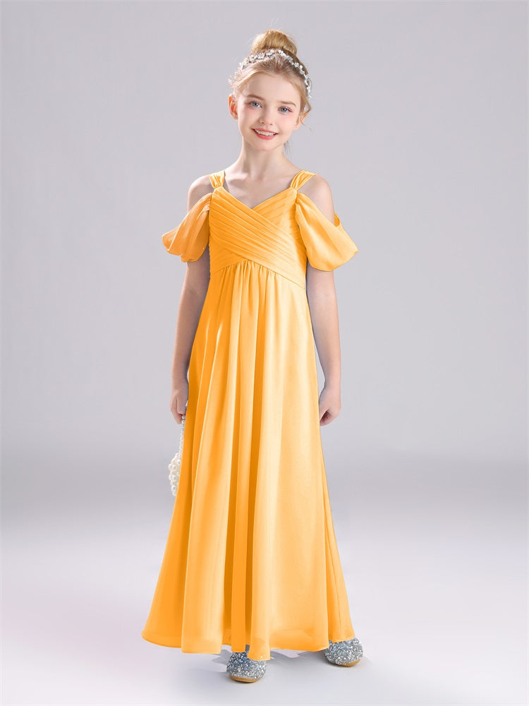 Sie suchen das perfekte Brautjungfernkleid? Suchen Sie nicht weiter als unsere A-Linie Off The Shoulder Straps Pleats Chiffon Kleid. Mit schmeichelhaften Falten und einer bequemen A-Linien-Silhouette wird dieses Kleid Ihre Junior-Brautjungfer wie eine Prinzessin fühlen lassen. Aus hochwertigem Chiffon gefertigt, ist dieses Kleid sowohl elegant als auch langlebig.