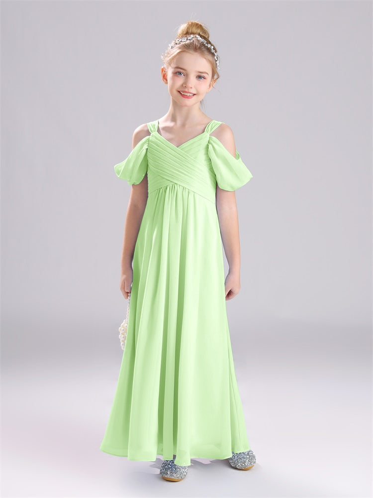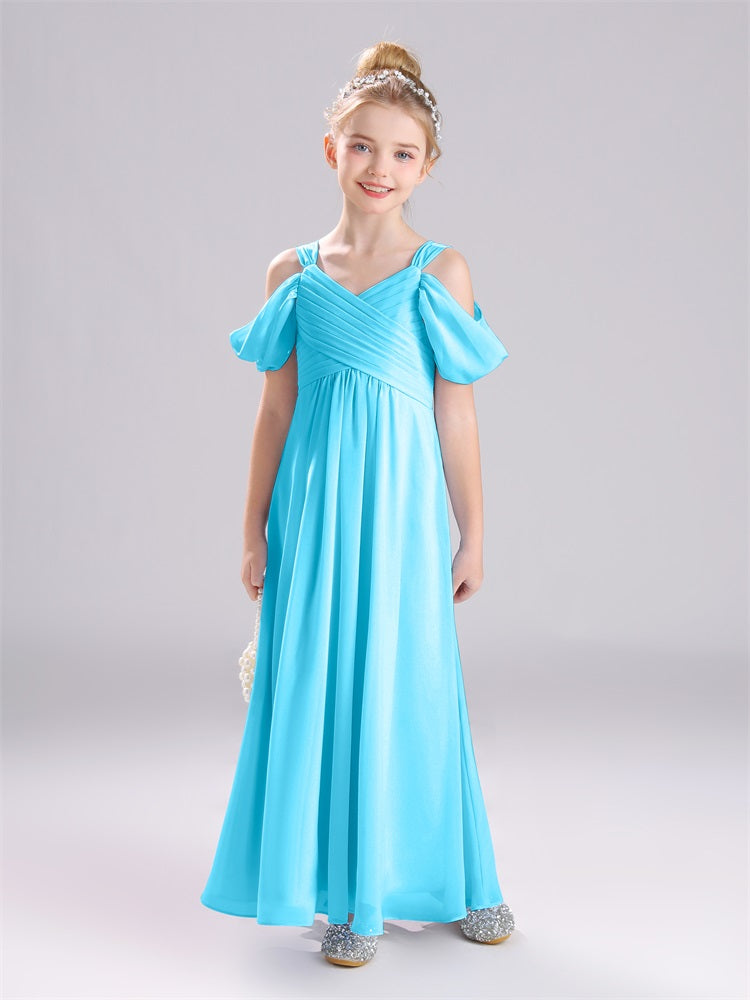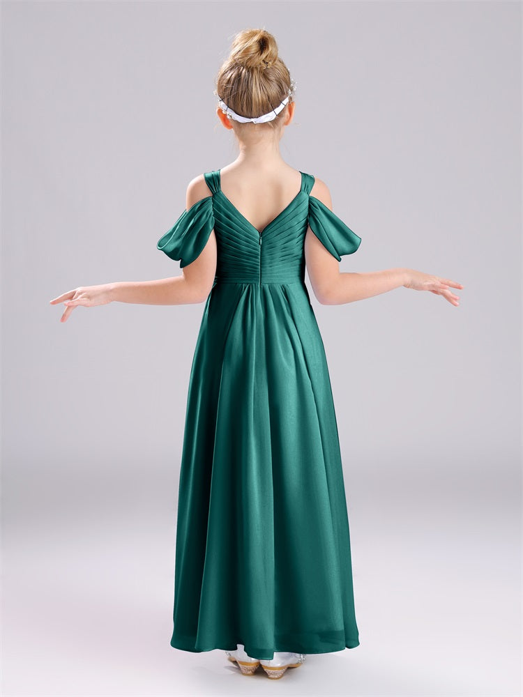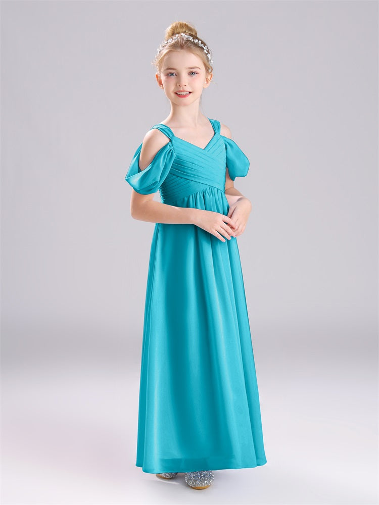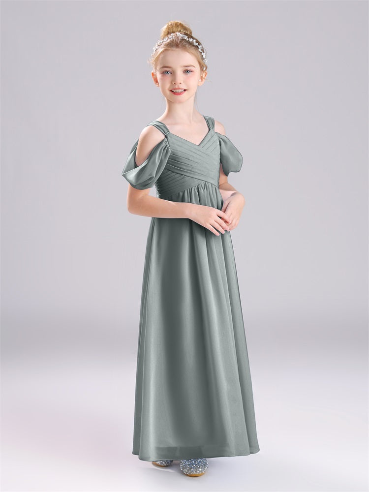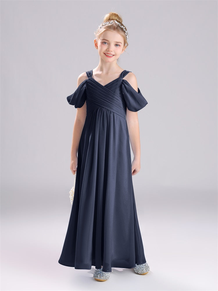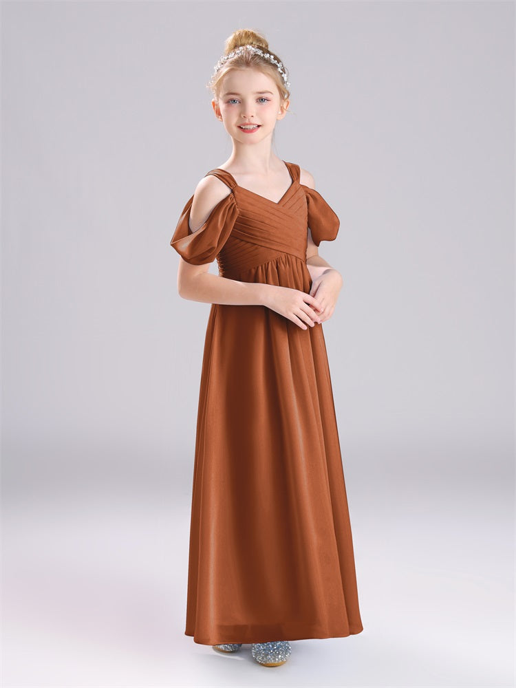Sie suchen das perfekte Brautjungfernkleid? Suchen Sie nicht weiter als unsere A-Linie Off The Shoulder Straps Pleats Chiffon Kleid. Mit schmeichelhaften Falten und einer bequemen A-Linien-Silhouette wird dieses Kleid Ihre Junior-Brautjungfer wie eine Prinzessin fühlen lassen. Aus hochwertigem Chiffon gefertigt, ist dieses Kleid sowohl elegant als auch langlebig.
