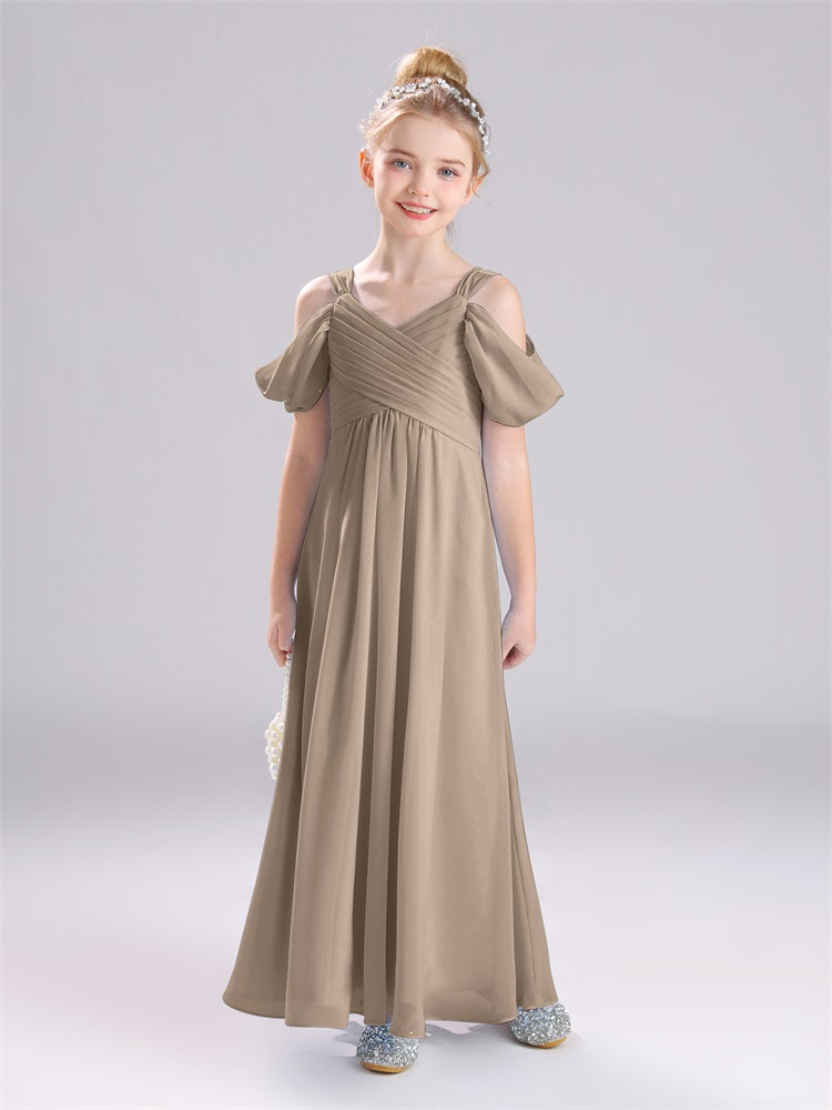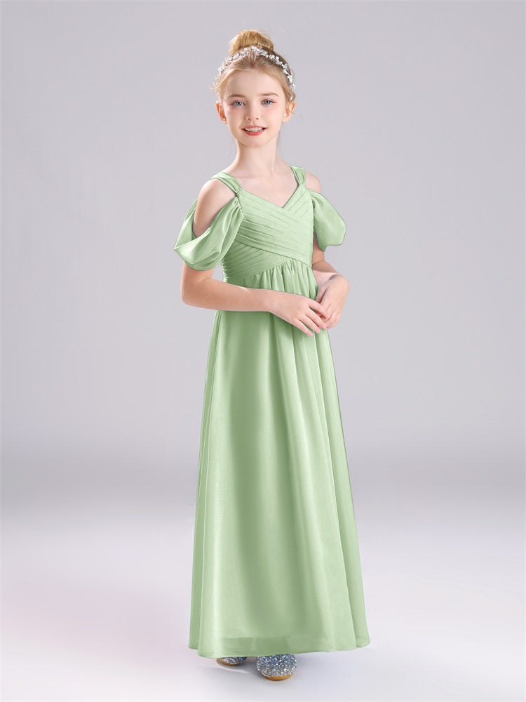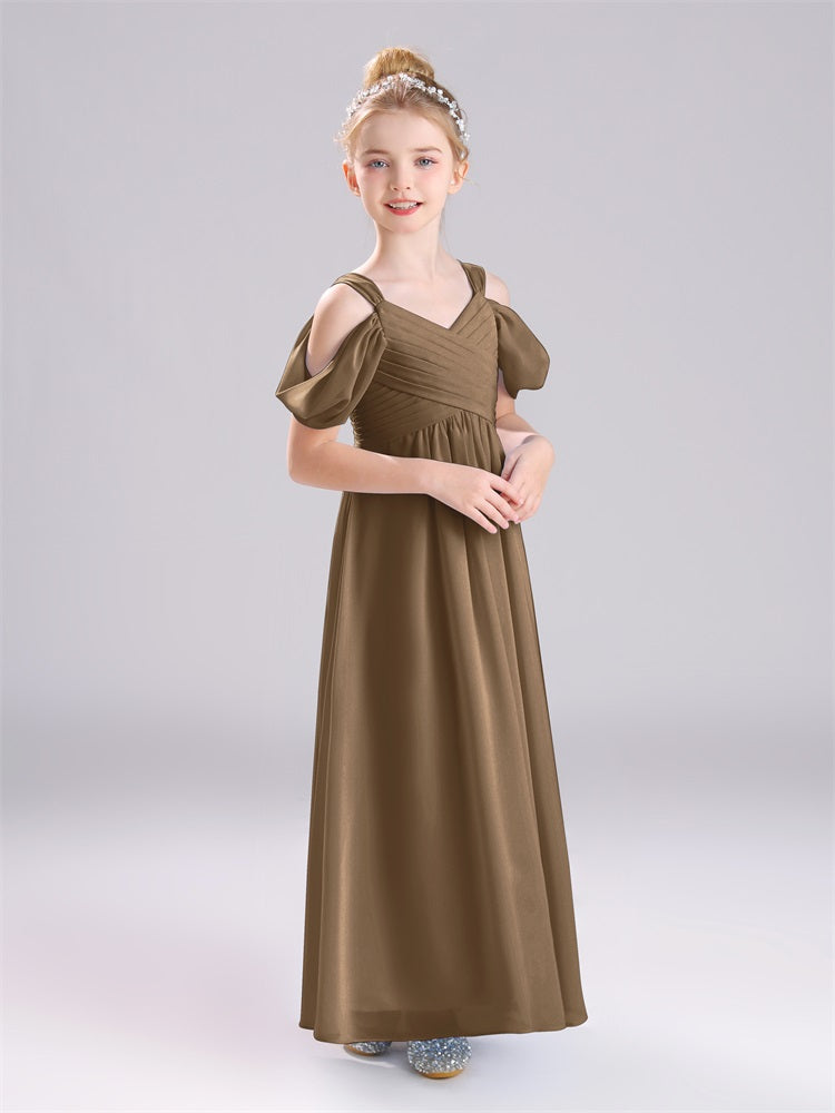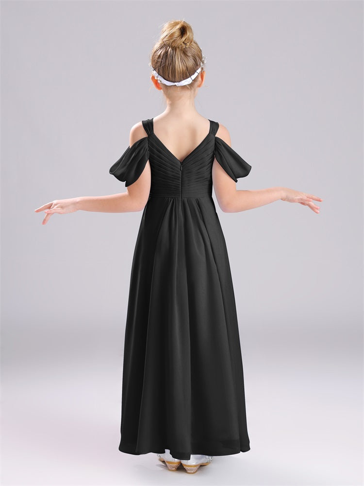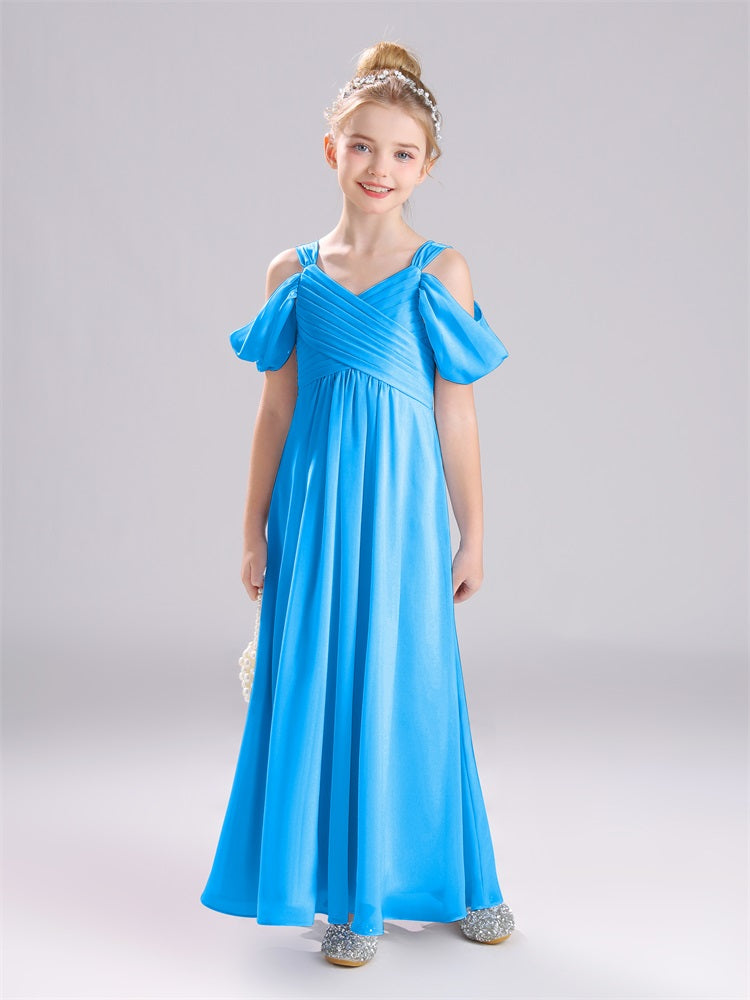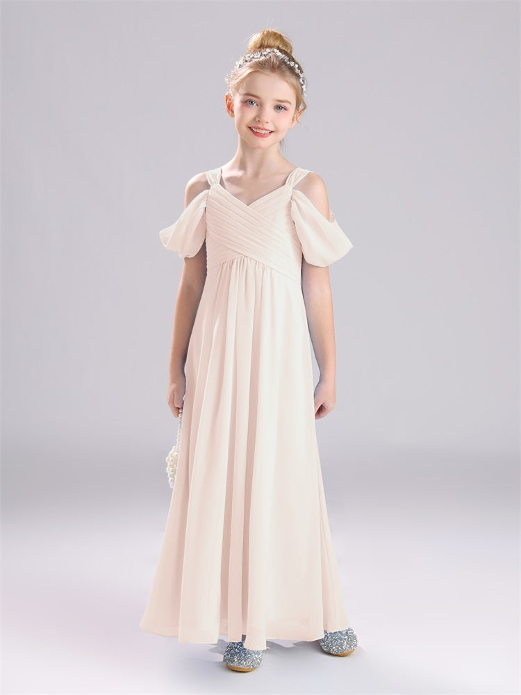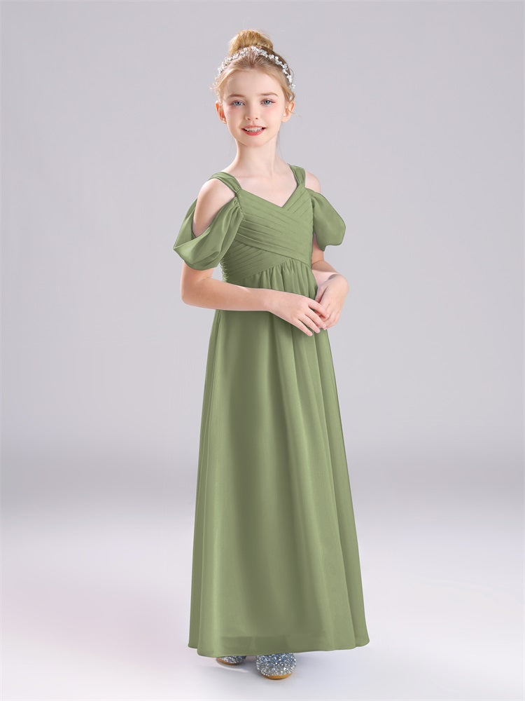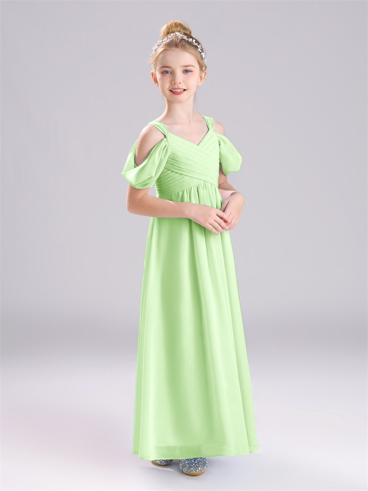 Sie suchen das perfekte Brautjungfernkleid? Suchen Sie nicht weiter als unsere A-Linie Off The Shoulder Straps Pleats Chiffon Kleid. Mit schmeichelhaften Falten und einer bequemen A-Linien-Silhouette wird dieses Kleid Ihre Junior-Brautjungfer wie eine Prinzessin fühlen lassen. Aus hochwertigem Chiffon gefertigt, ist dieses Kleid sowohl elegant als auch langlebig.