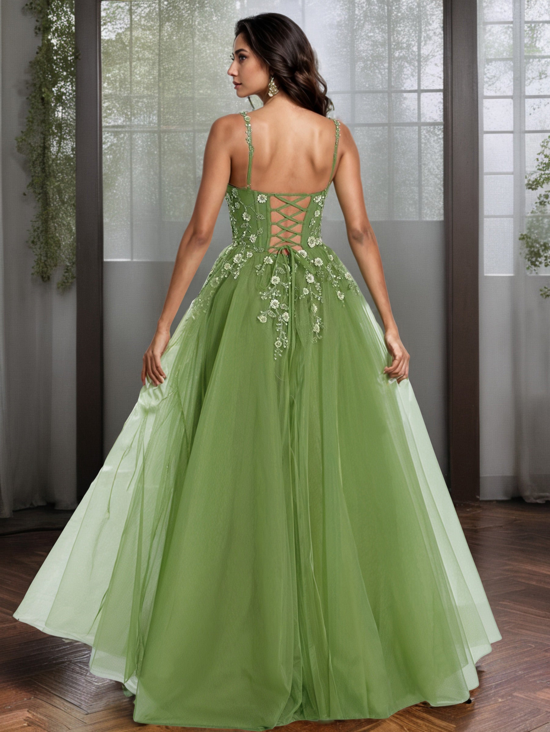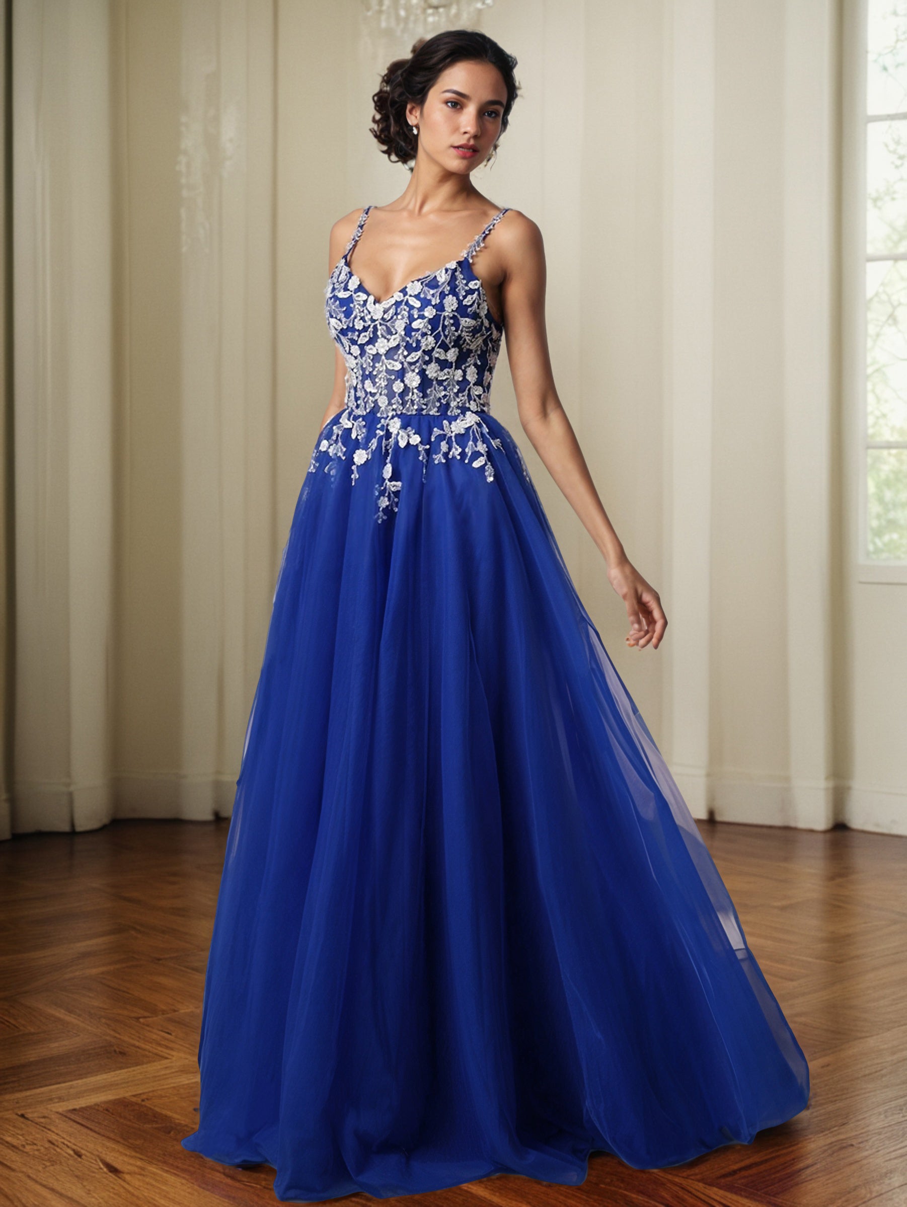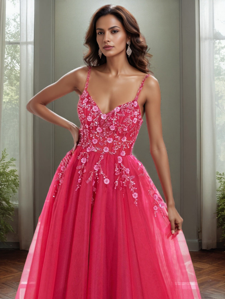 A-Linie Spaghetti-Träger Blumenapplikationen bodenlanges Abendkleid