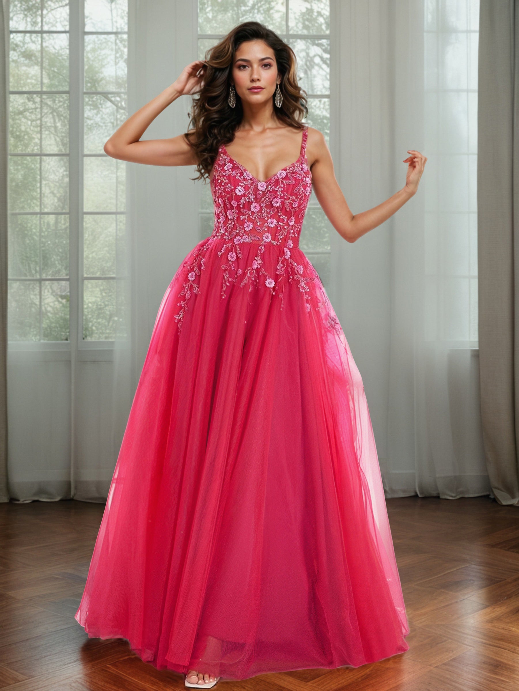 Genießen Sie den Abend mit unserem trendigen A-Linie Spaghetti-Träger Kleid! Mit atemberaubenden Blumenapplikationen und bodenlangem Schnitt ist dieses Kleid perfekt für jeden Anlass. Holen Sie sich jetzt Ihr neues Lieblingskleid und fühlen Sie sich auf jedem Event glamourös!