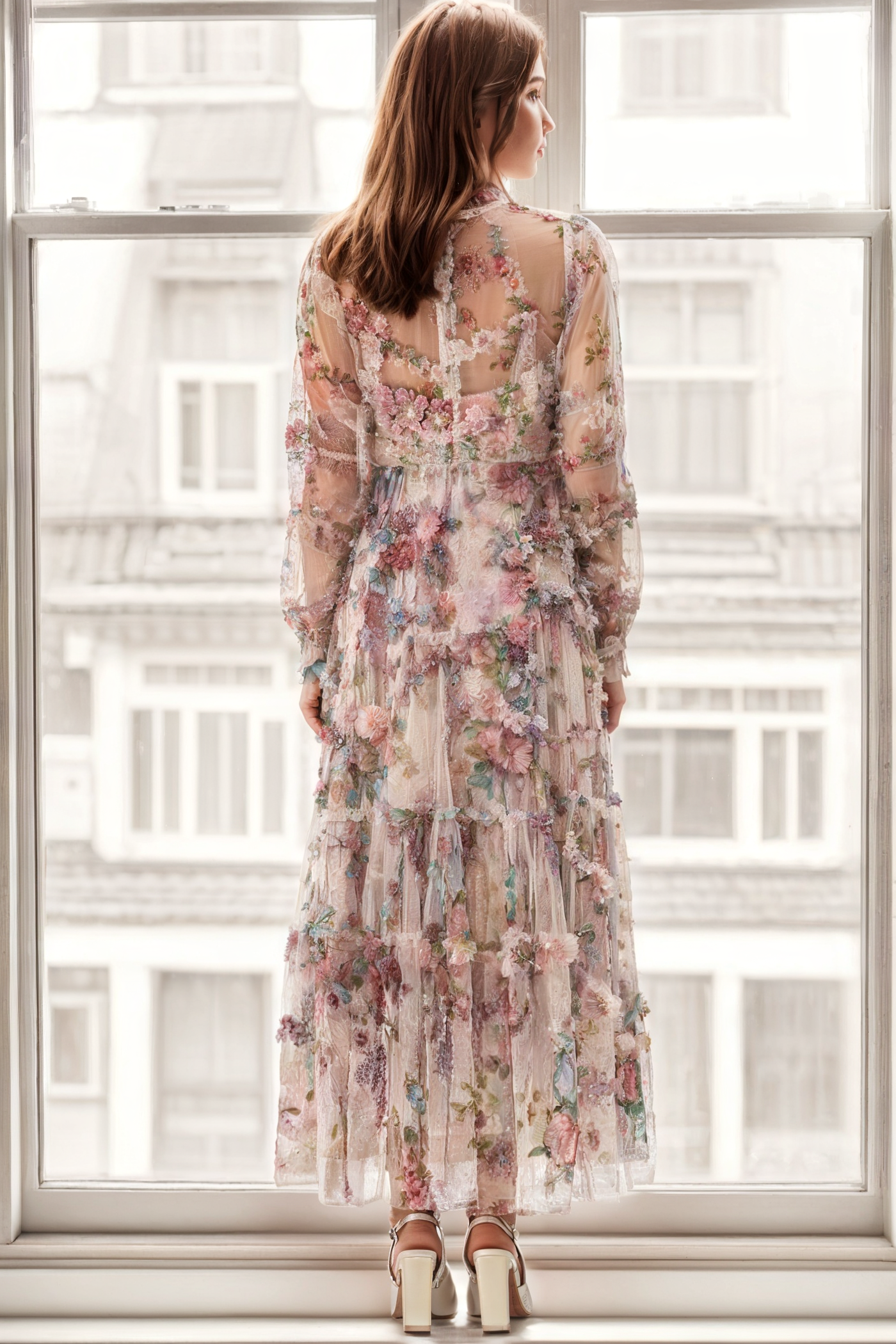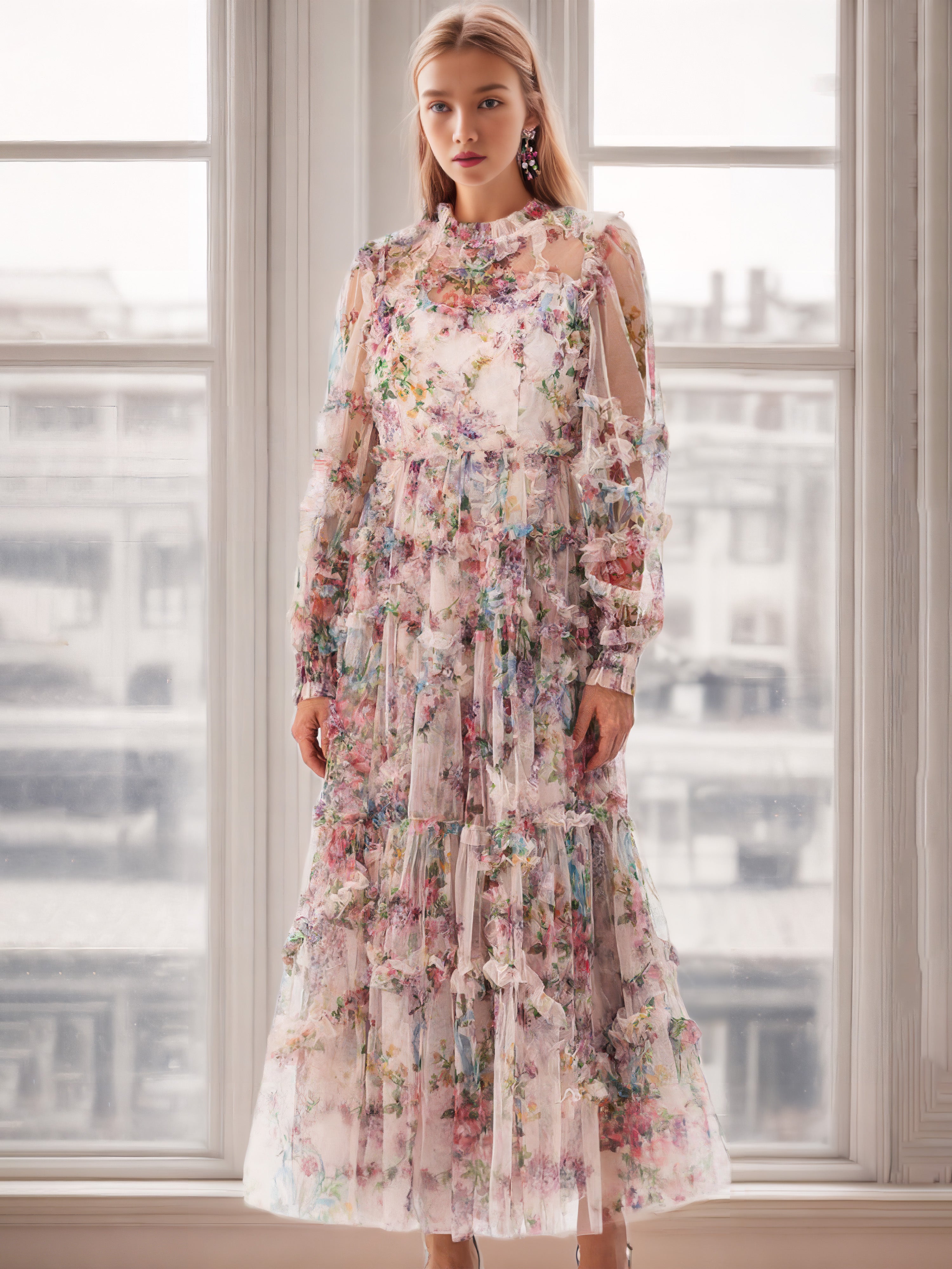 Apricot Mock Neck Floral Lange Ärmel Ruffle Brautjungfernkleider