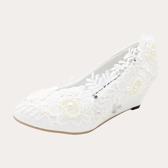 Diese eleganten Hochzeitsschuhe sind mit handgefertigten Spitzen und einer Herzform überzogen. Die runde Perle und der Peep Toe geben Ihrem Outfit eine verspielte Note. Perfekt für einen romantischen Spaziergang zum Altar.