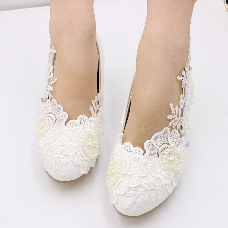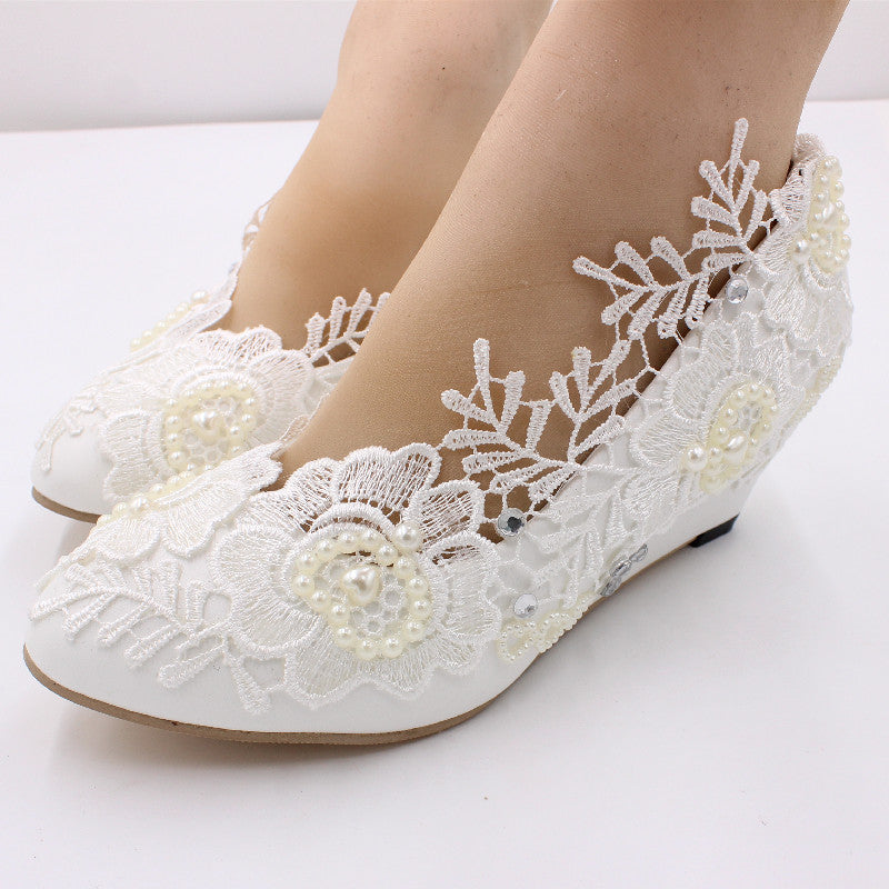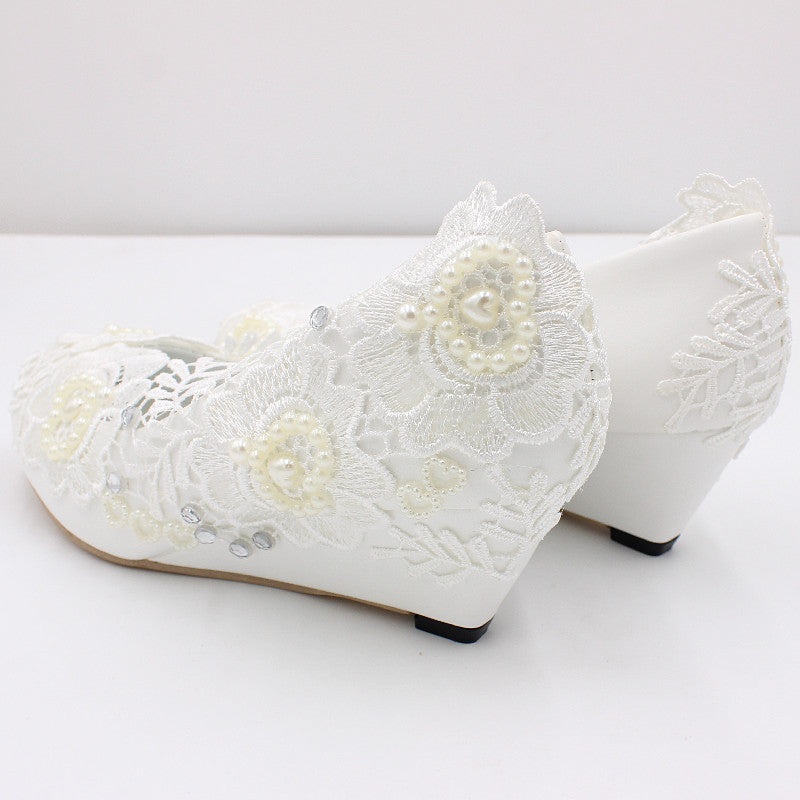Aufwendige Spitze bedeckt Herz Runde Perle verschönert Peep Toe Hochzeit Schuhe