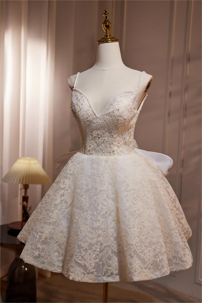 Bedruckte Spitze Spaghetti-Träger V-Ausschnitt Fliege Sicken Kurzes Ballkleid