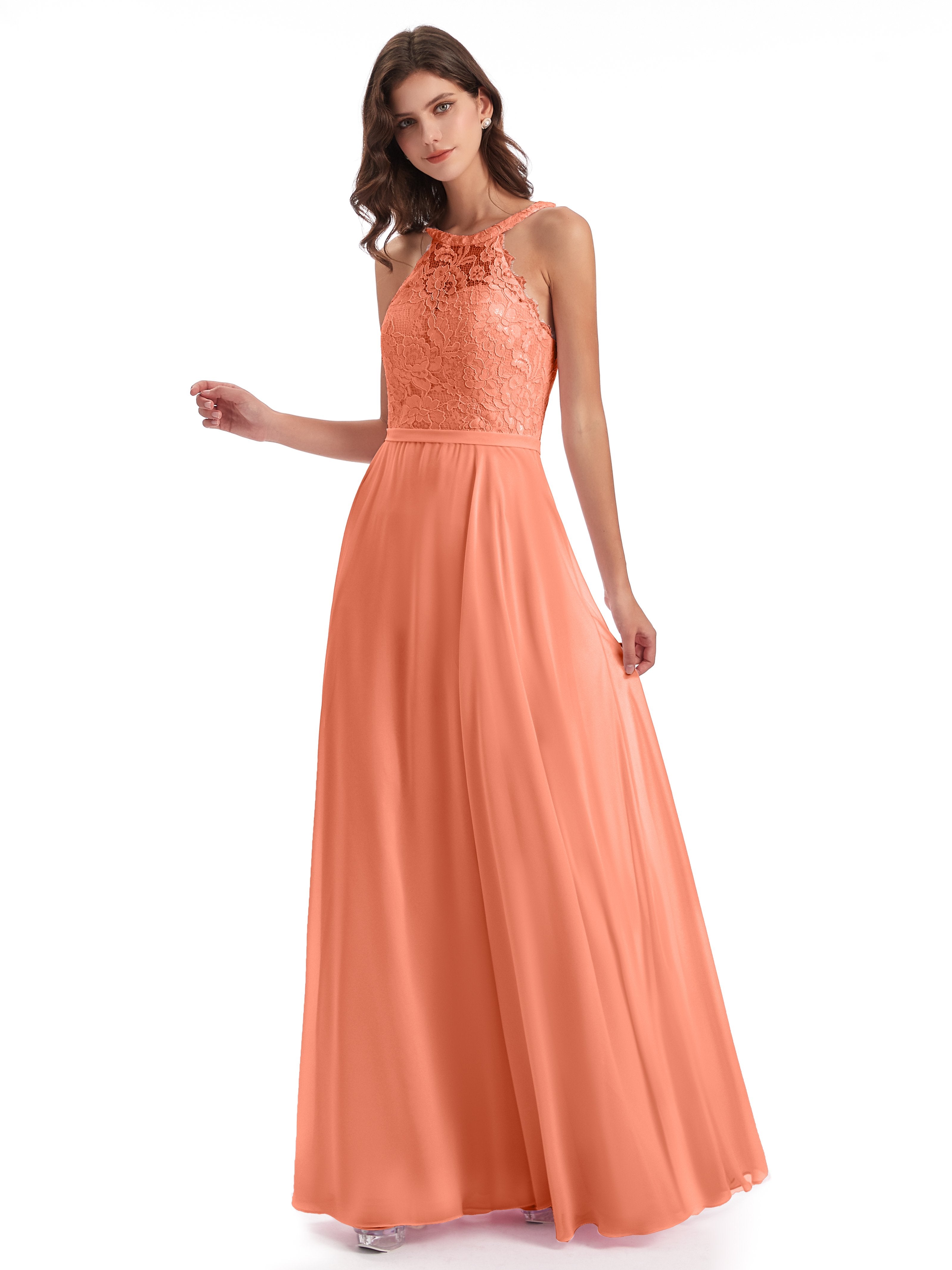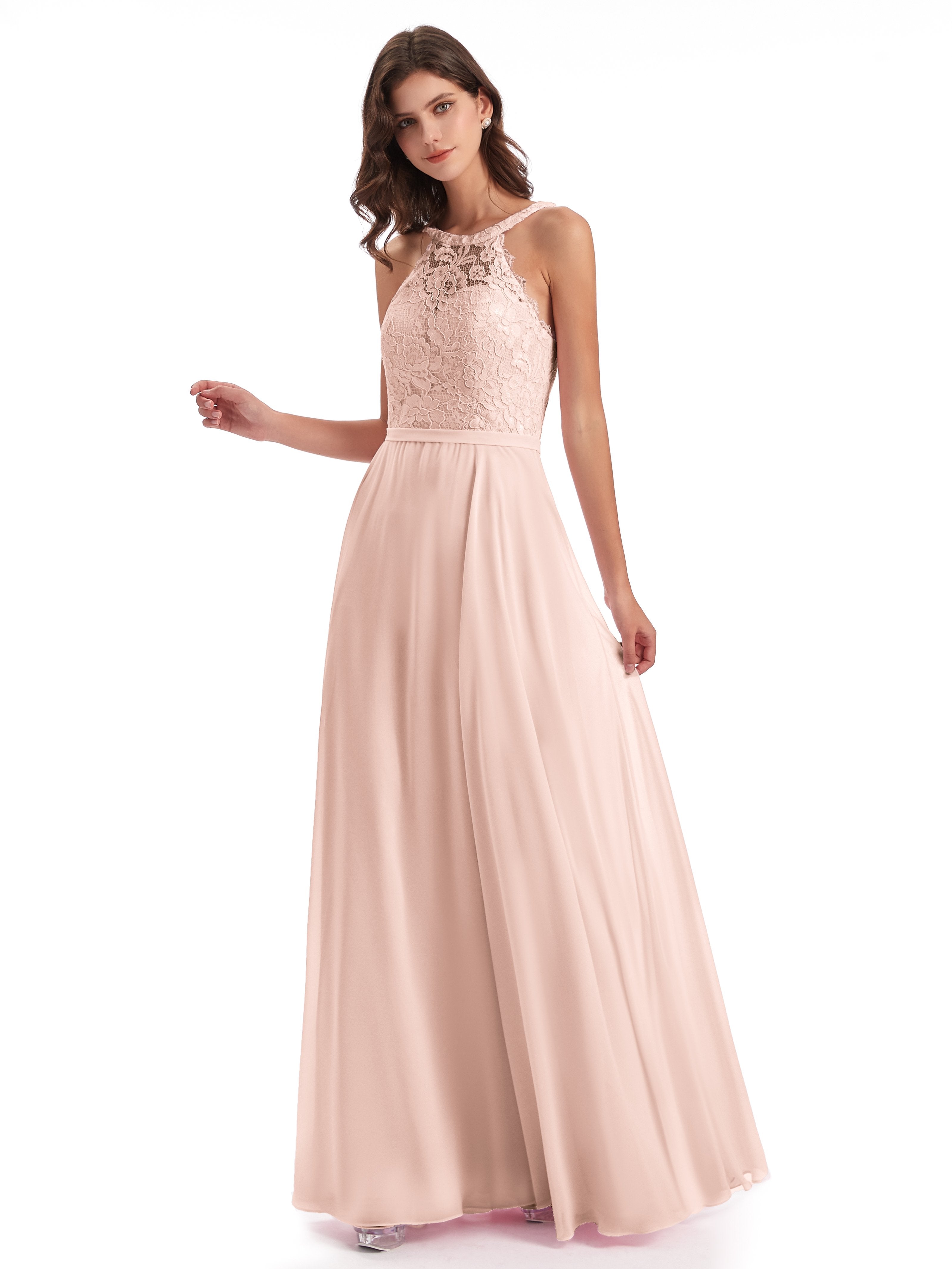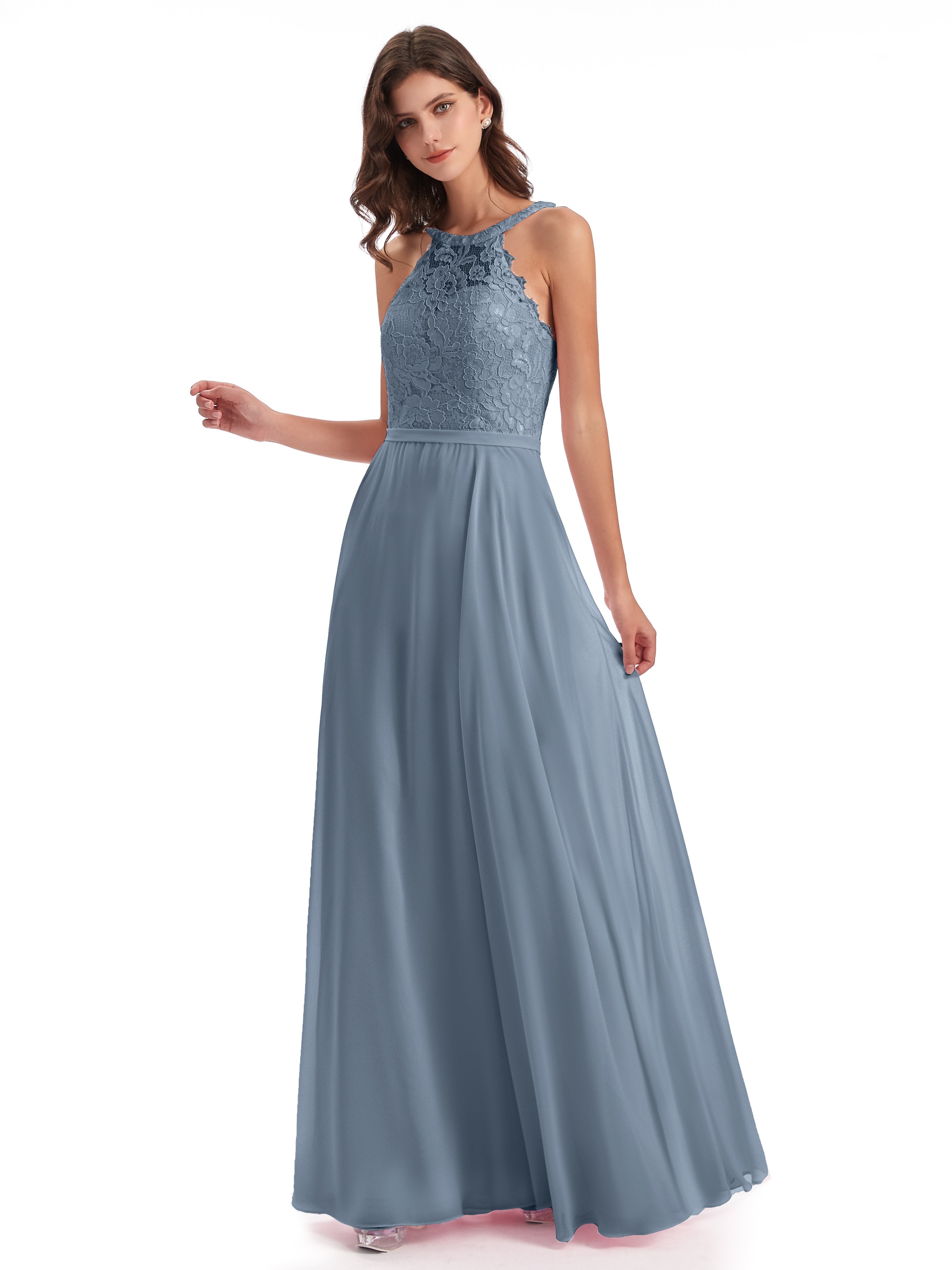 Avery A-Linie Bodenlange Nackenträger Illusion Chiffon/Spitze Lange Brautjungfernkleider