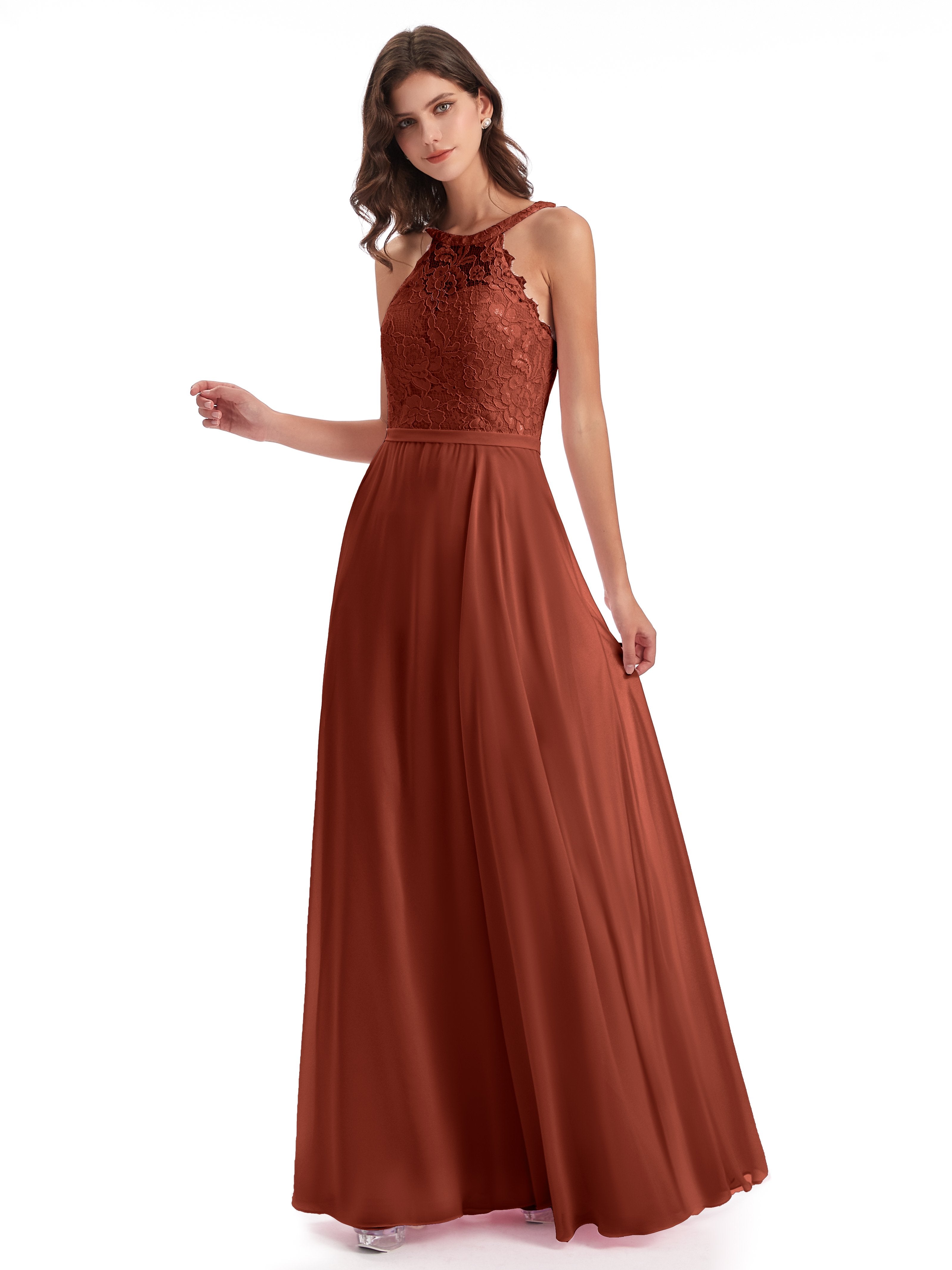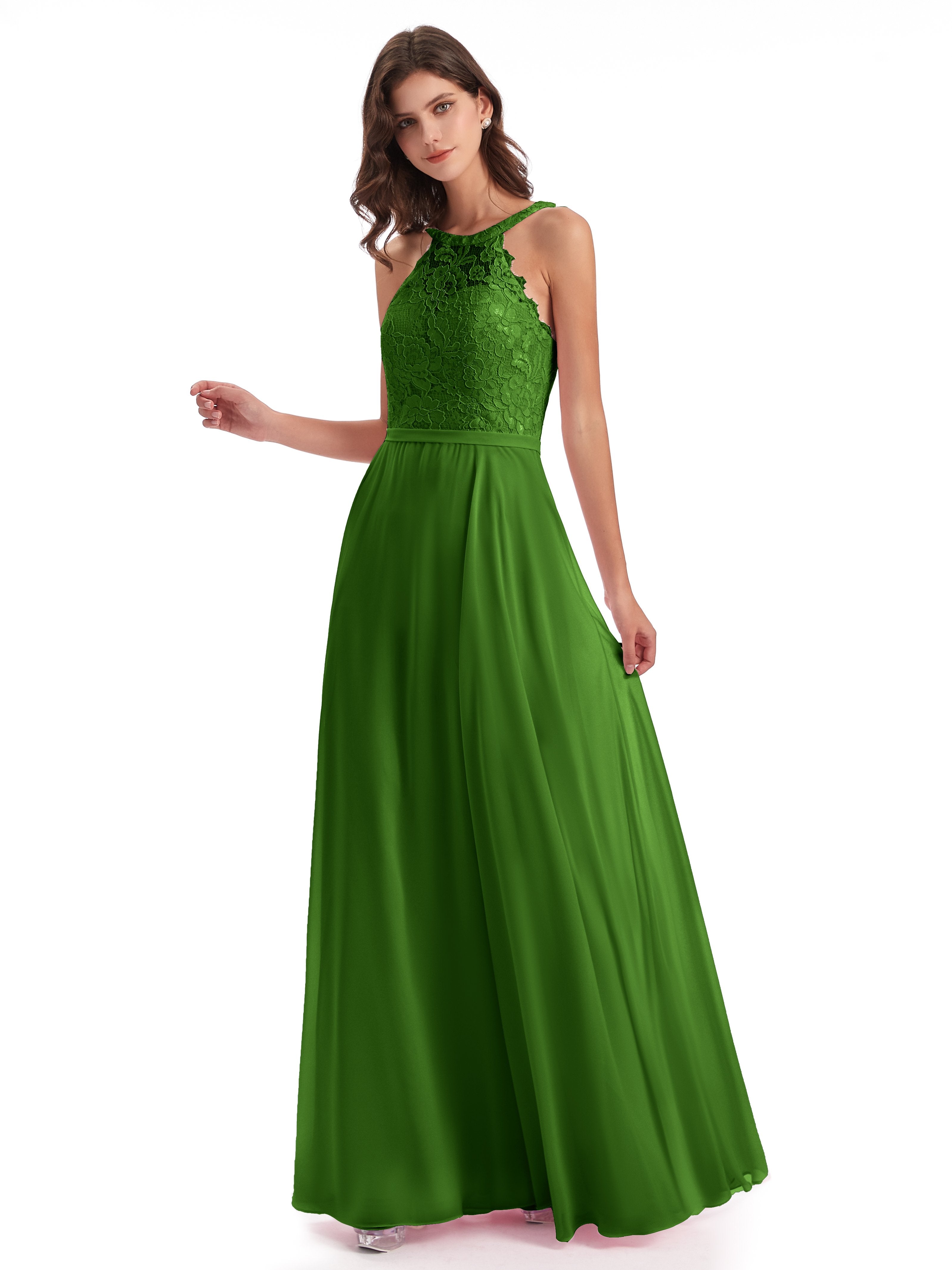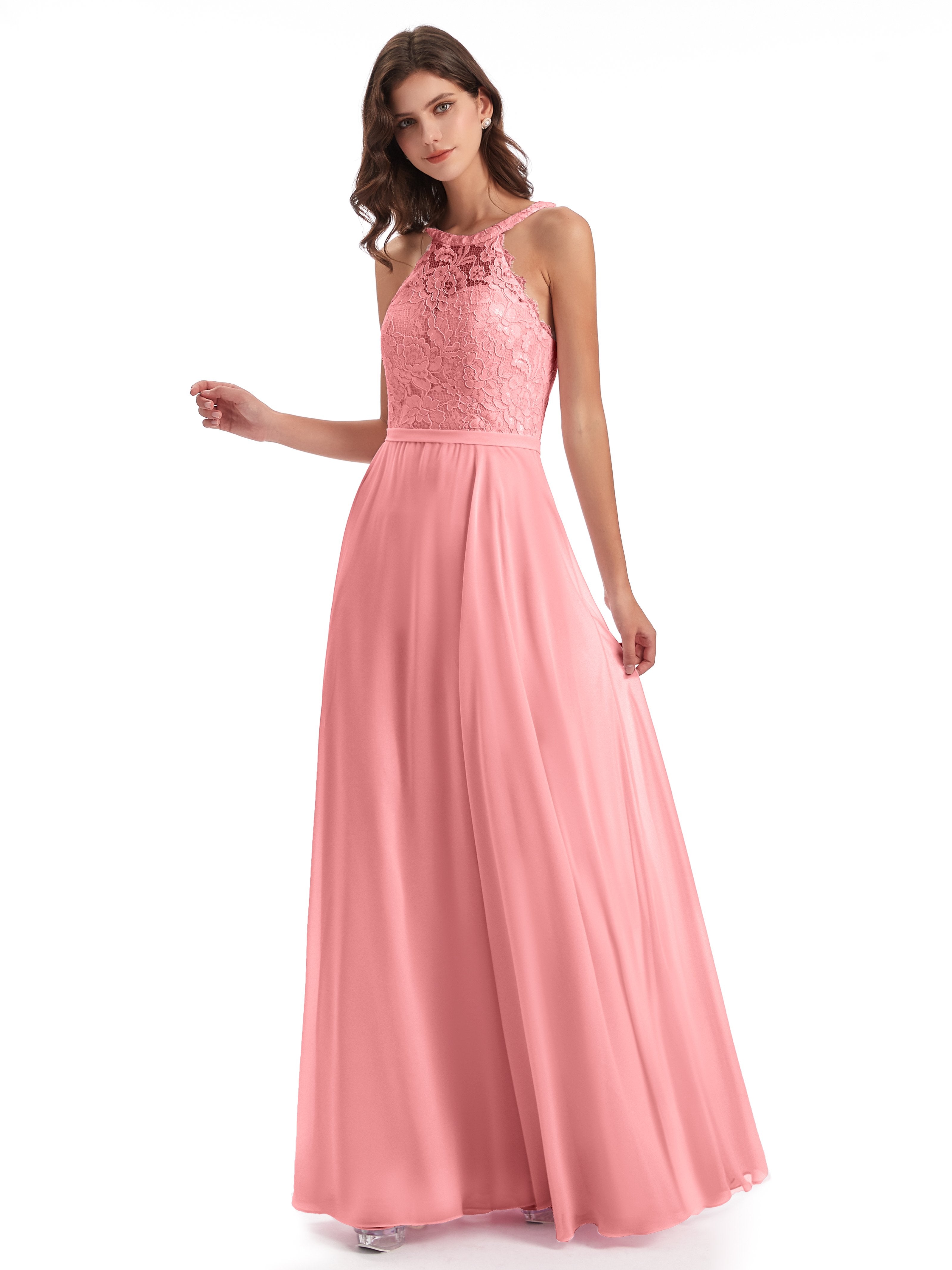 Avery A-Linie Bodenlange Nackenträger Illusion Chiffon/Spitze Lange Brautjungfernkleider