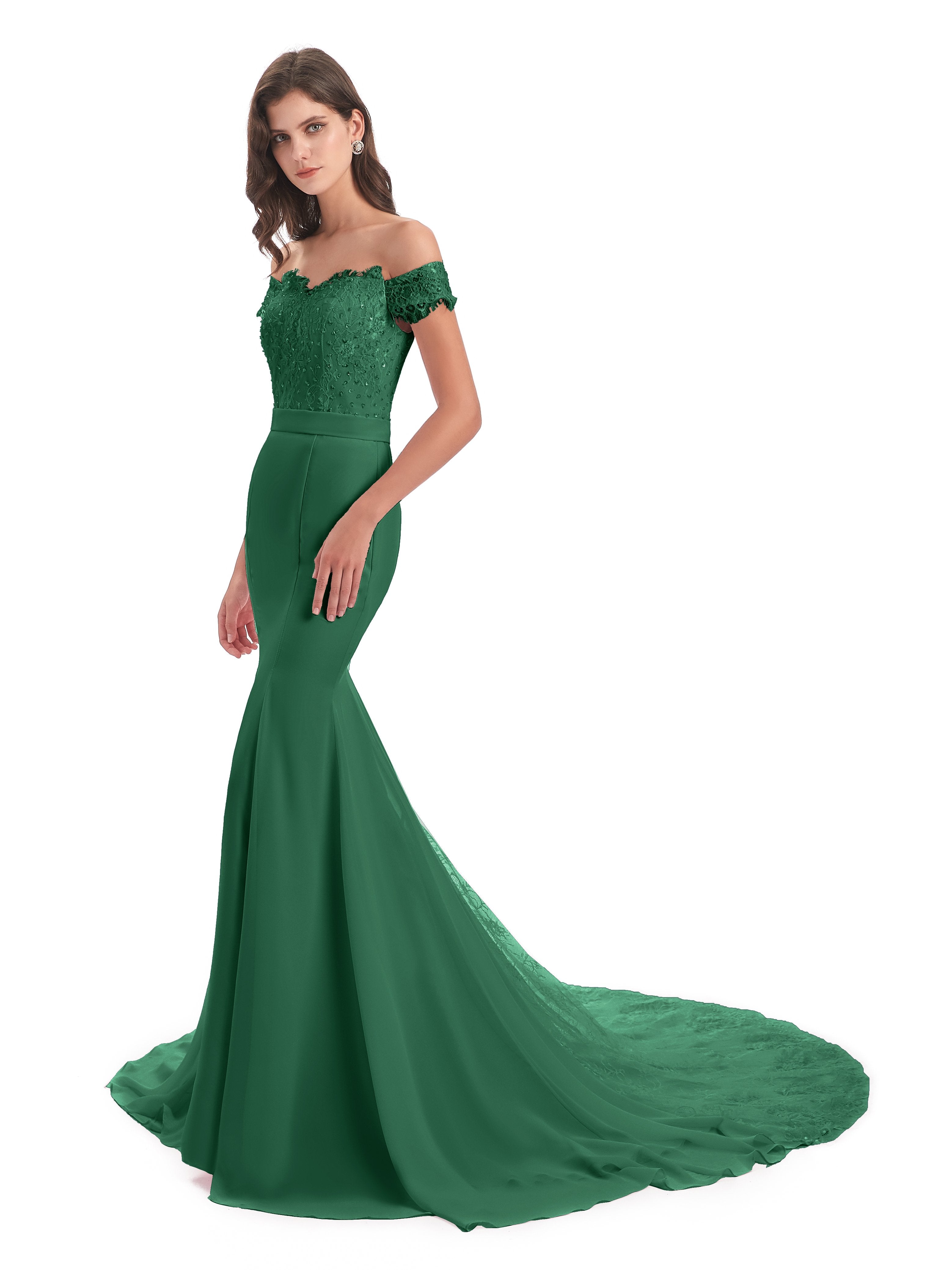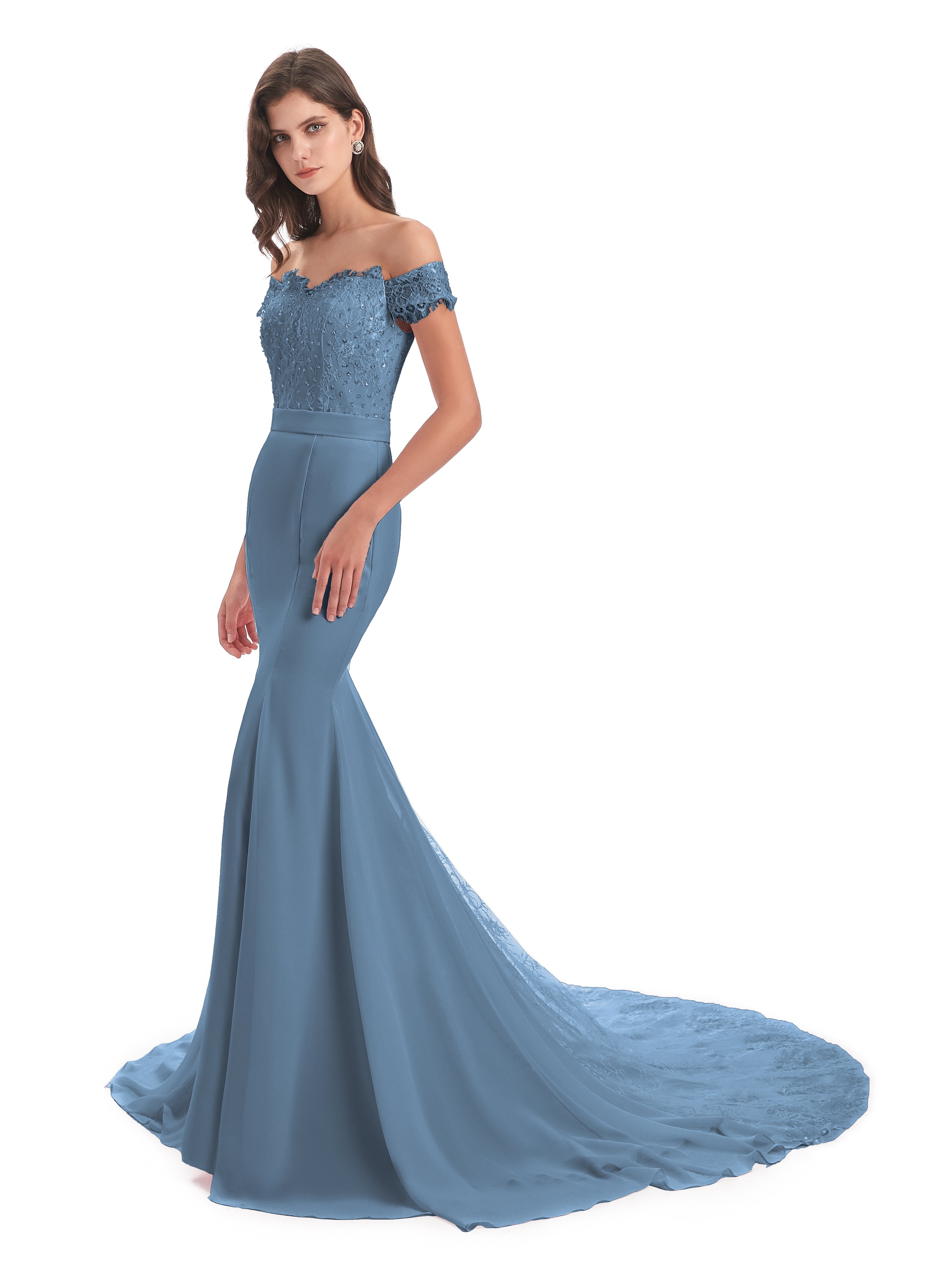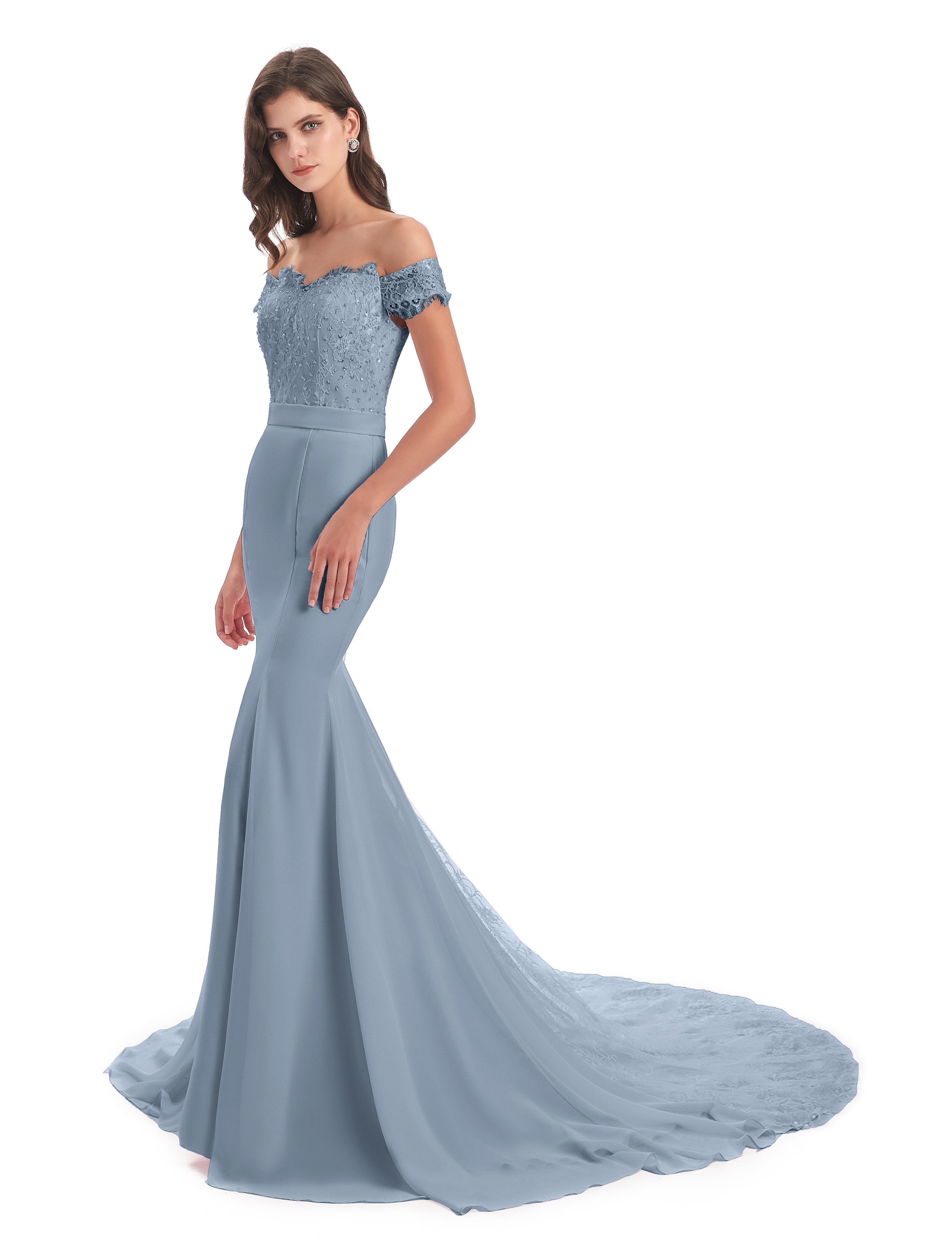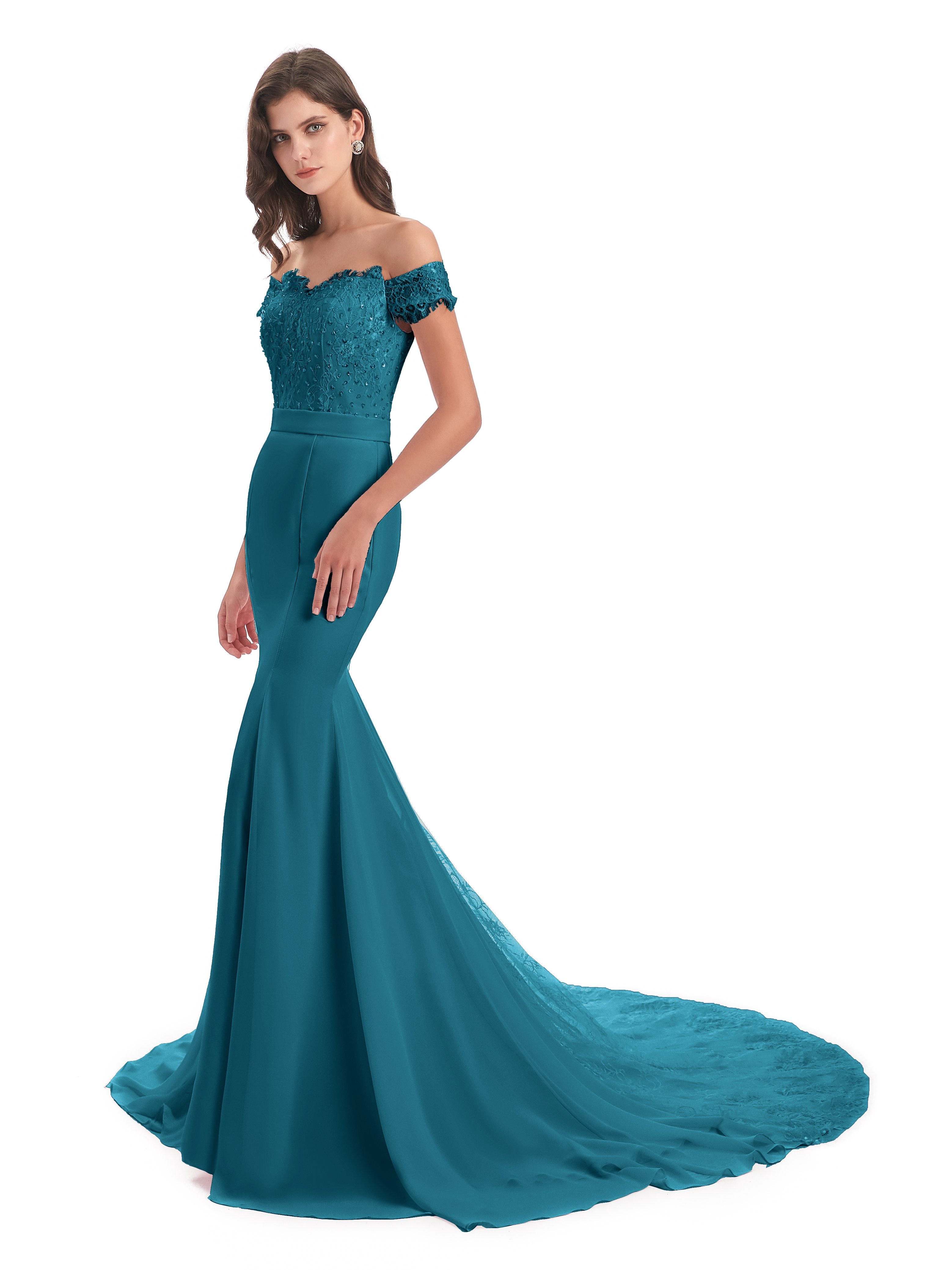 Carlee Trompete-Meerjungfrau Hof-Schleppe Schulterfrei Sicken Spitze Lange Brautjungfernkleider