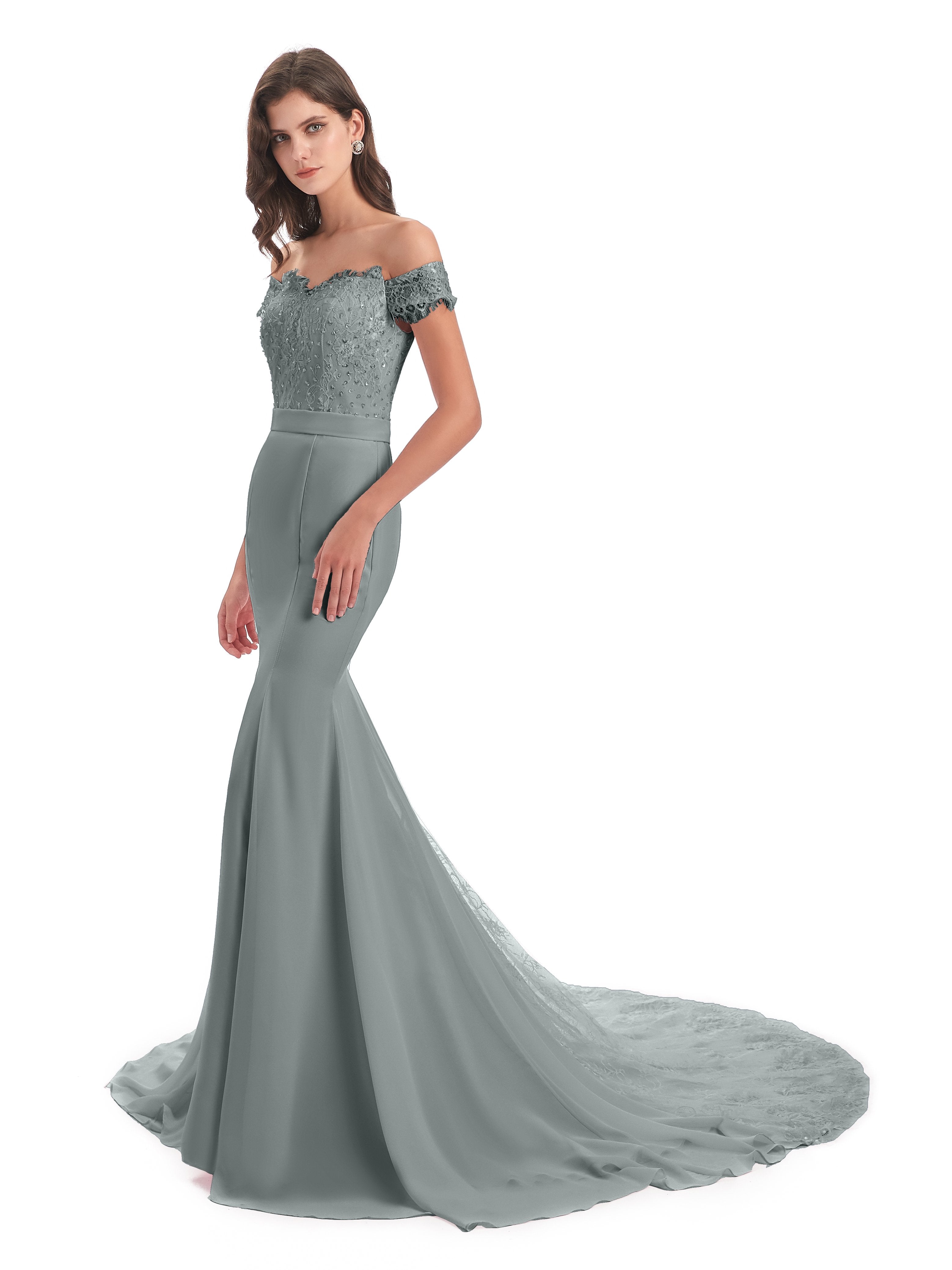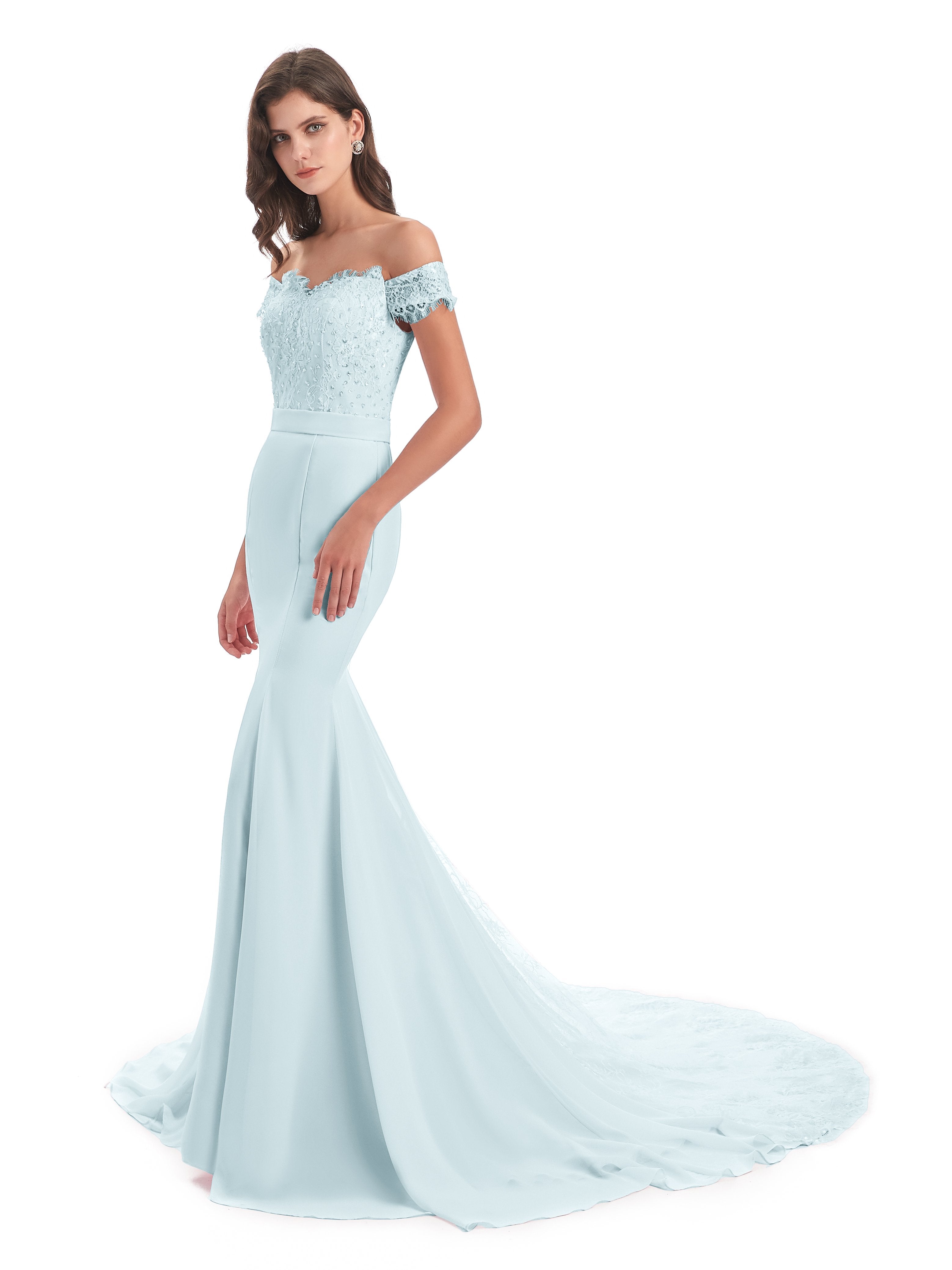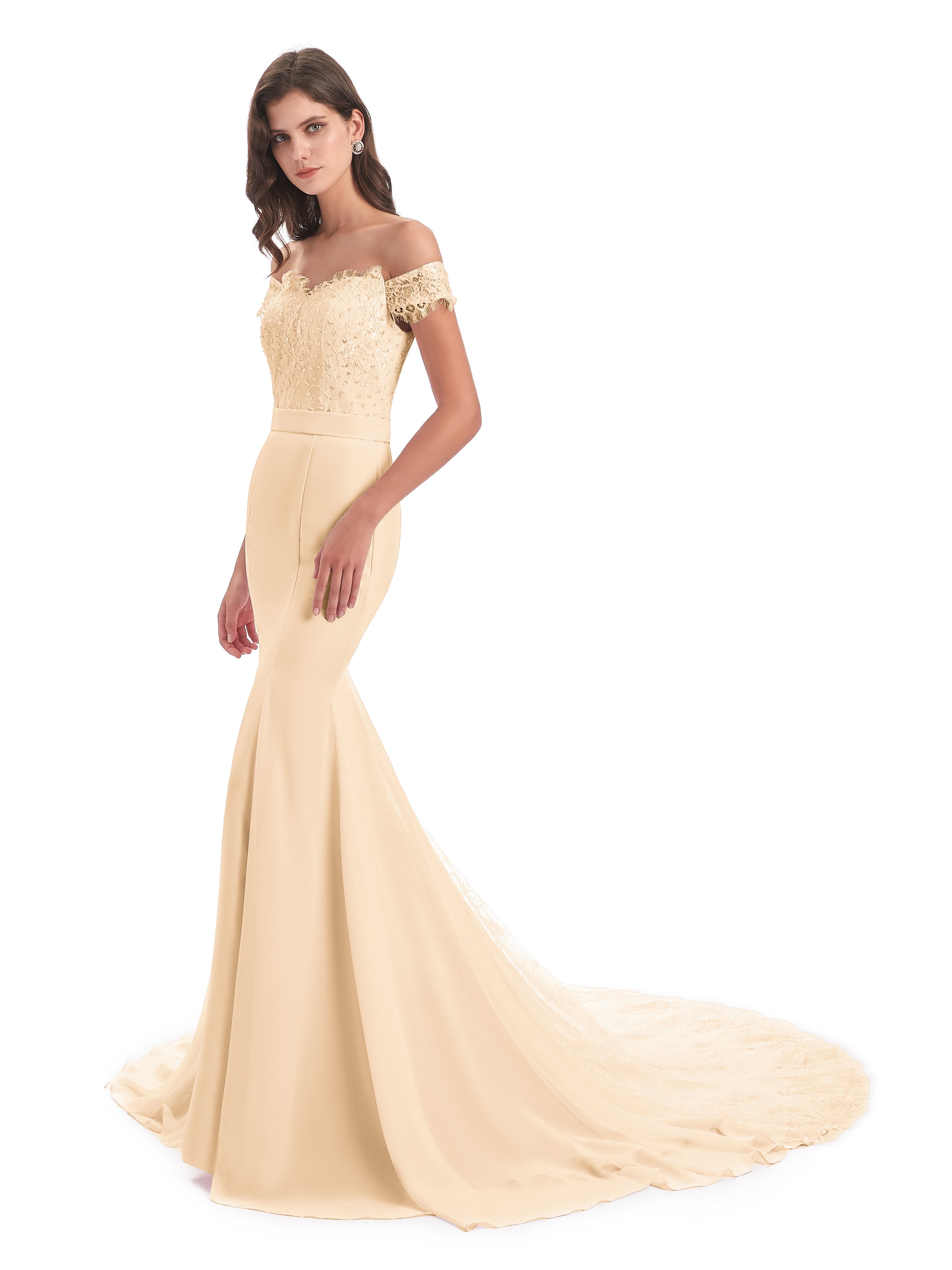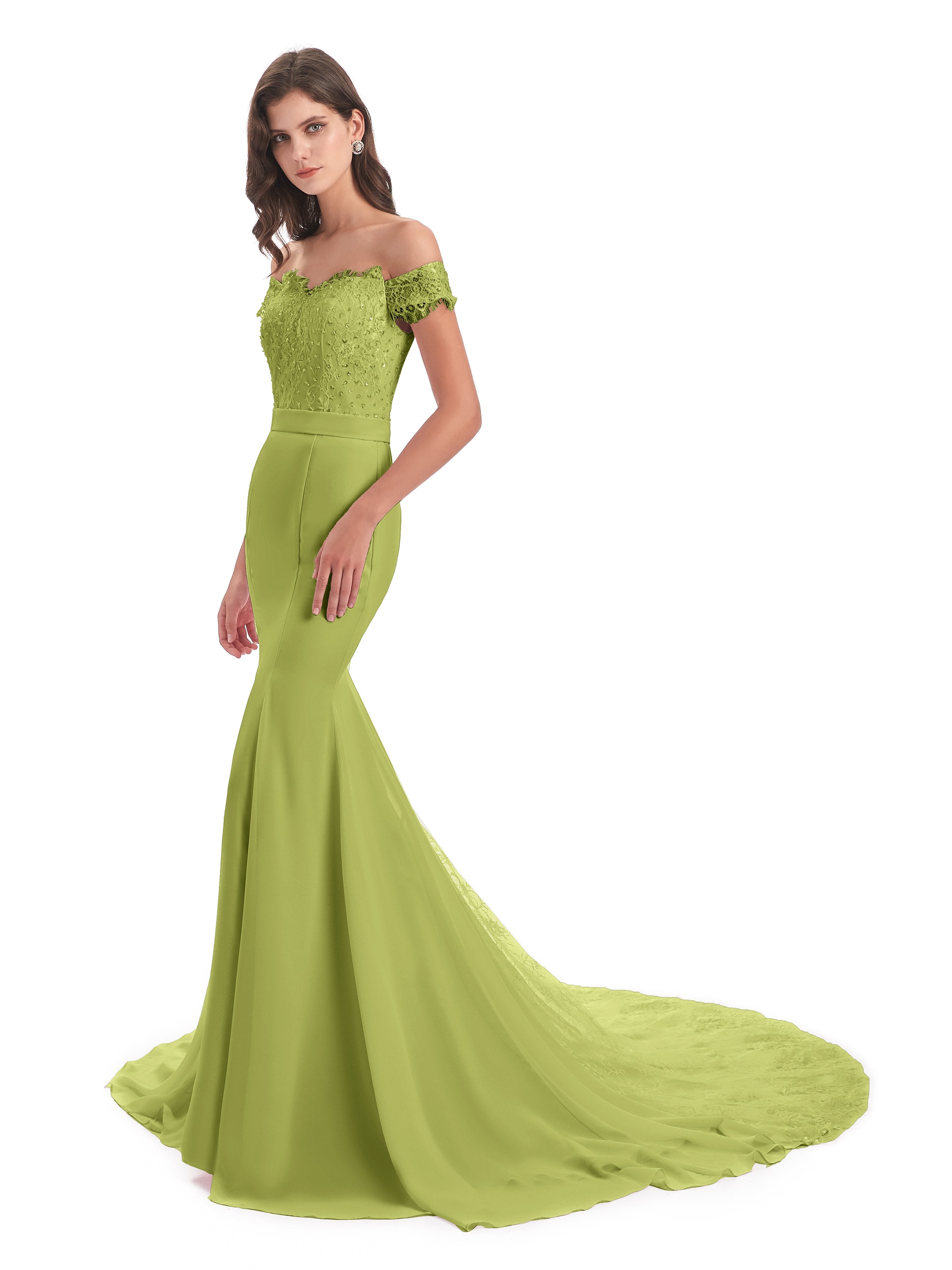 Carlee Trompete-Meerjungfrau Hof-Schleppe Schulterfrei Sicken Spitze Lange Brautjungfernkleider