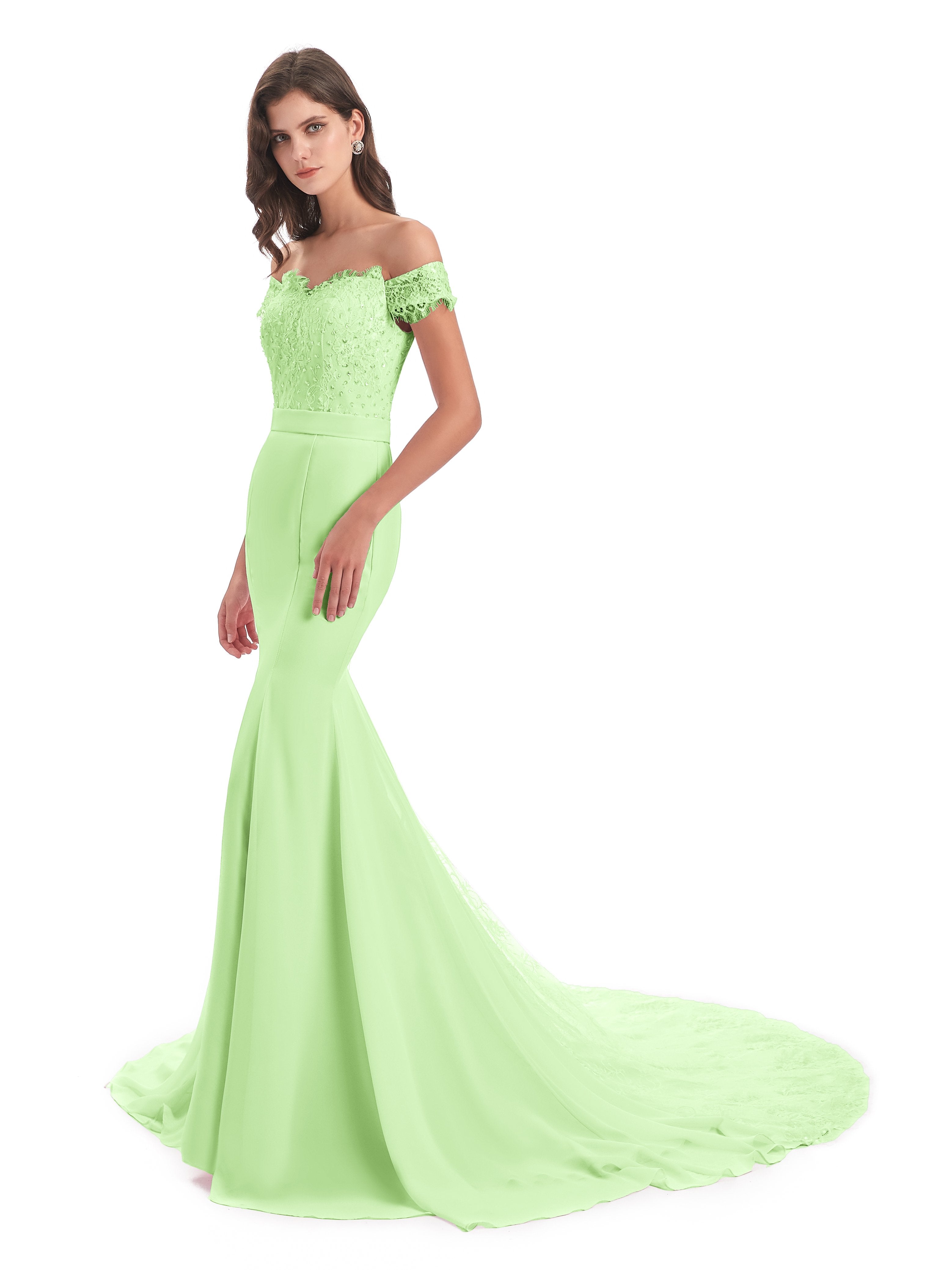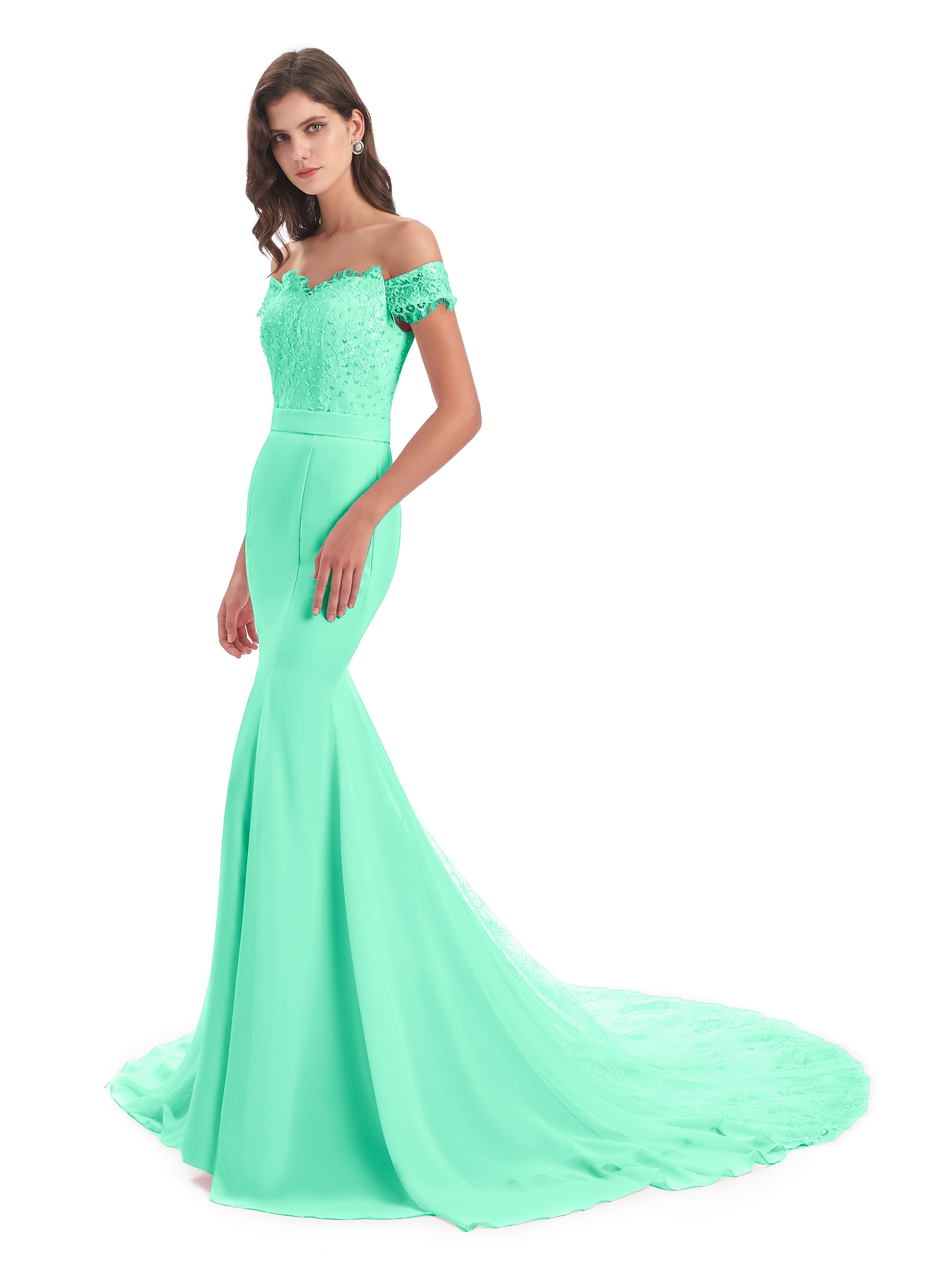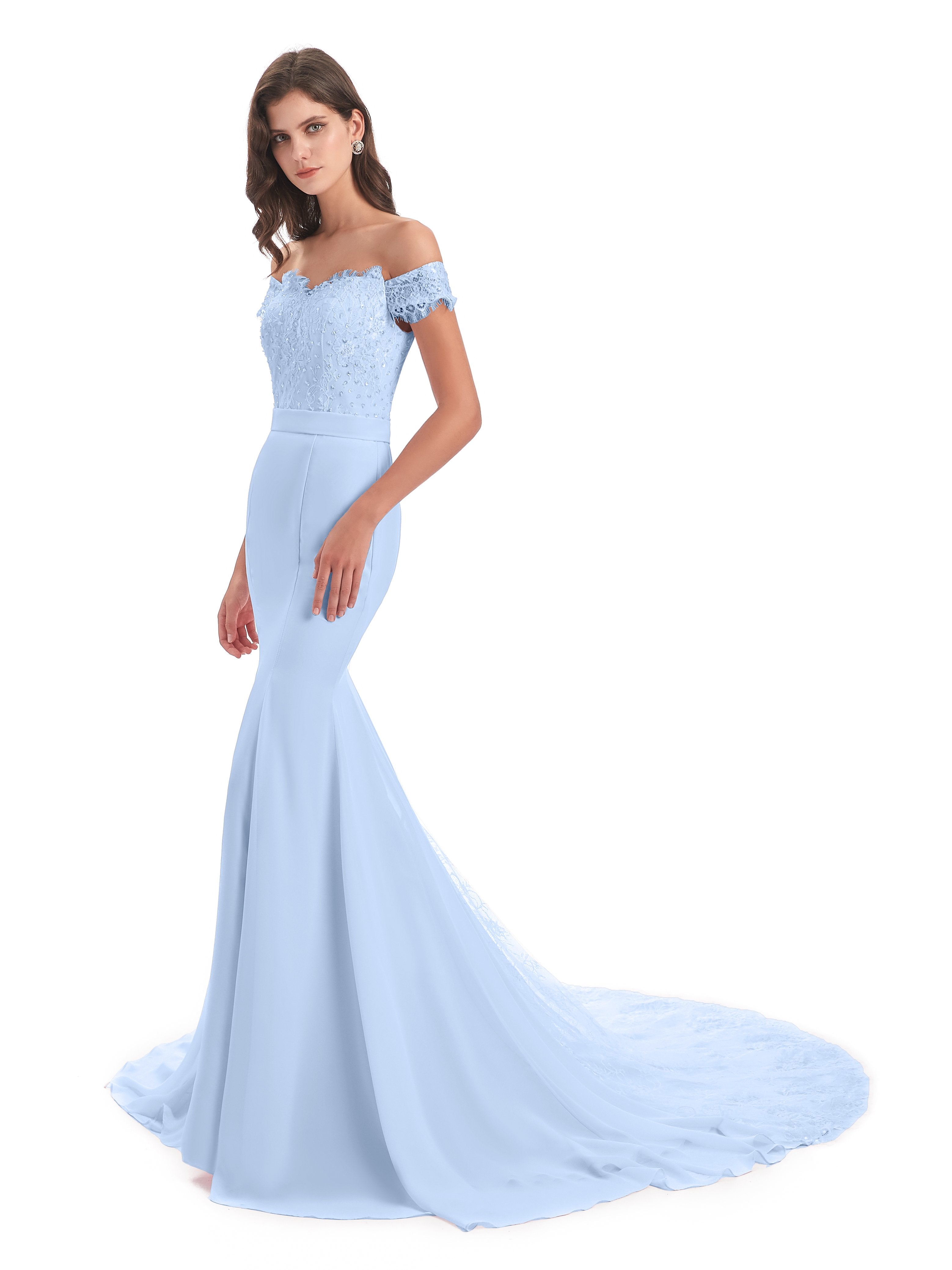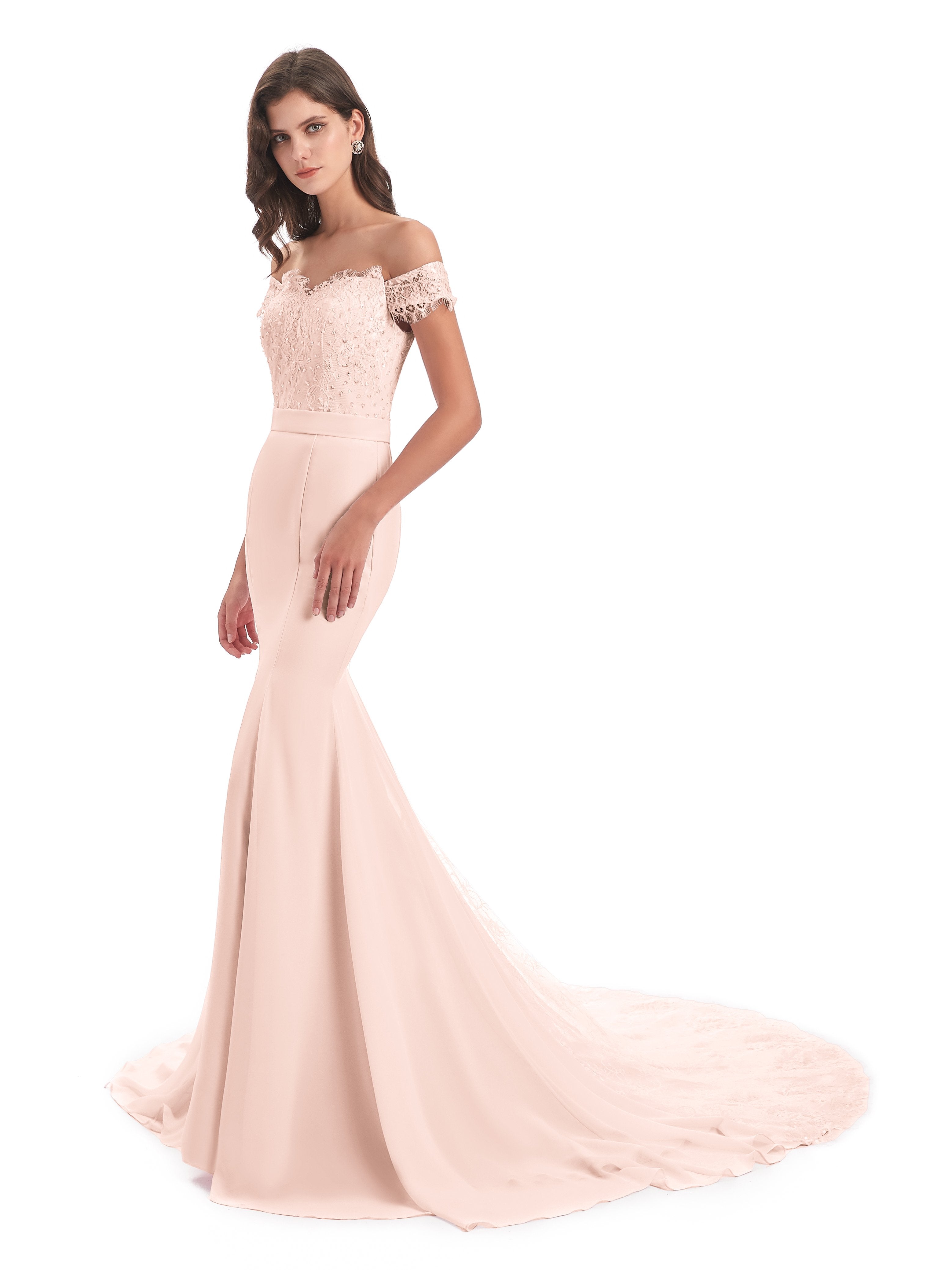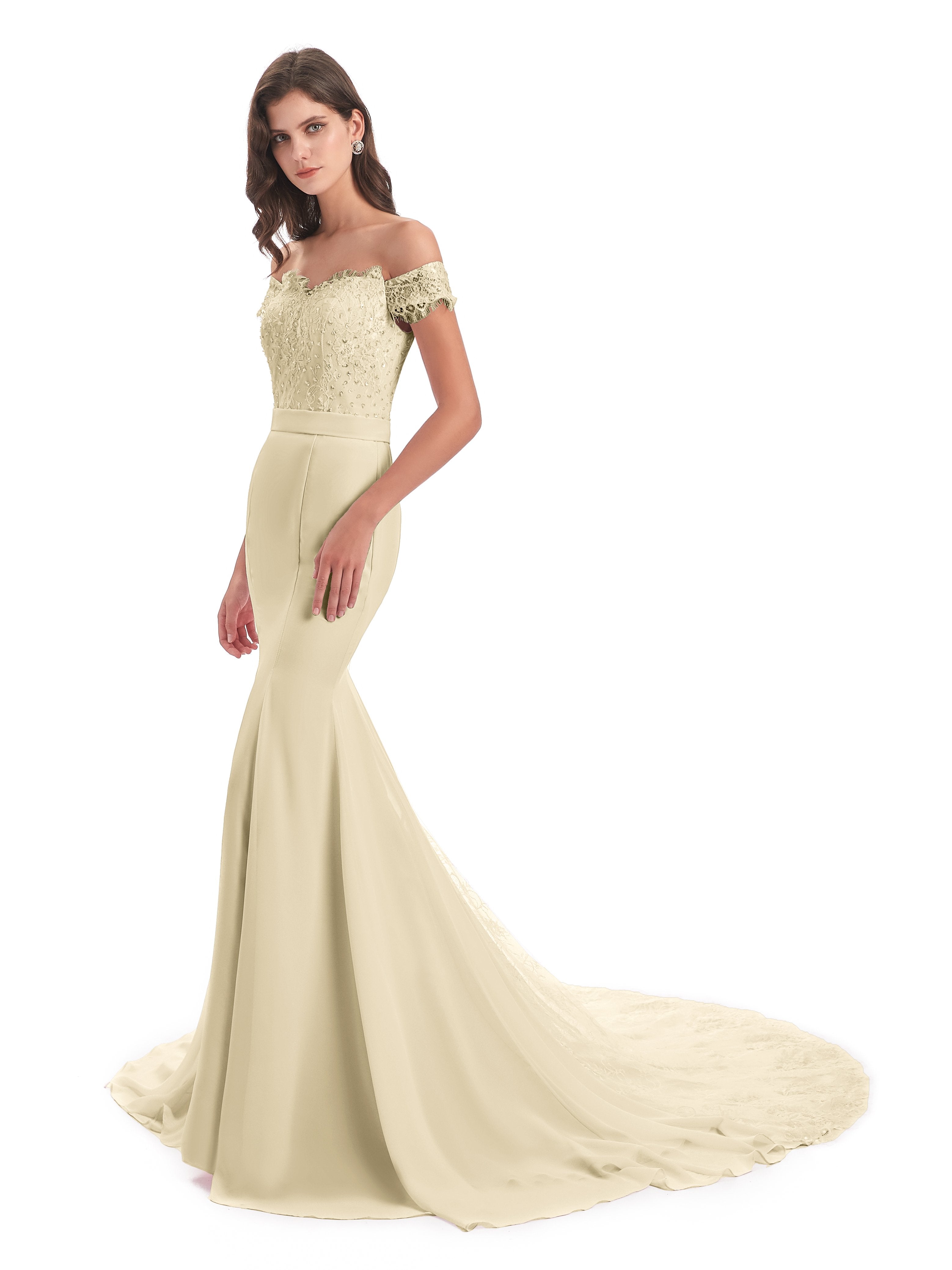 Carlee Trompete-Meerjungfrau Hof-Schleppe Schulterfrei Sicken Spitze Lange Brautjungfernkleider