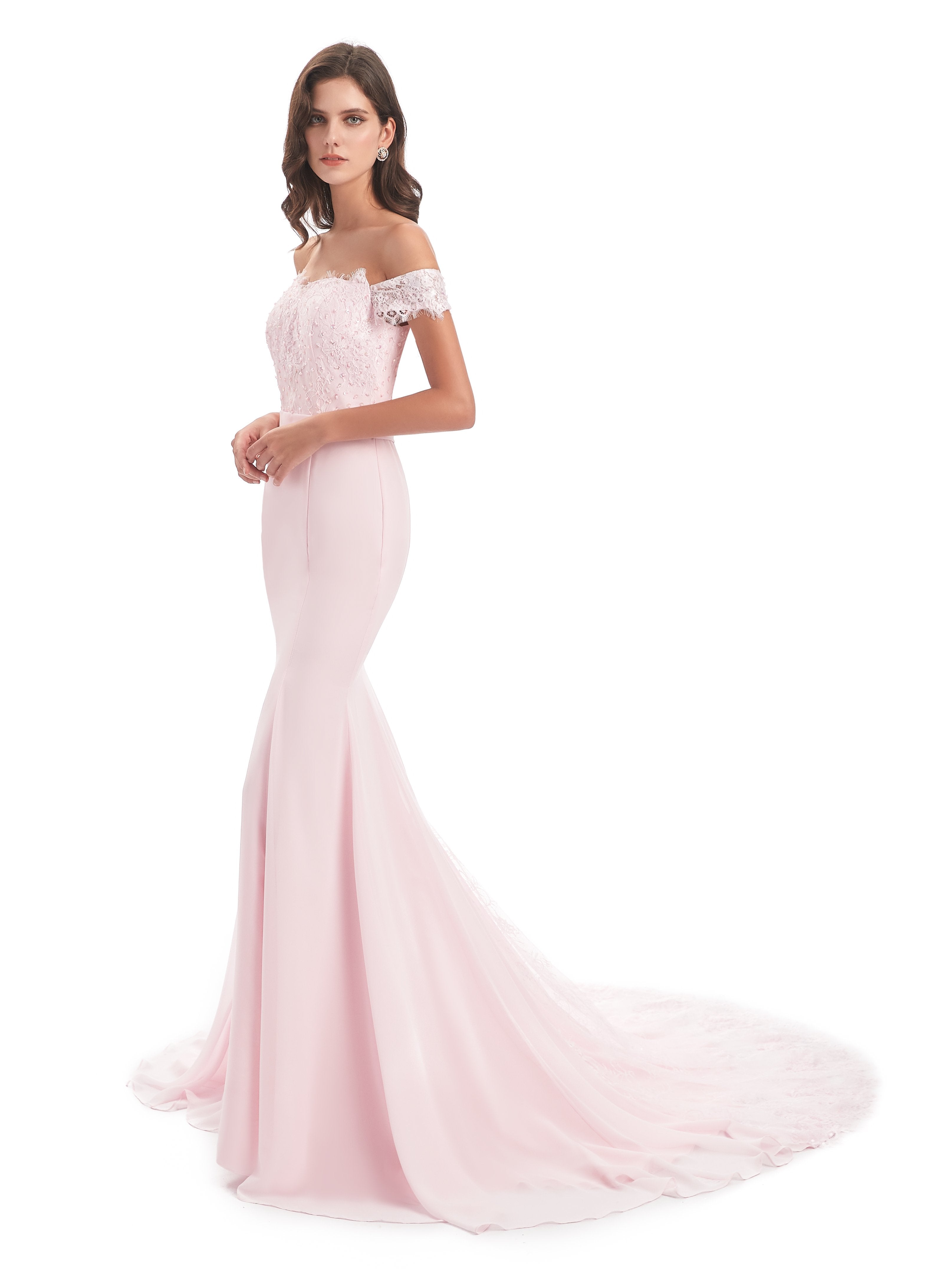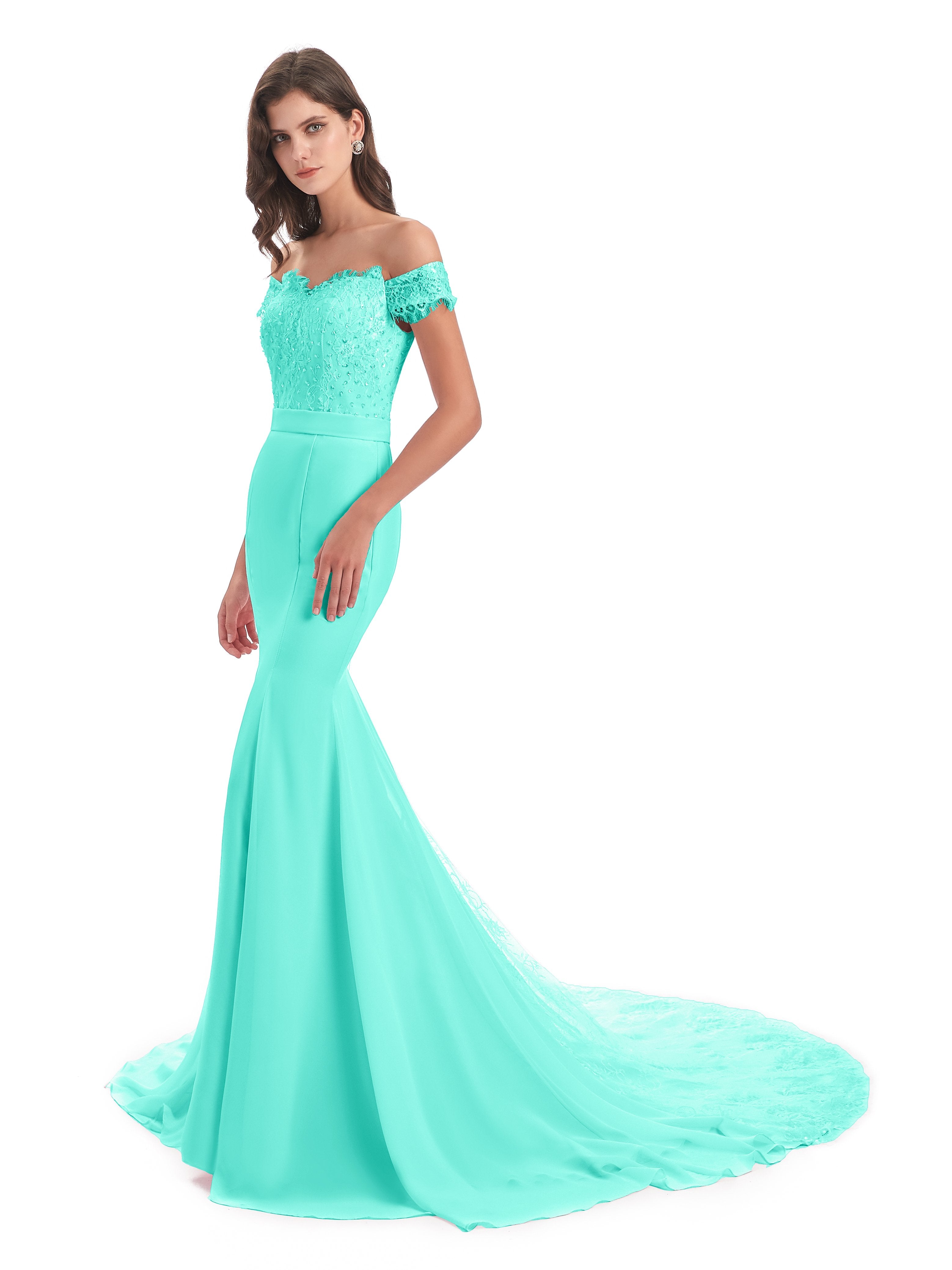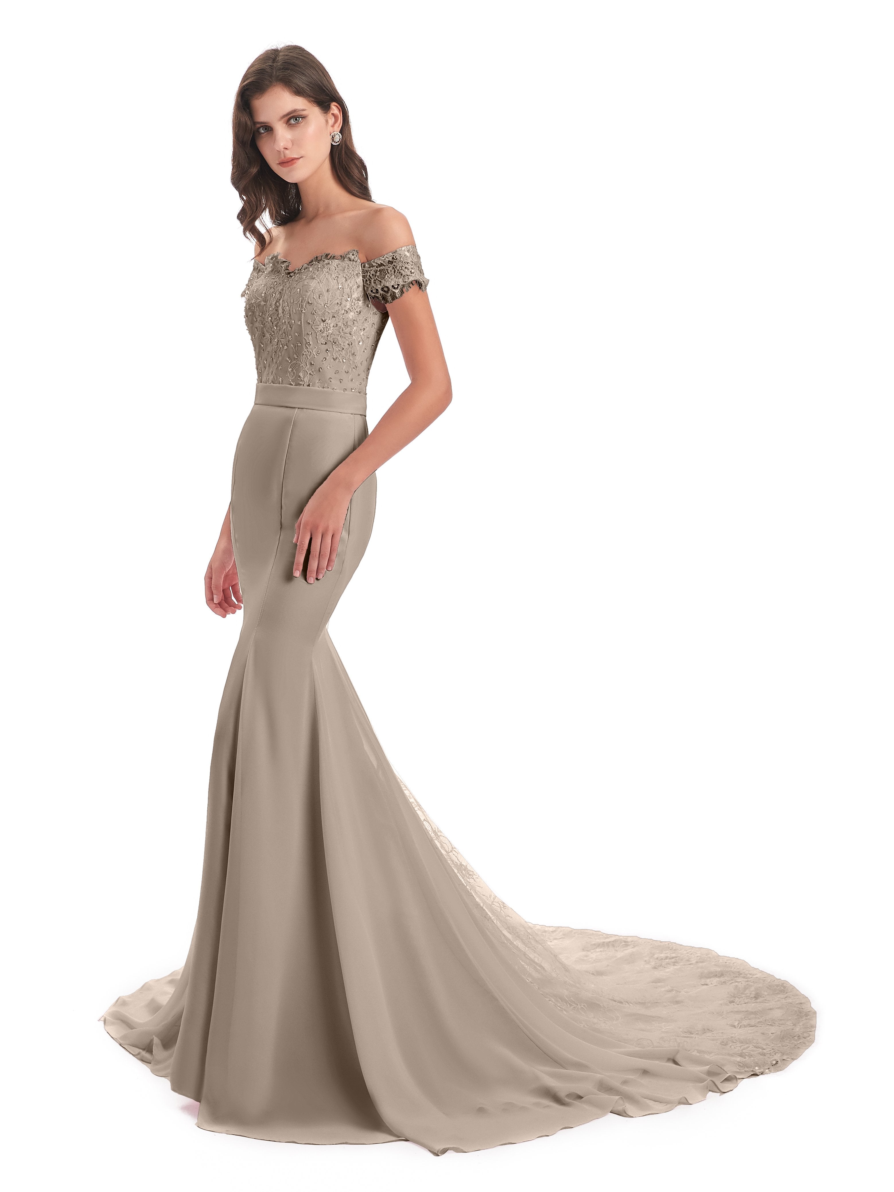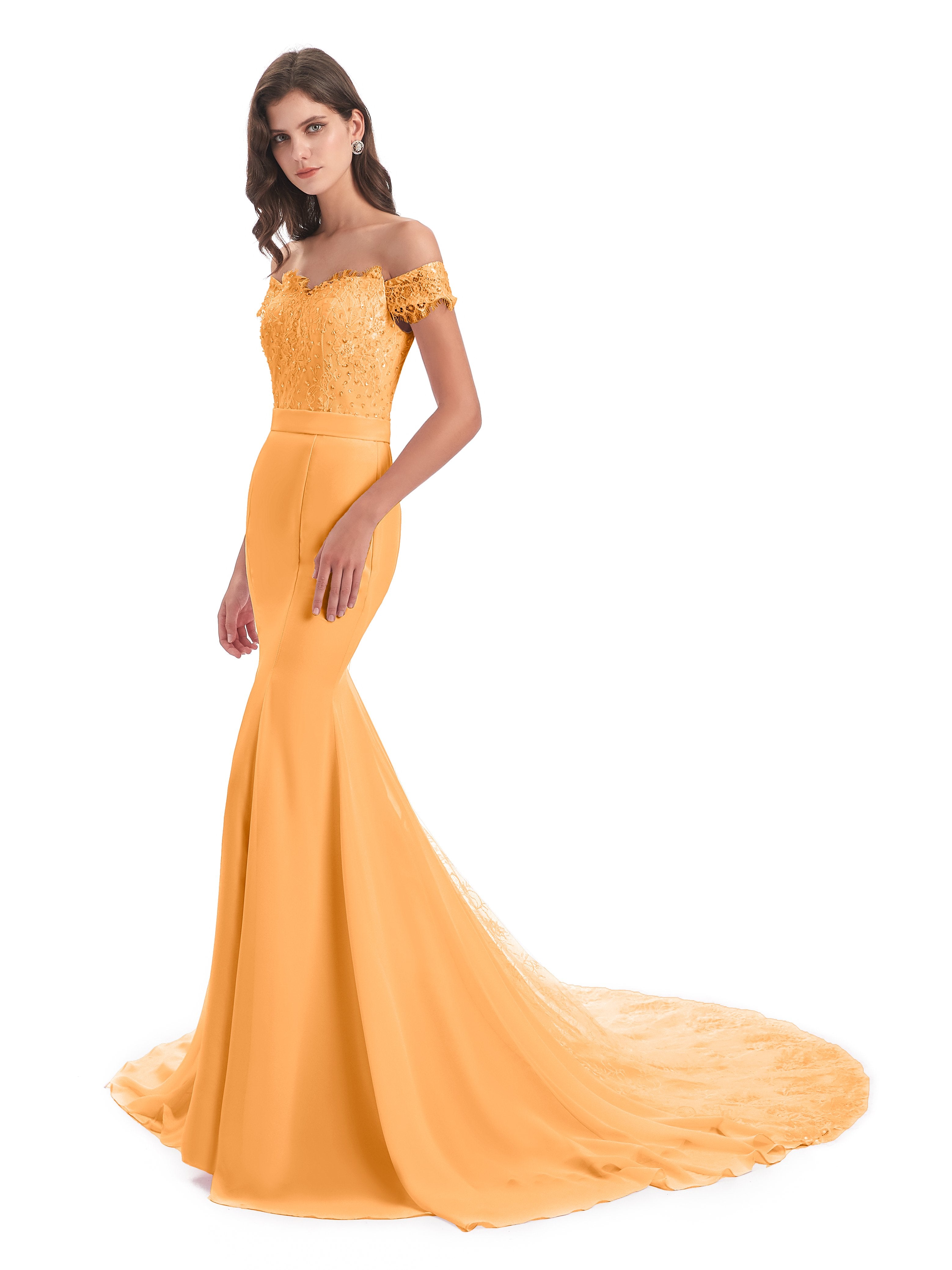 Carlee Trompete-Meerjungfrau Hof-Schleppe Schulterfrei Sicken Spitze Lange Brautjungfernkleider