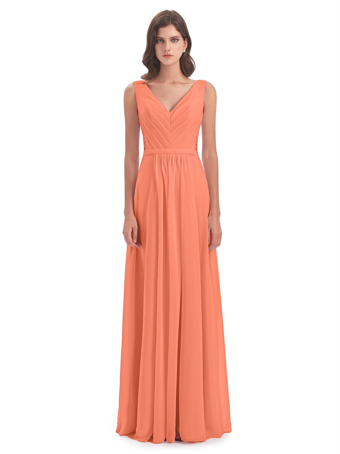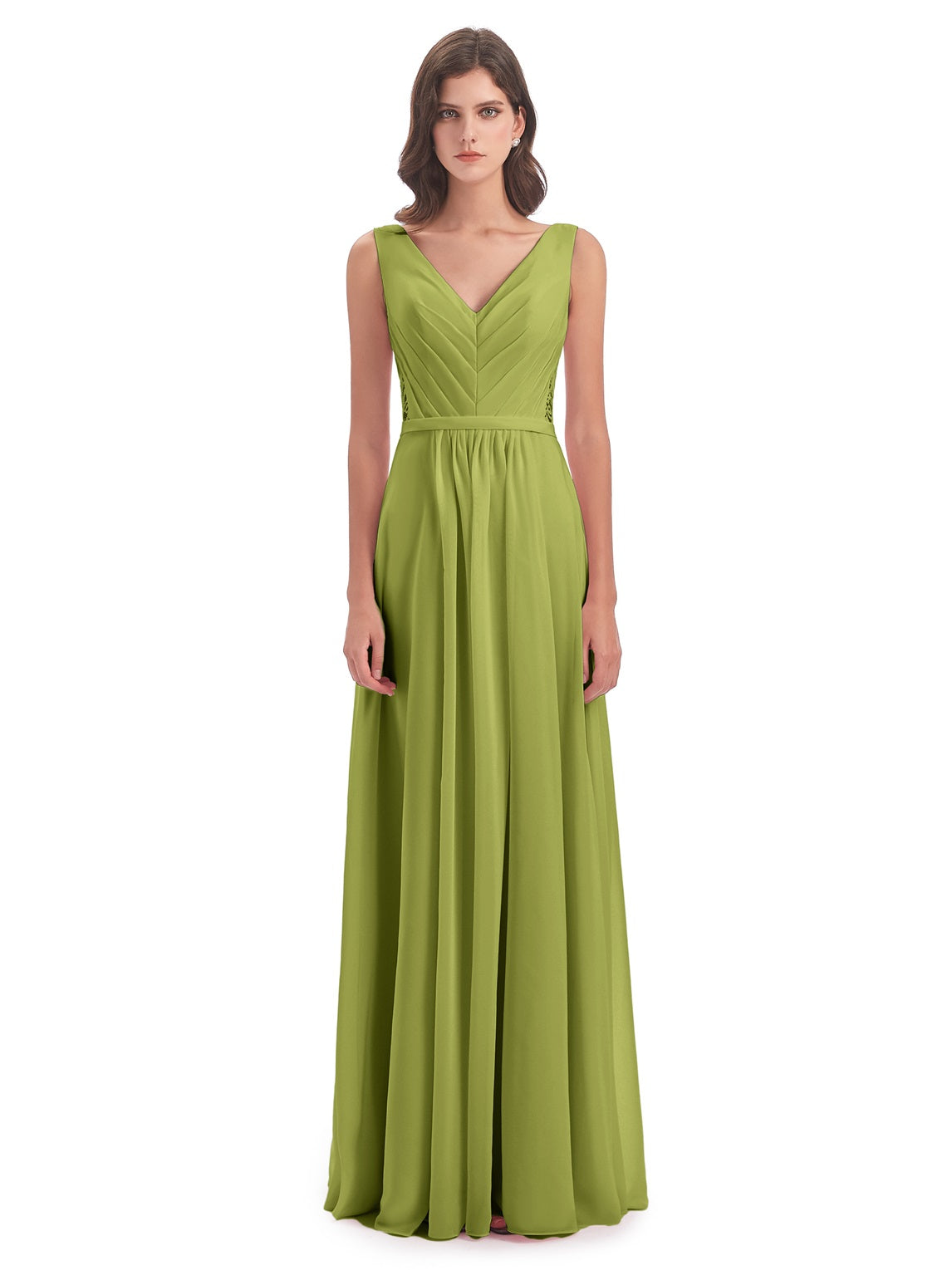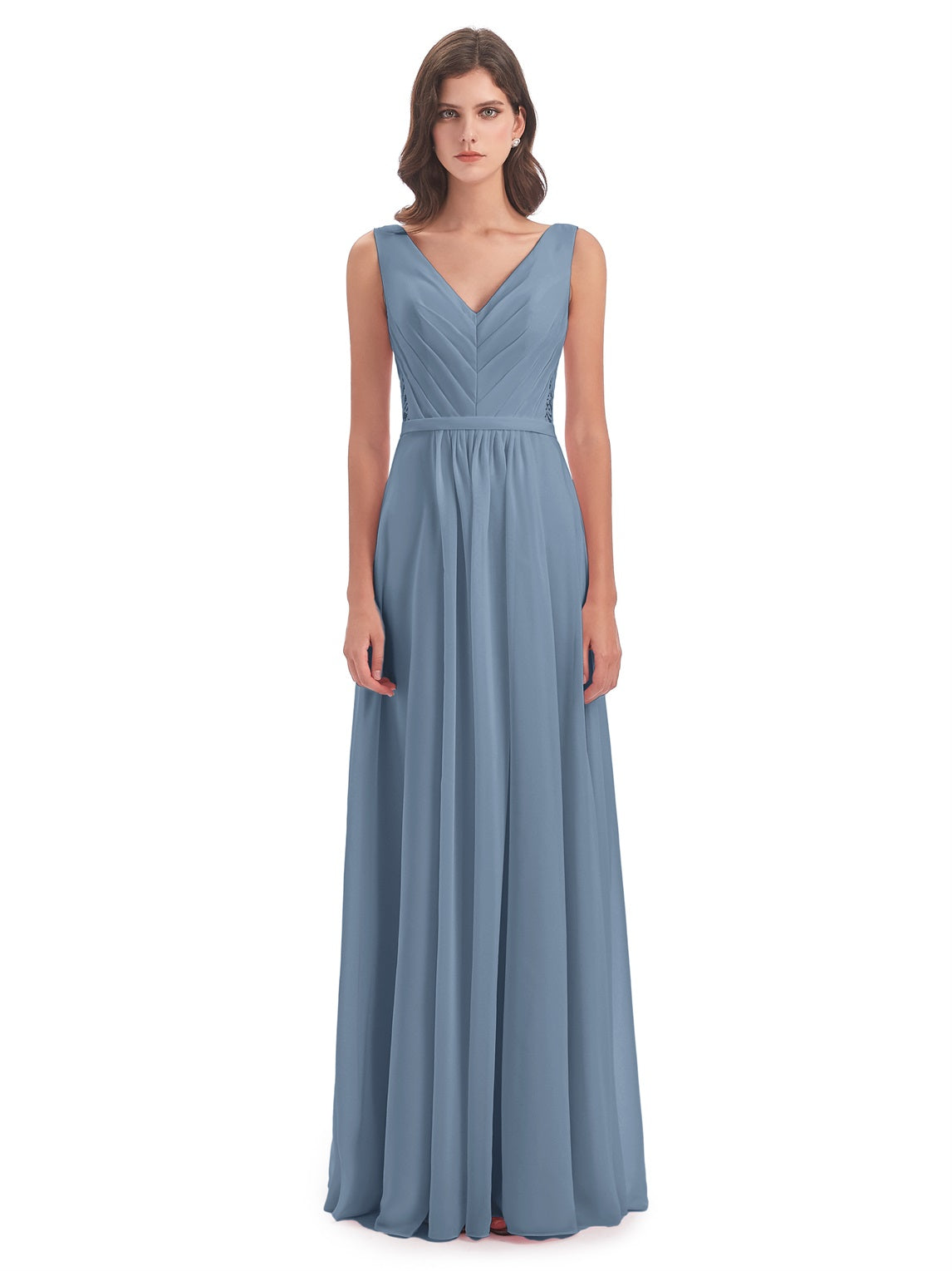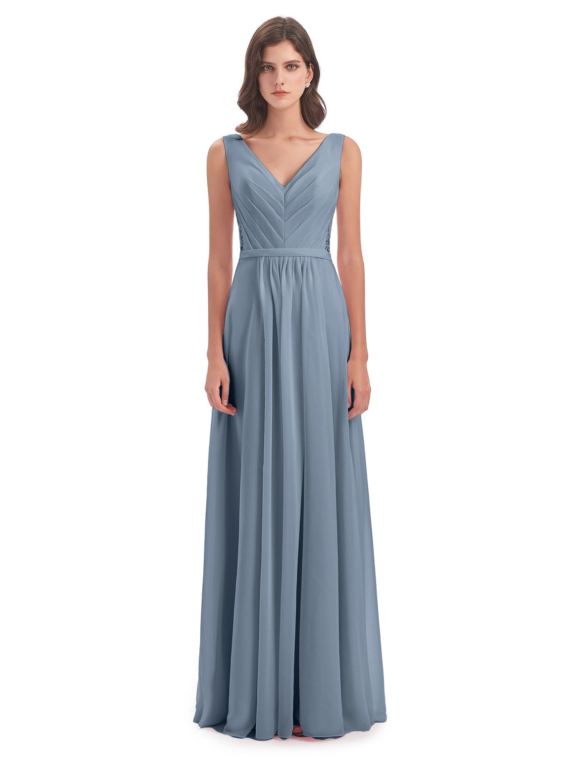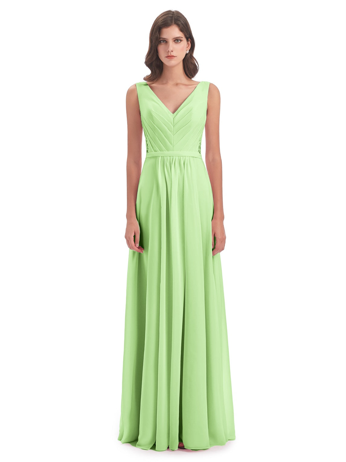 Kailee A-Linie Bodenlange V-Ausschnitt Chiffon Lange Brautjungfernkleider