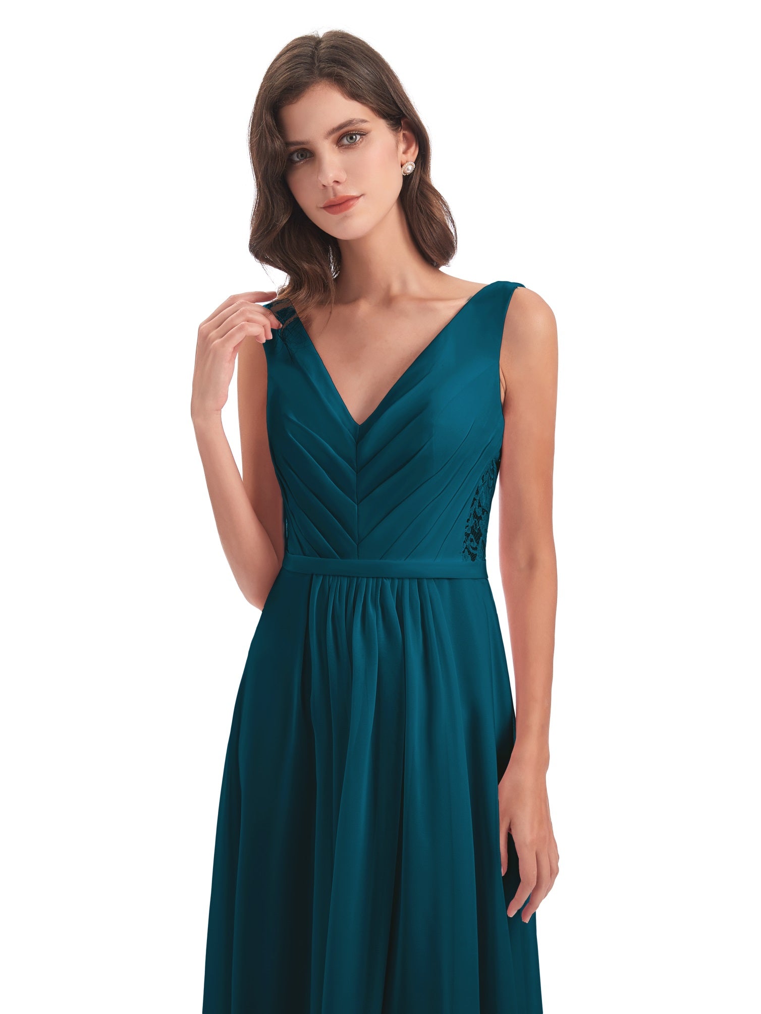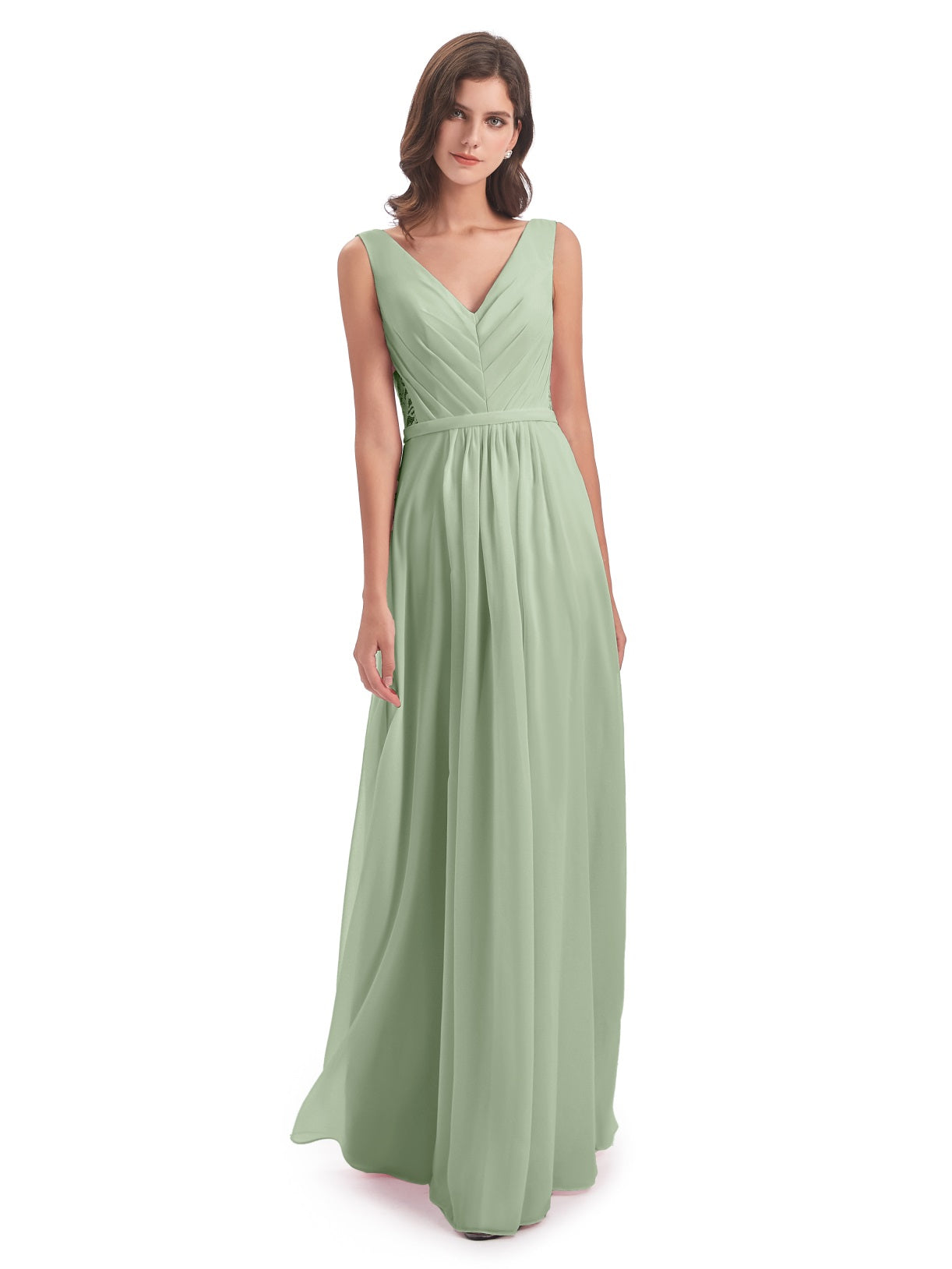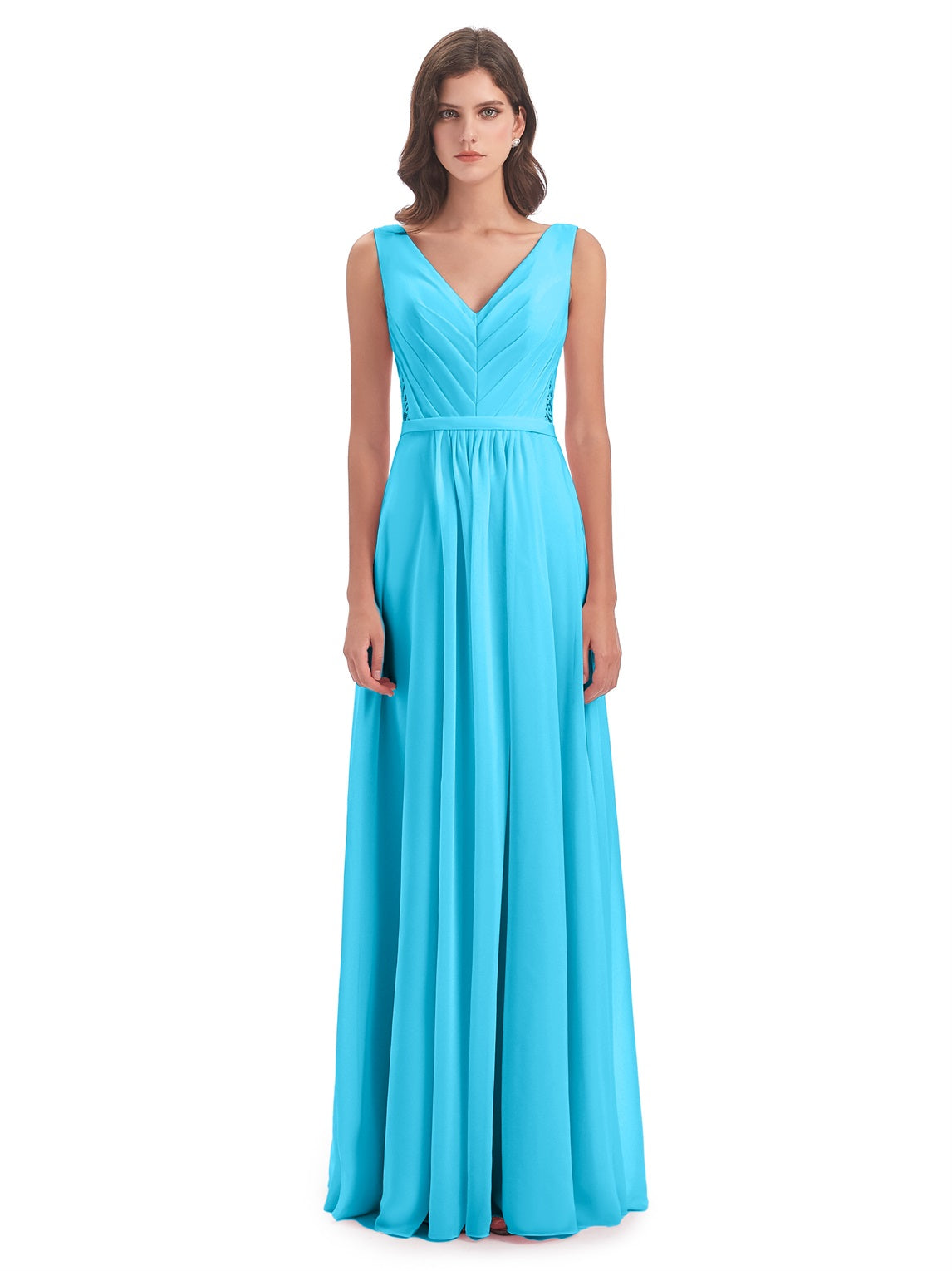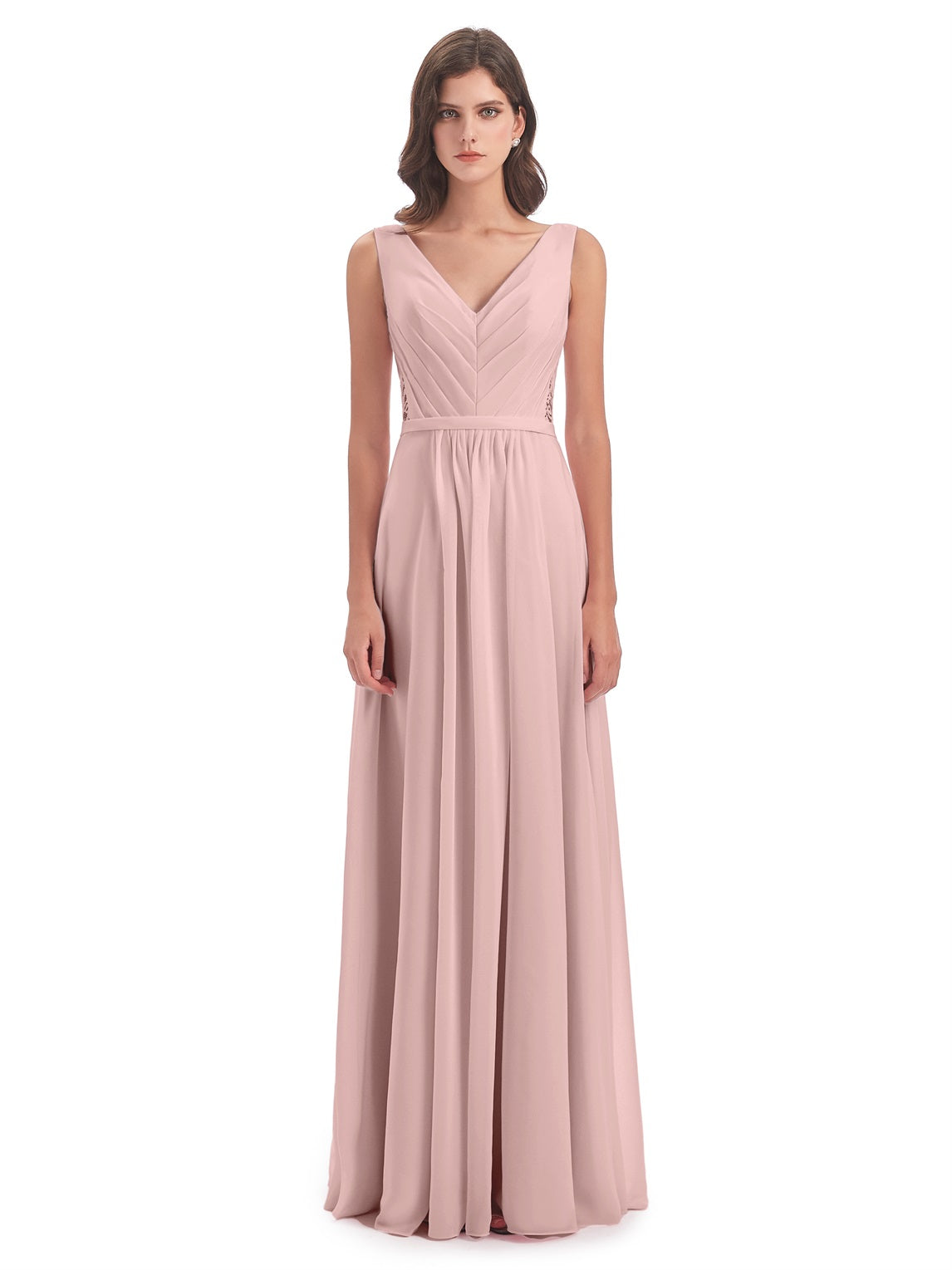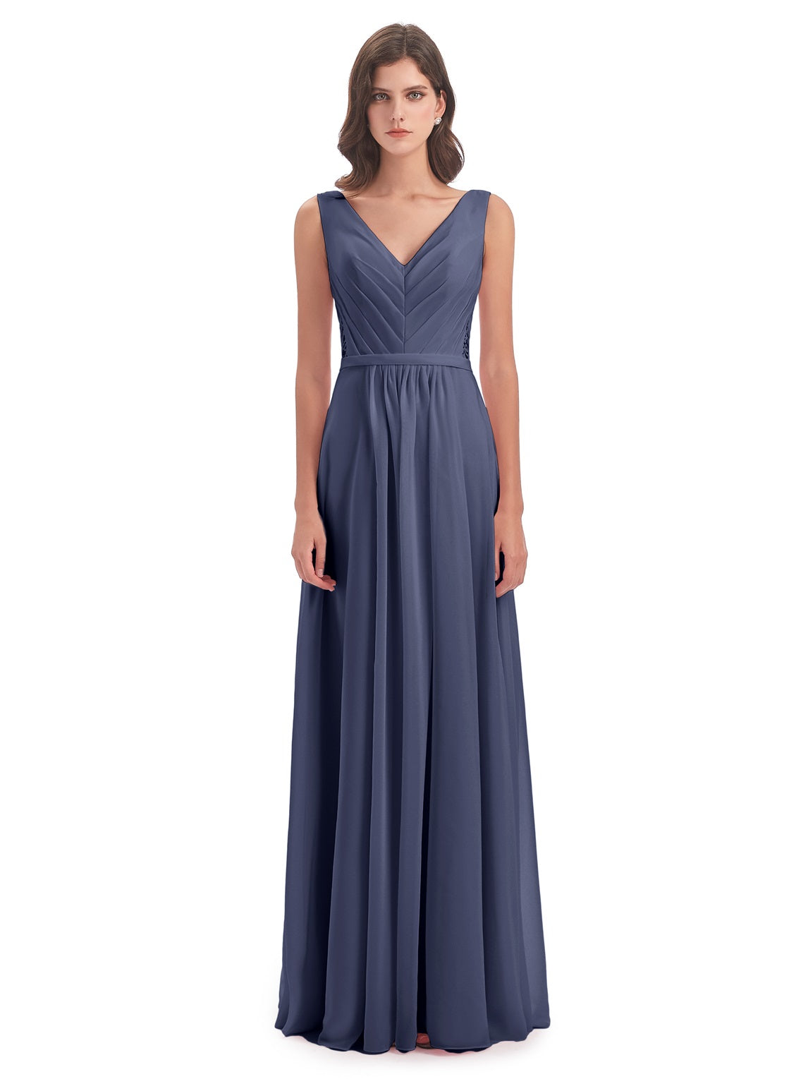 Kailee A-Linie Bodenlange V-Ausschnitt Chiffon Lange Brautjungfernkleider