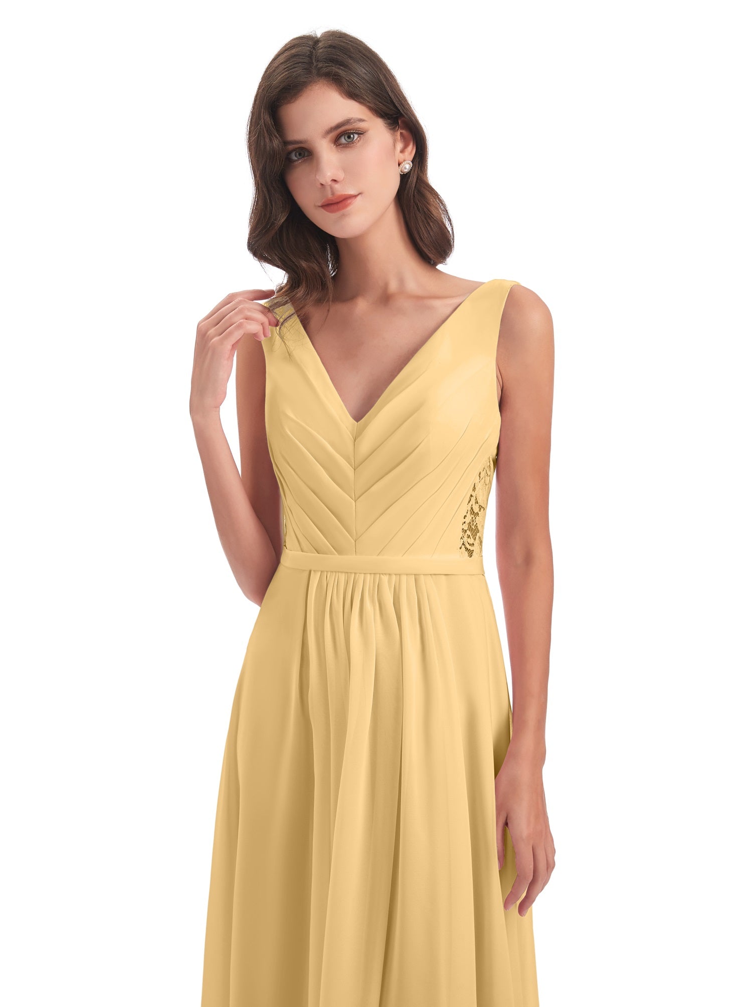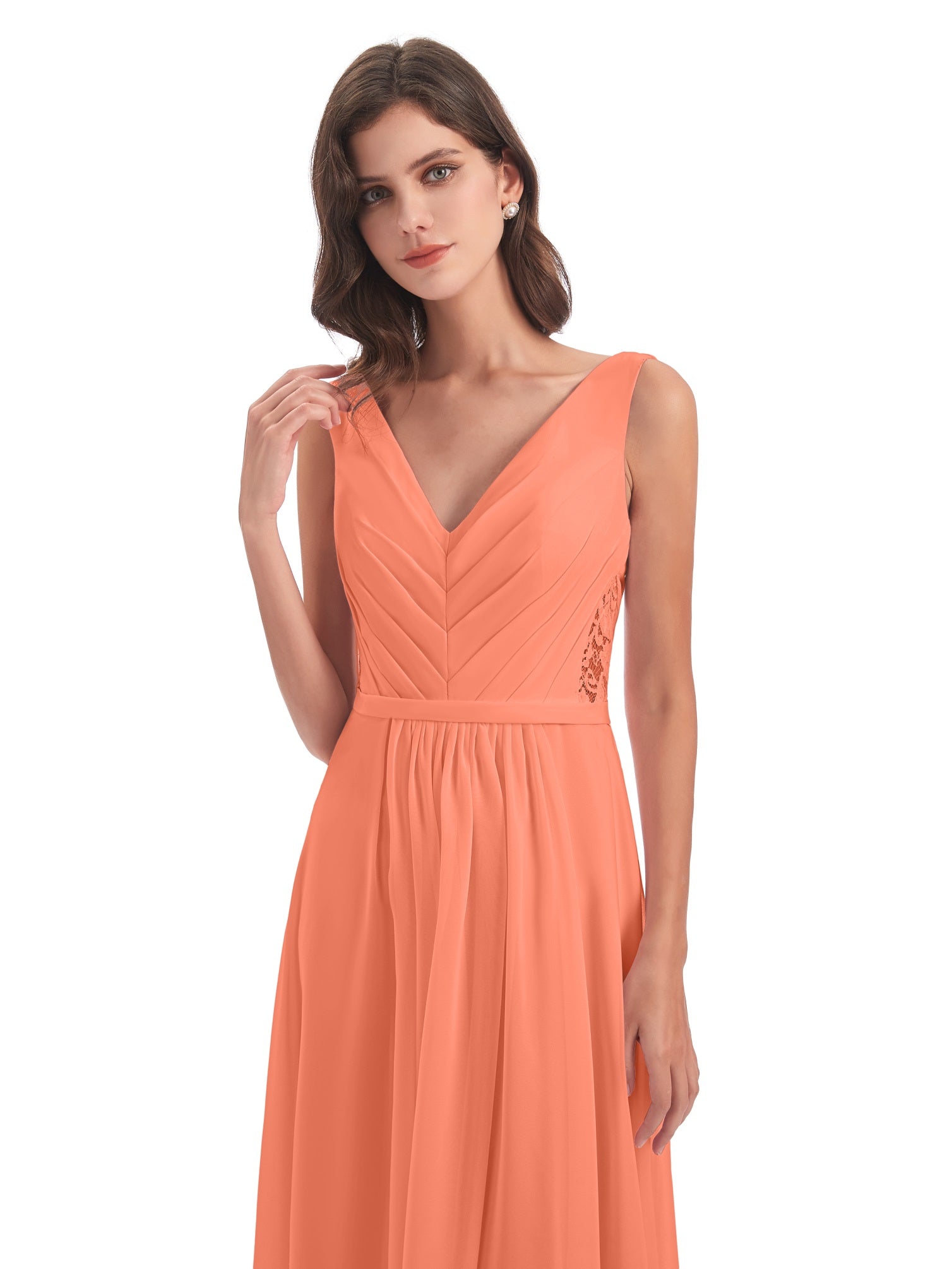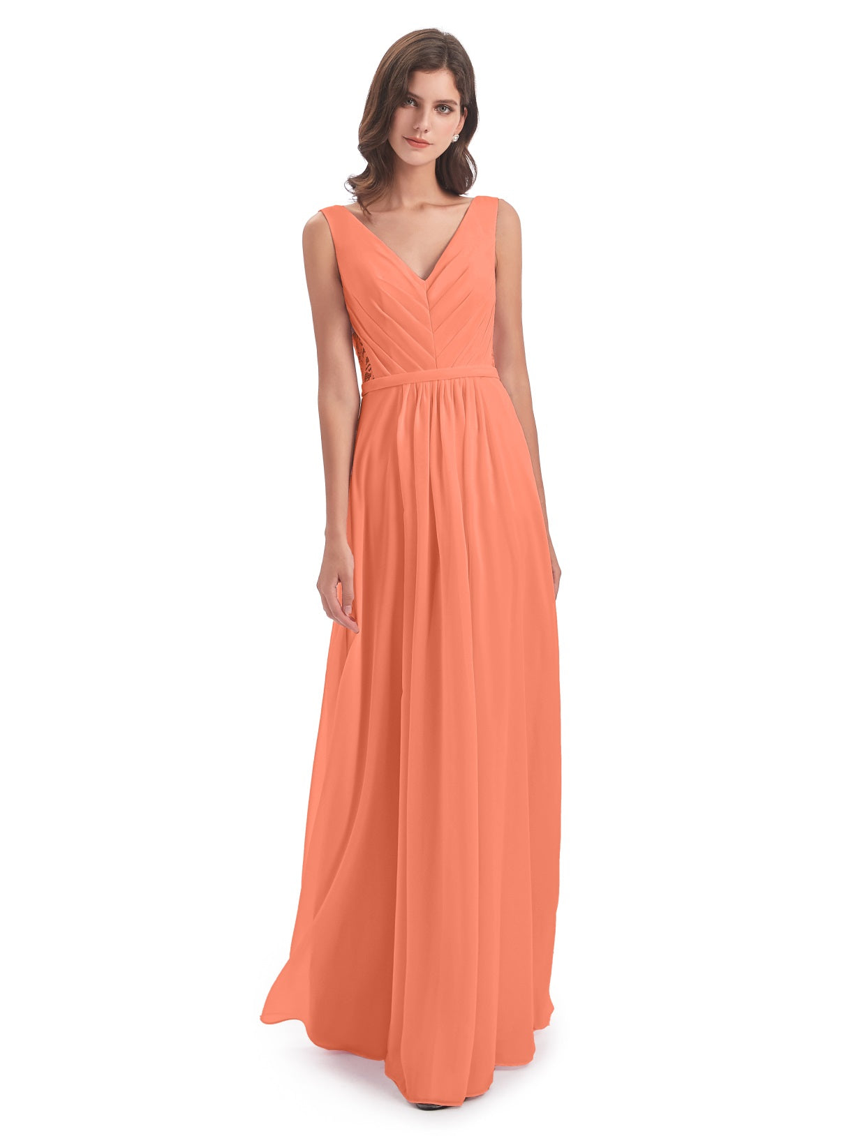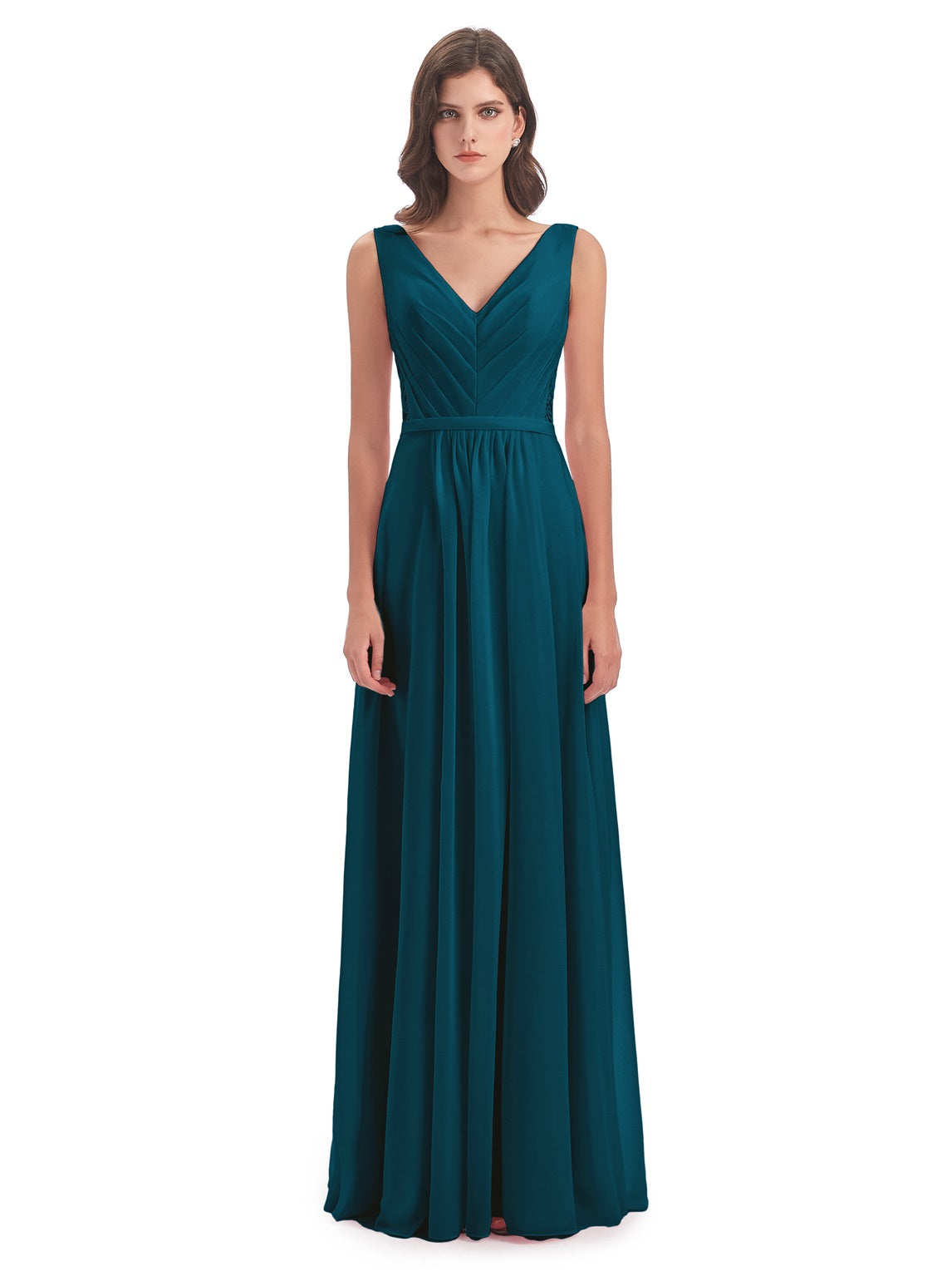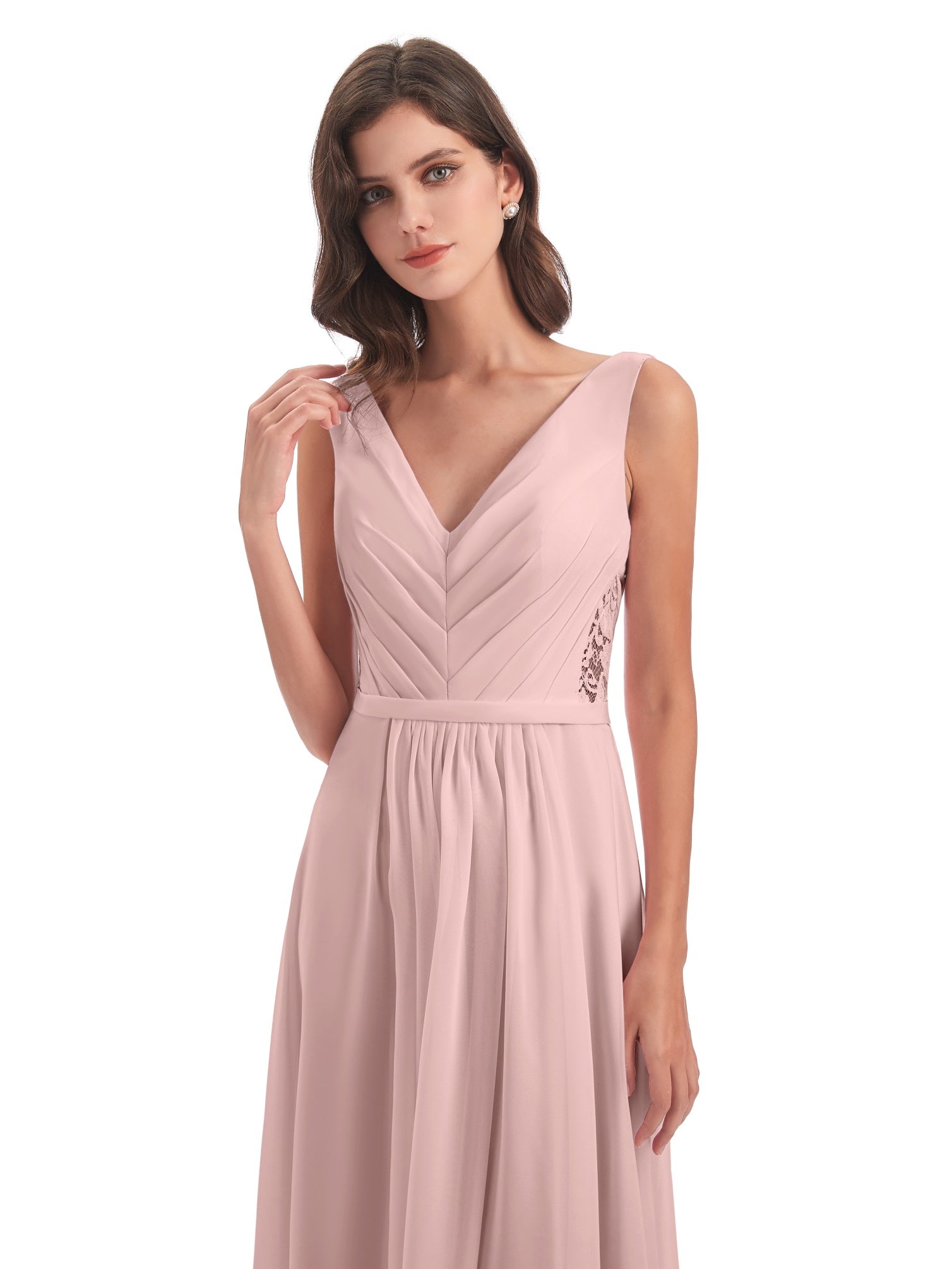 Kailee A-Linie Bodenlange V-Ausschnitt Chiffon Lange Brautjungfernkleider