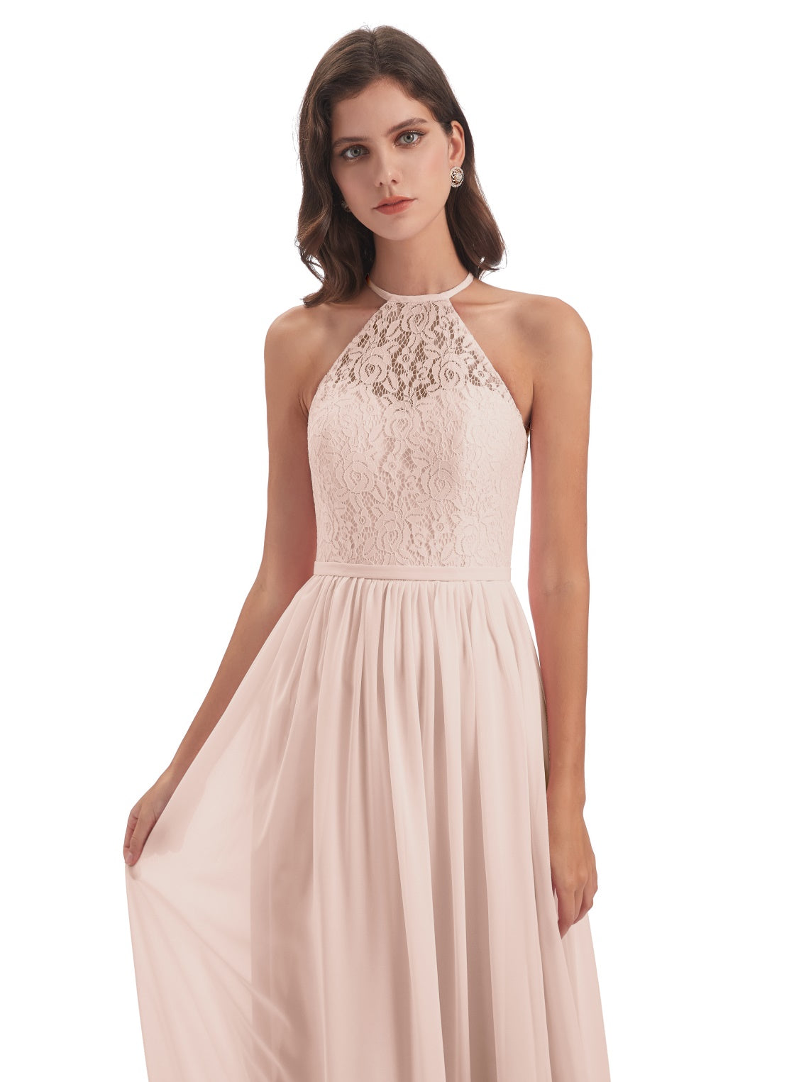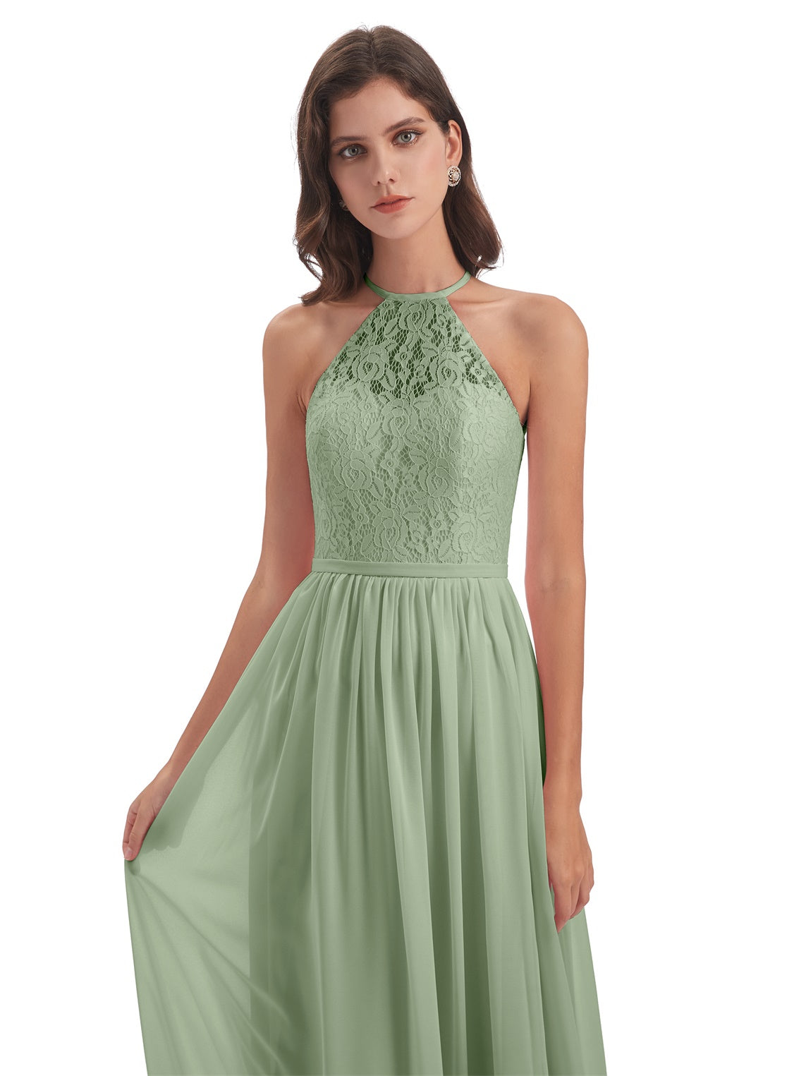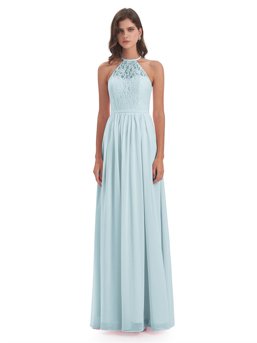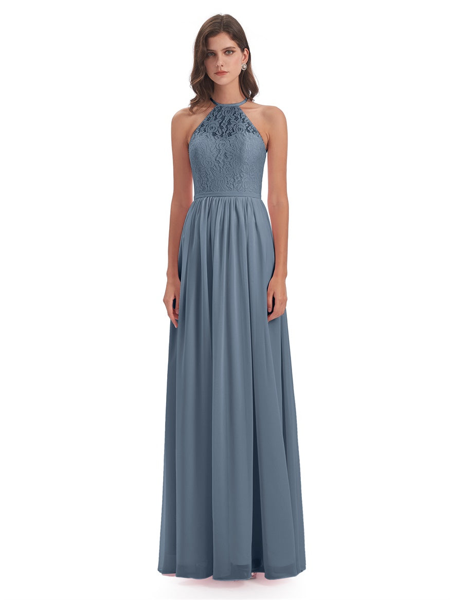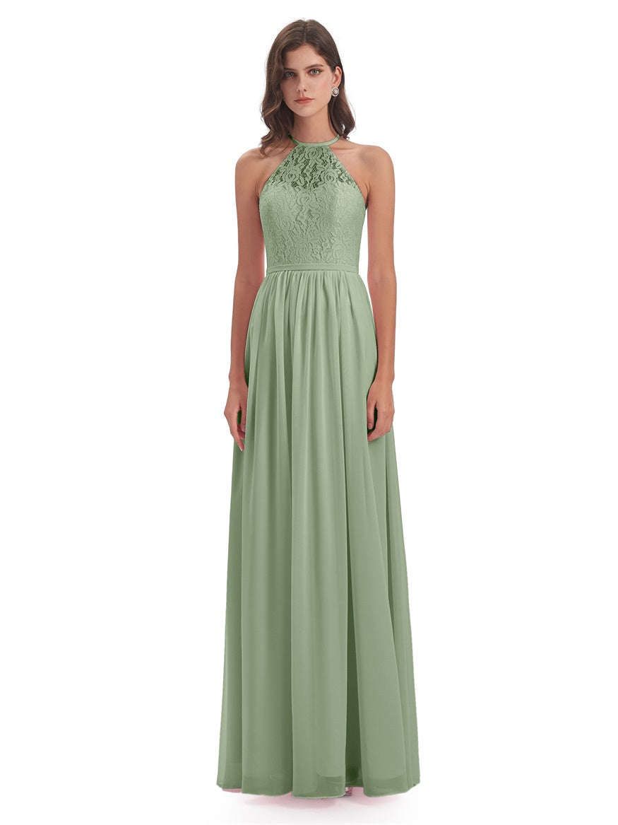 Magdalena A-Linie Bodenlange Nackenträger Spitze/Chiffon Lange Brautjungfernkleider