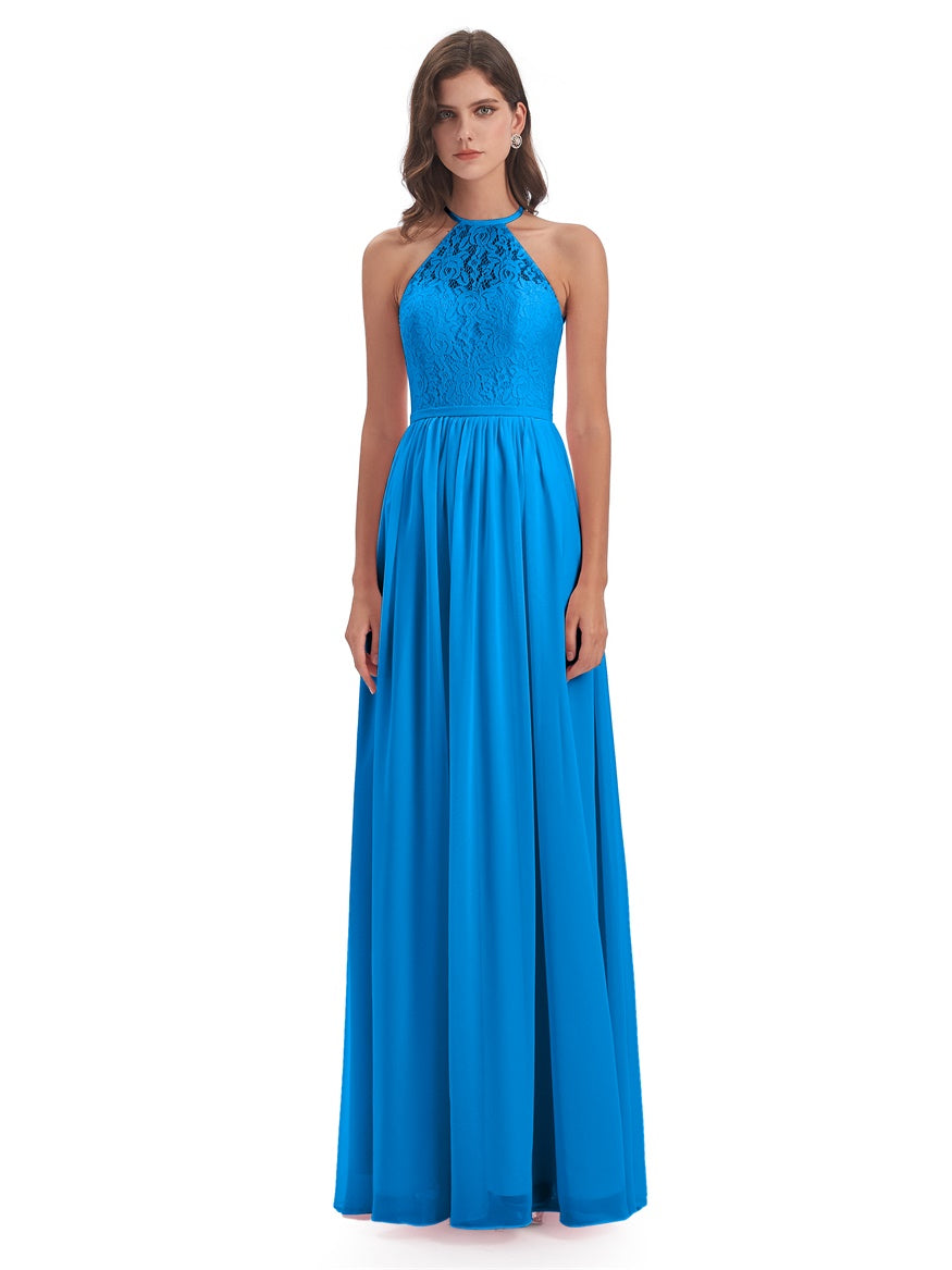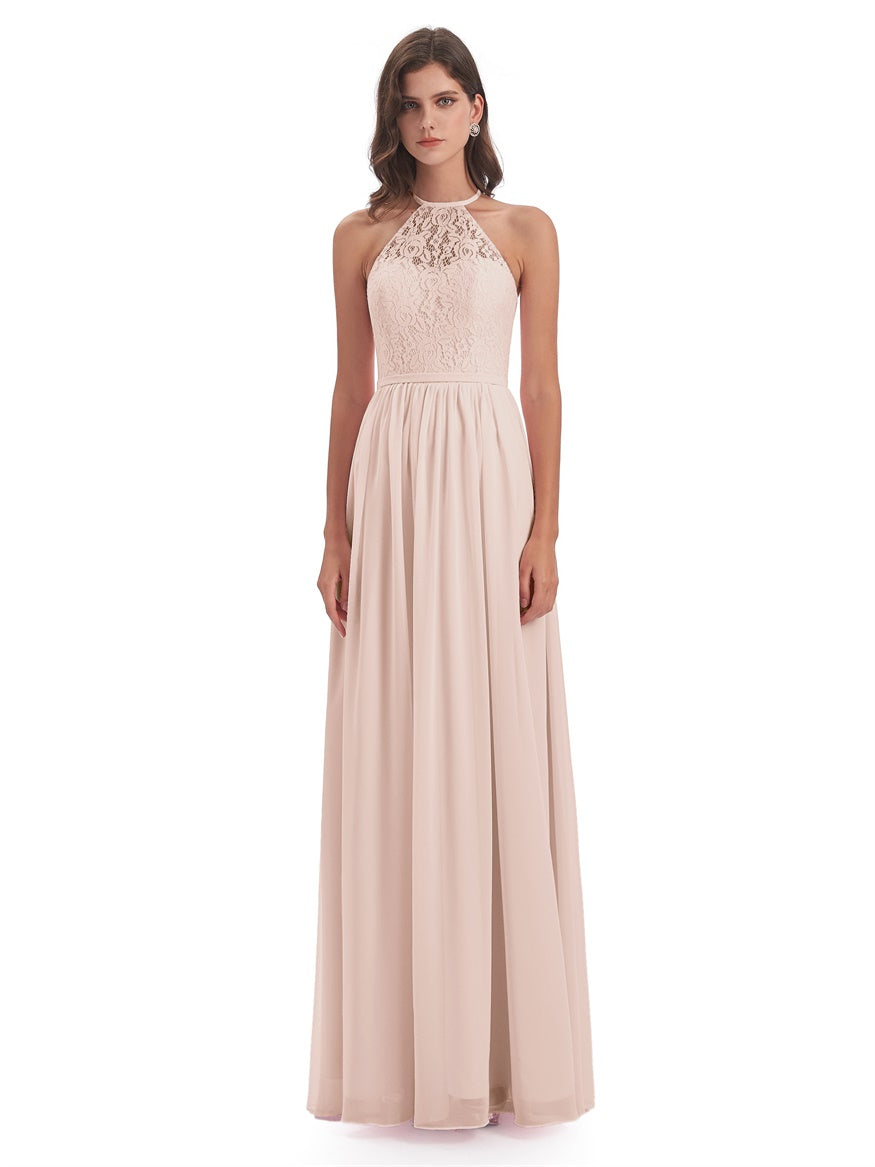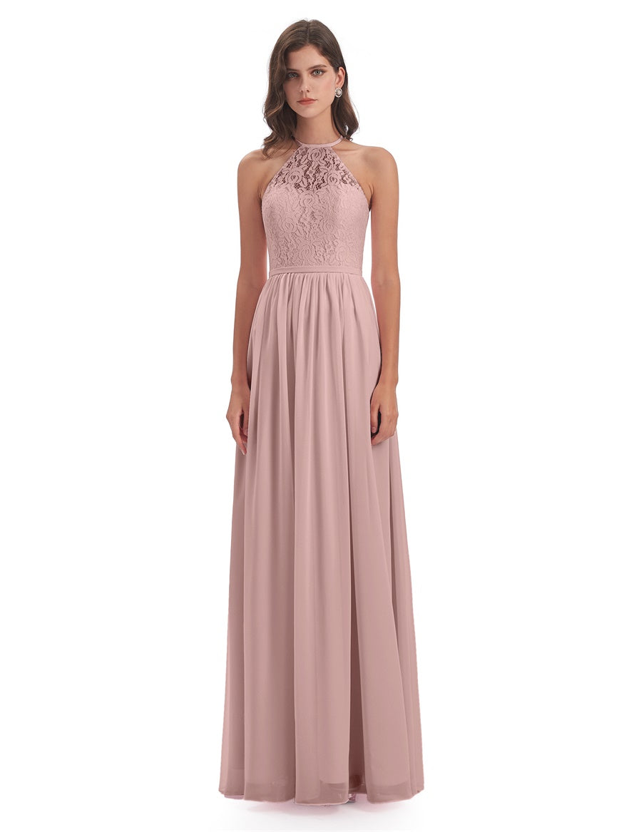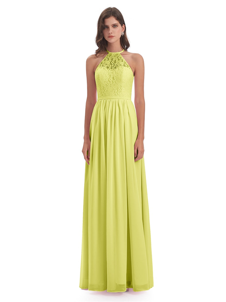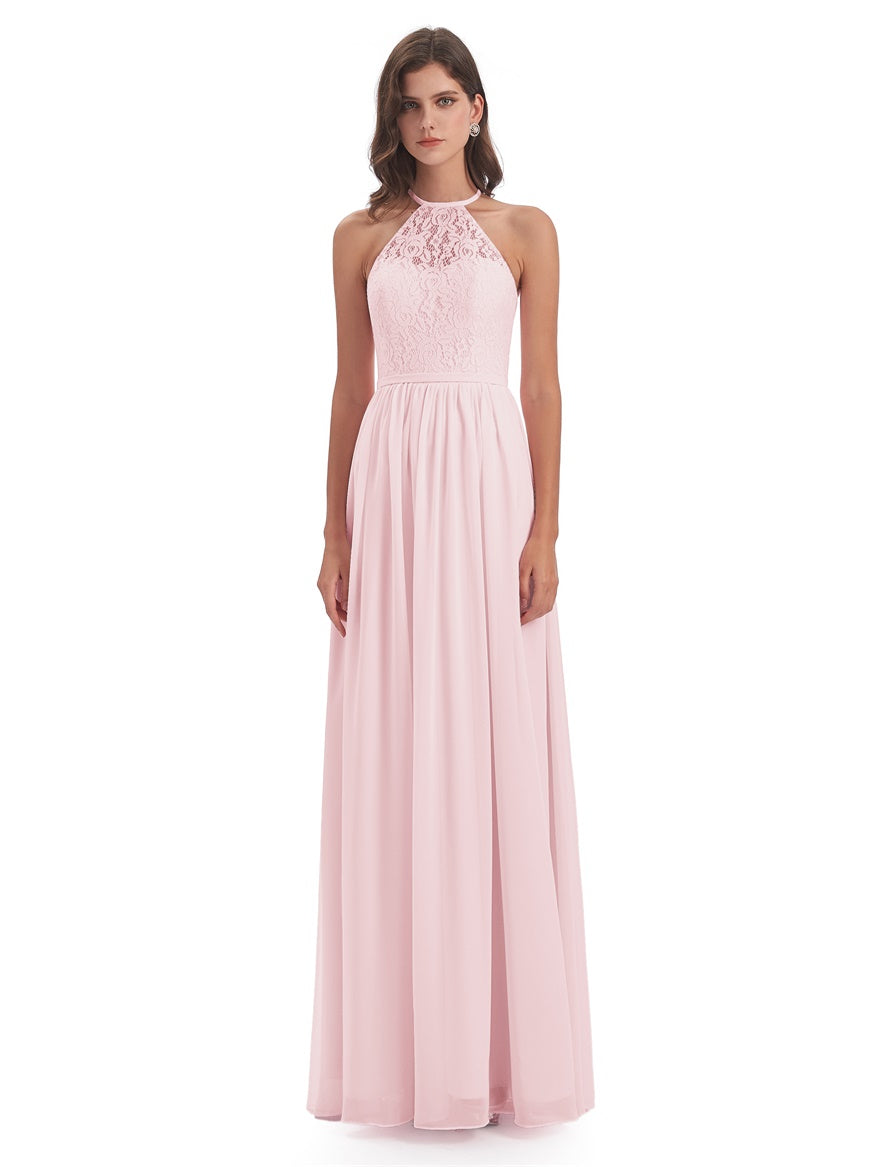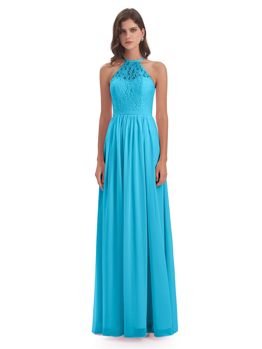 Magdalena A-Linie Bodenlange Nackenträger Spitze/Chiffon Lange Brautjungfernkleider