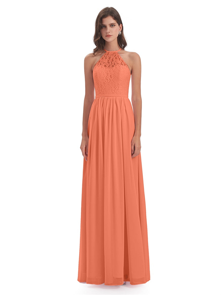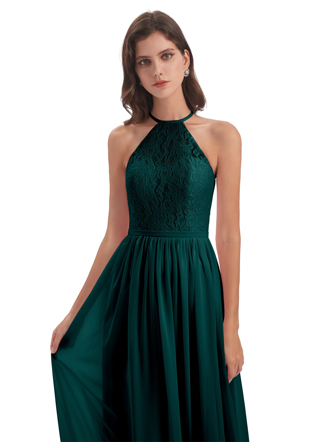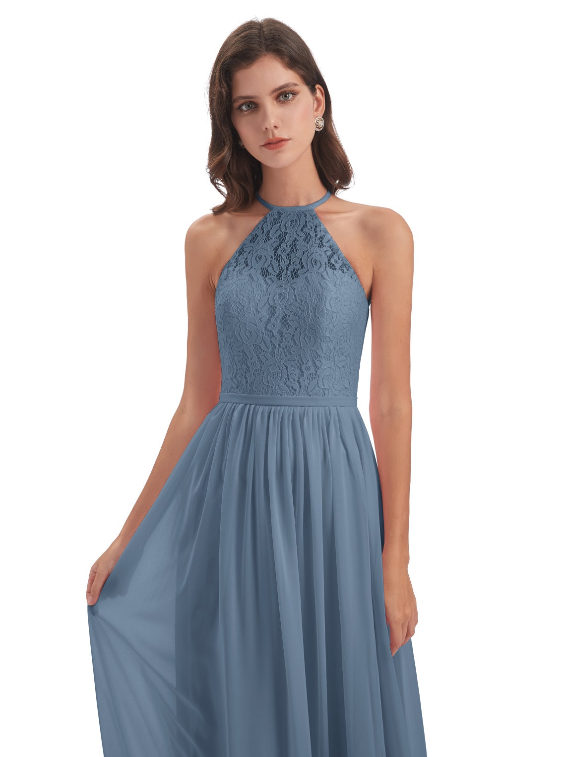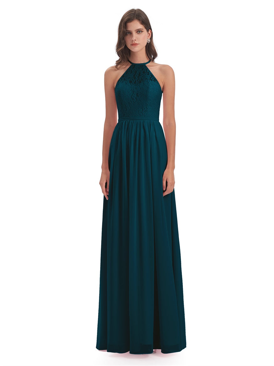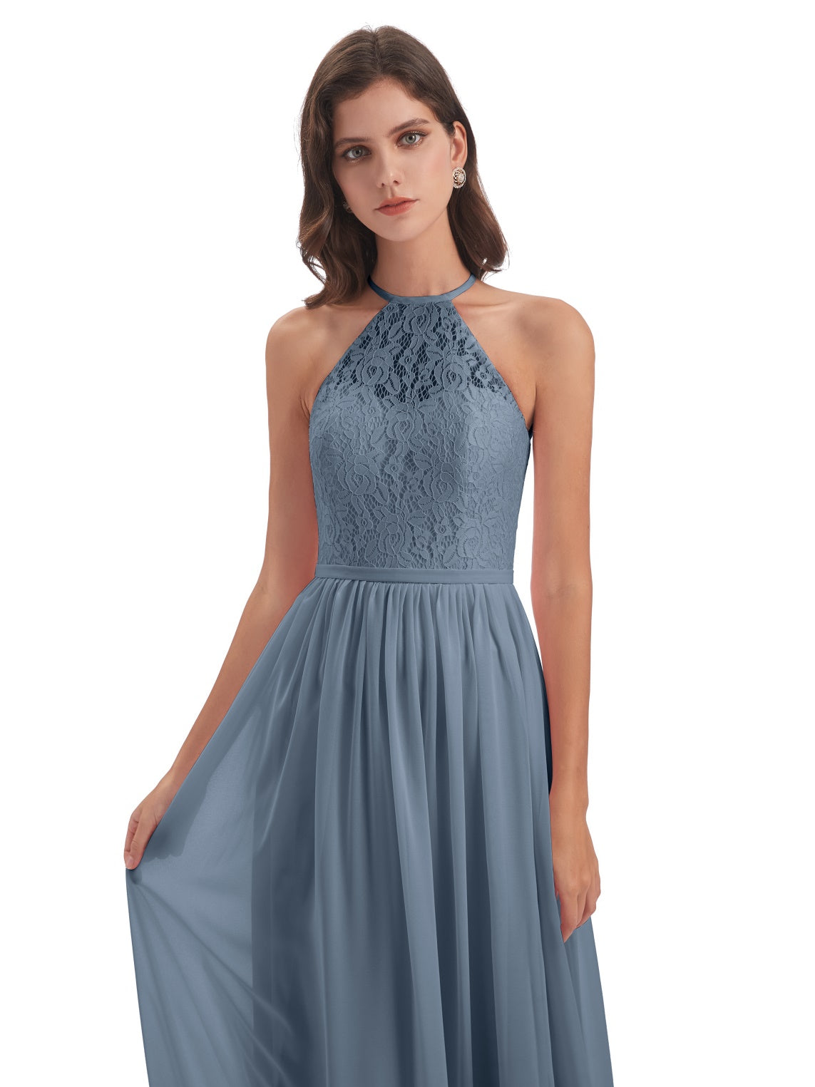 Magdalena A-Linie Bodenlange Nackenträger Spitze/Chiffon Lange Brautjungfernkleider