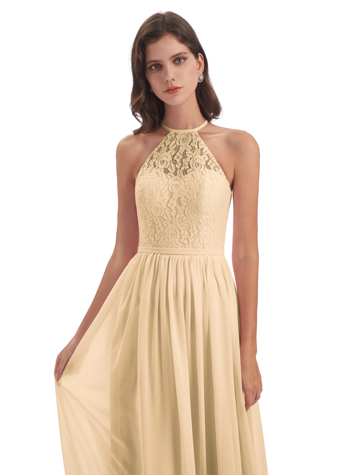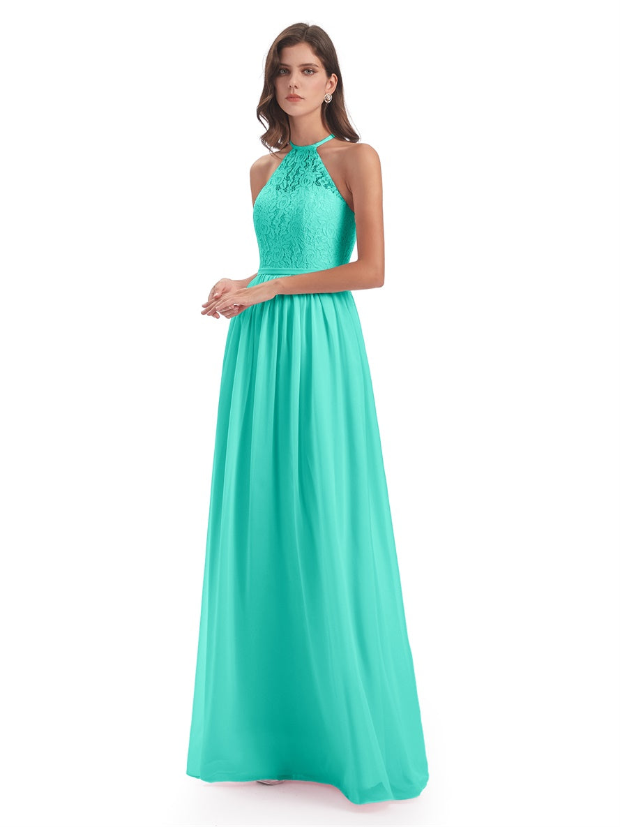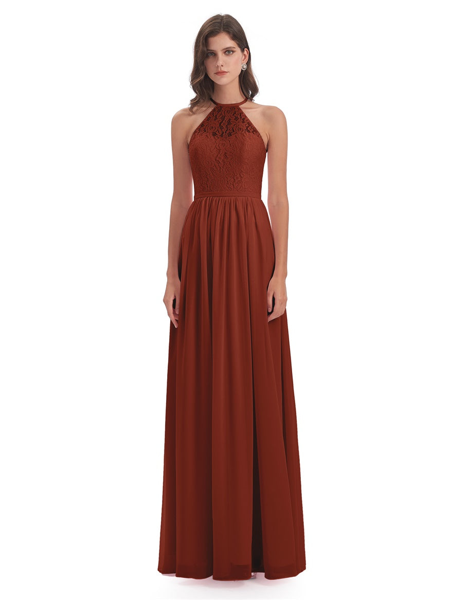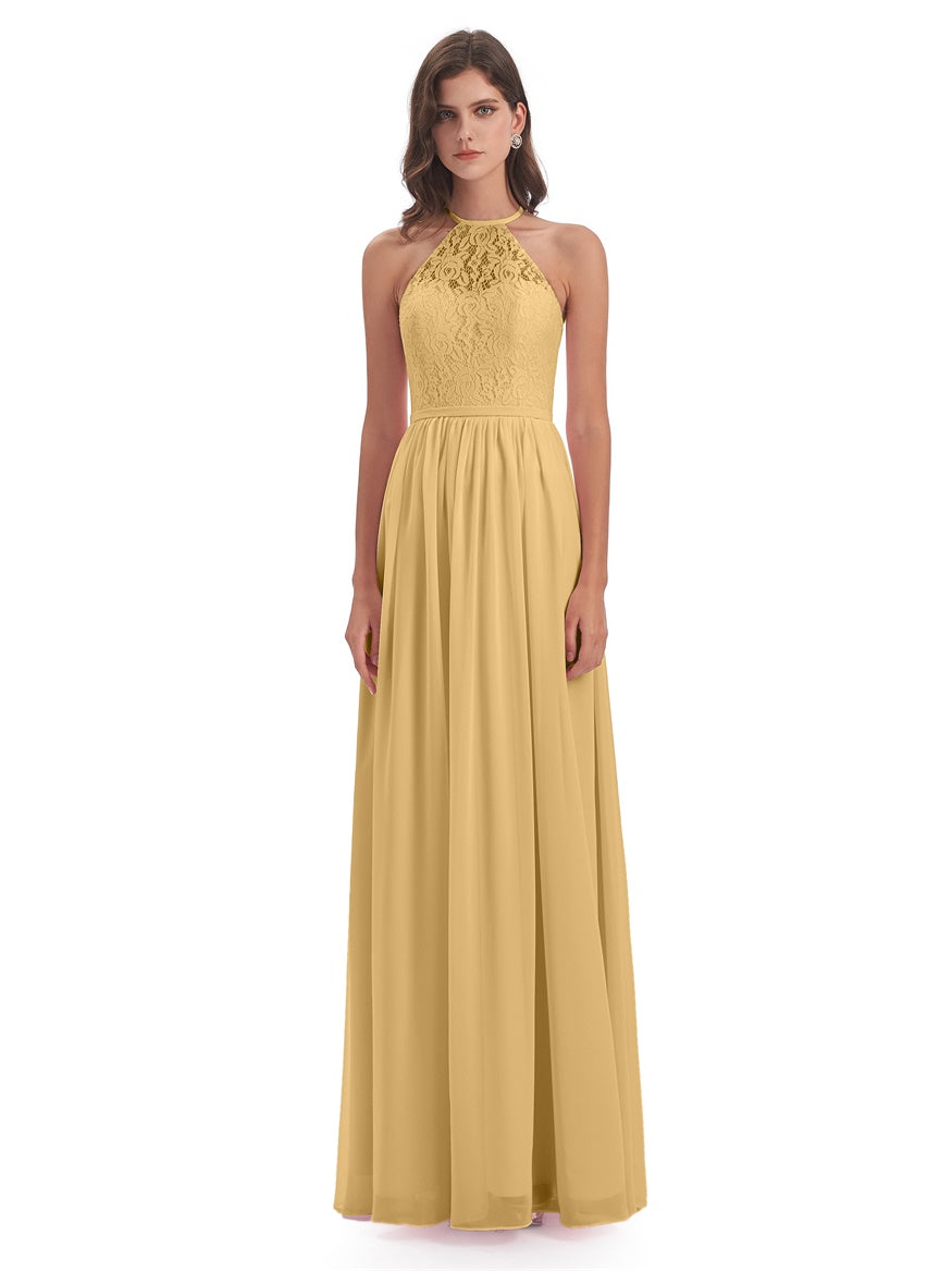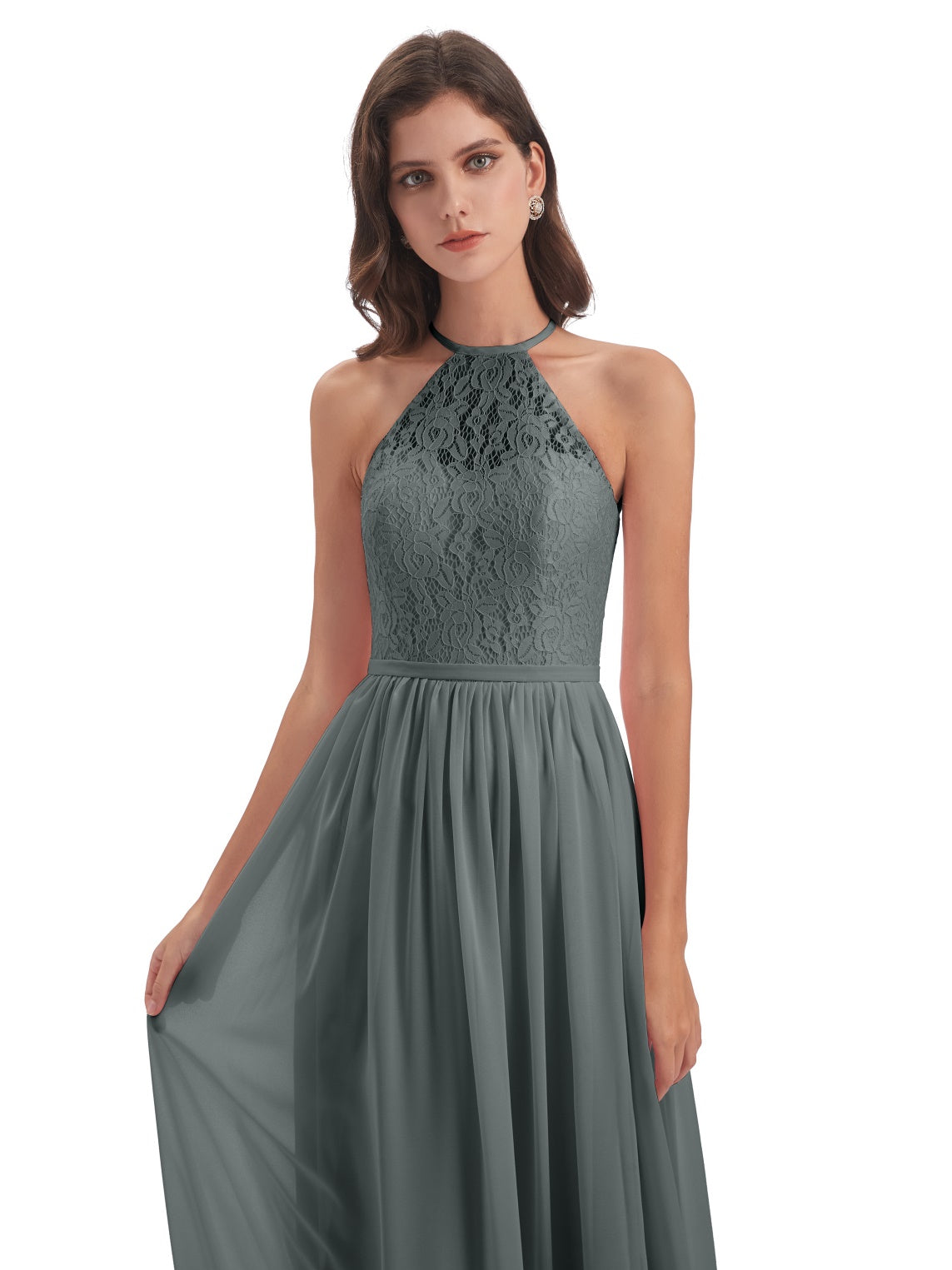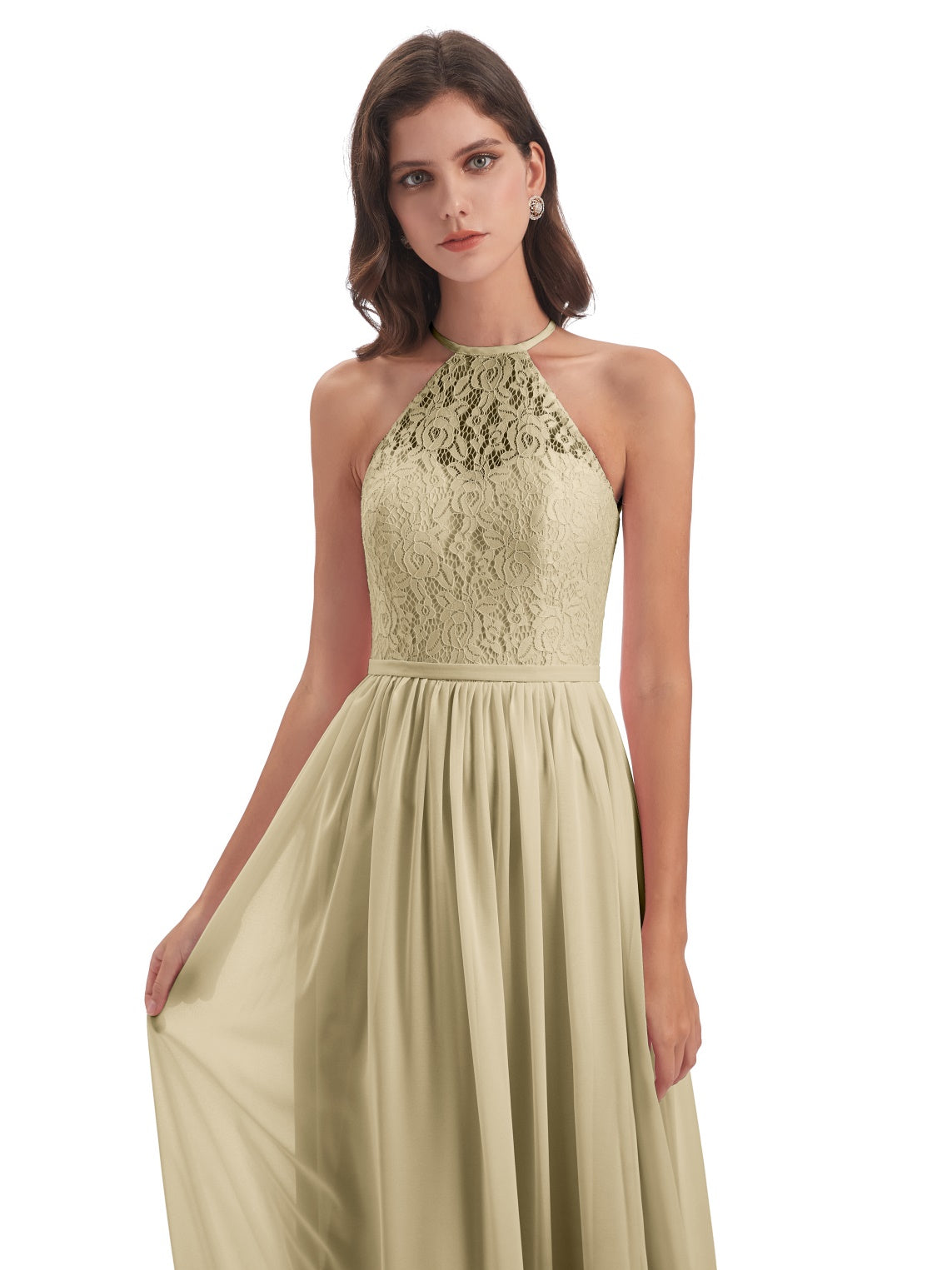 Magdalena A-Linie Bodenlange Nackenträger Spitze/Chiffon Lange Brautjungfernkleider