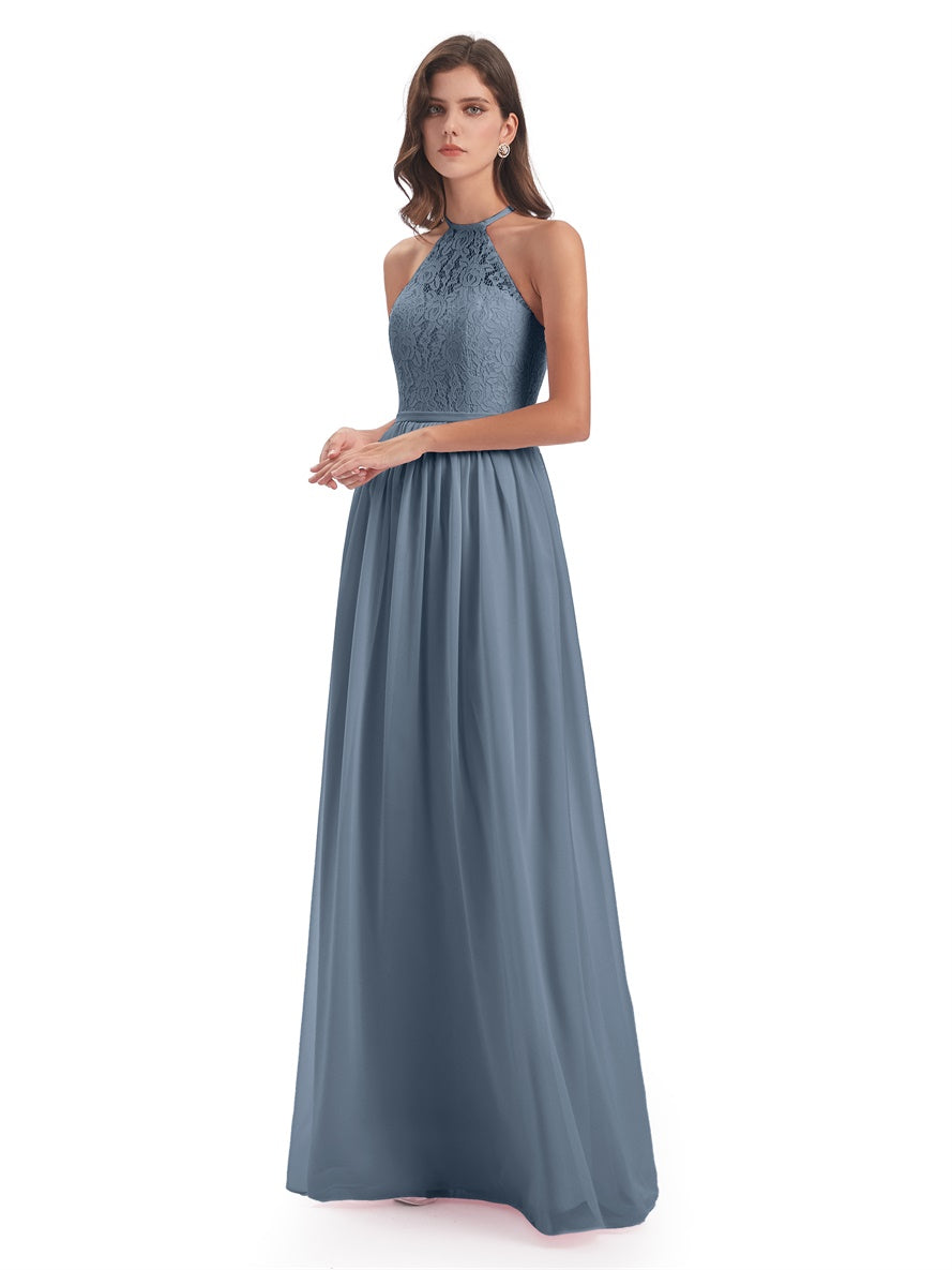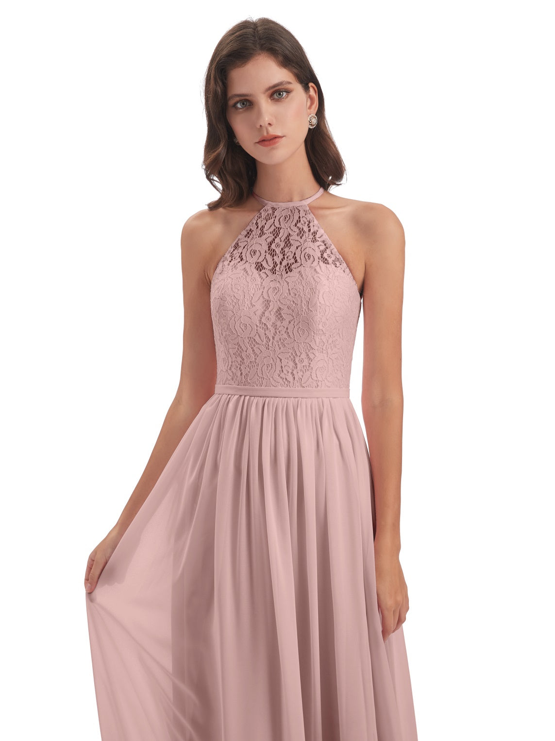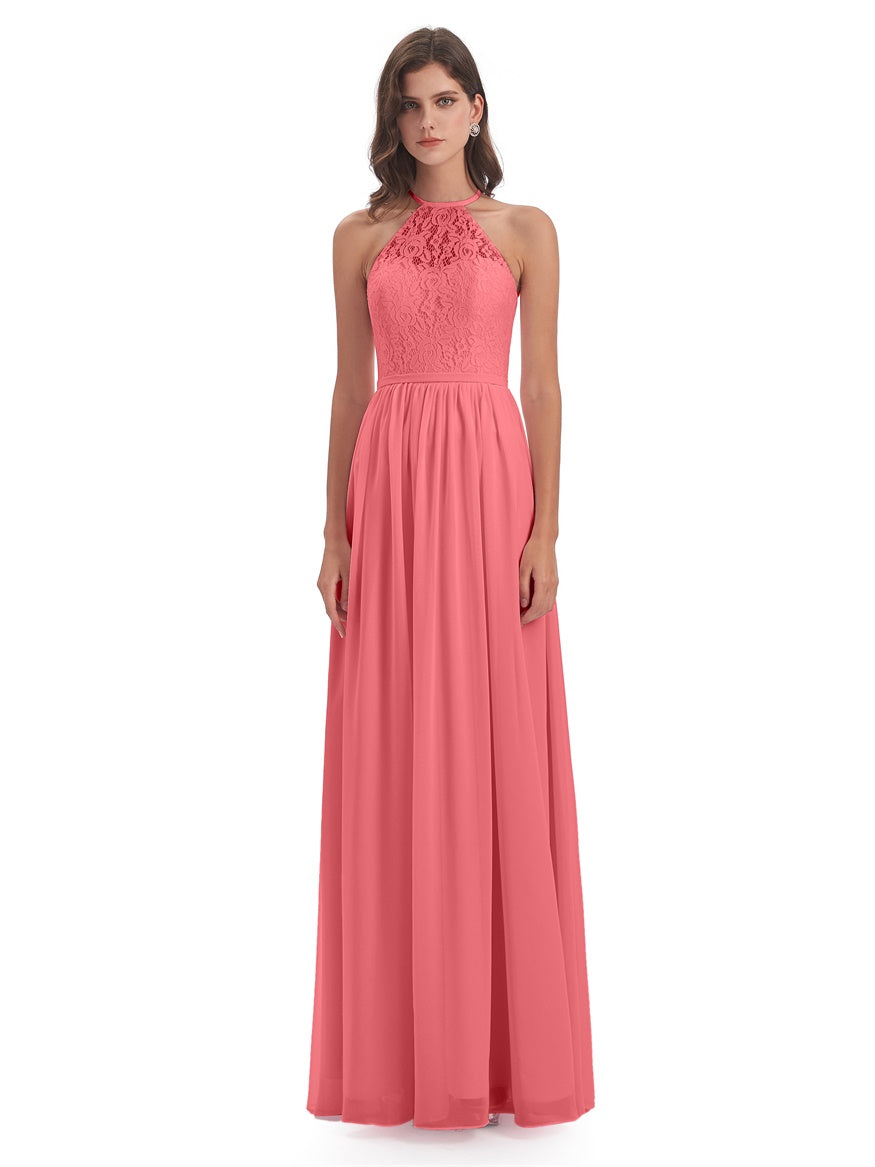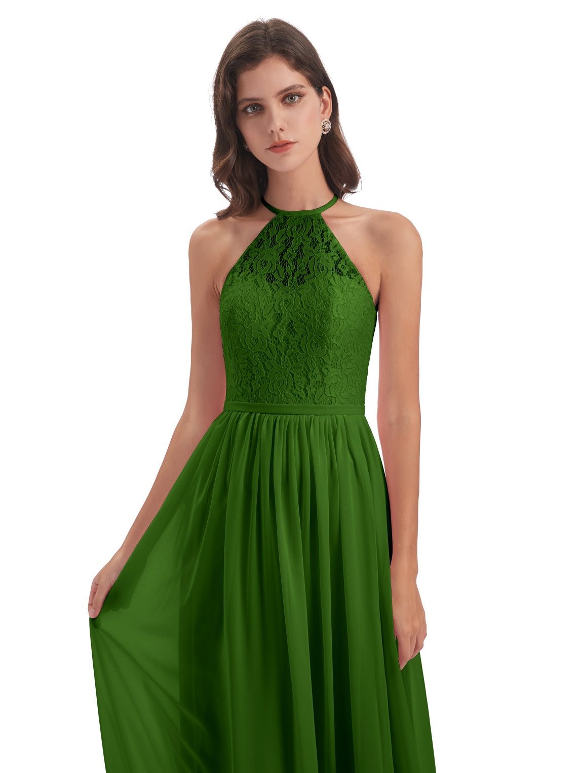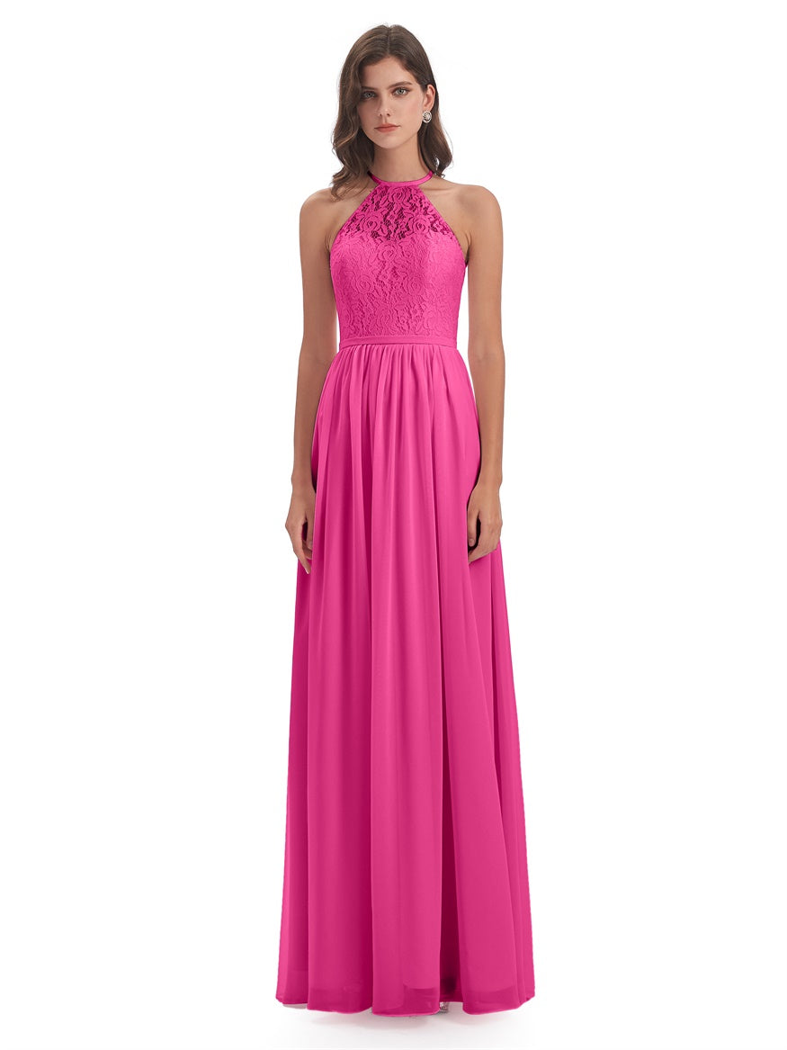 Magdalena A-Linie Bodenlange Nackenträger Spitze/Chiffon Lange Brautjungfernkleider