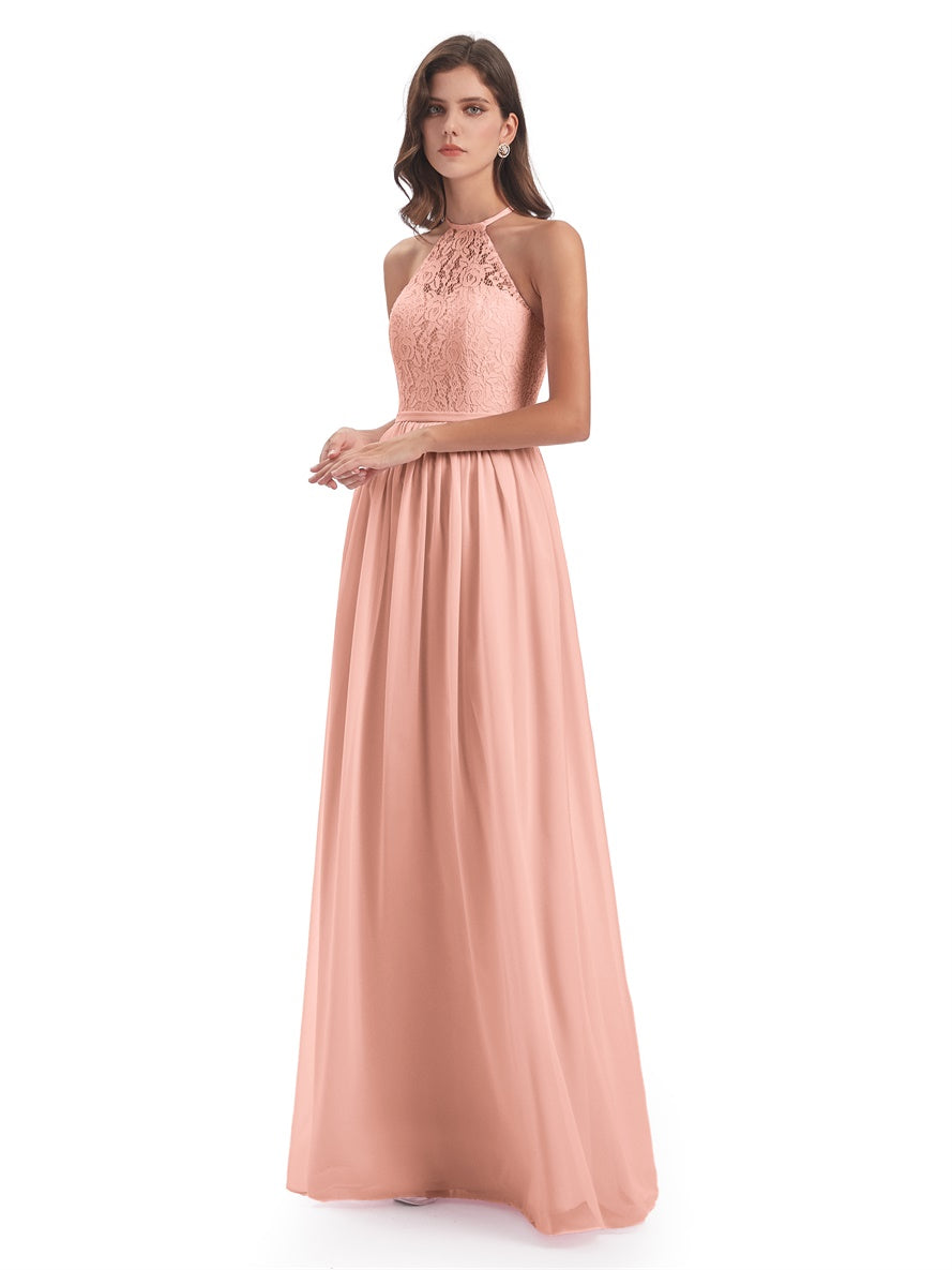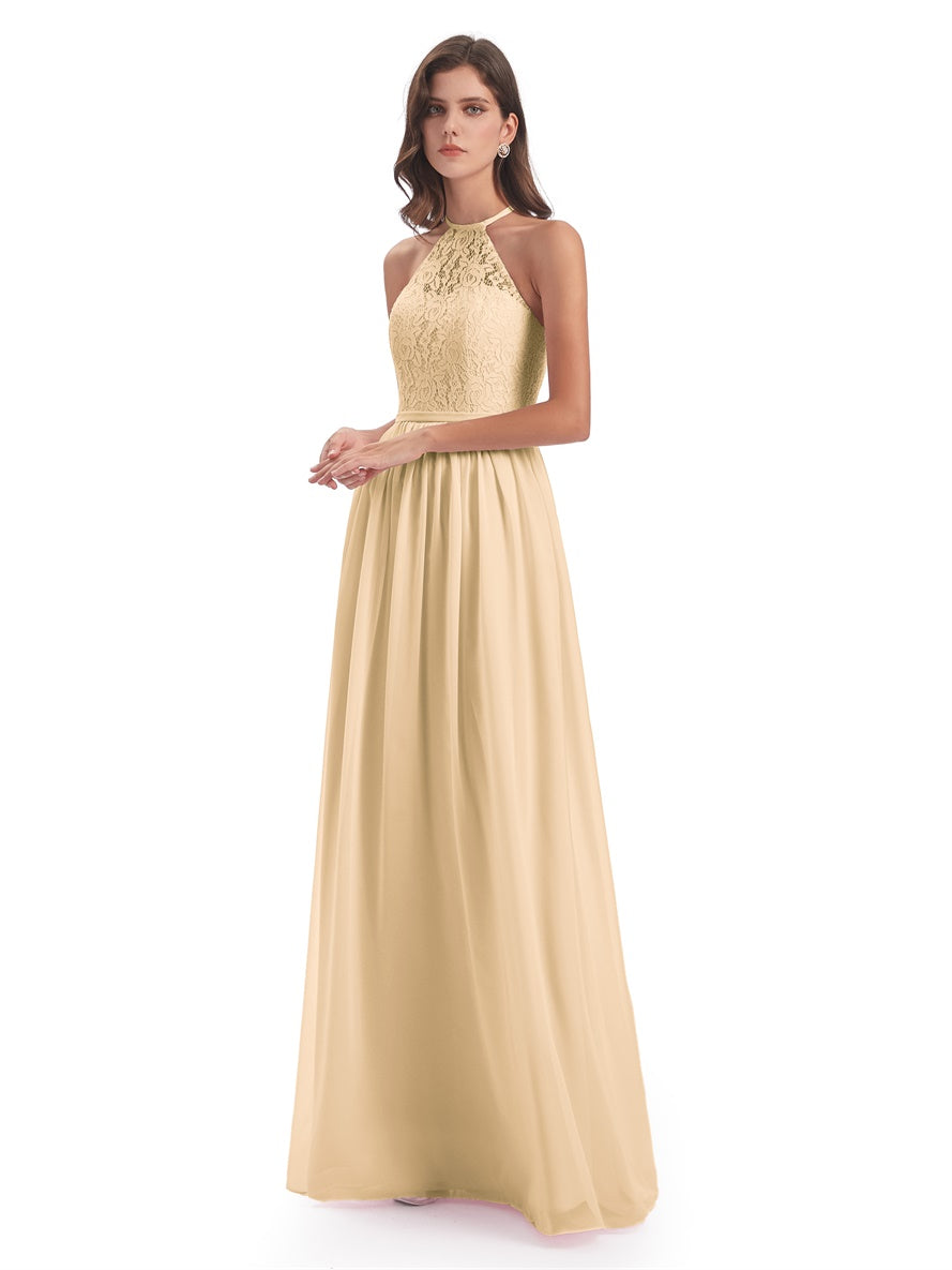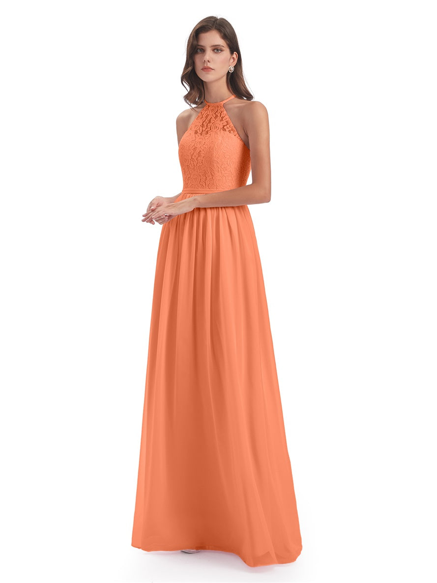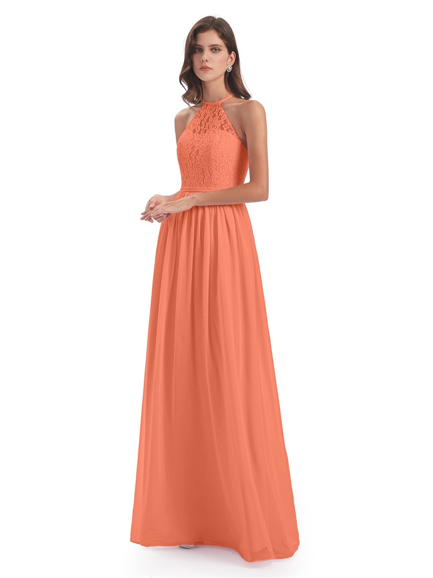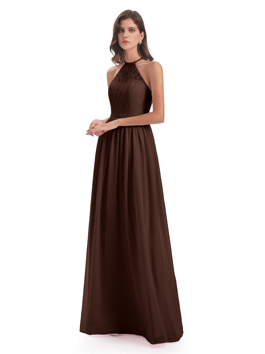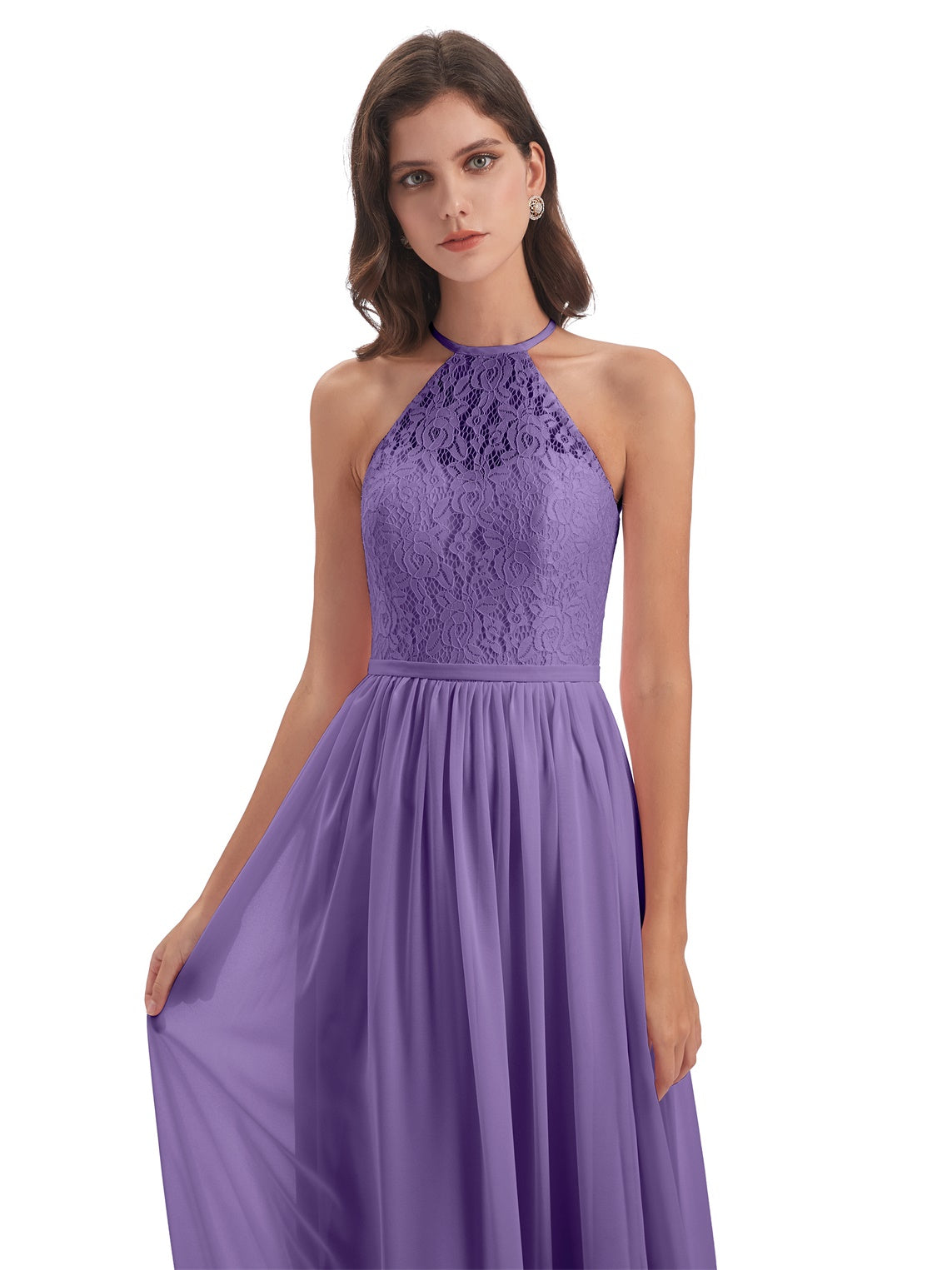 Magdalena A-Linie Bodenlange Nackenträger Spitze/Chiffon Lange Brautjungfernkleider