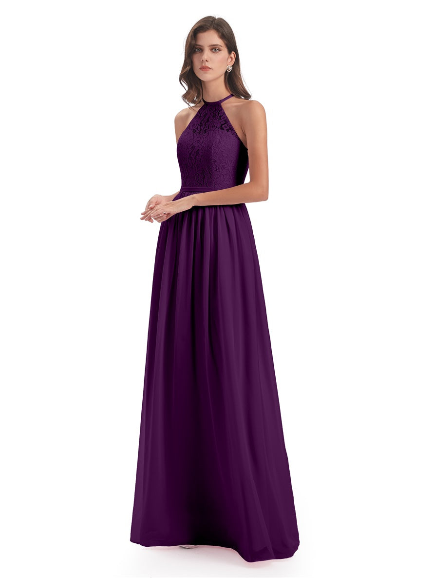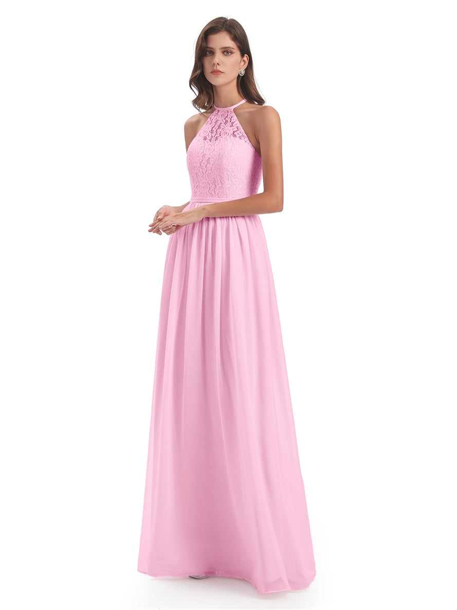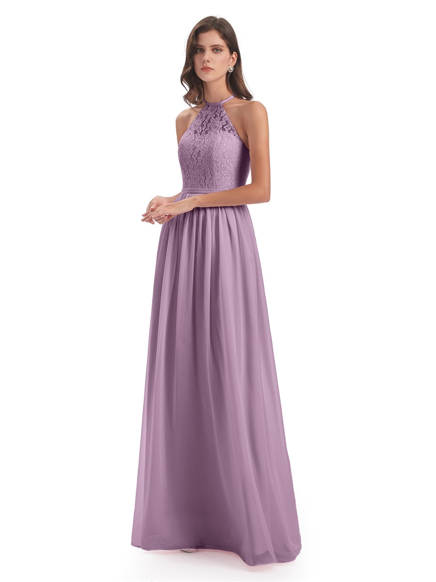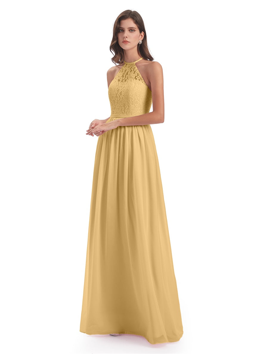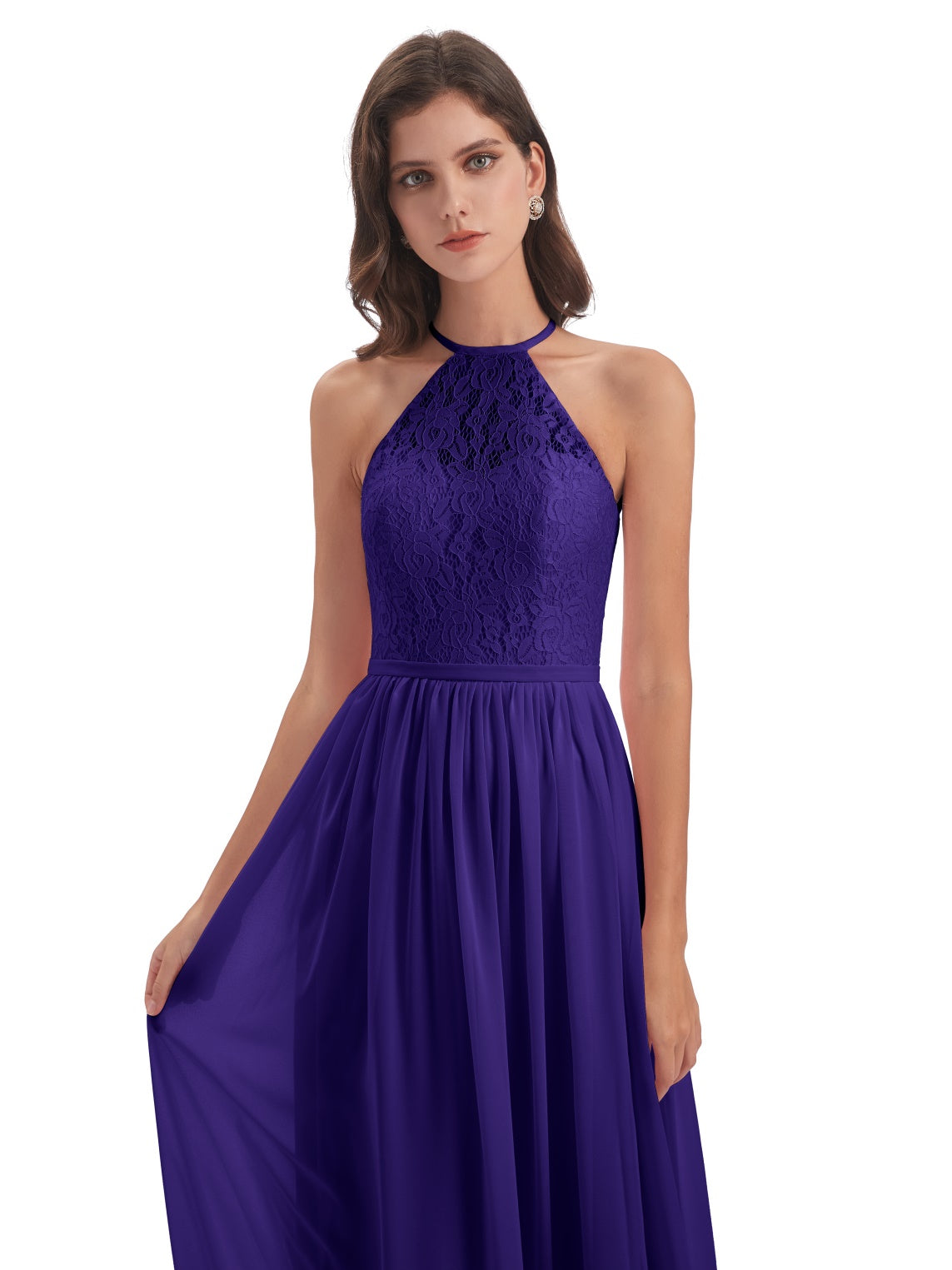 Magdalena A-Linie Bodenlange Nackenträger Spitze/Chiffon Lange Brautjungfernkleider