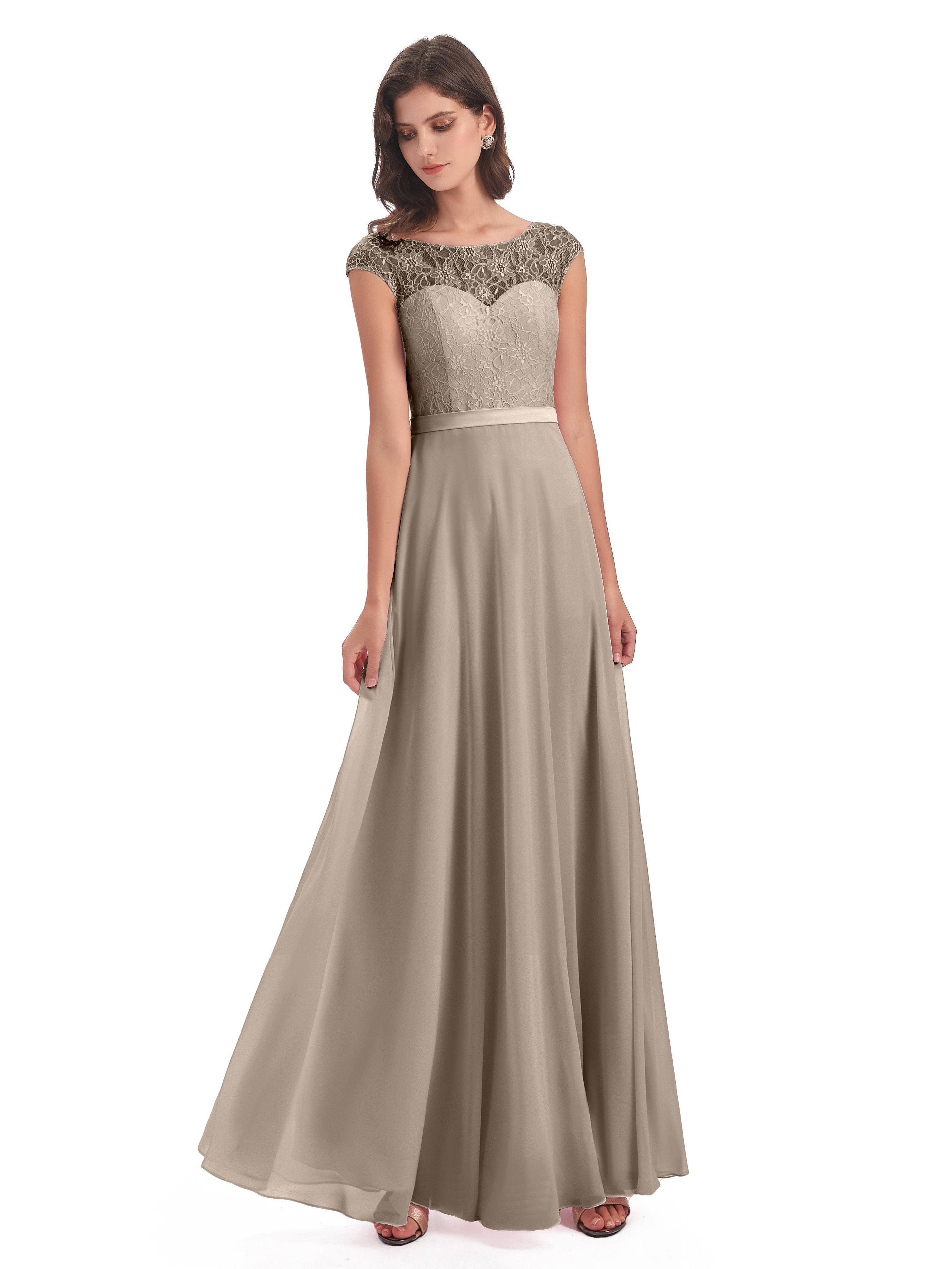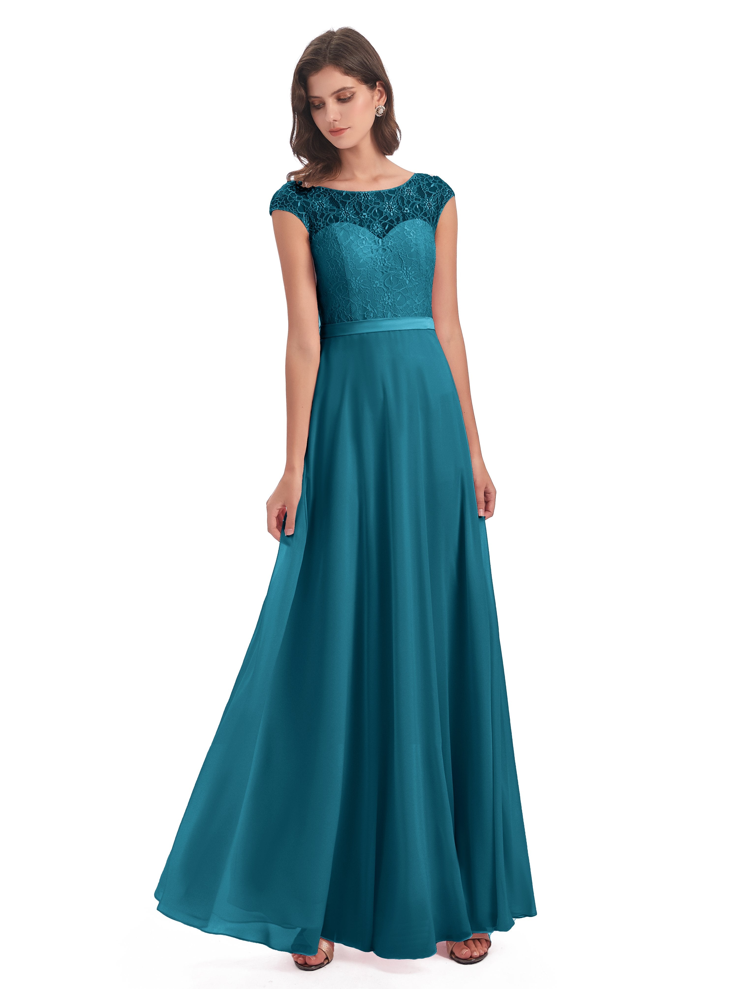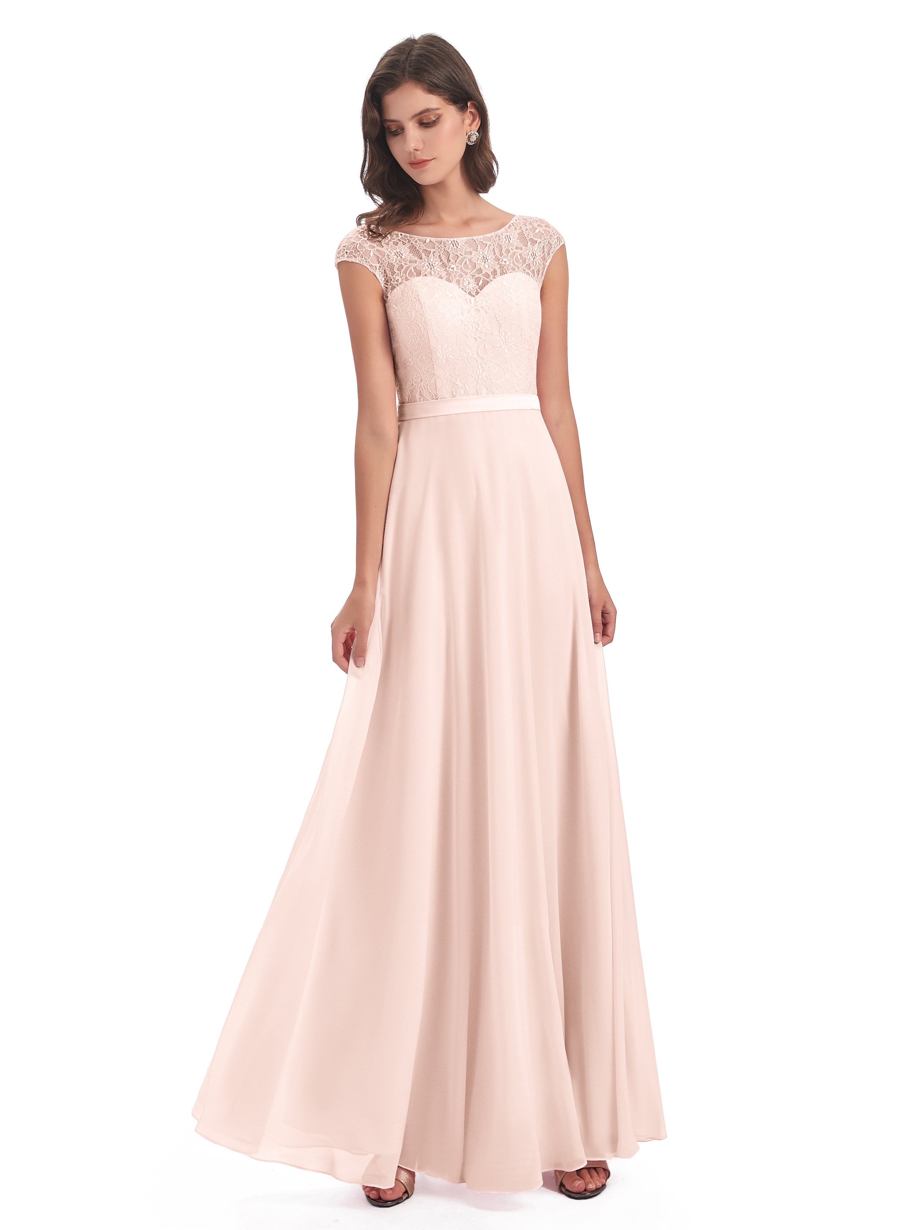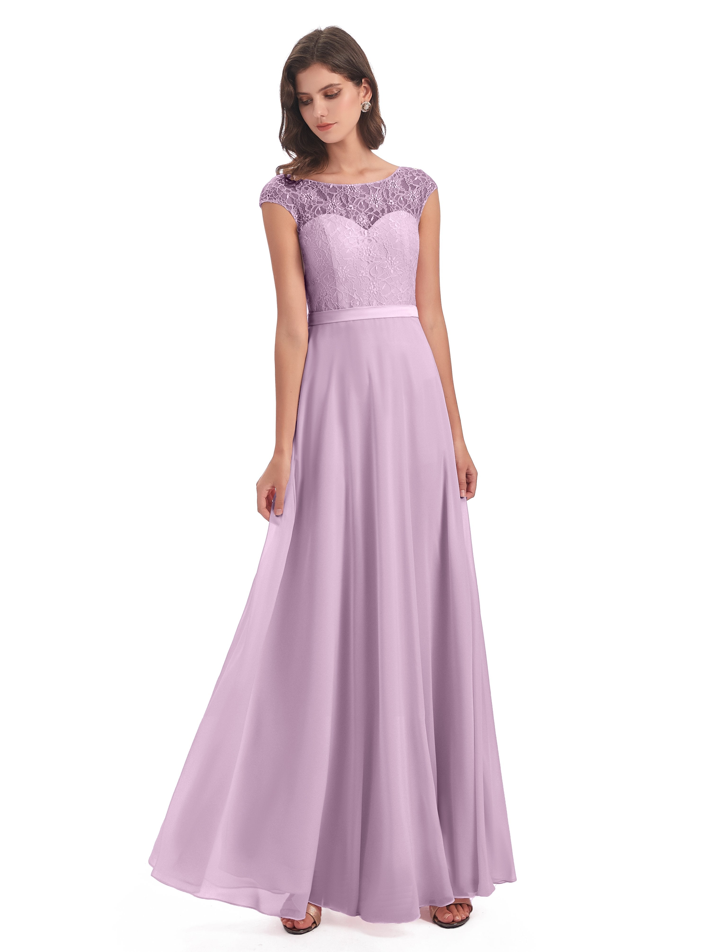 Treasure A-Linie Bodenlange Kappenärmel Spitze/Chiffon Lange Brautjungfernkleider