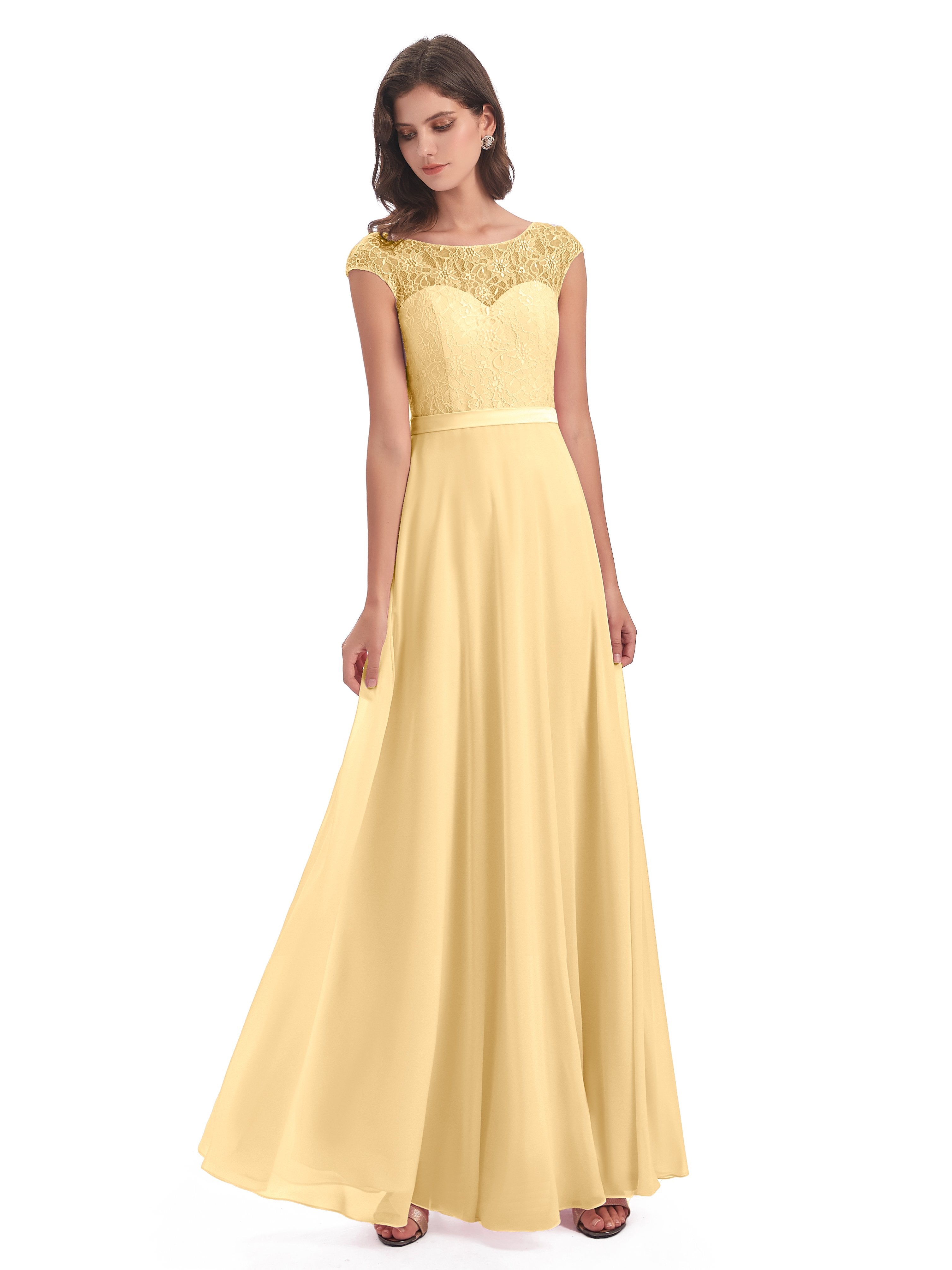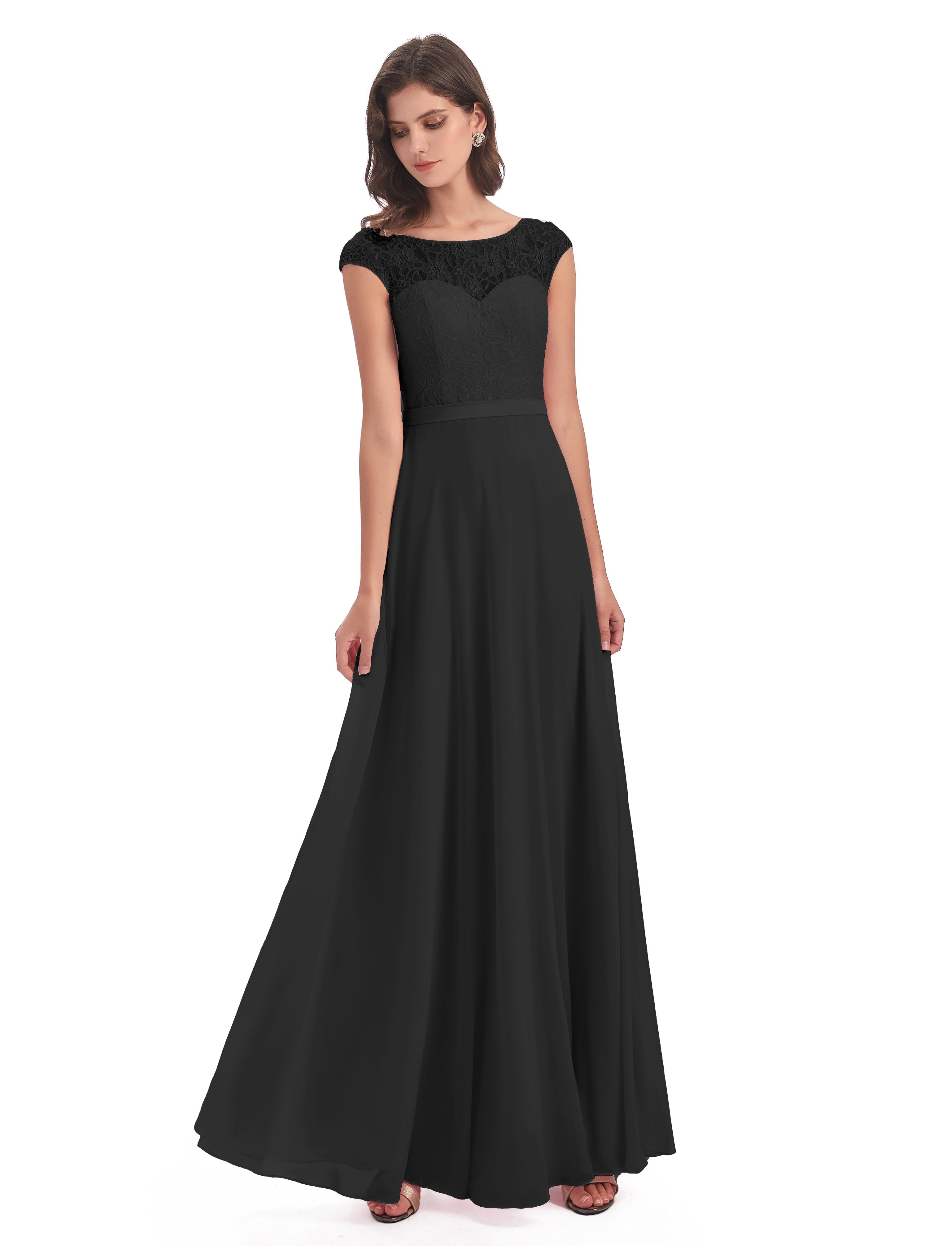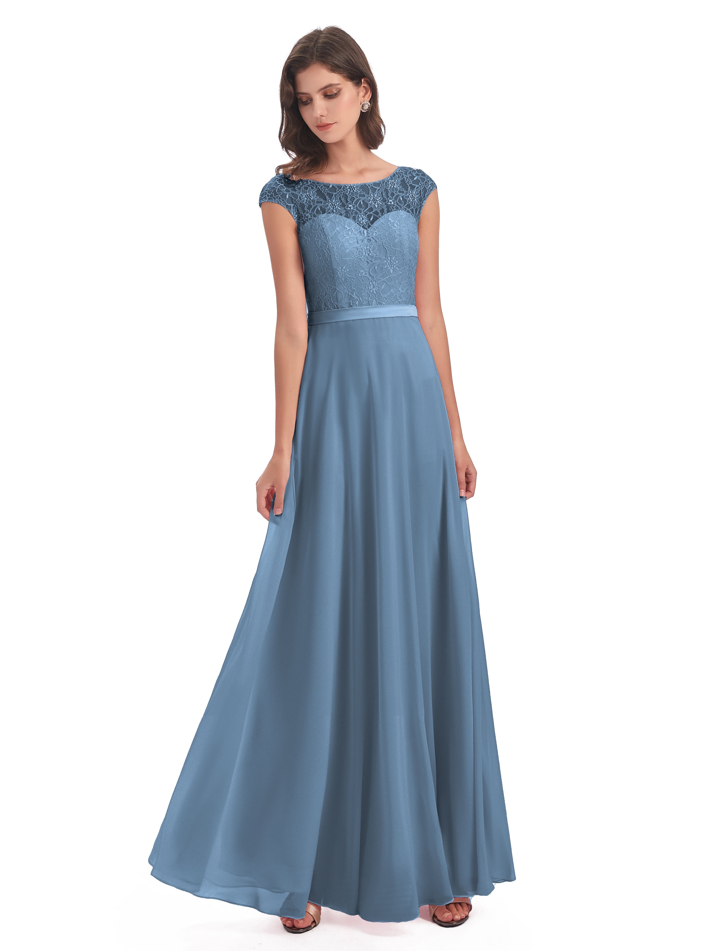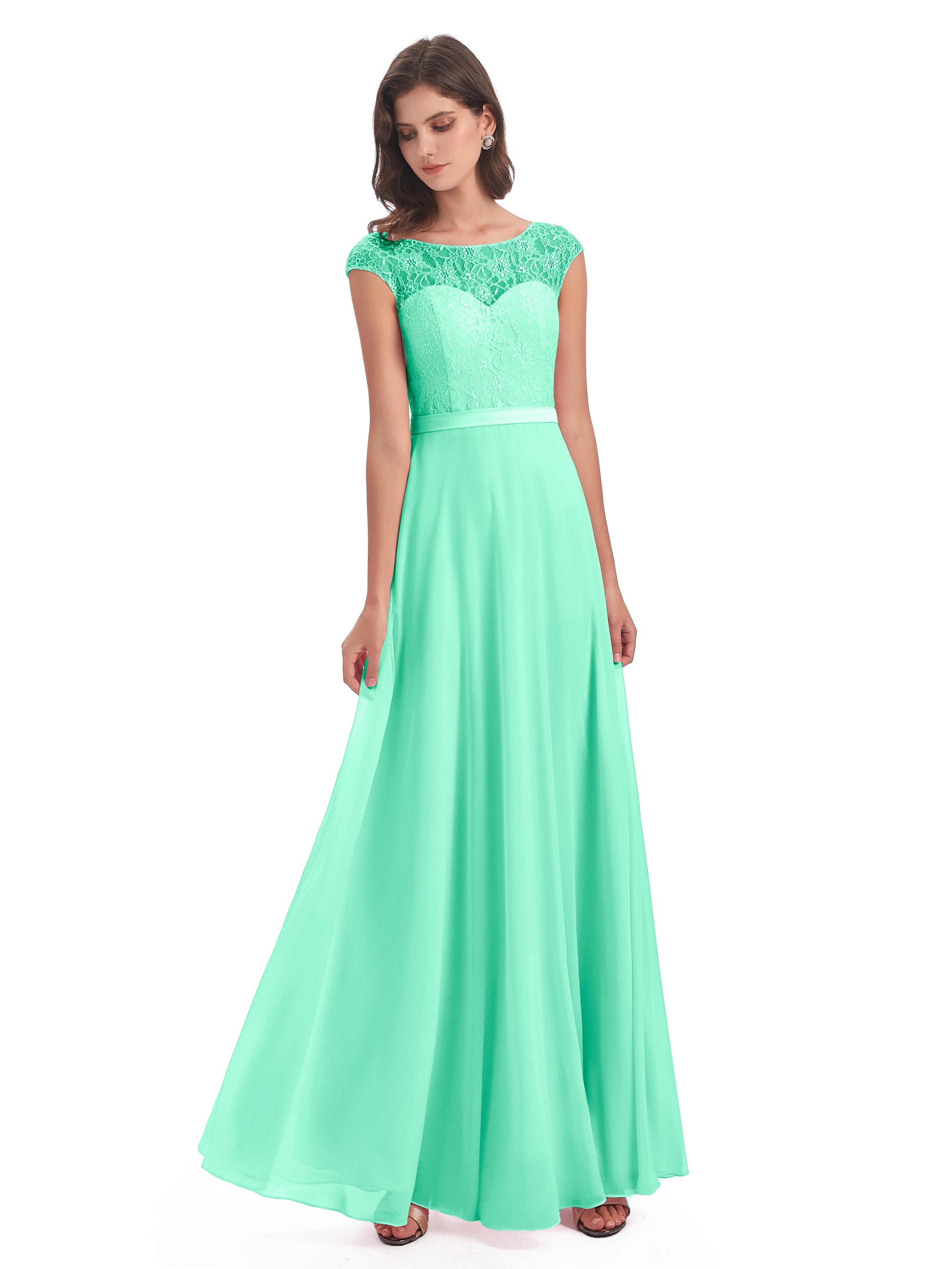 Treasure A-Linie Bodenlange Kappenärmel Spitze/Chiffon Lange Brautjungfernkleider