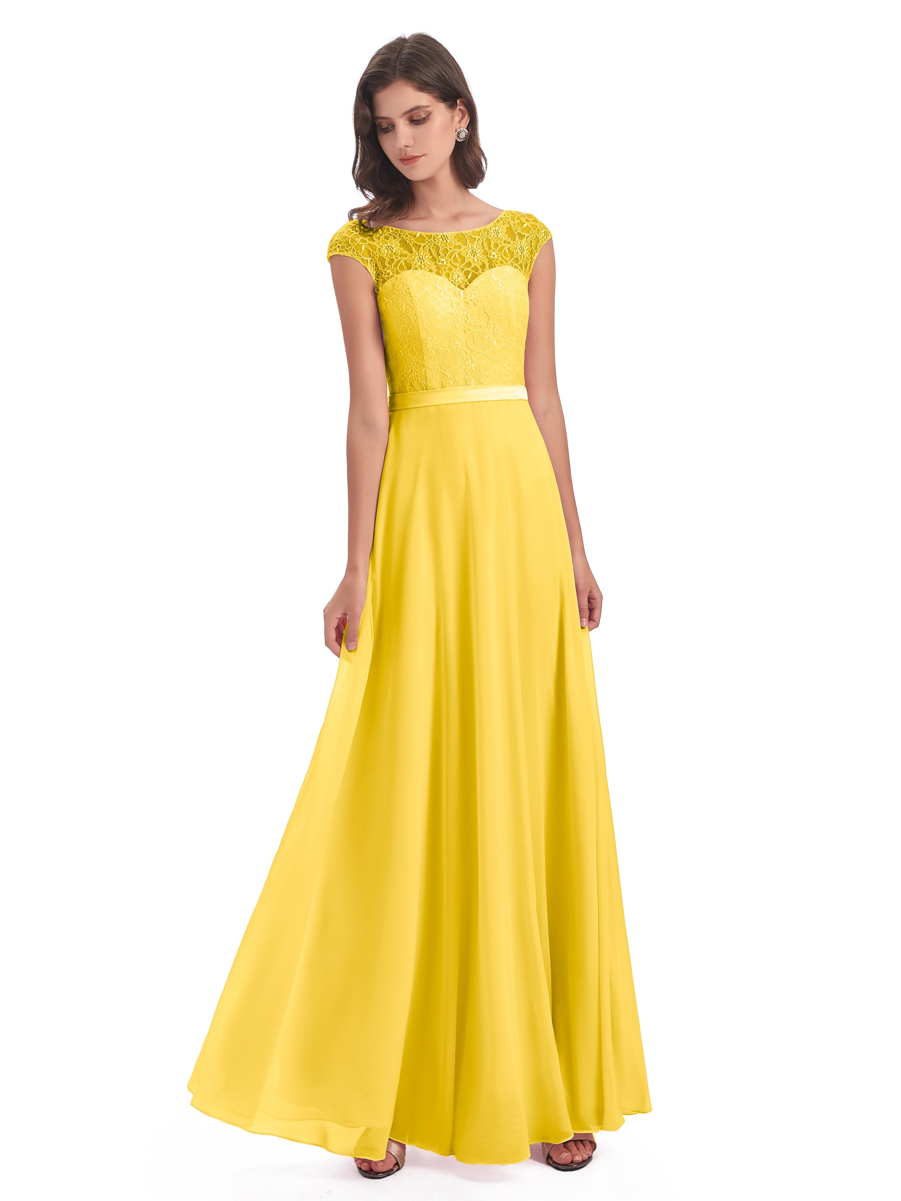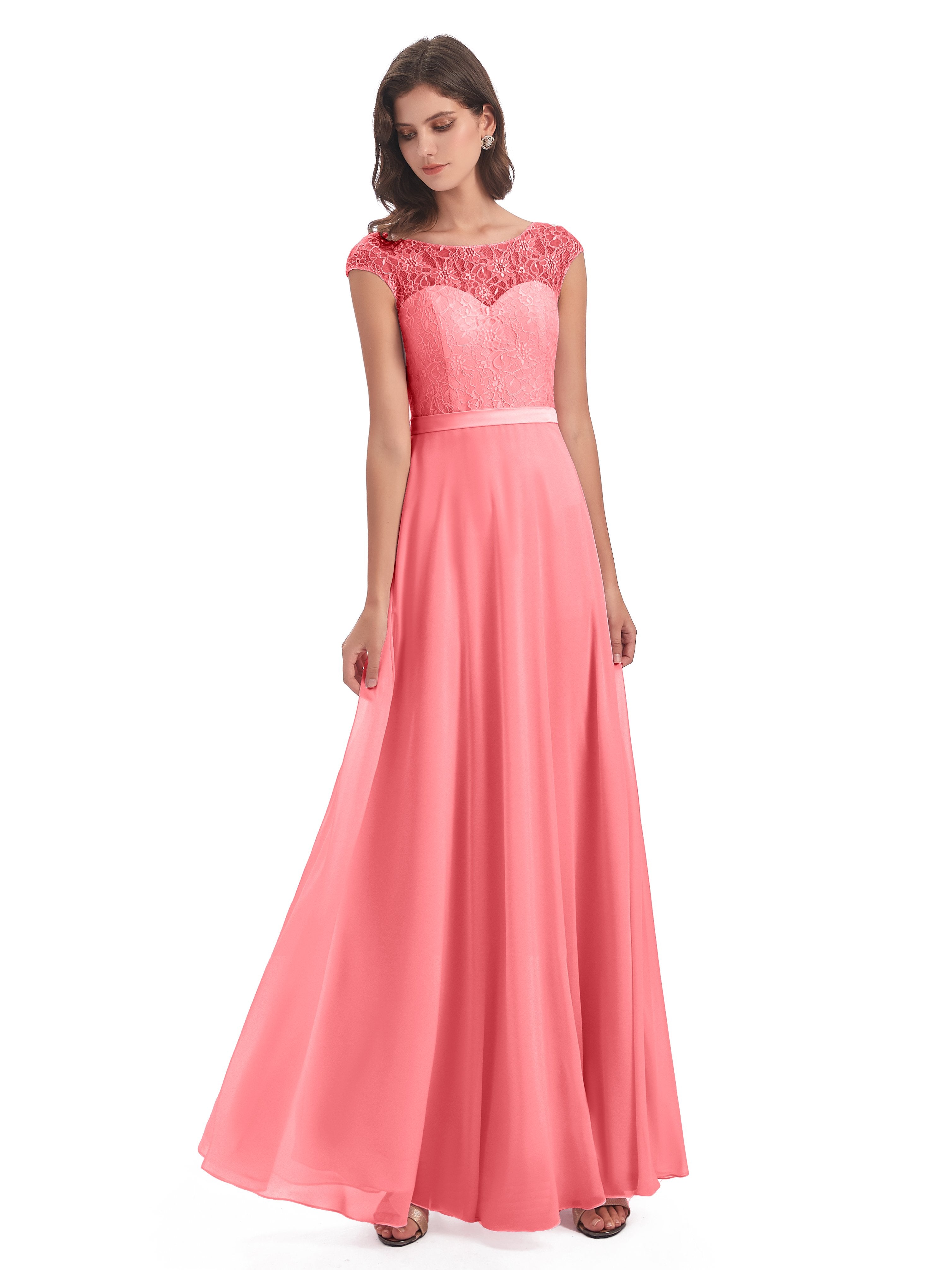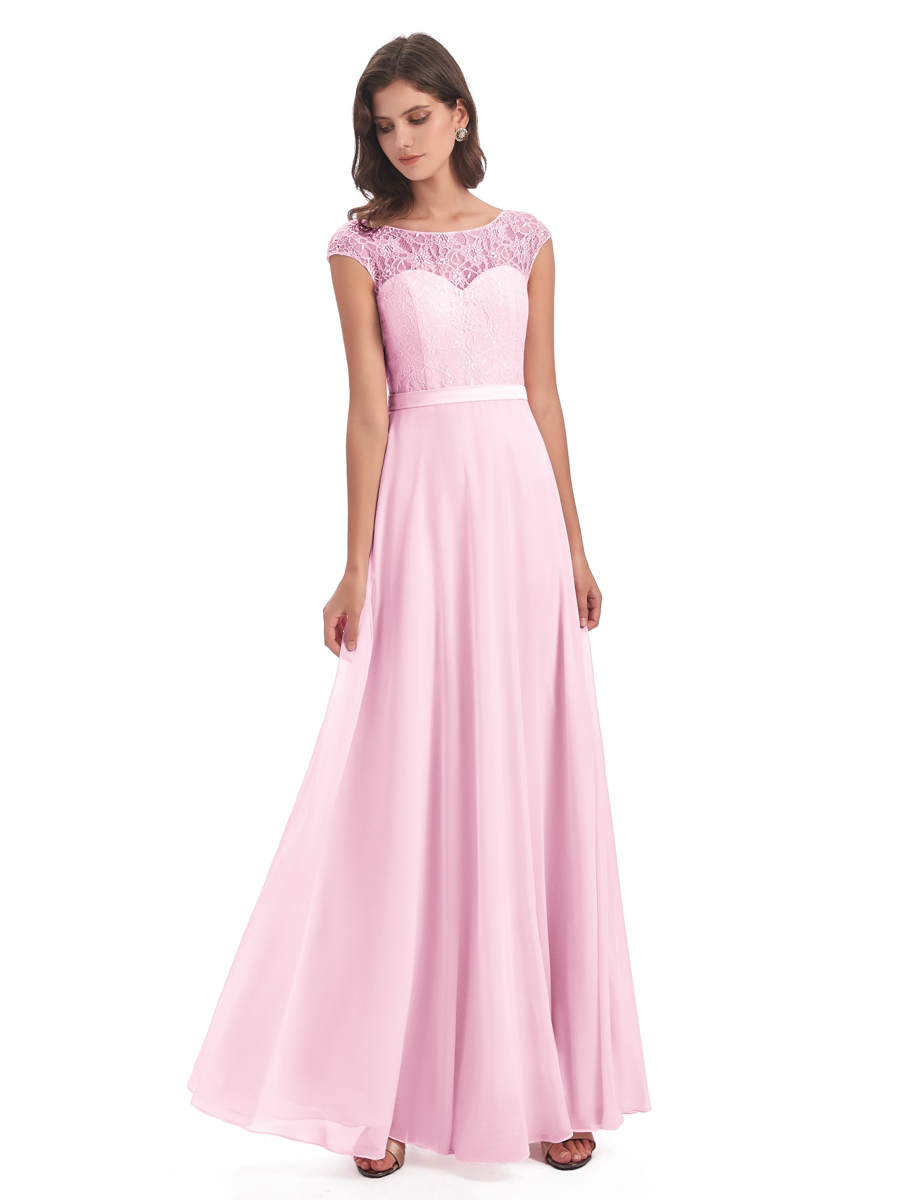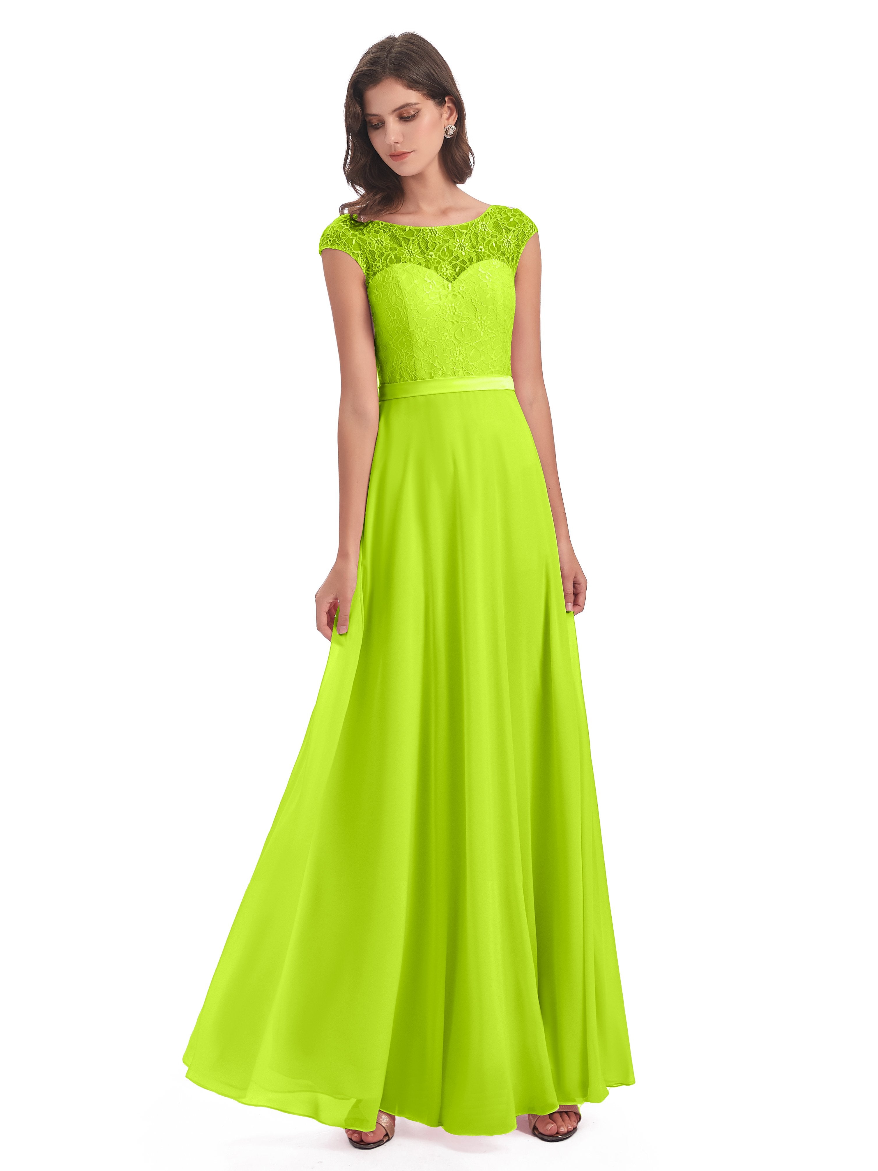 Treasure A-Linie Bodenlange Kappenärmel Spitze/Chiffon Lange Brautjungfernkleider