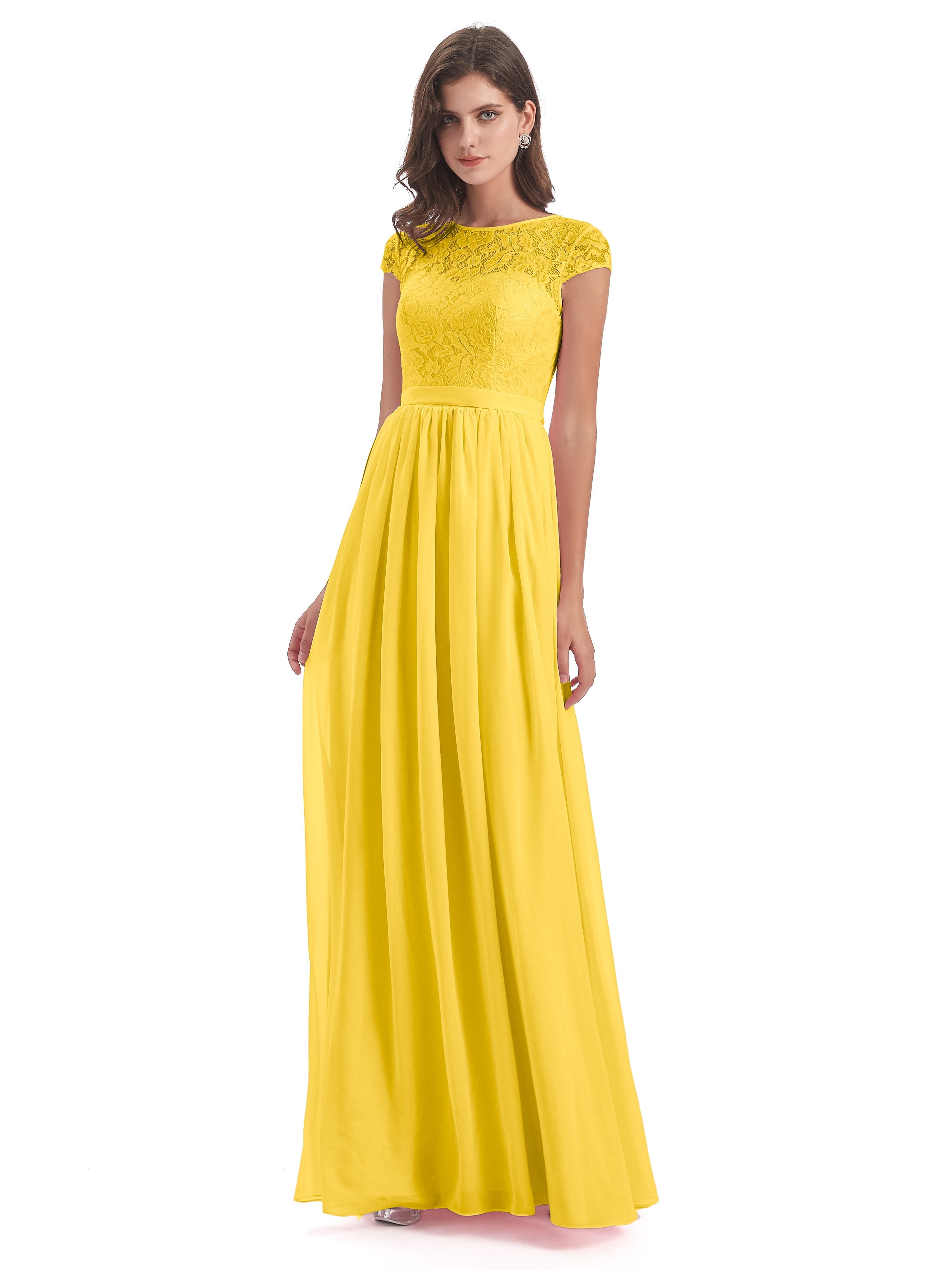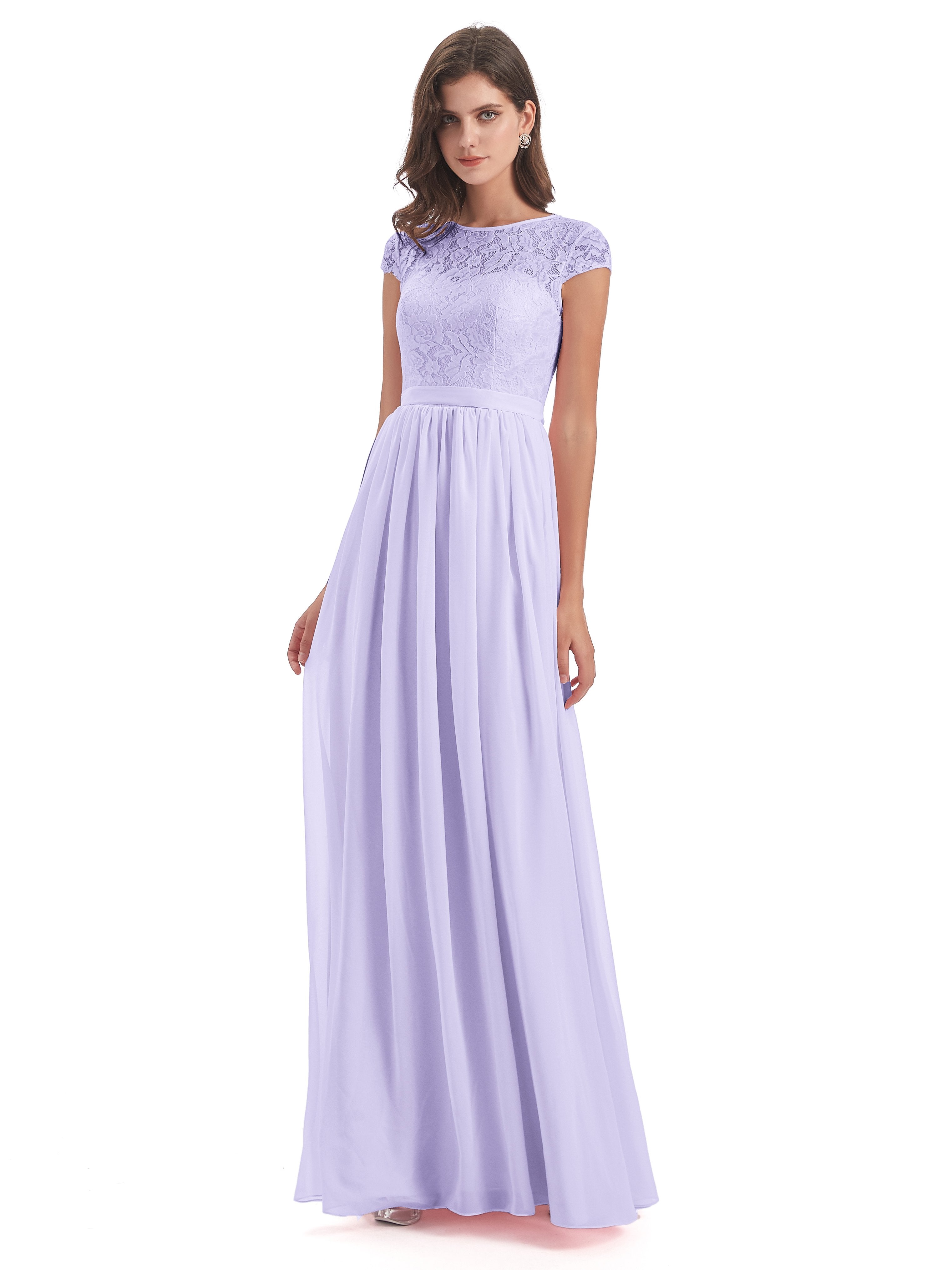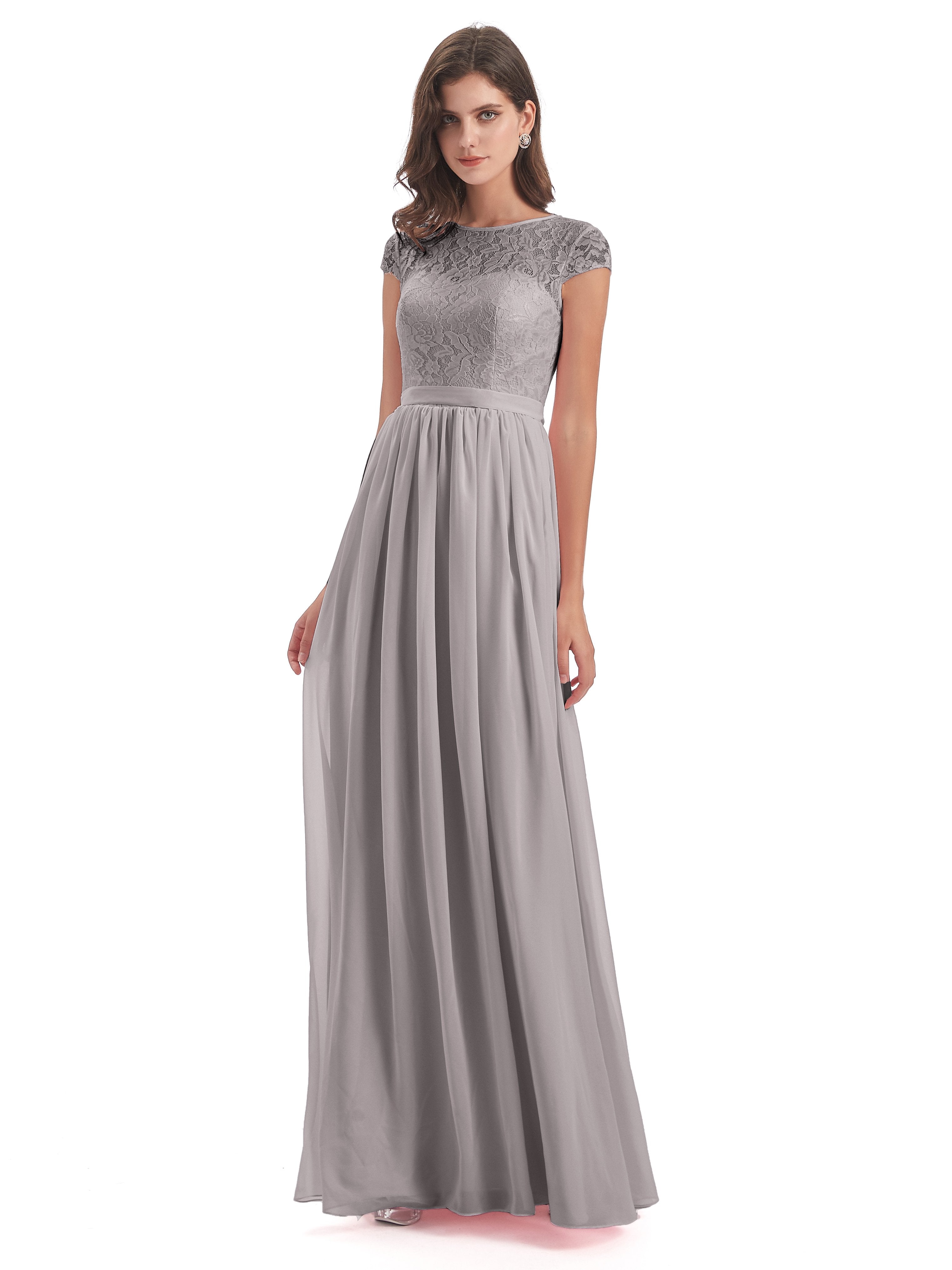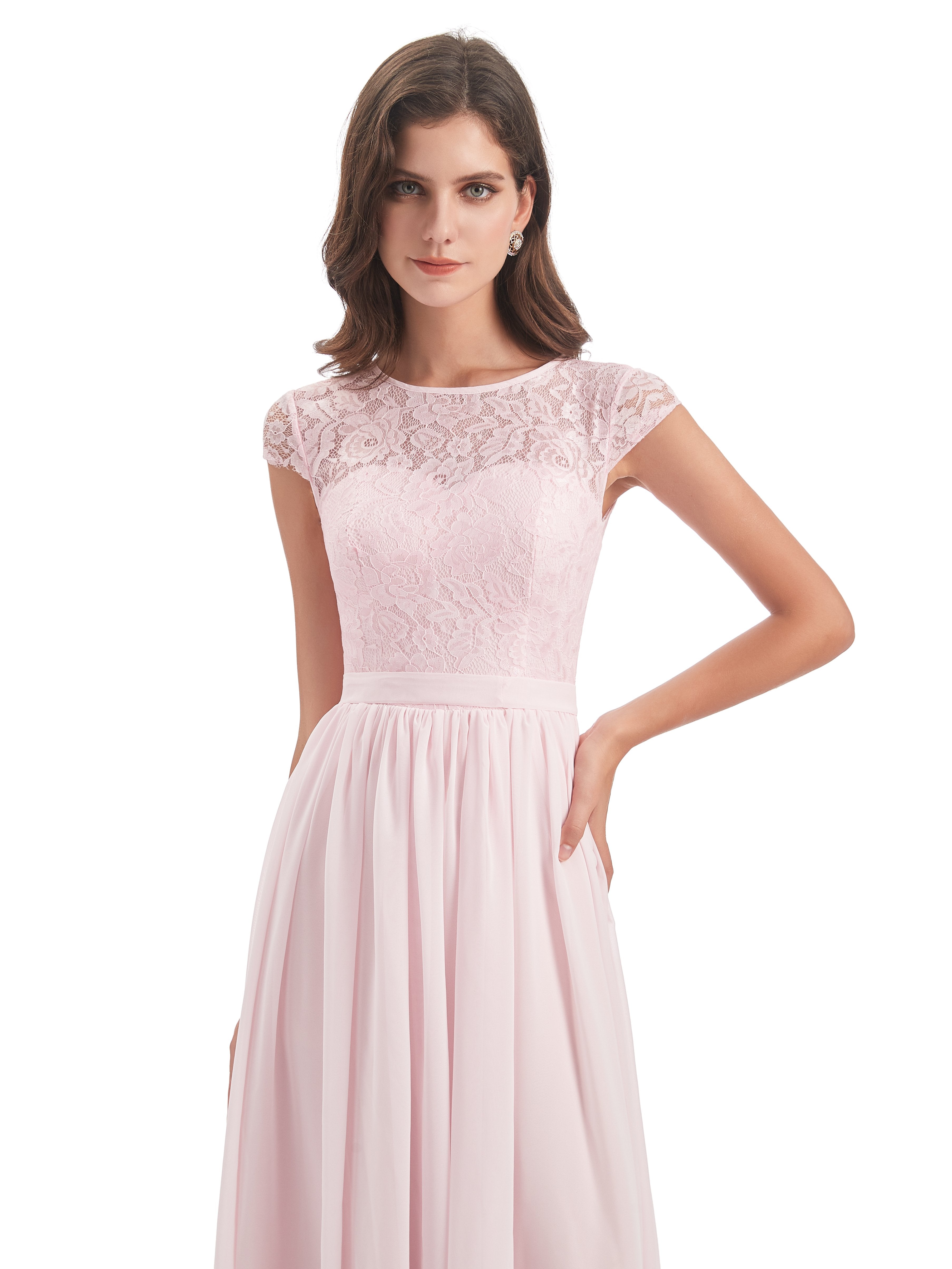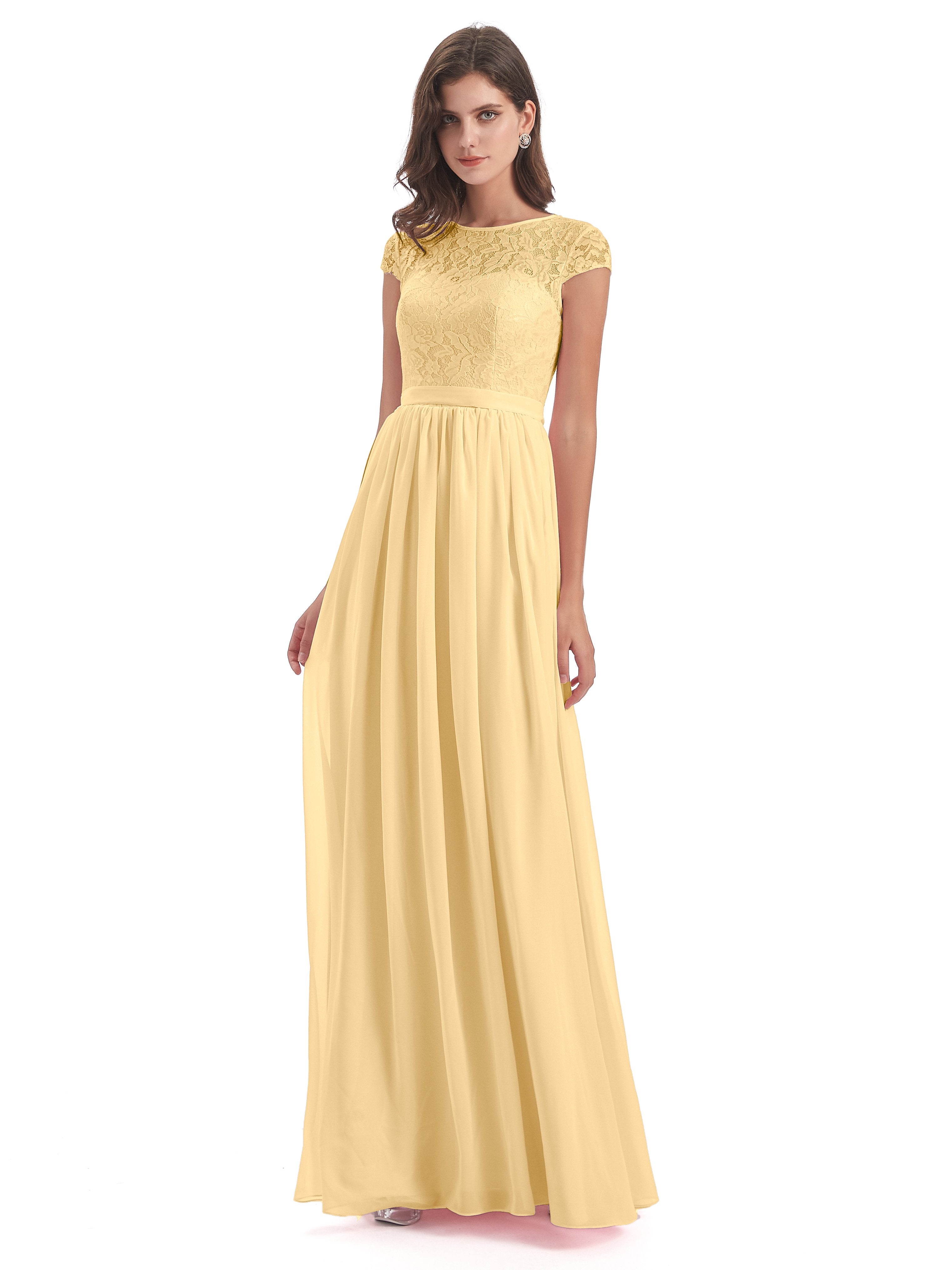 Yamileth A-Linie Bodenlange Kappenärmel Illusion Ausschnitt Spitze/Chiffon Lange Brautjungfernkleider