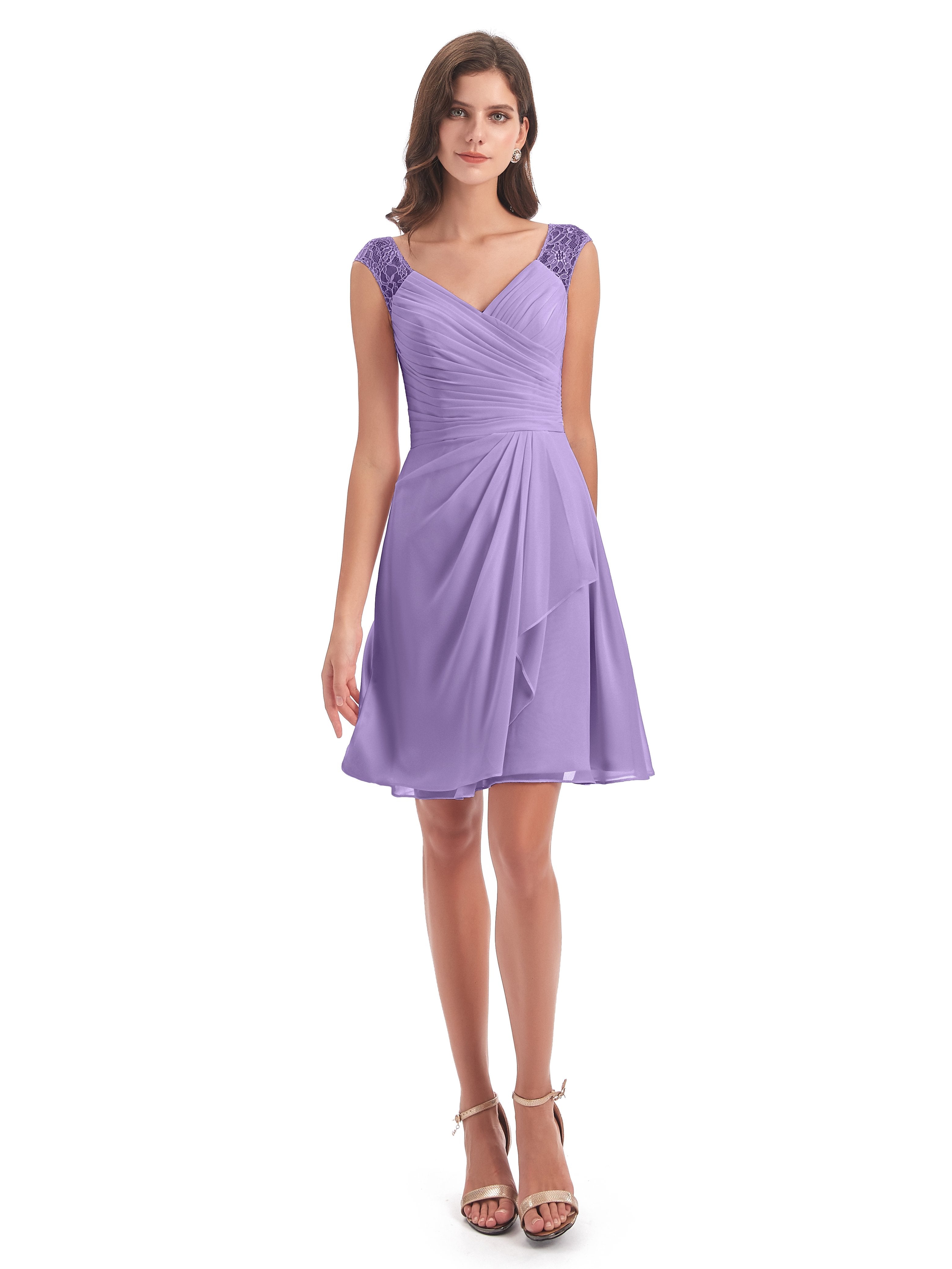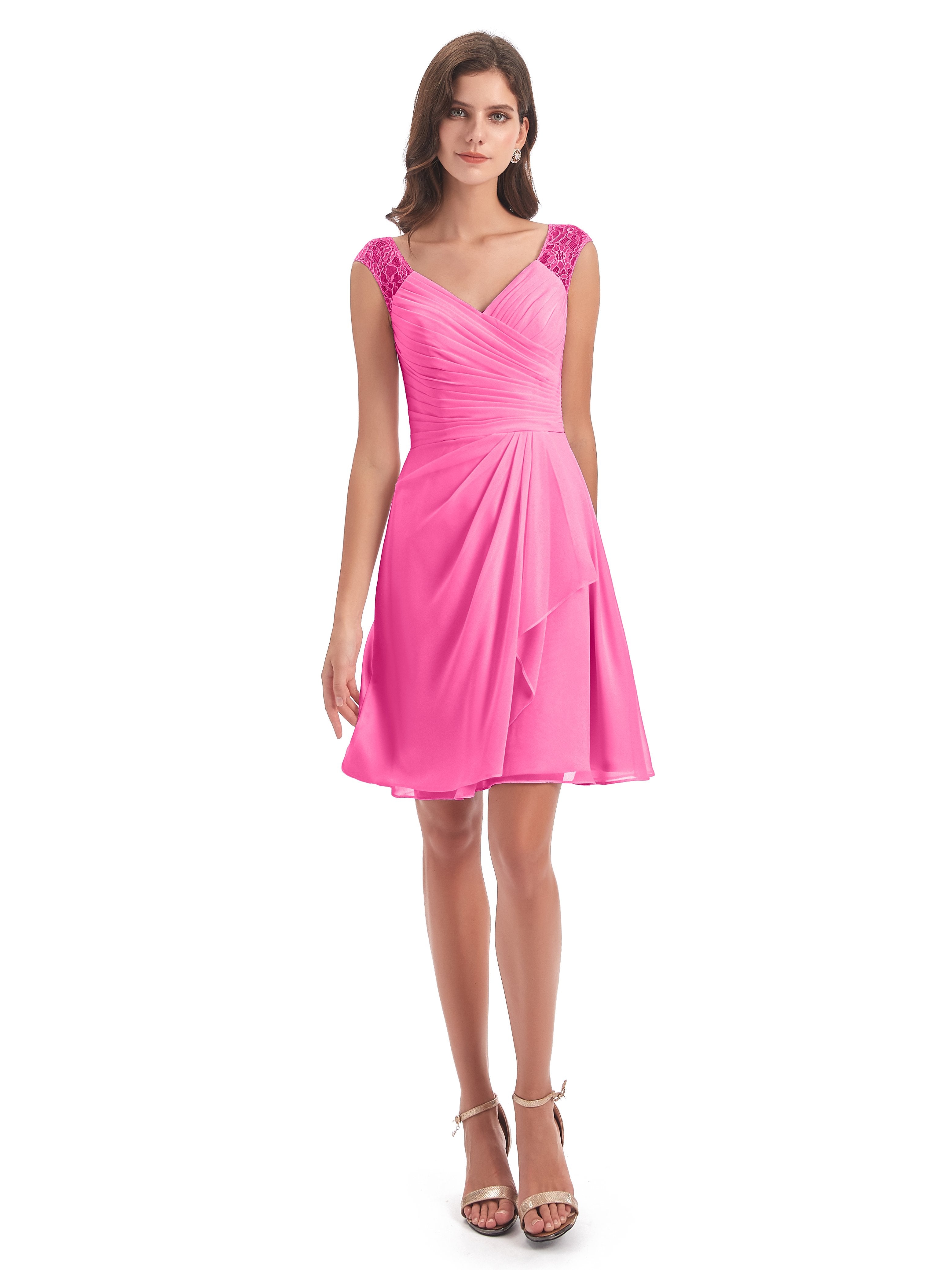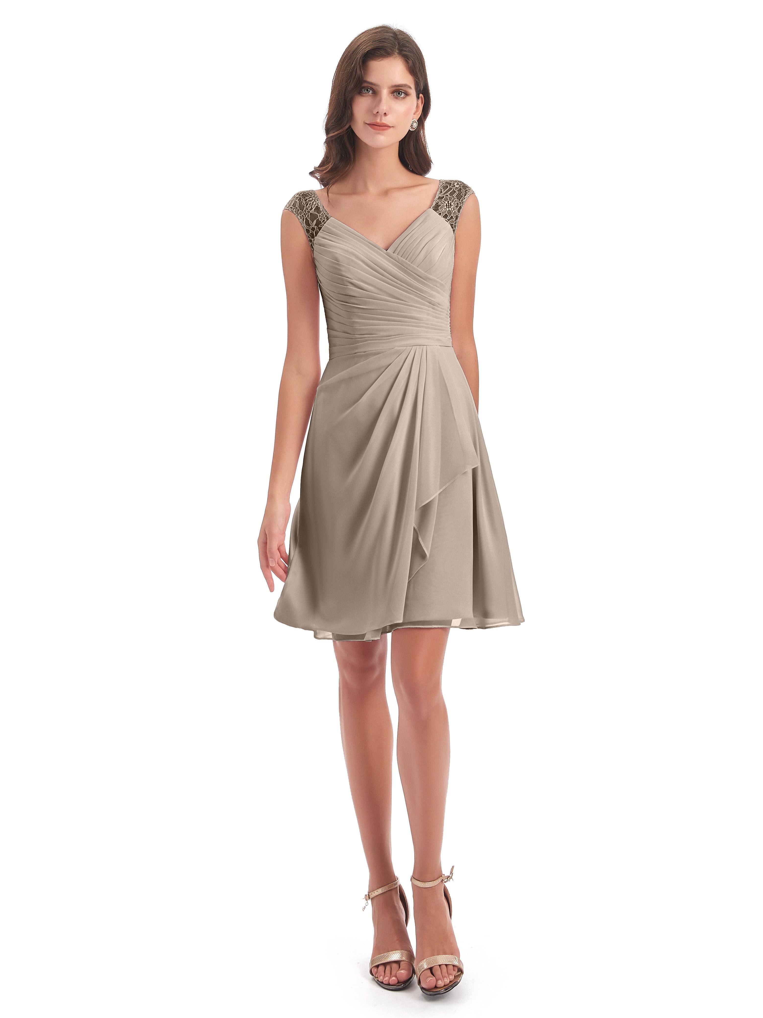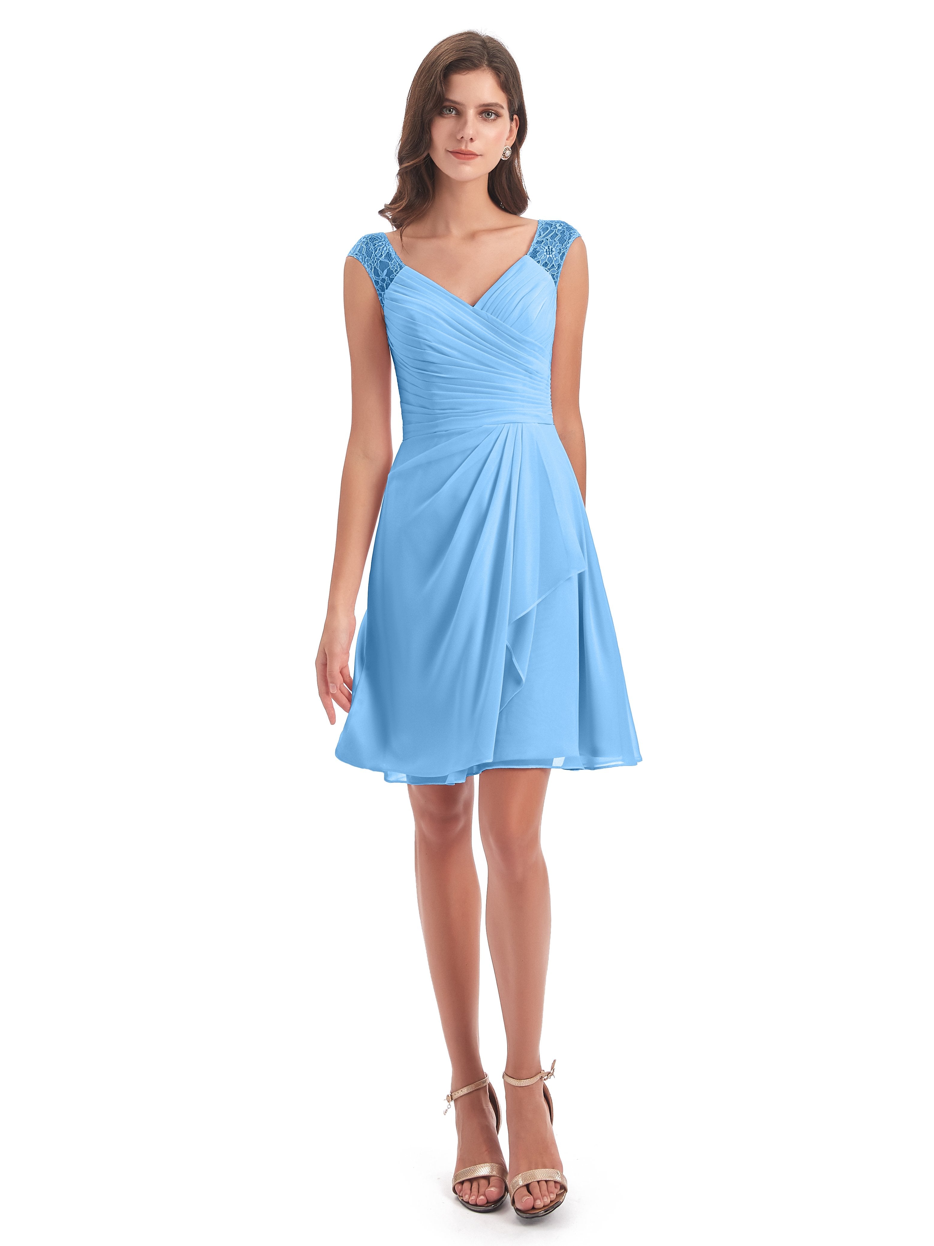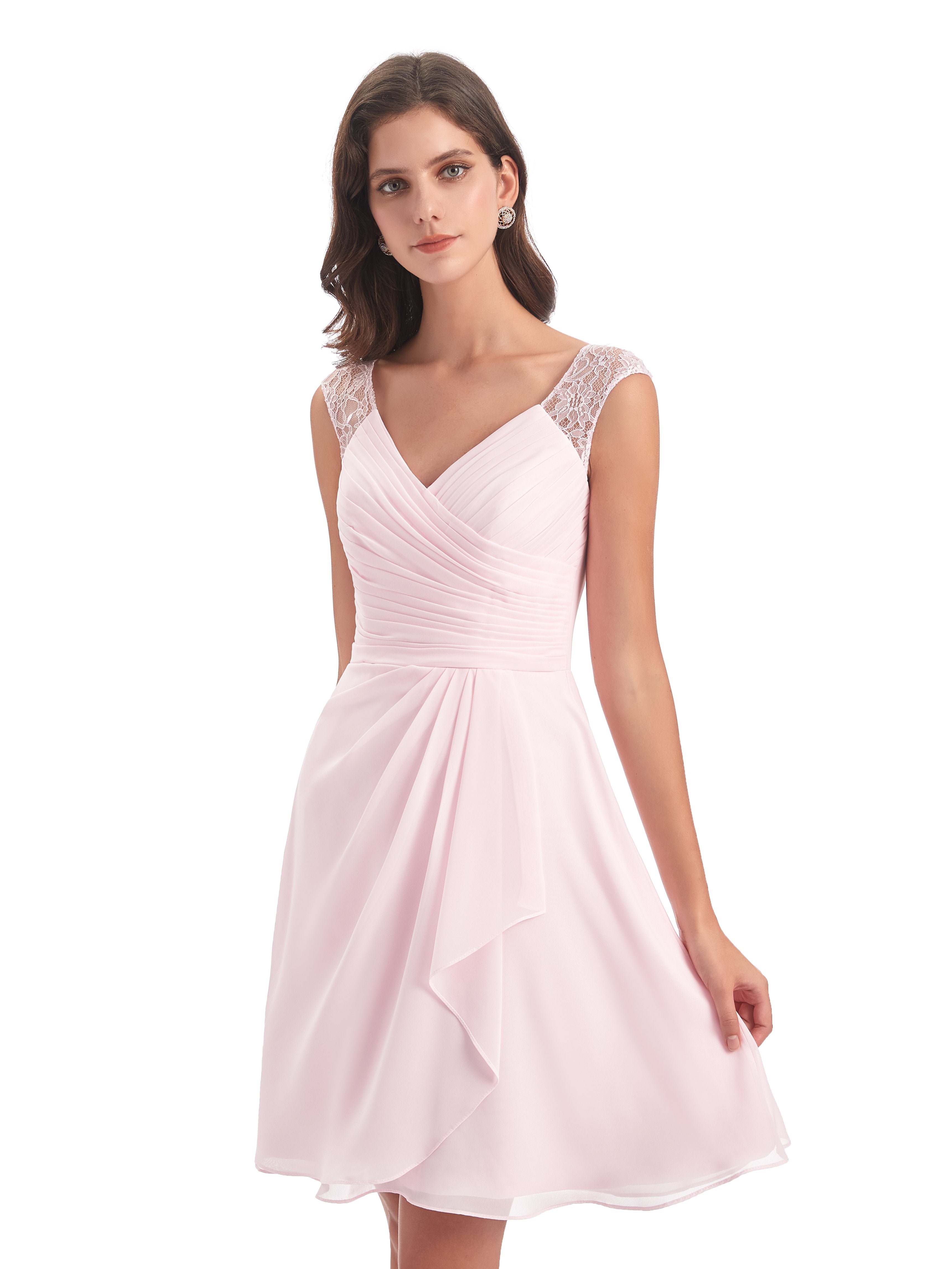 Zendaya A-Linie Knielange V-Ausschnitt Spitze/Chiffon Kurze Brautjungfernkleider