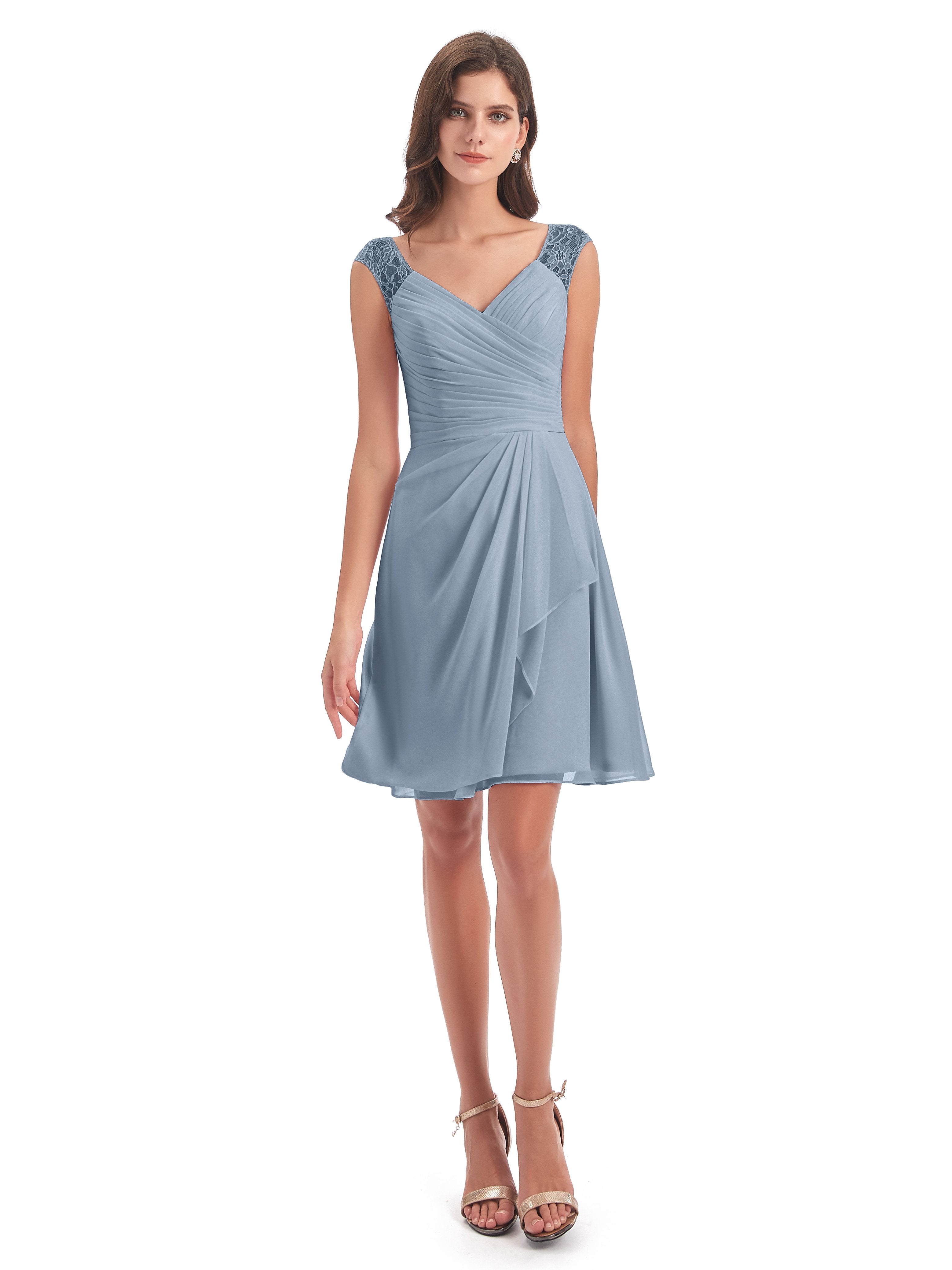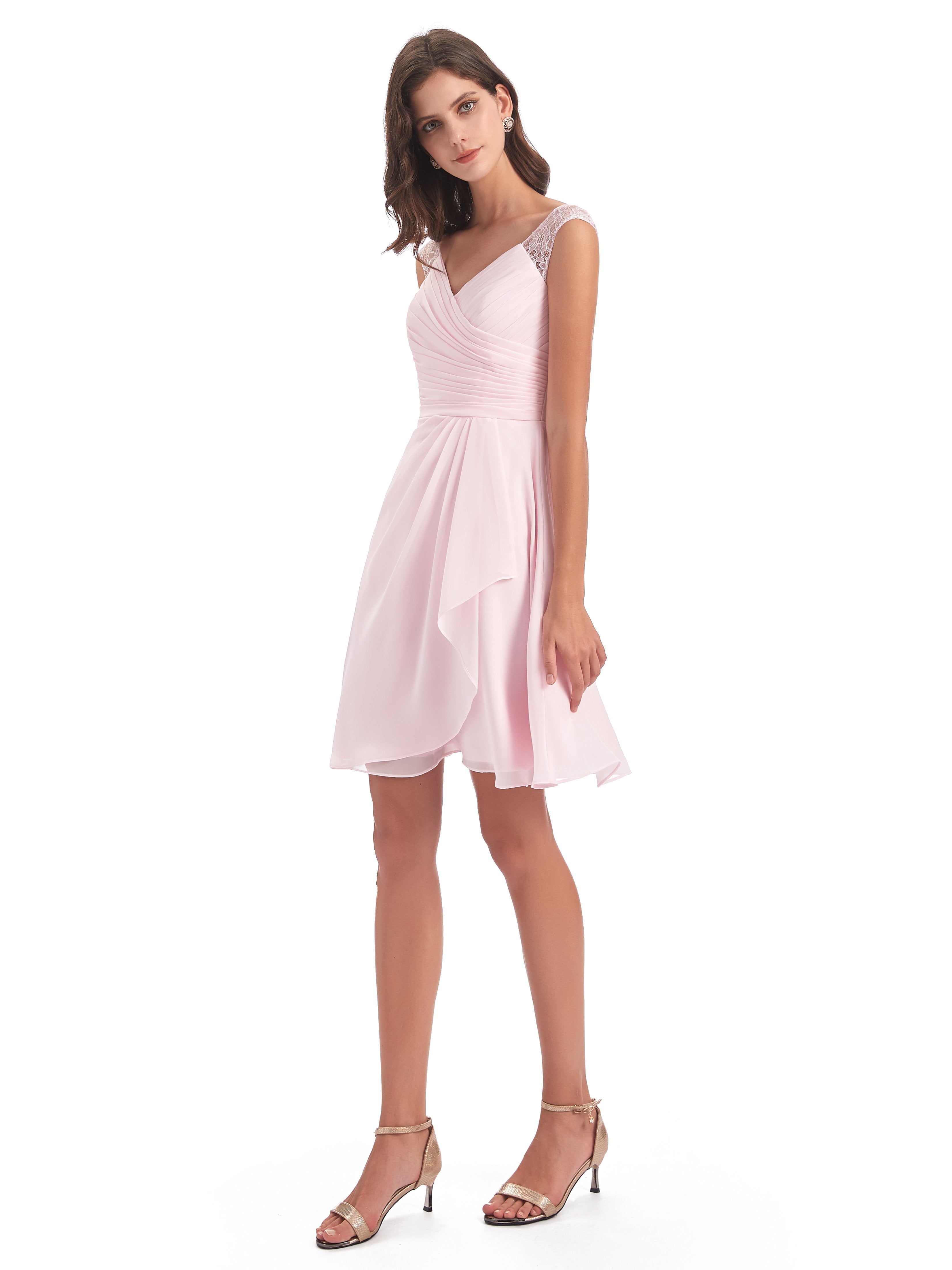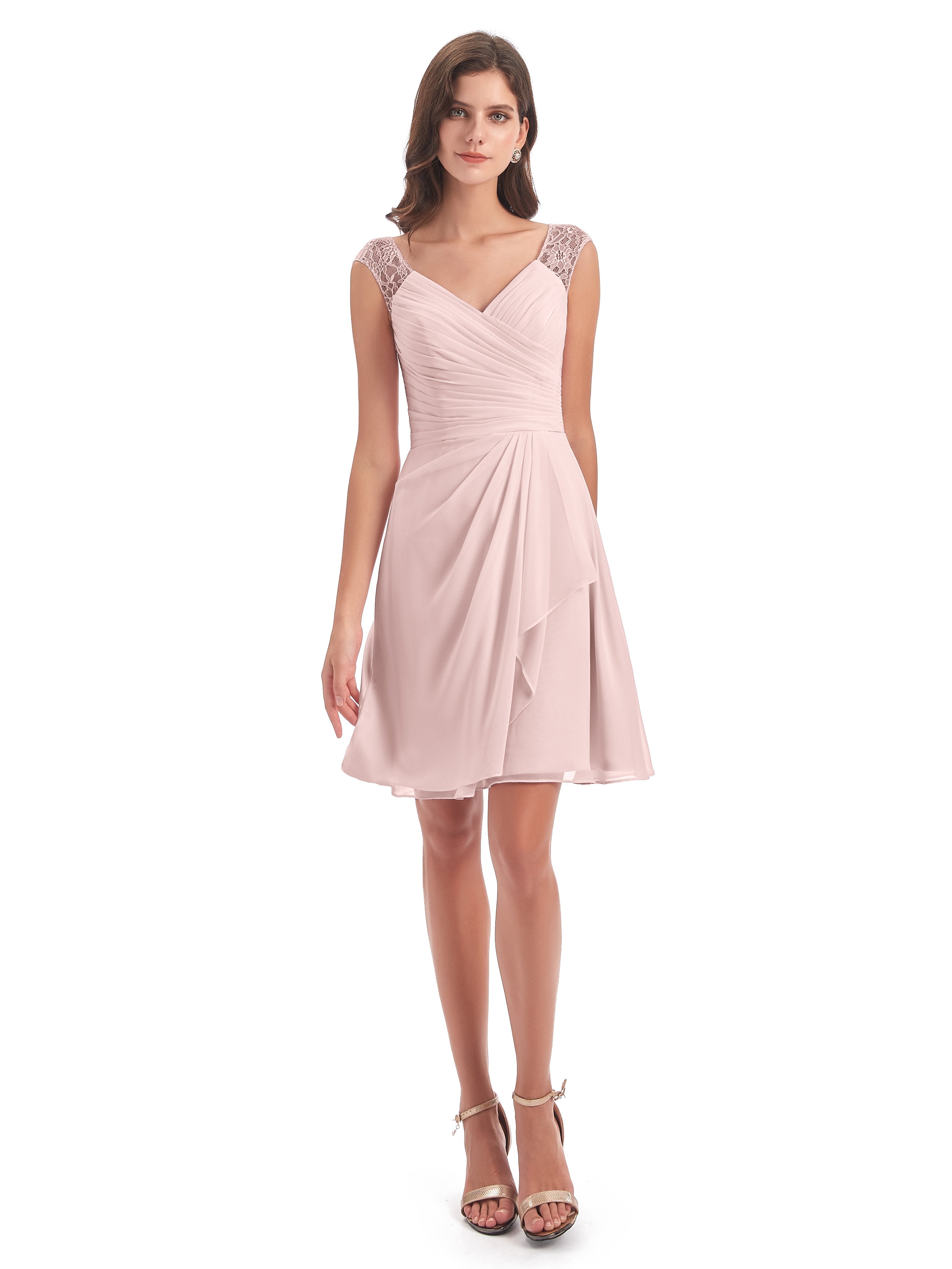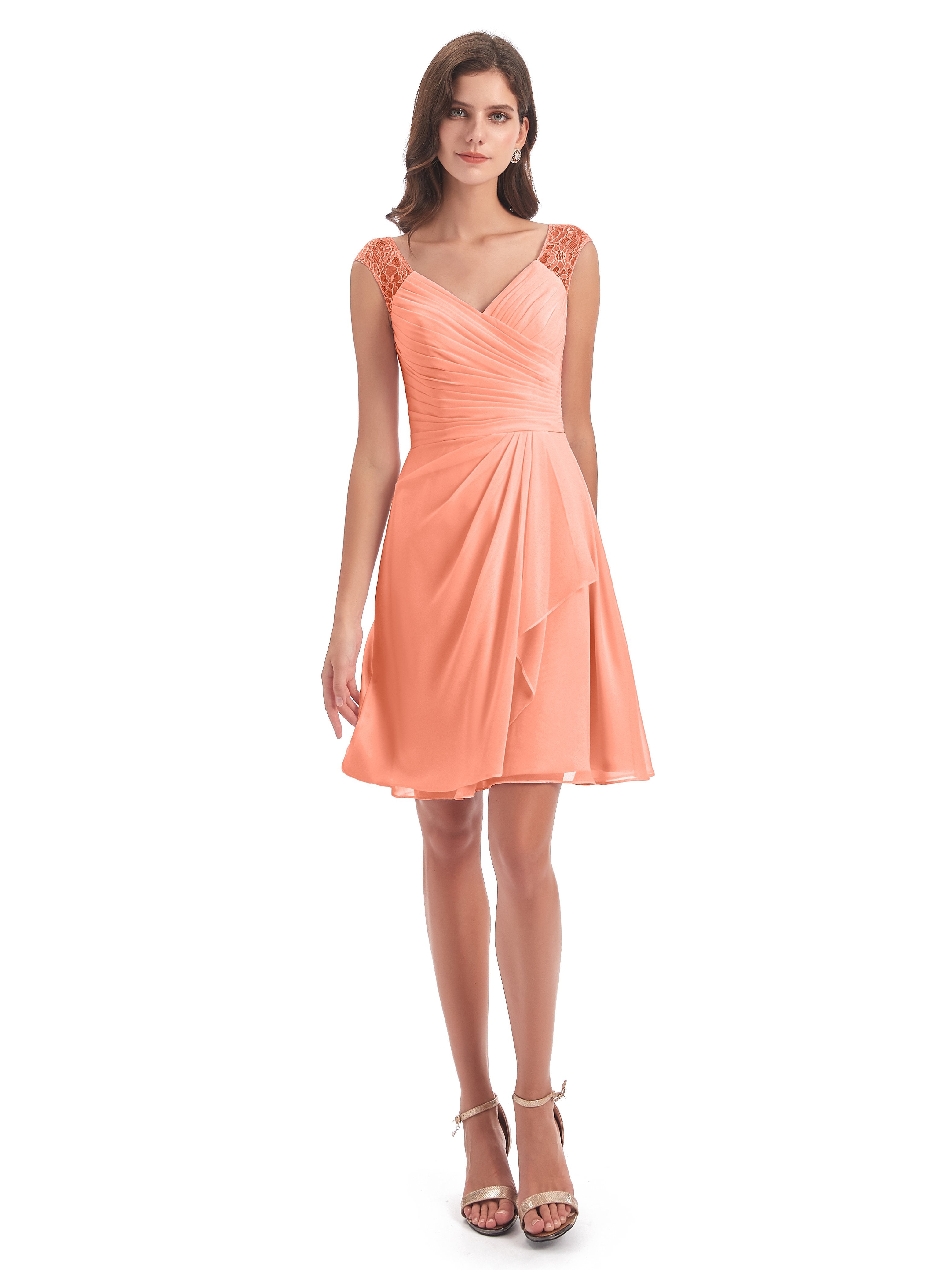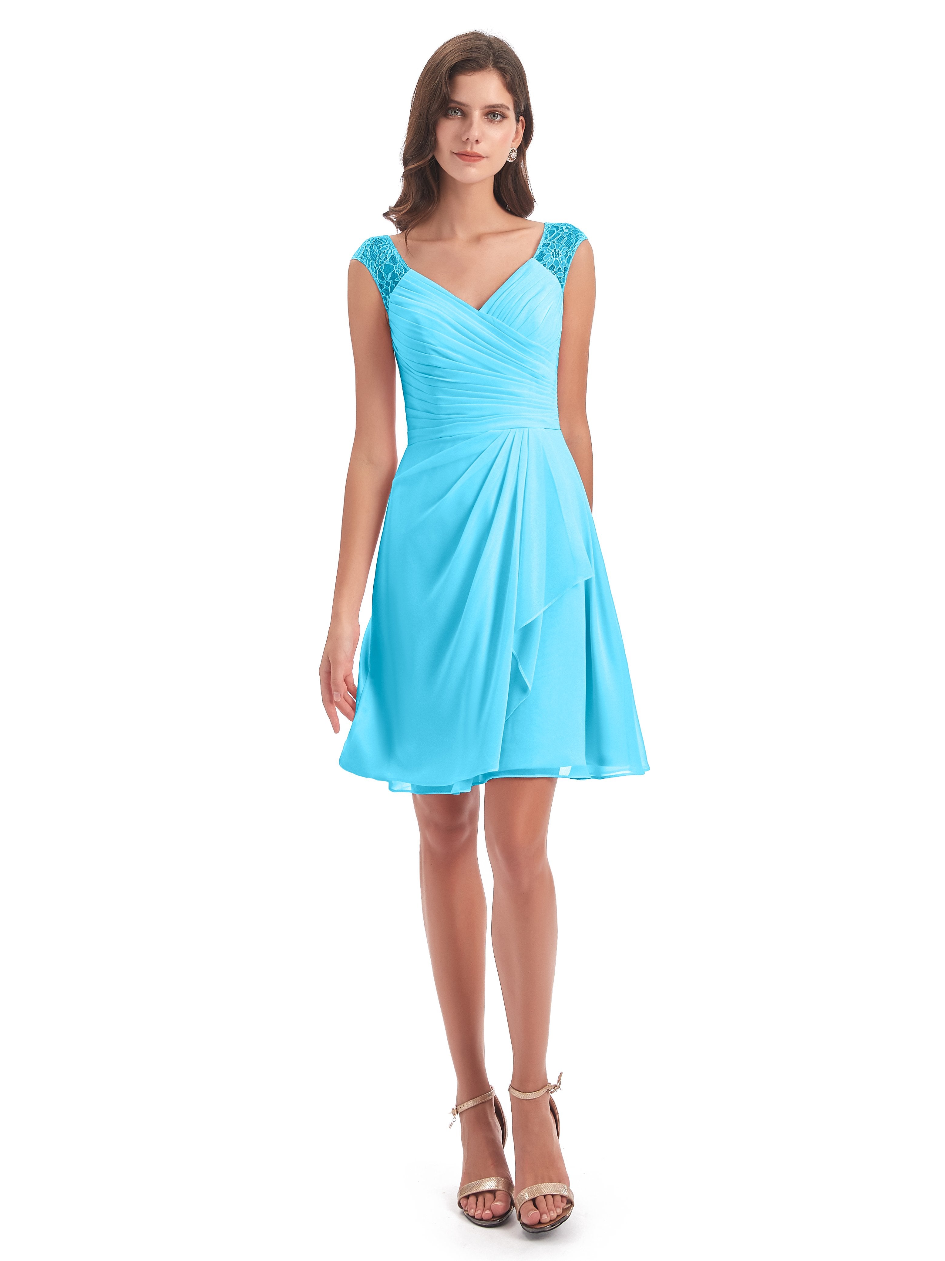 Zendaya A-Linie Knielange V-Ausschnitt Spitze/Chiffon Kurze Brautjungfernkleider