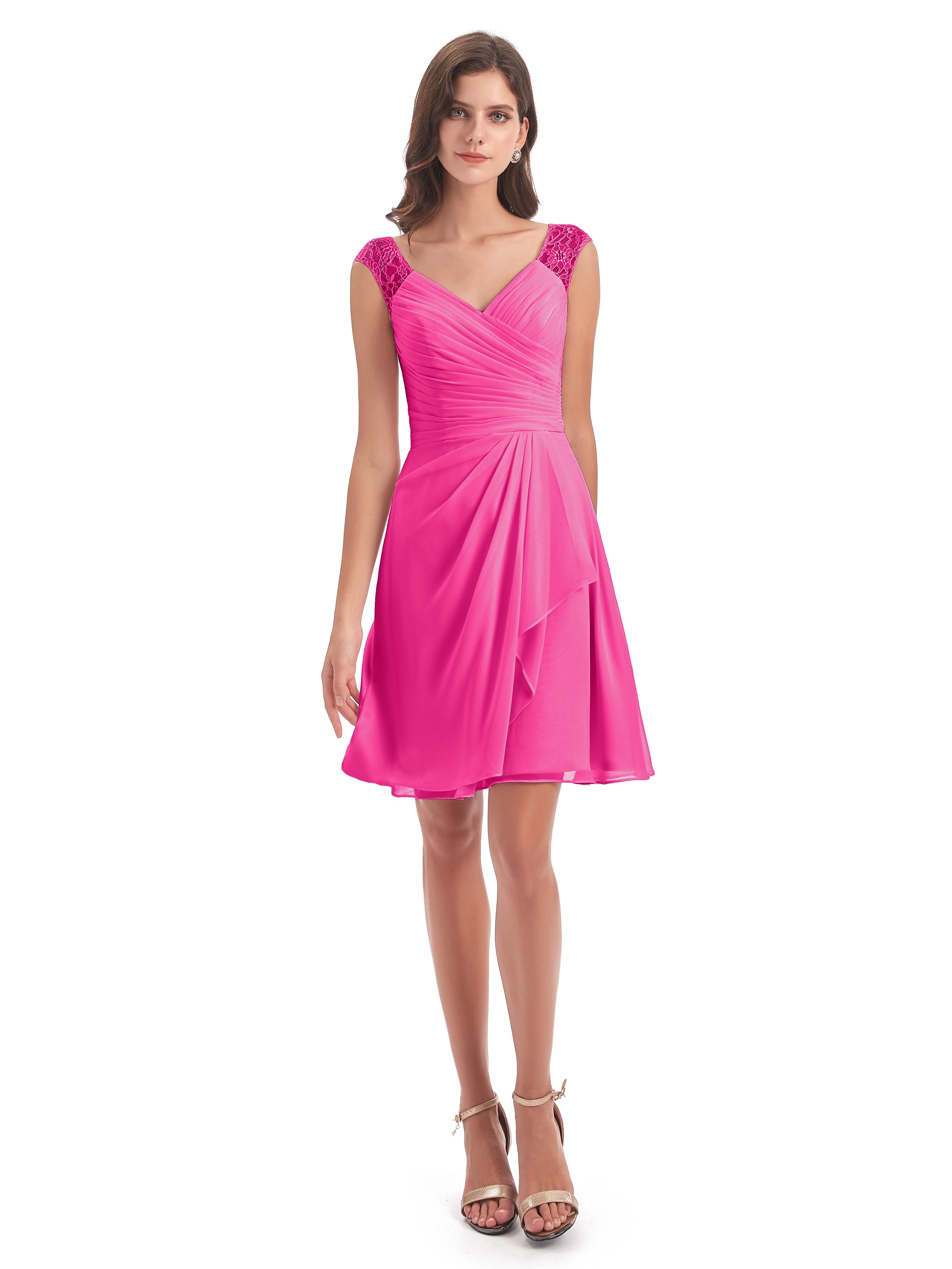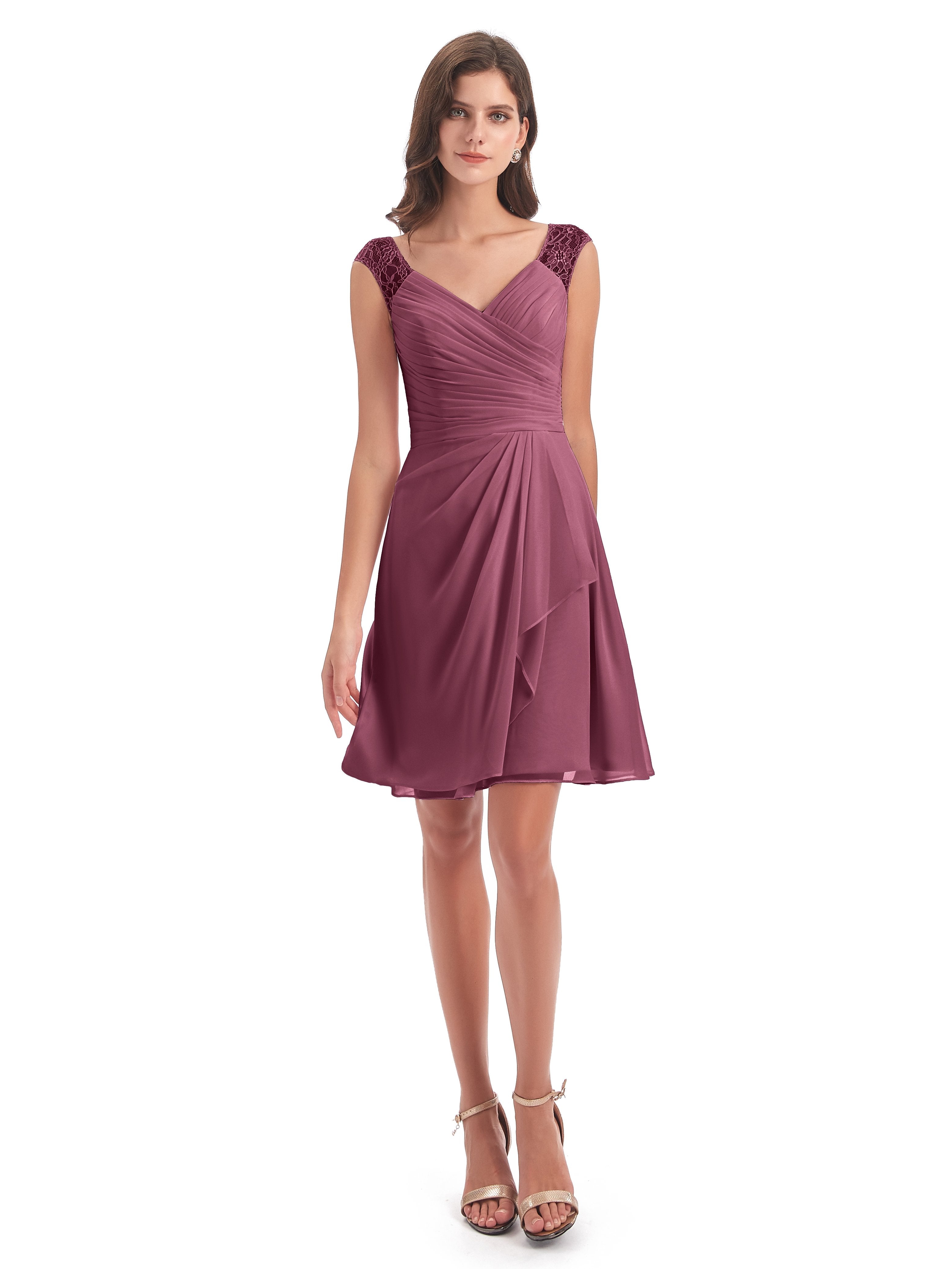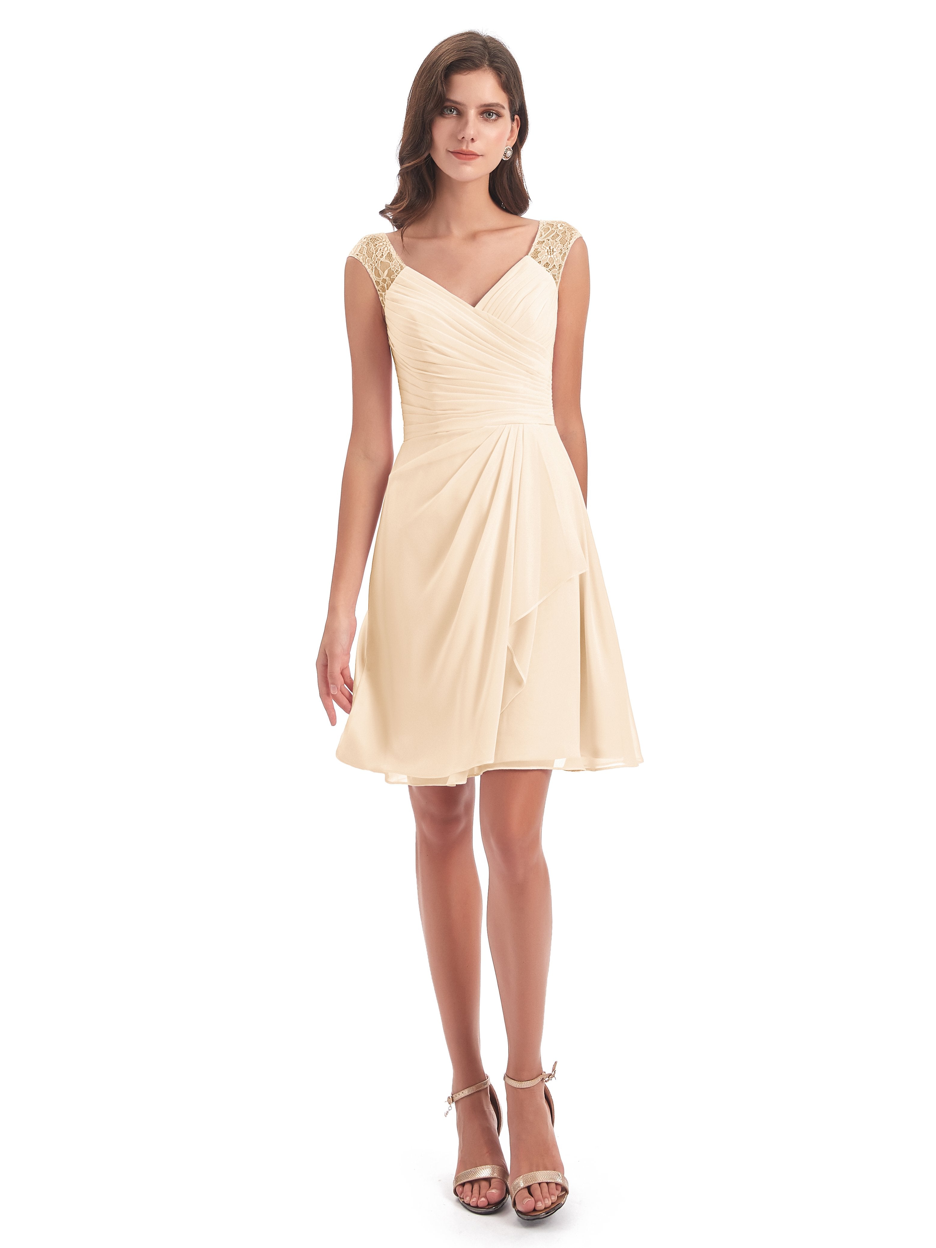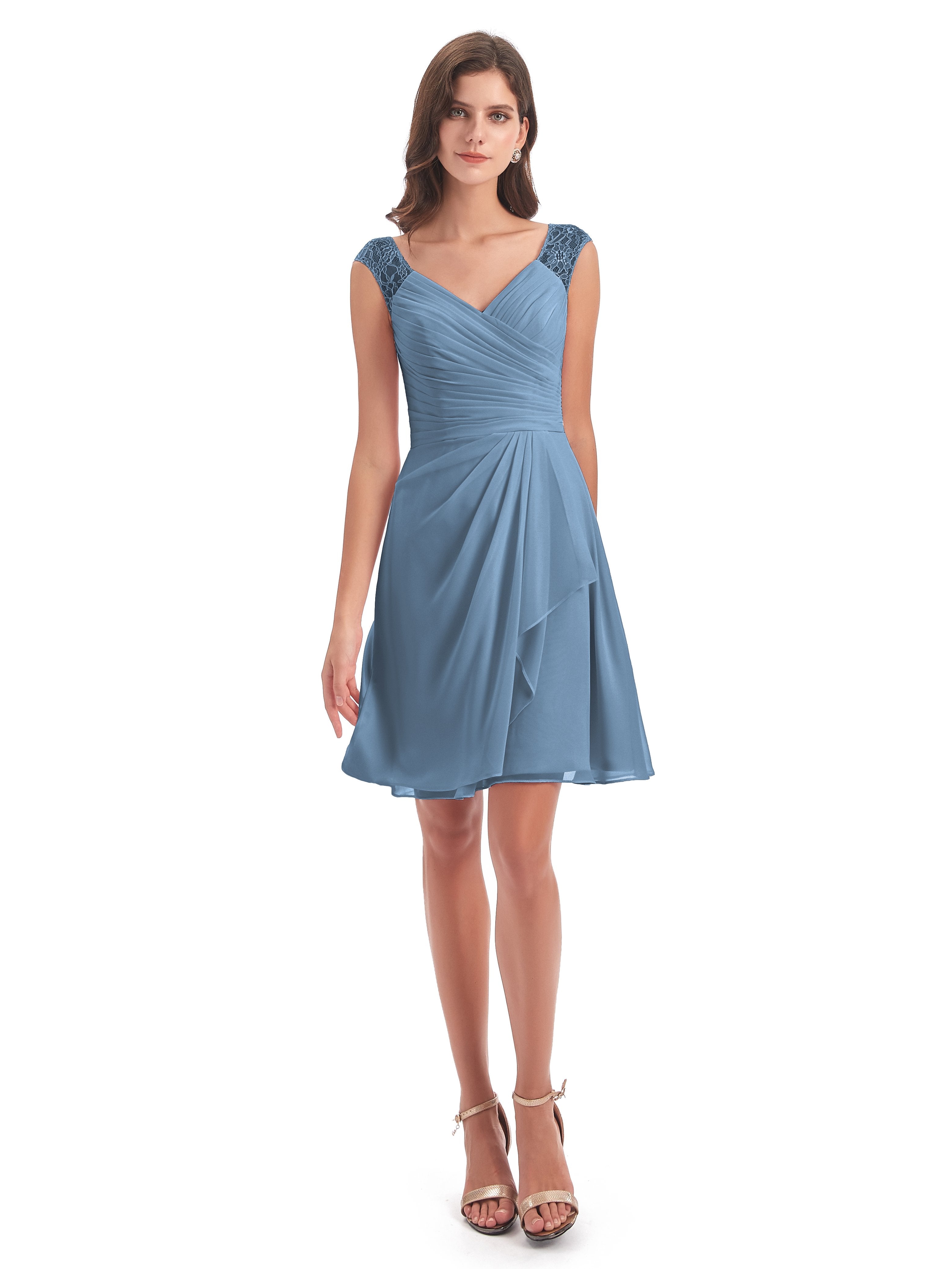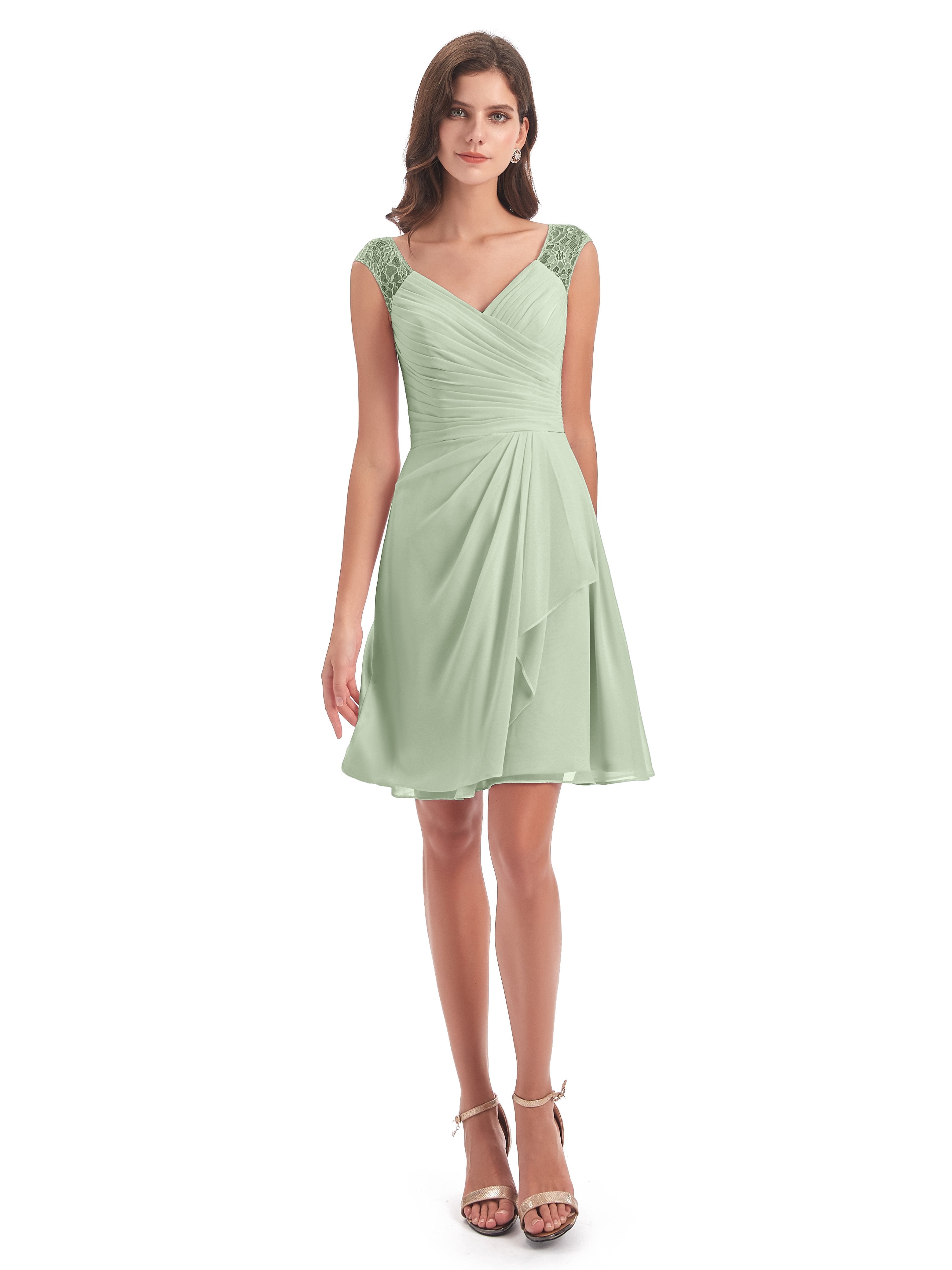 Zendaya A-Linie Knielange V-Ausschnitt Spitze/Chiffon Kurze Brautjungfernkleider