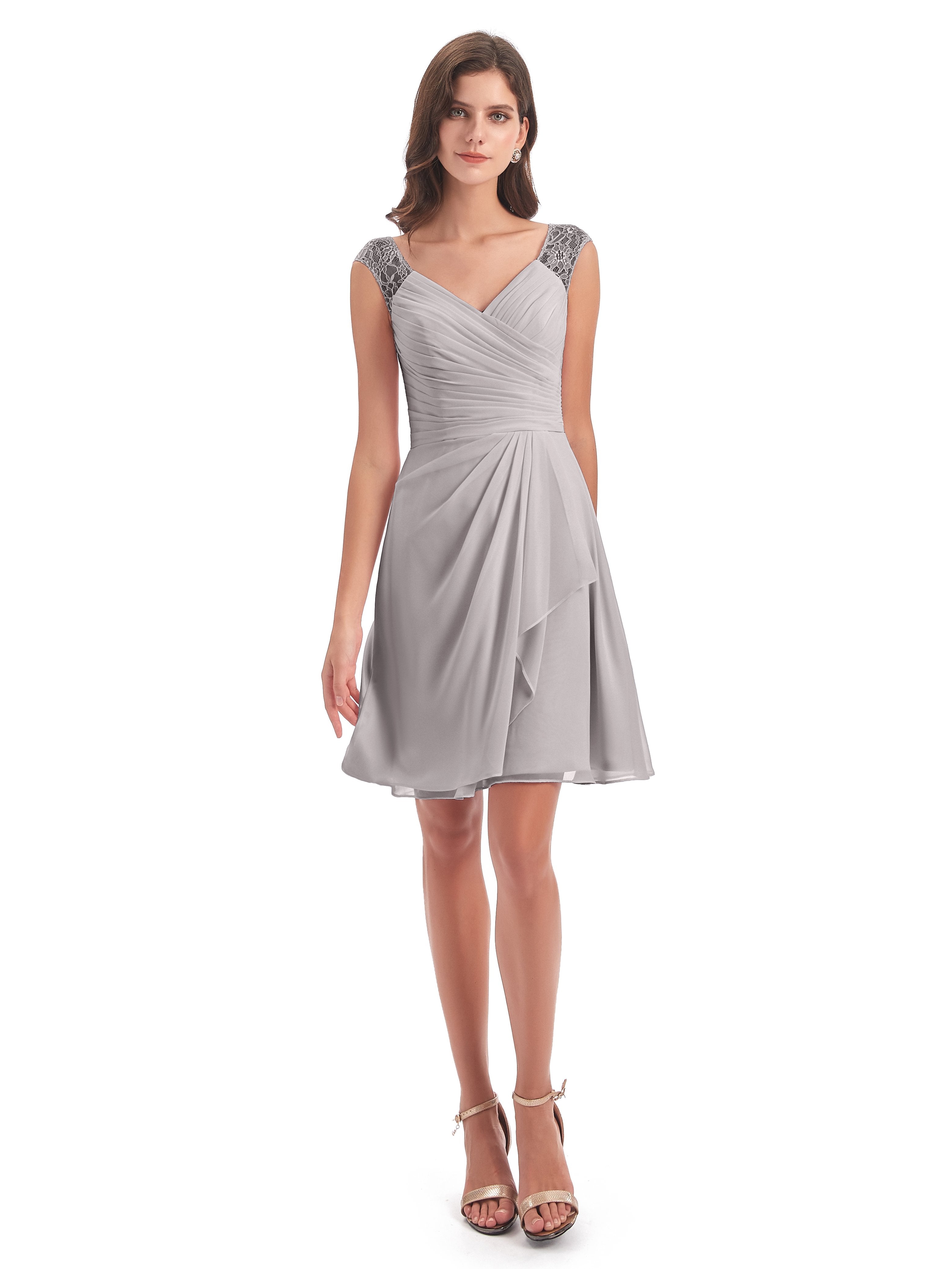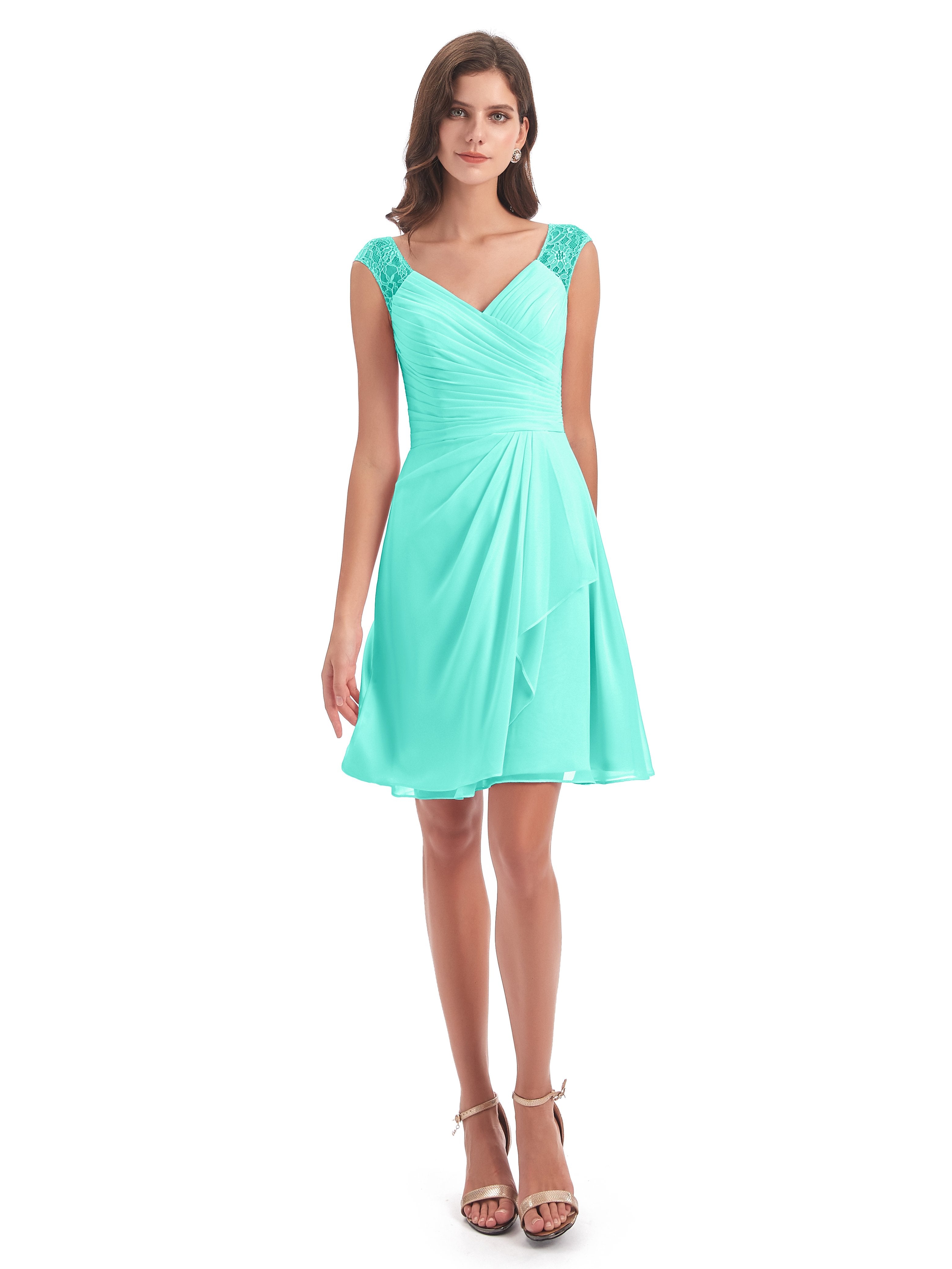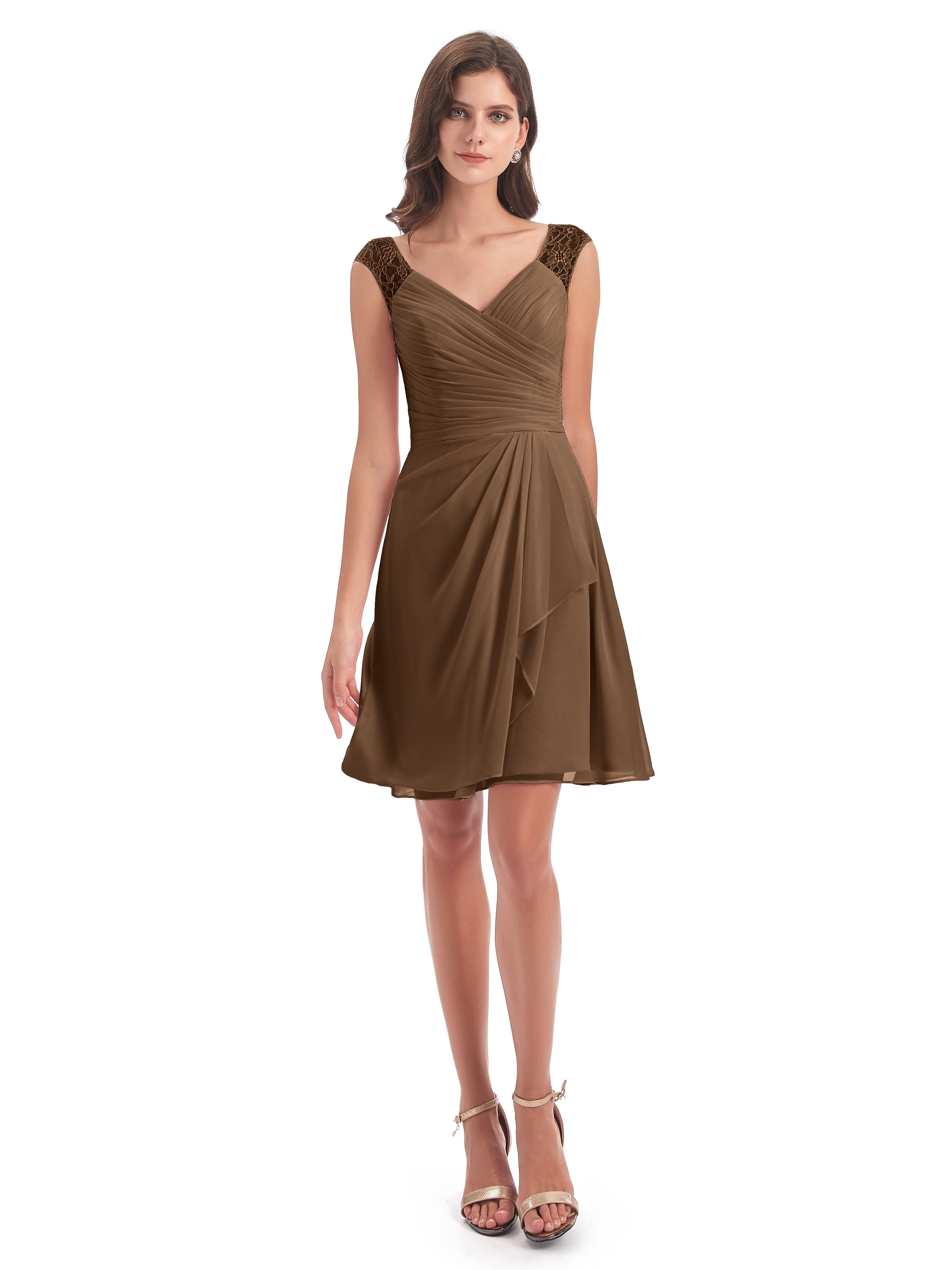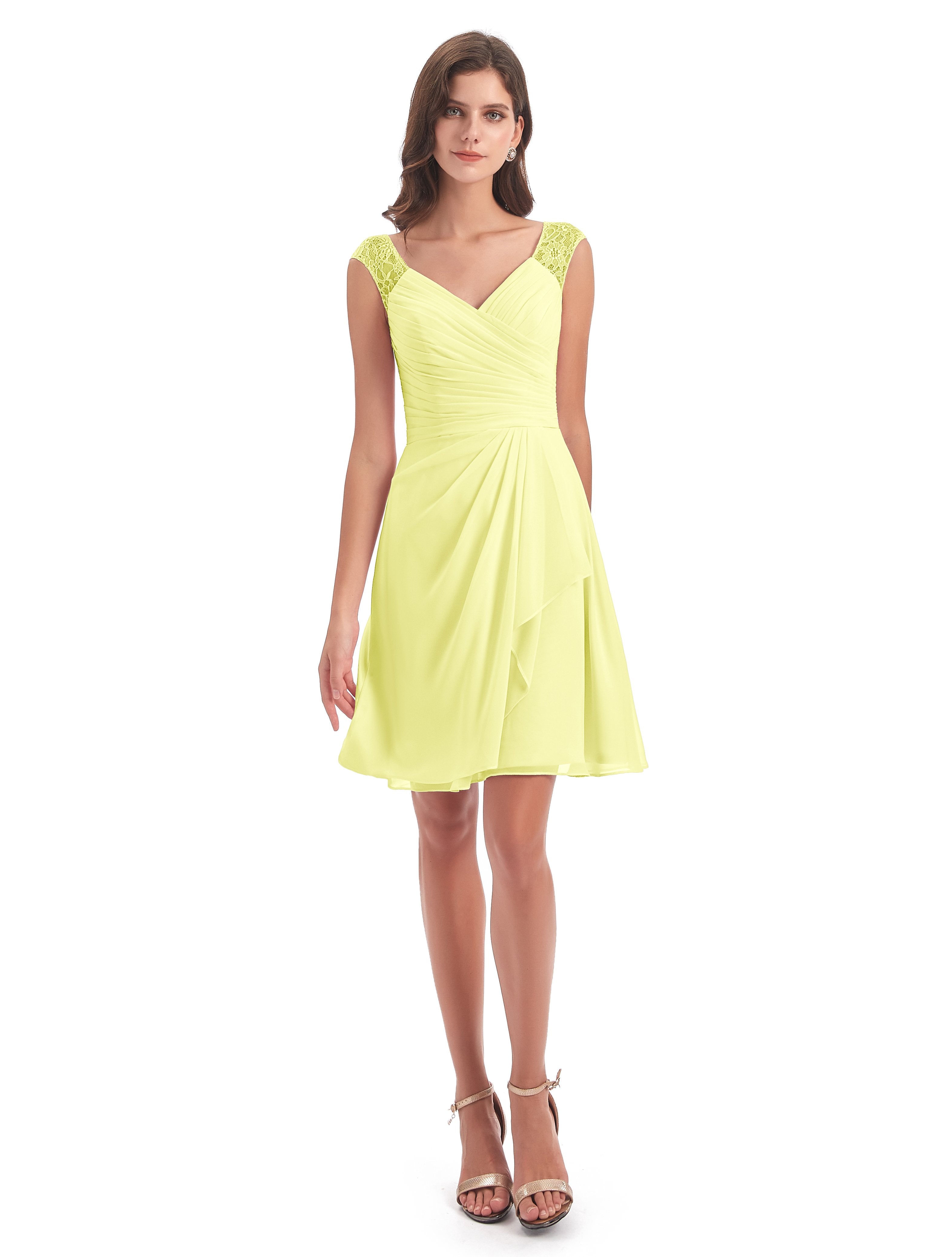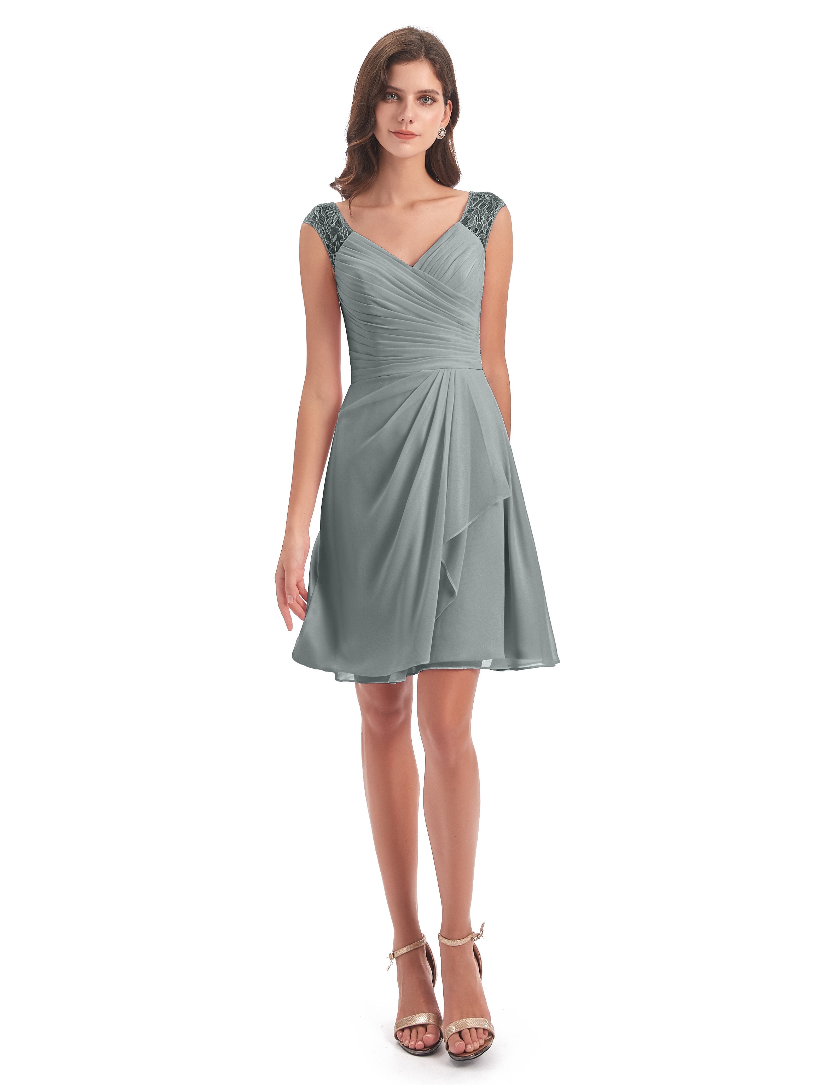 Zendaya A-Linie Knielange V-Ausschnitt Spitze/Chiffon Kurze Brautjungfernkleider