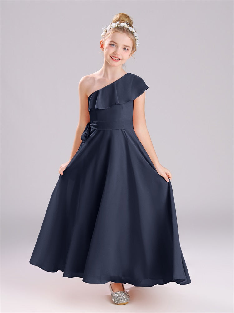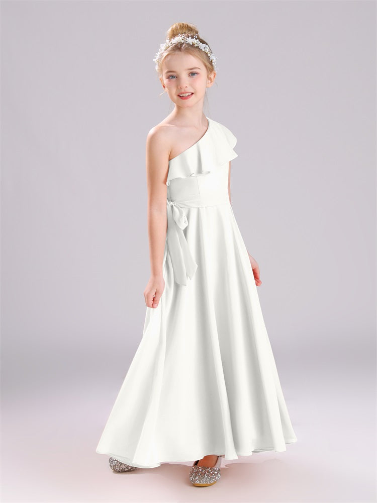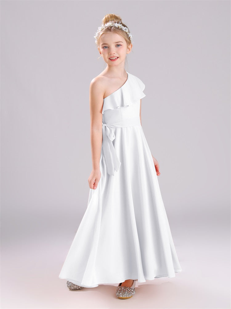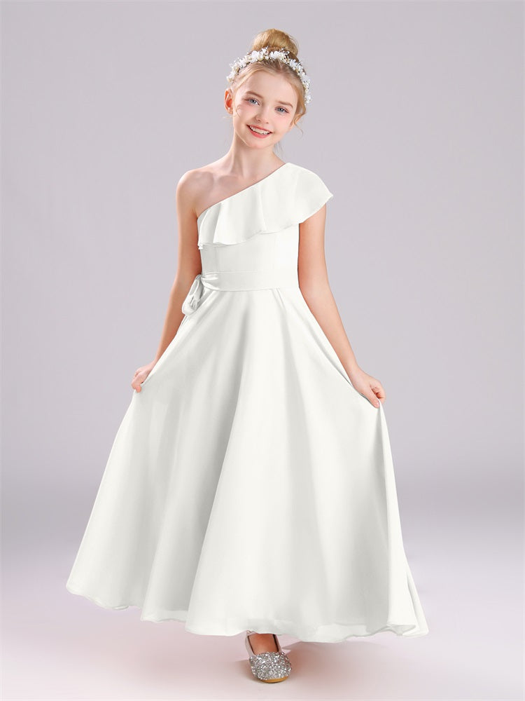 Dieses Junior-Brautjungfernkleid hat ein One-Shoulder-Design mit eleganten Rüschen aus weichem Chiffonstoff. Perfekt für Hochzeiten und besondere Anlässe, strahlt es einen raffinierten und zeitlosen Look aus. Aus hochwertigen Materialien gefertigt, bietet es Komfort und Stil für Ihre Kleine.