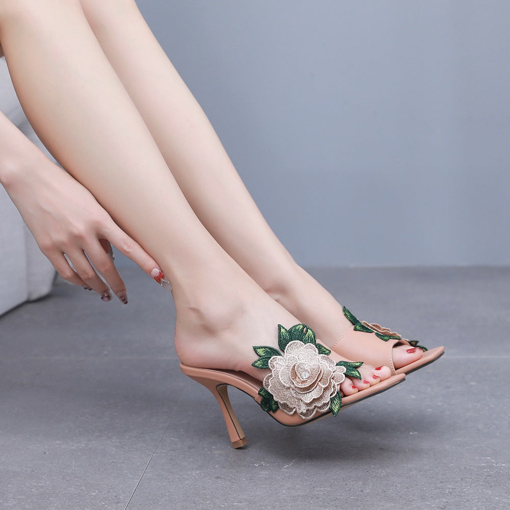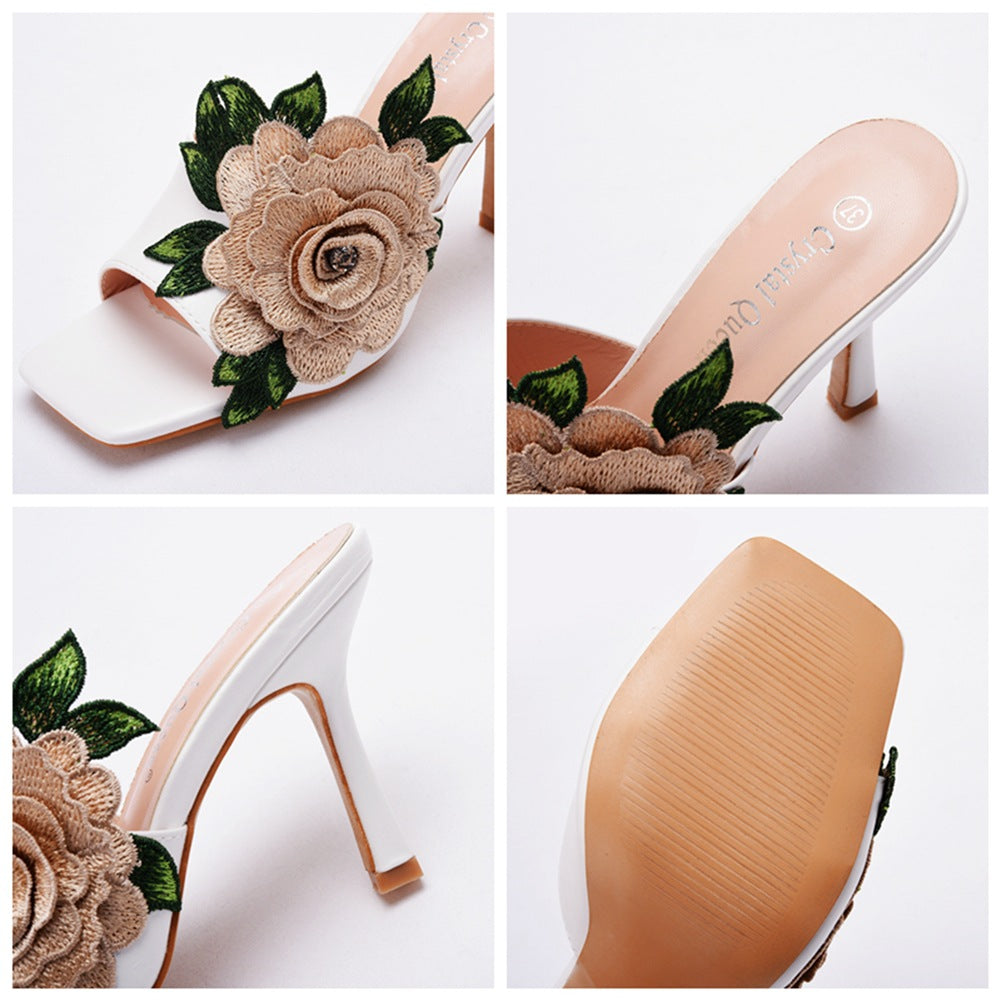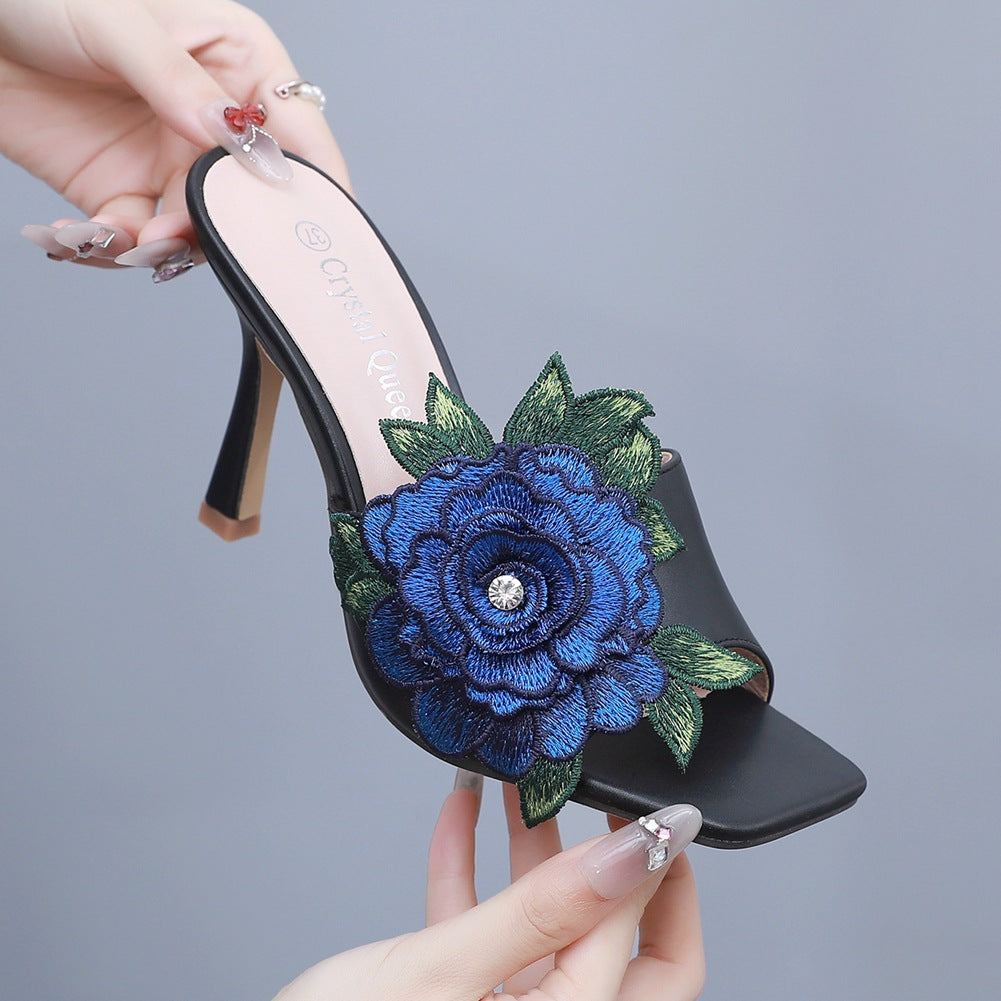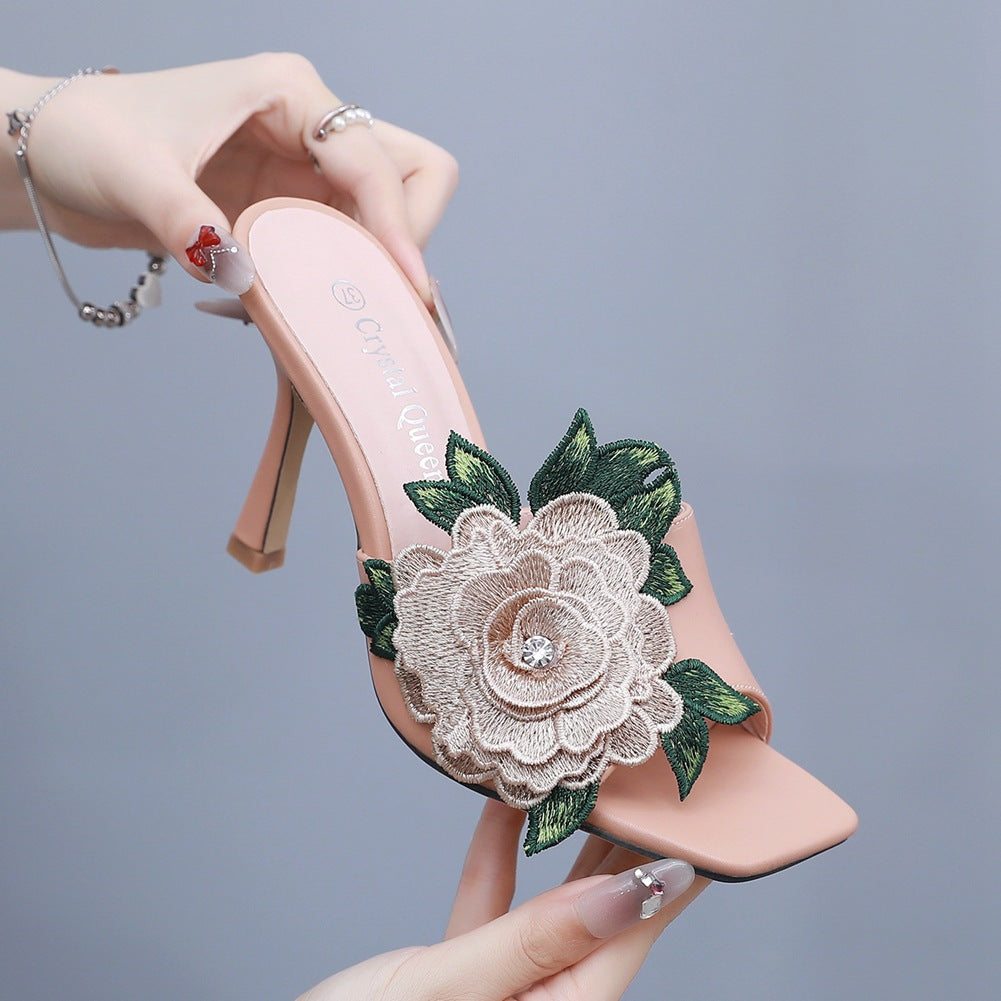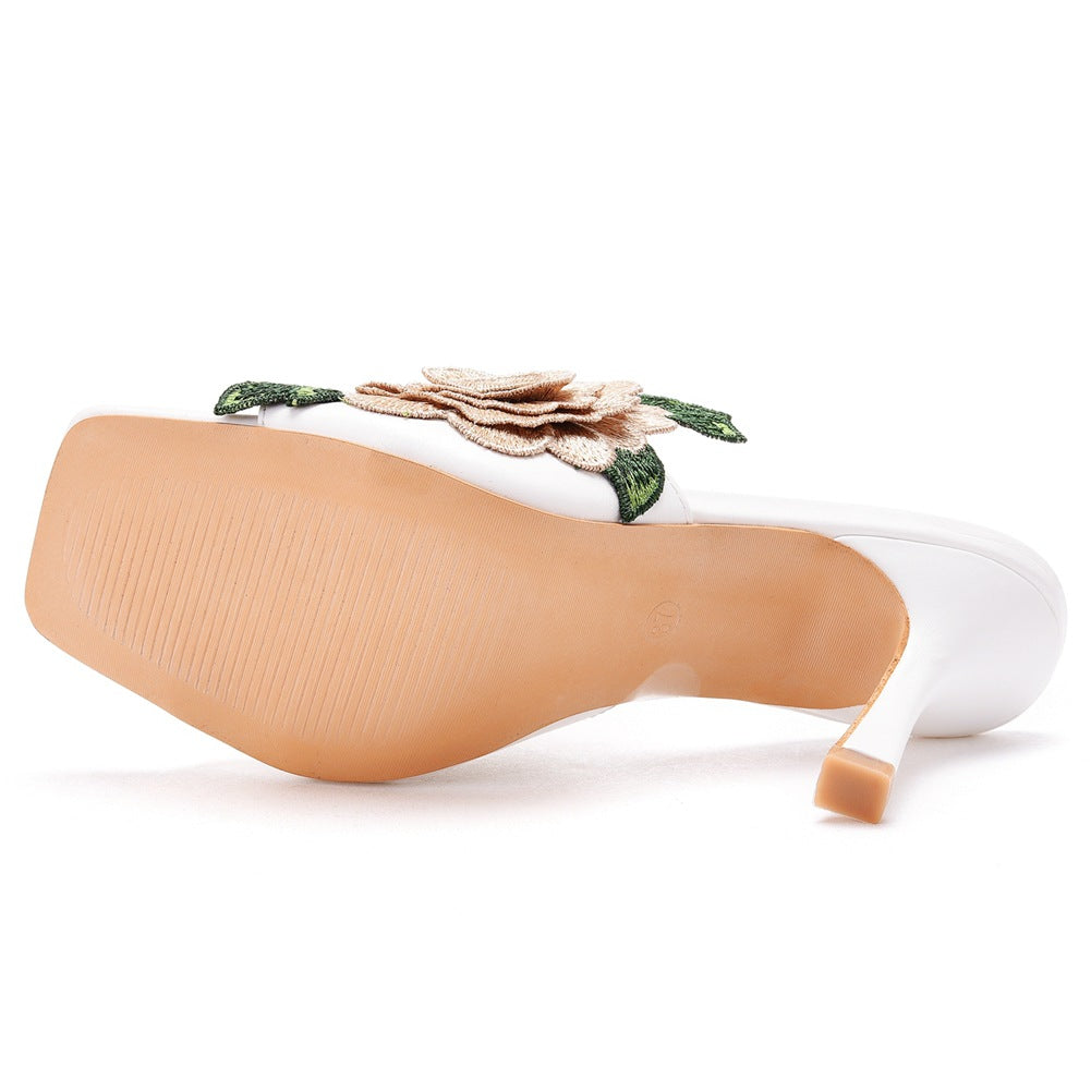 Embroidered Flower Square Toe Fish Mouth High Heeled Sandal Slippers