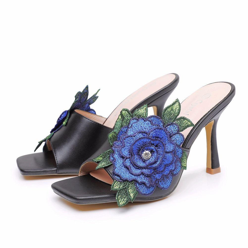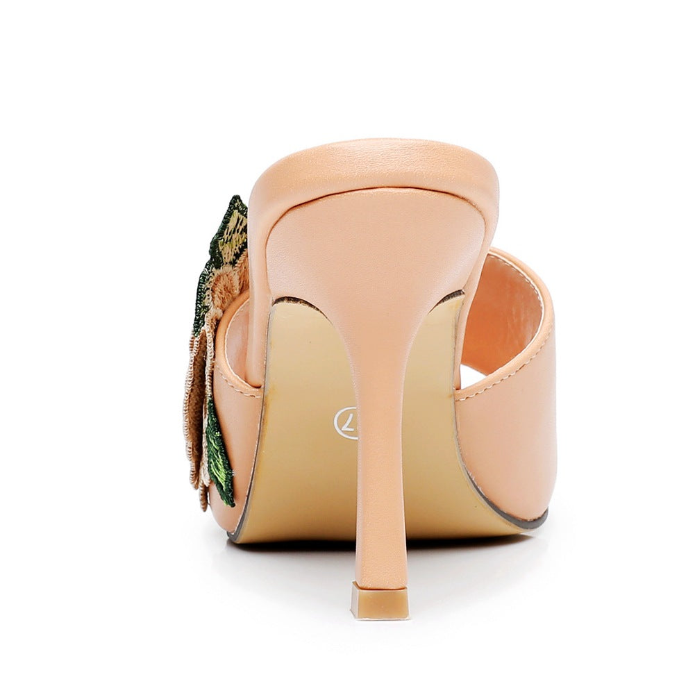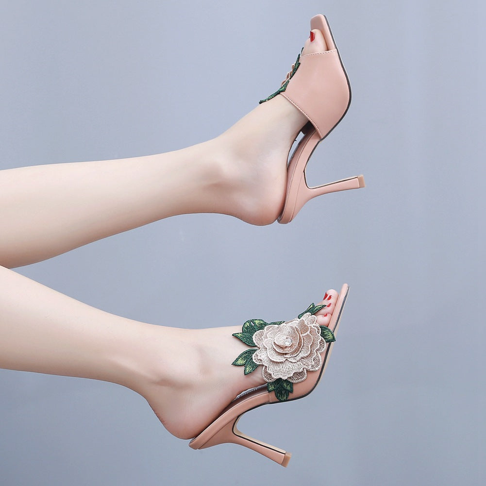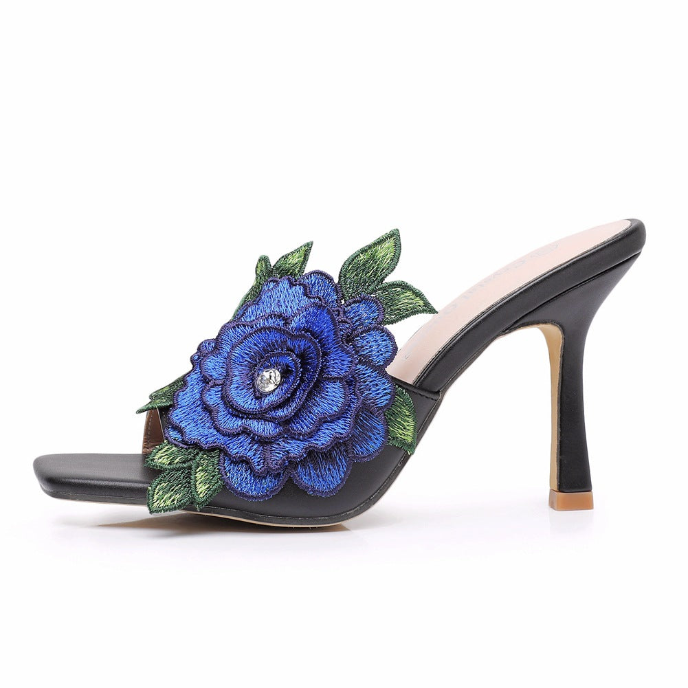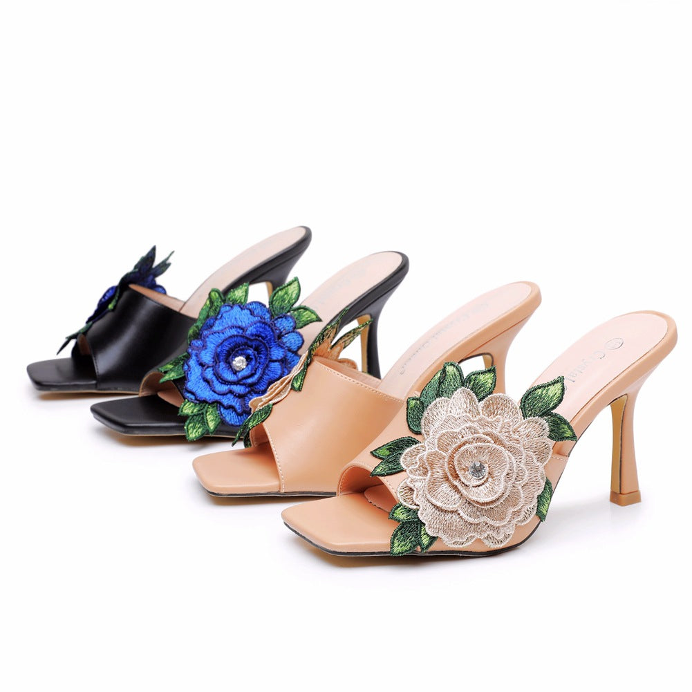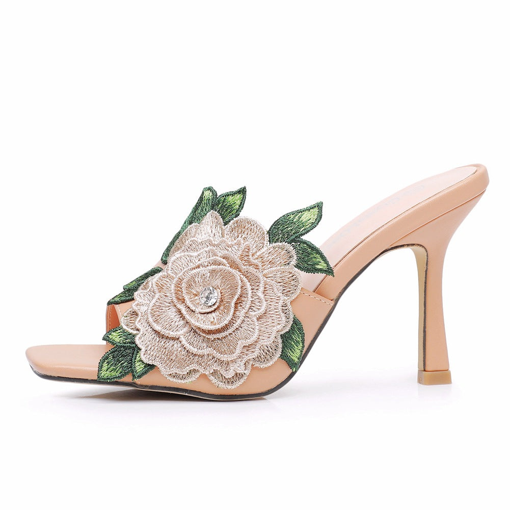 Embroidered Flower Square Toe Fish Mouth High Heeled Sandal Slippers