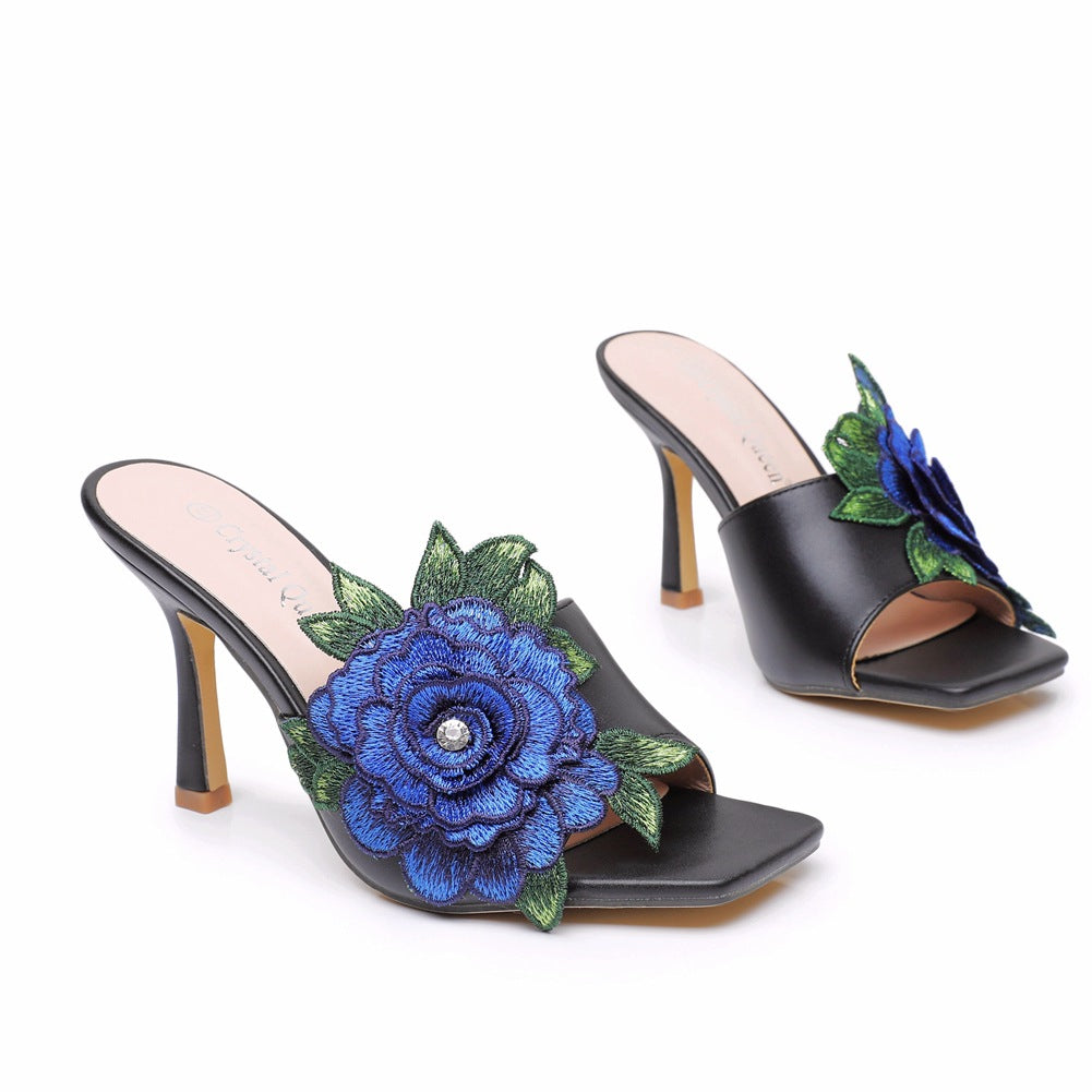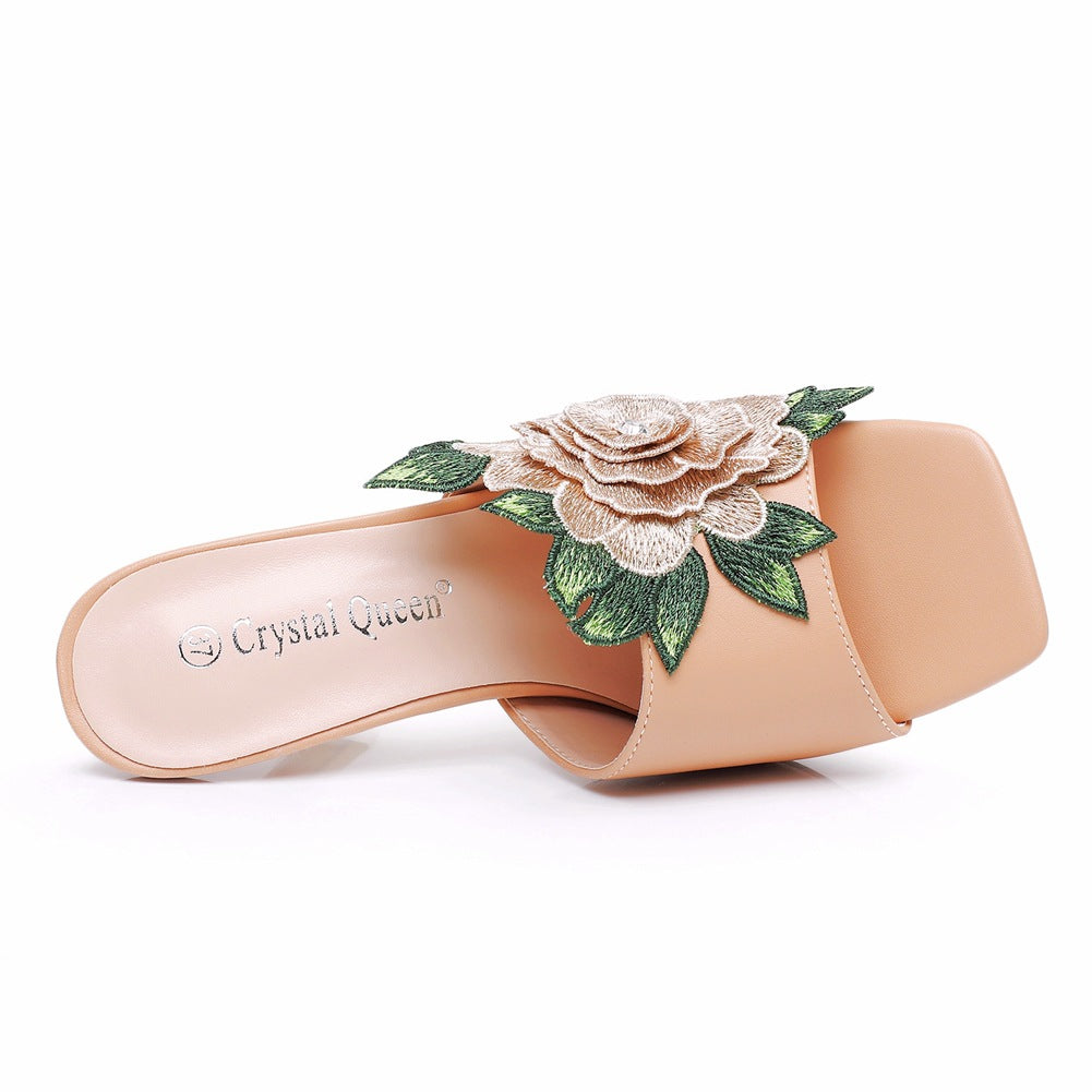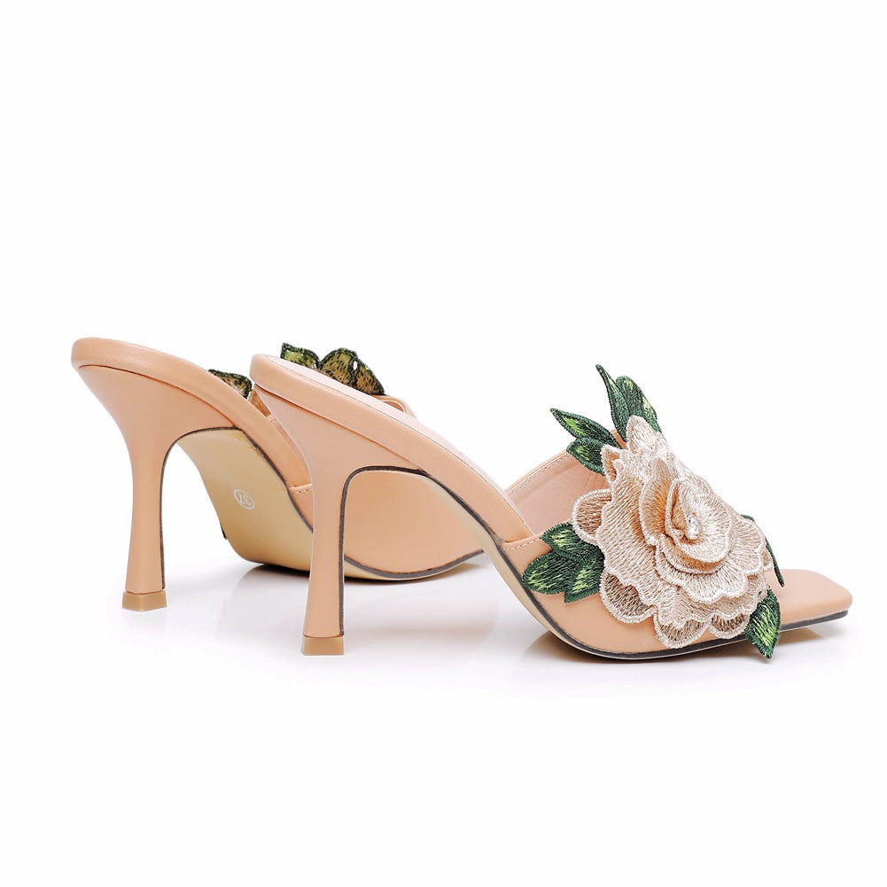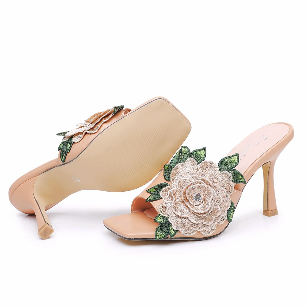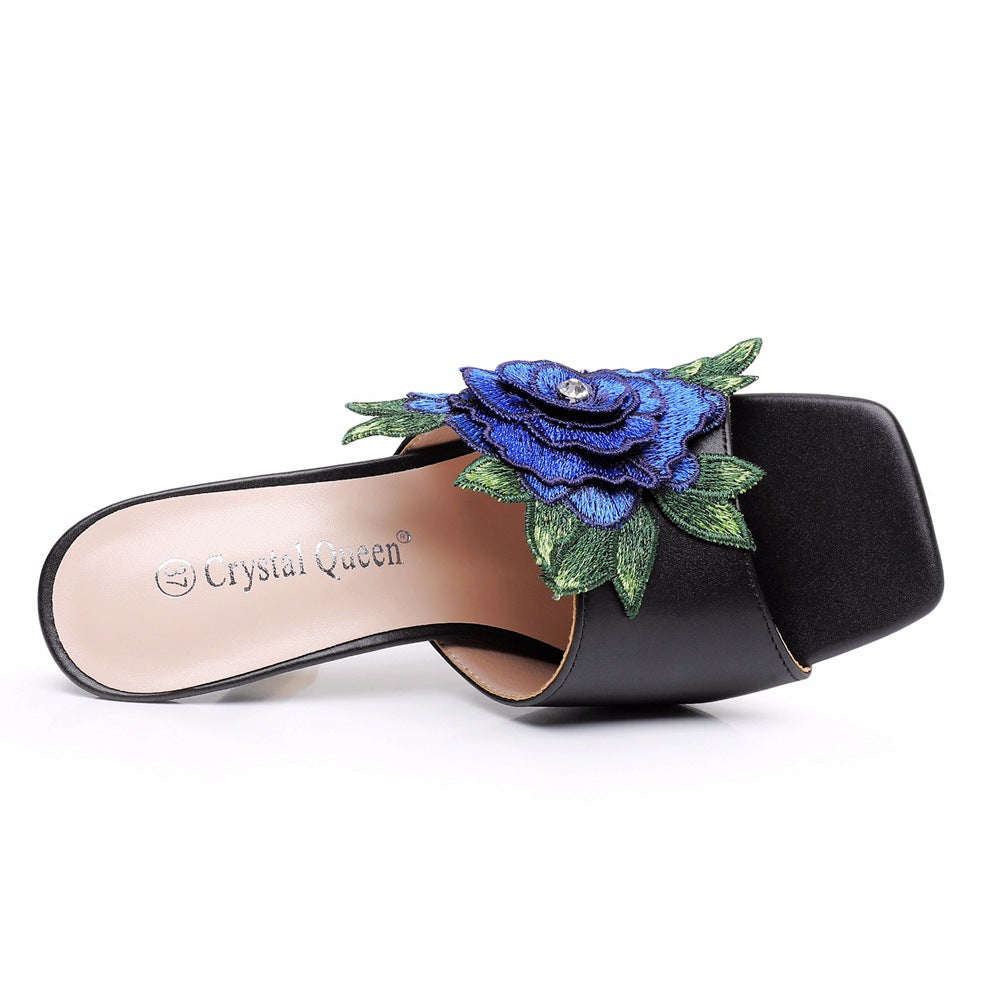 Embroidered Flower Square Toe Fish Mouth High Heeled Sandal Slippers