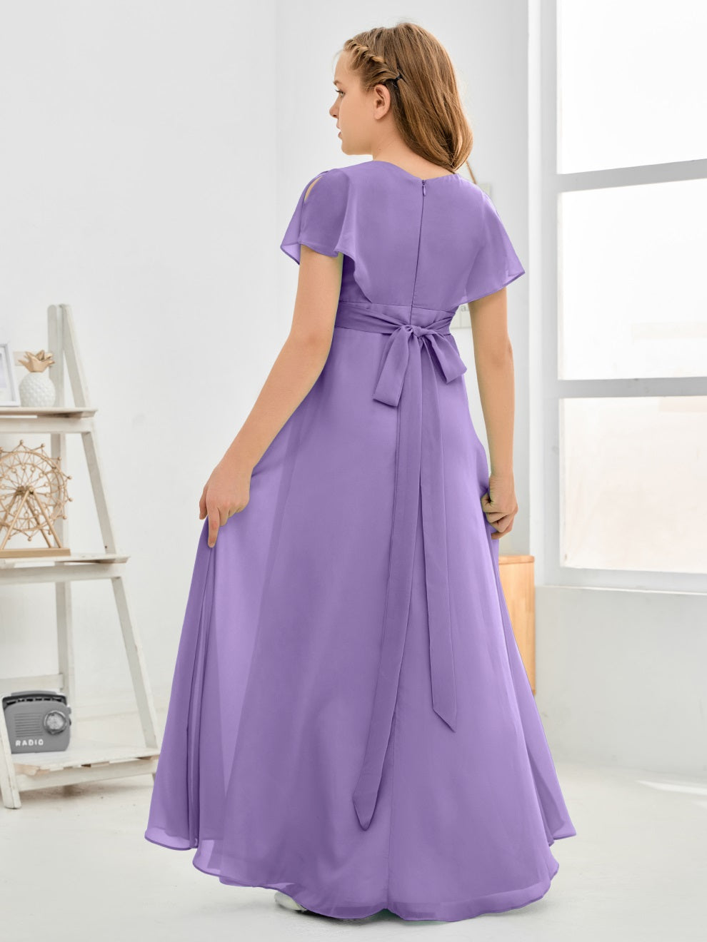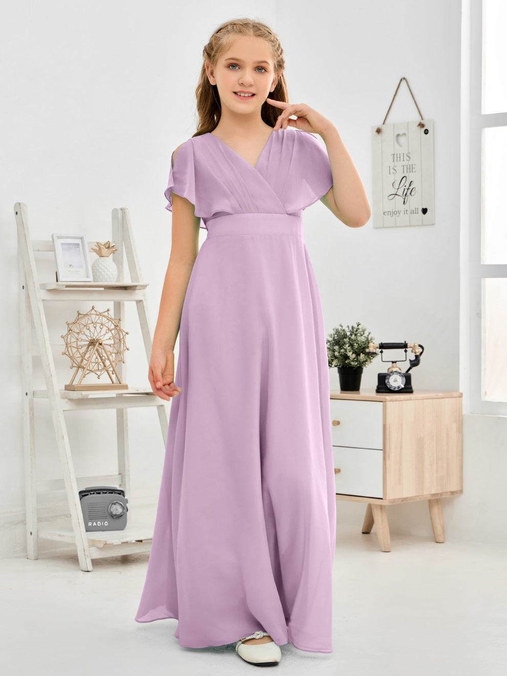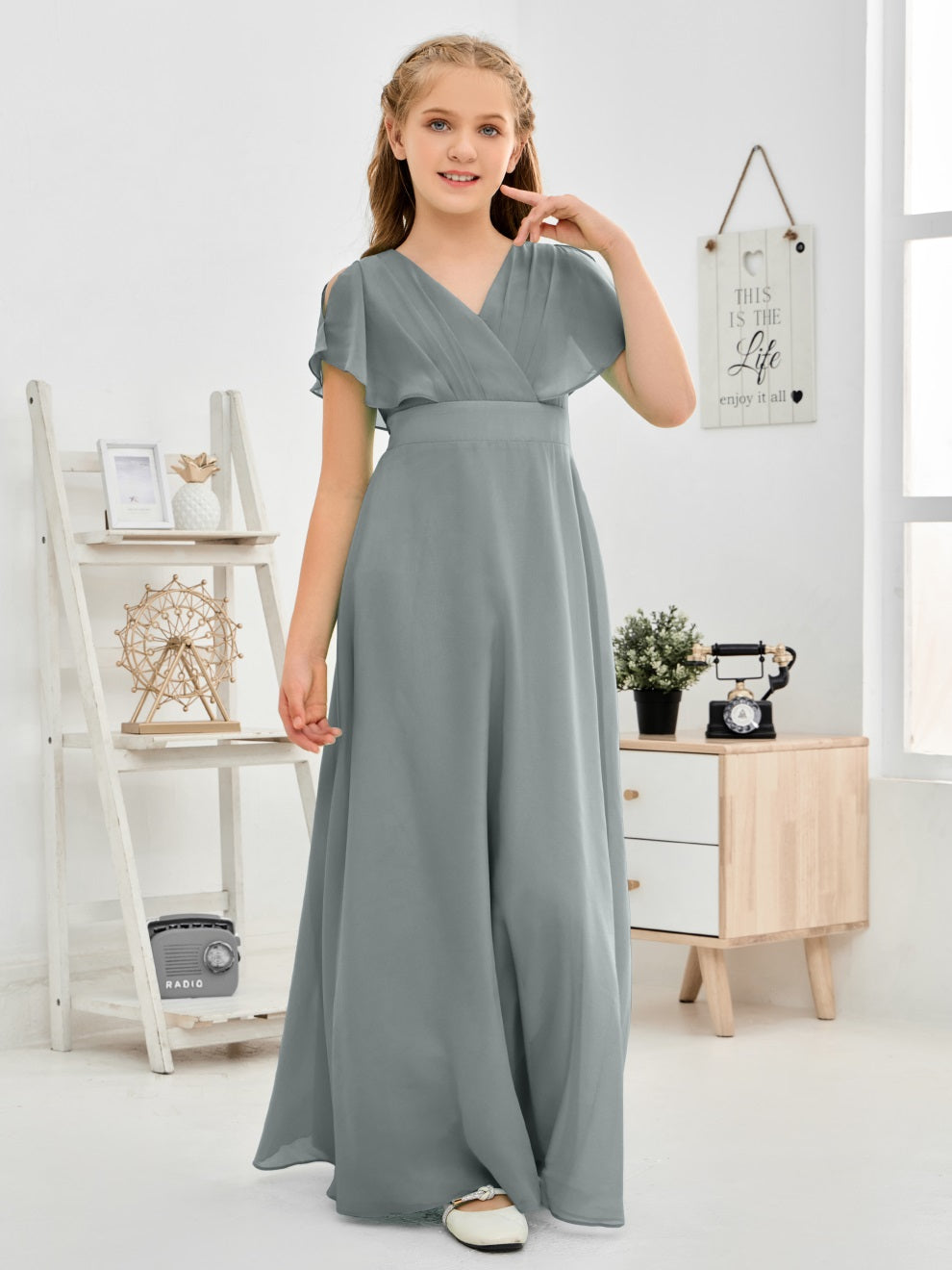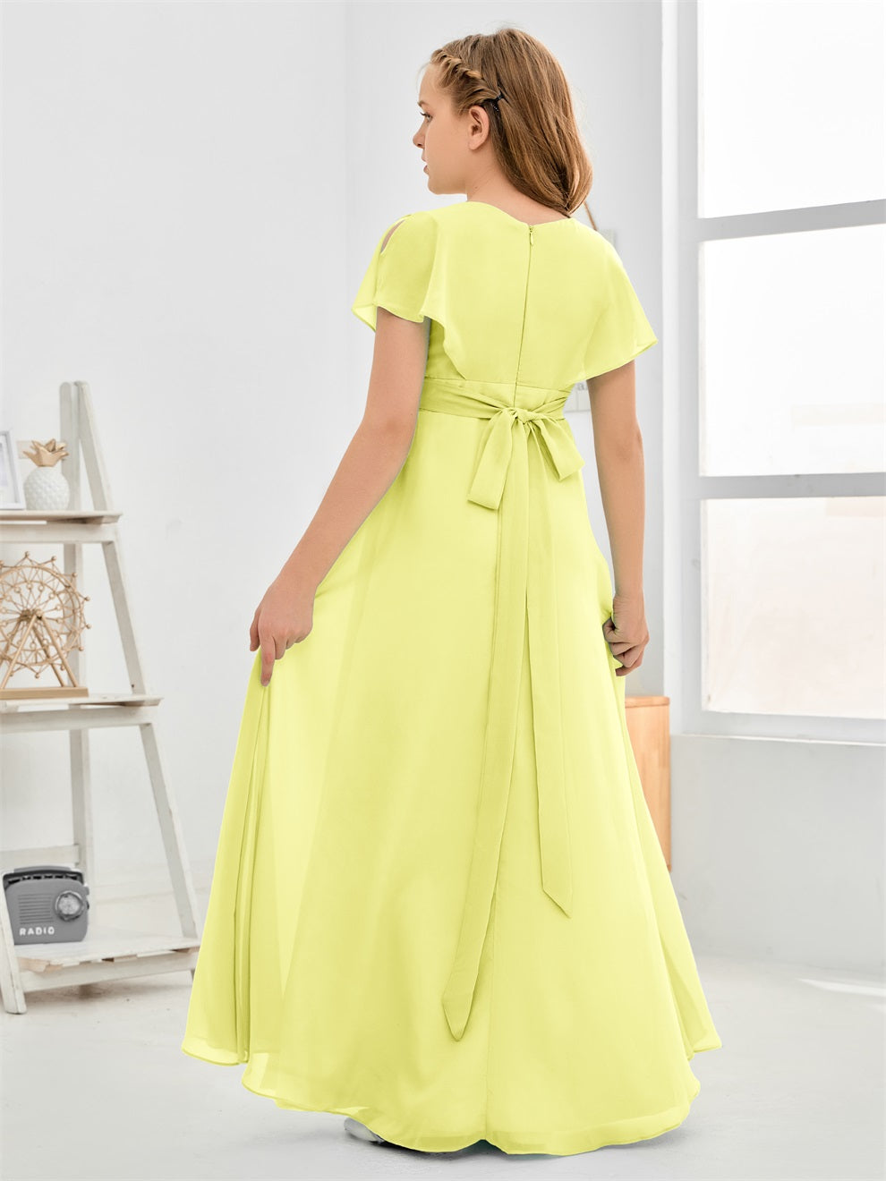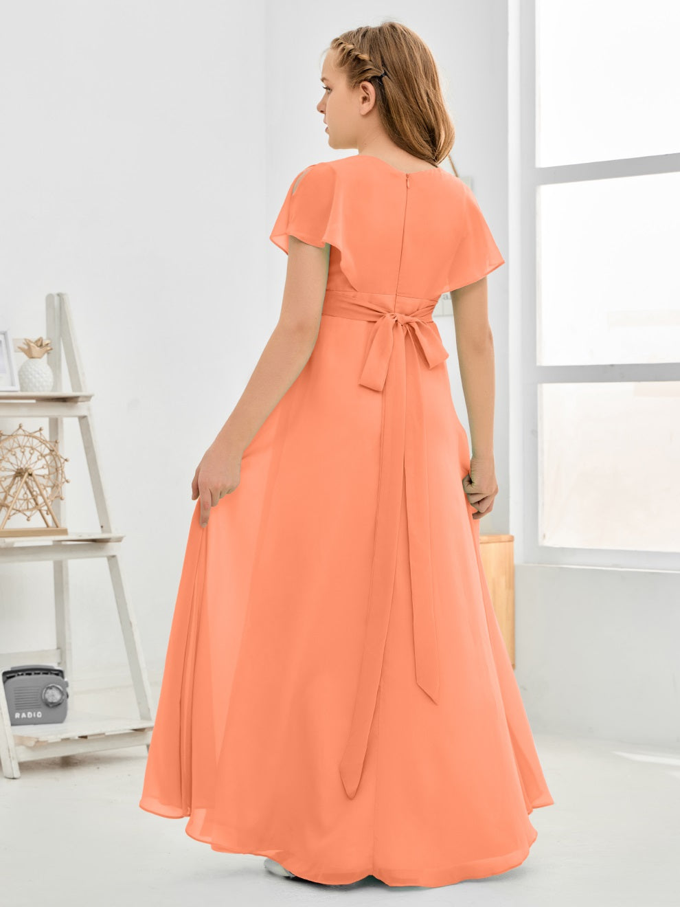 Gewellter V-Ausschnitt Chiffon Junior Brautjungfernkleid