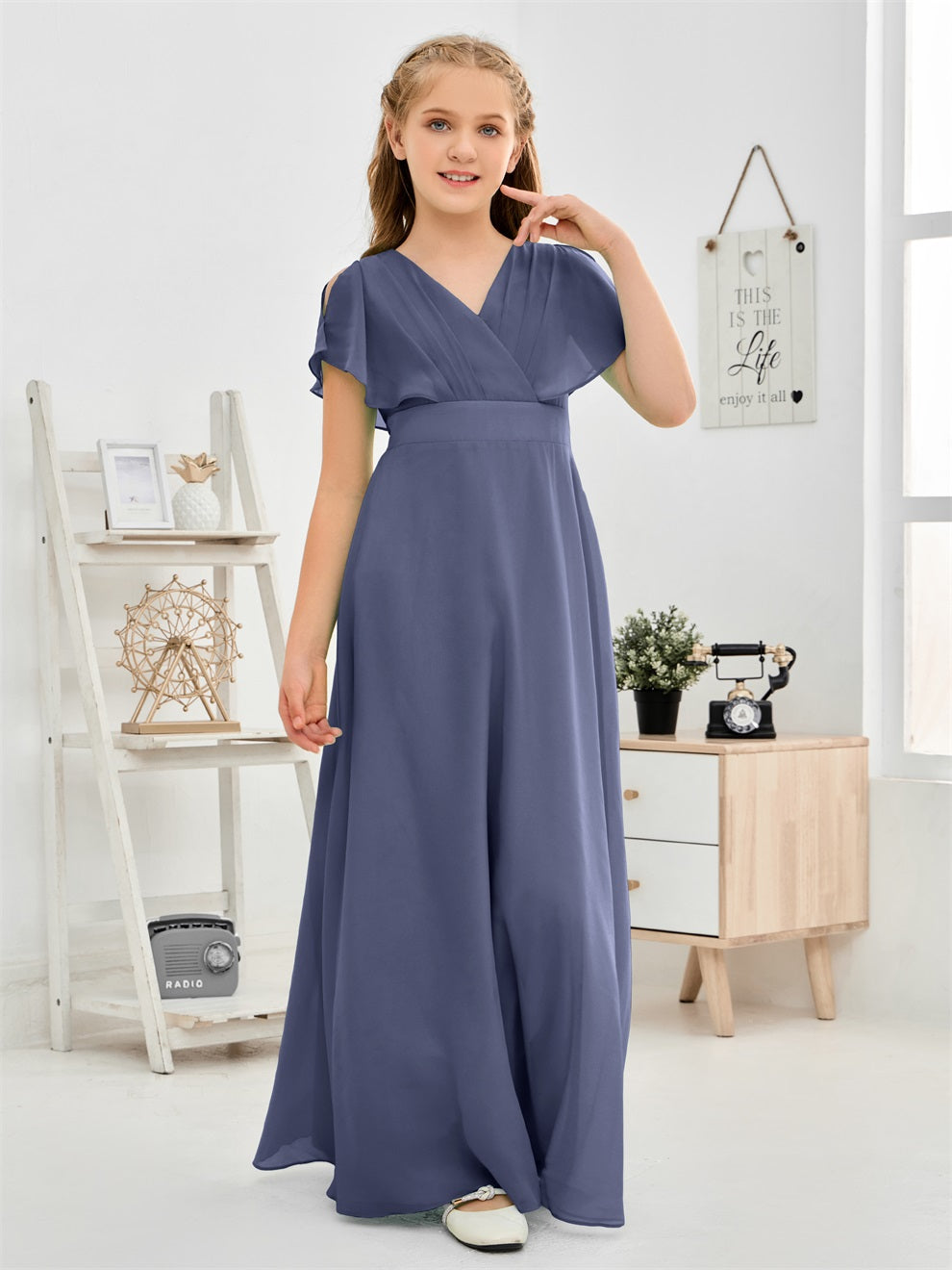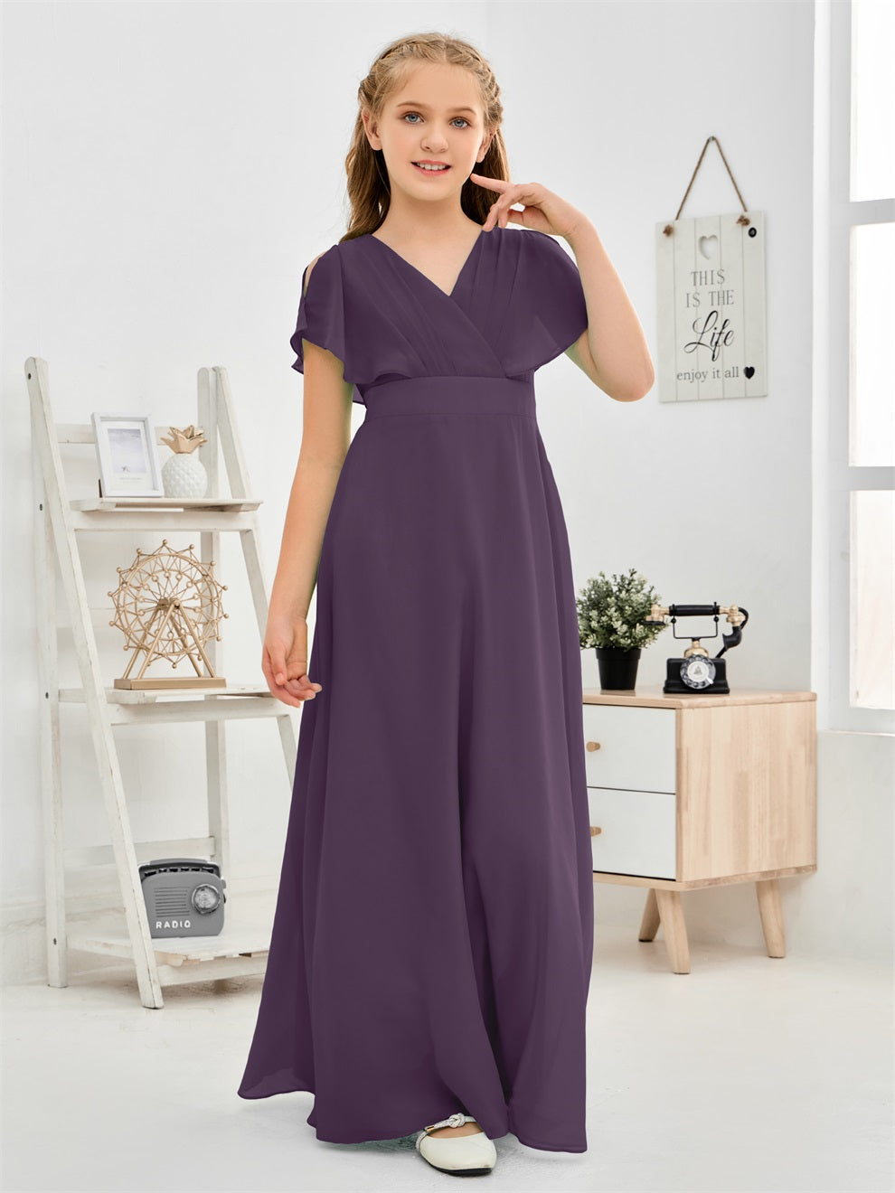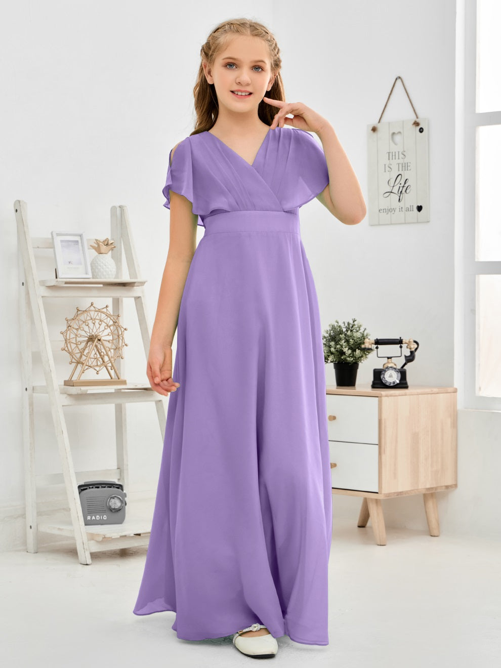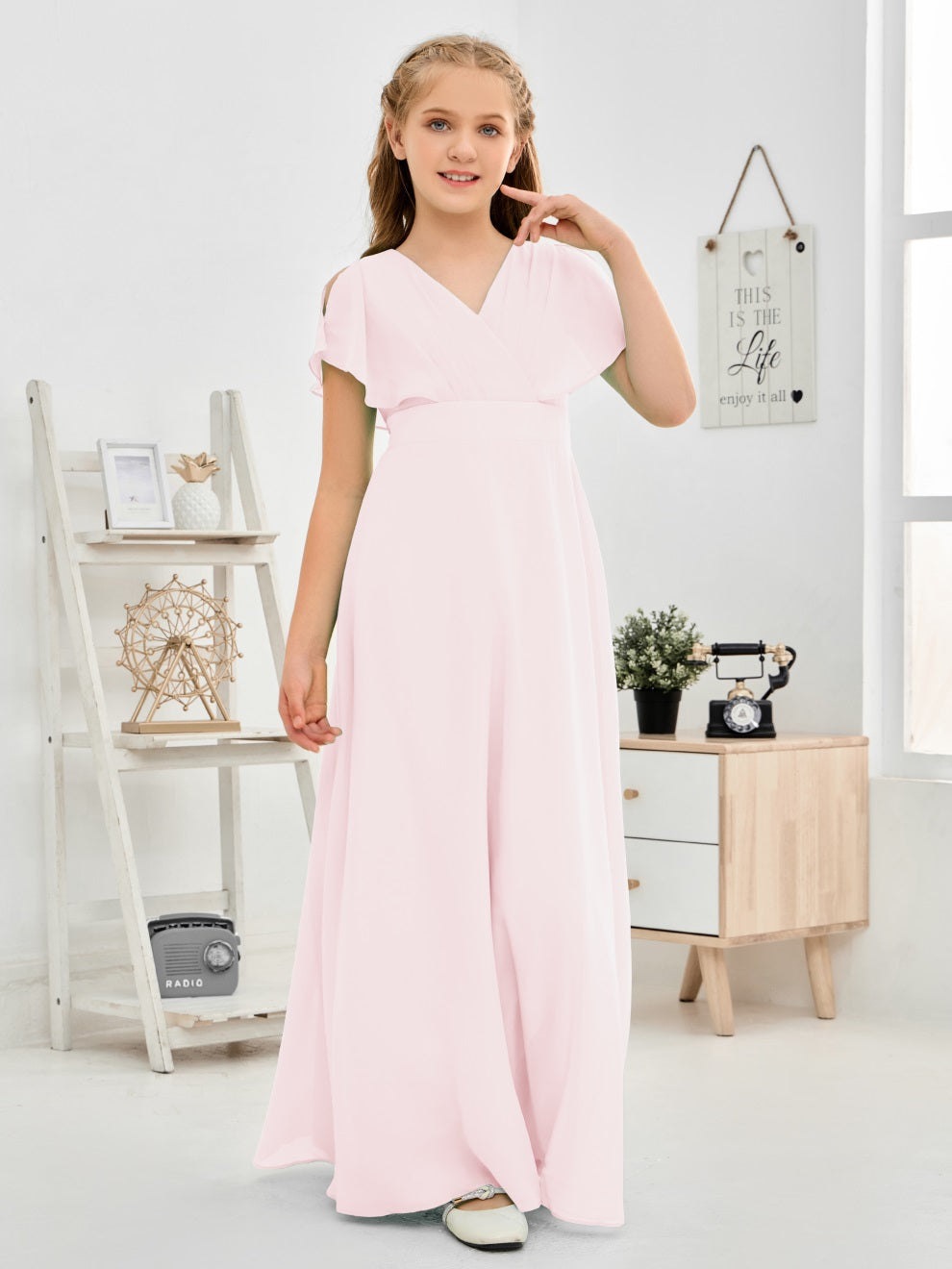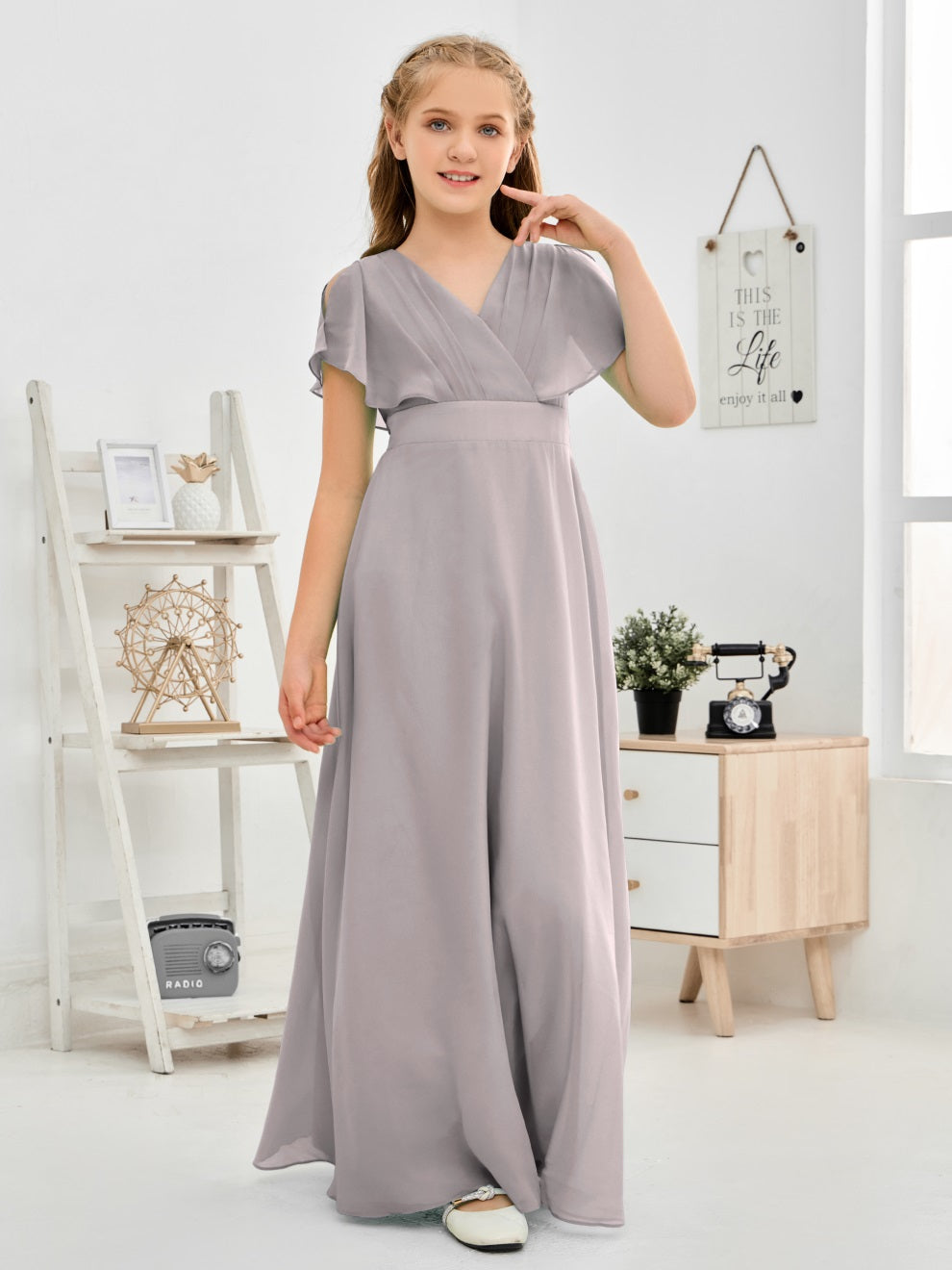 Gewellter V-Ausschnitt Chiffon Junior Brautjungfernkleid